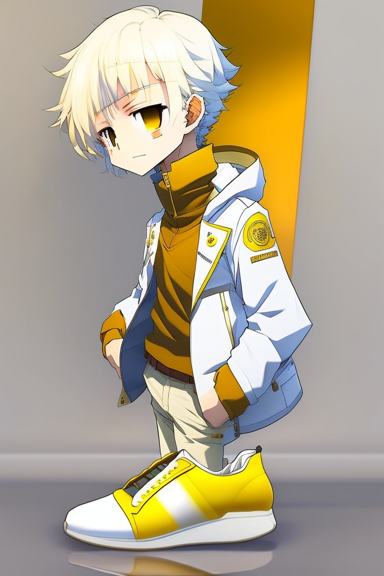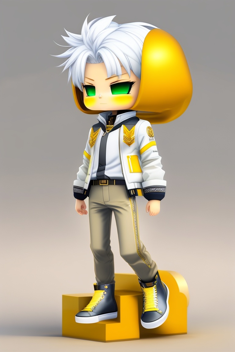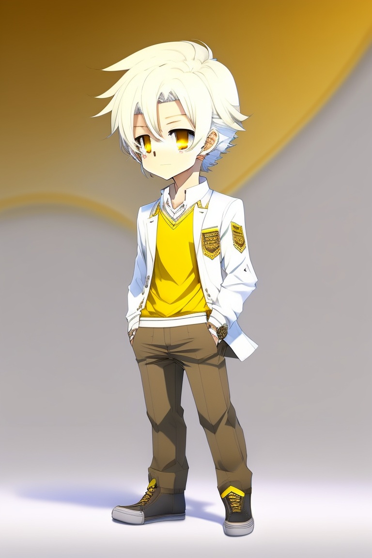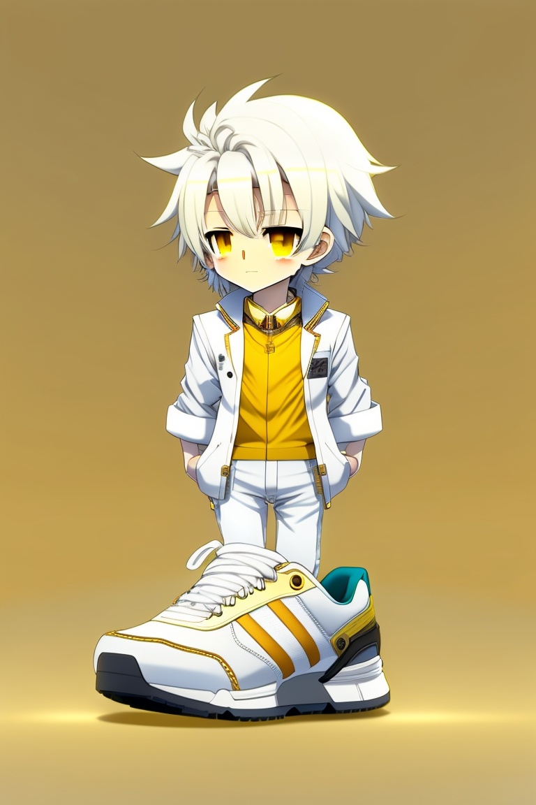 Anime chibi male with white hair, yellow eyes, wearing plain white trousers, wearing white shoes with a bit of golden yellow in some parts of the shoes, wearing a plain white shirt, wearing a white jacket that has golden yellow on the sides