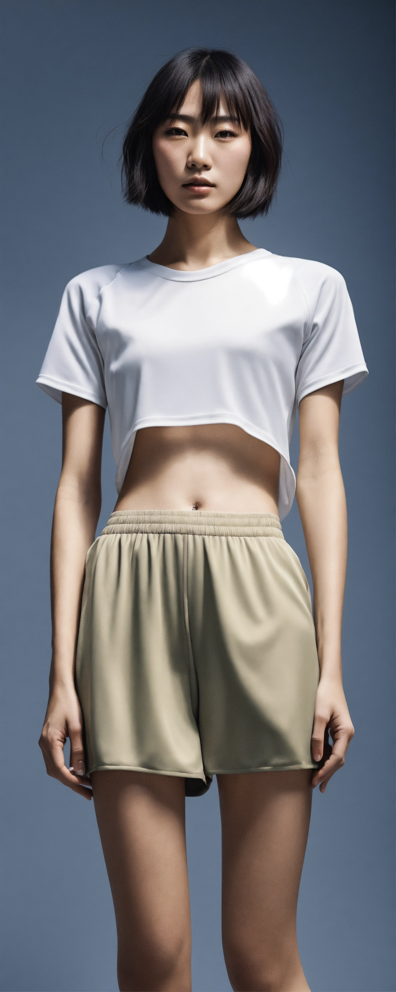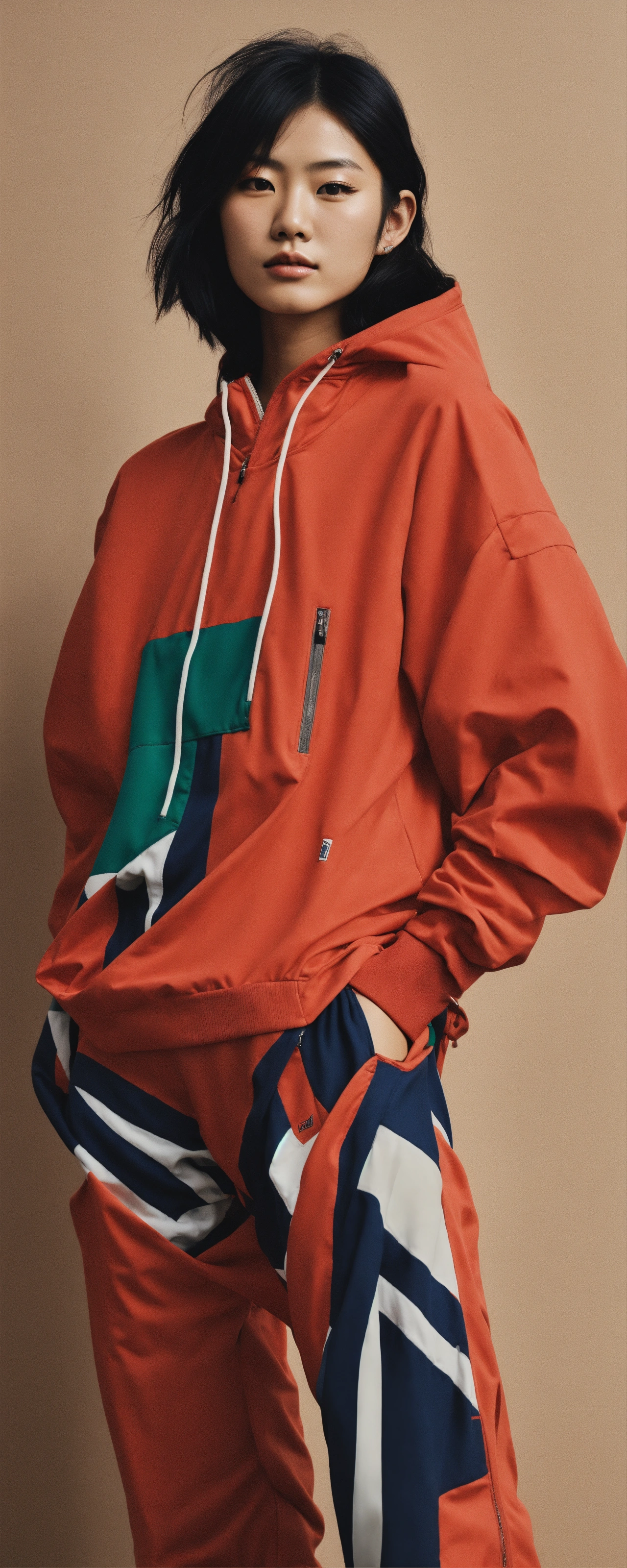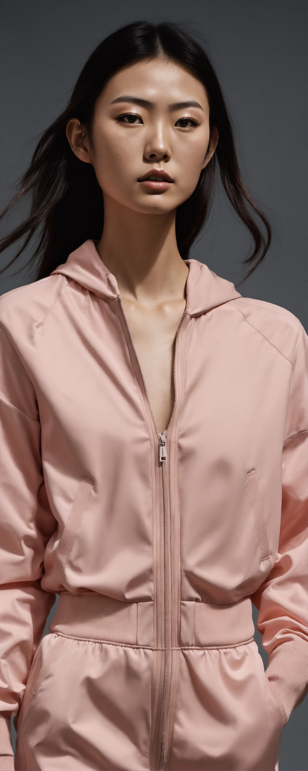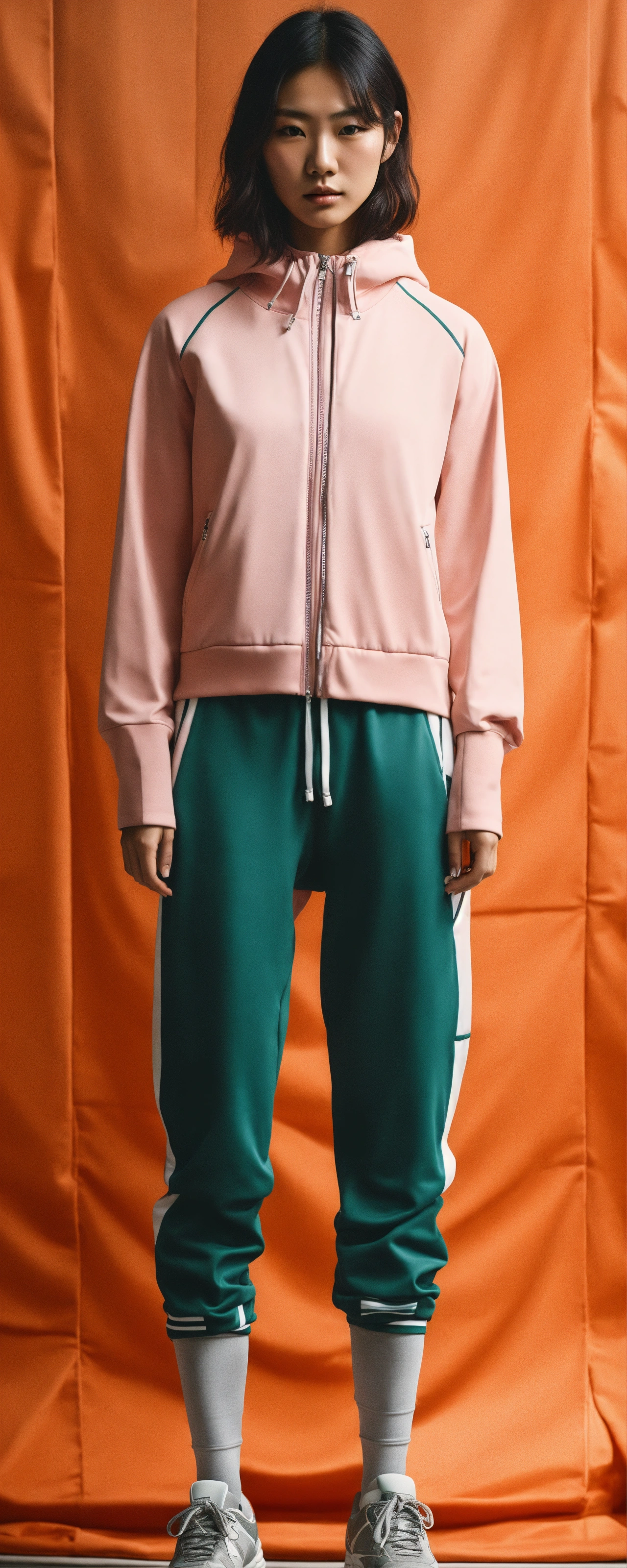 A hyper-realistic photo emulsion transfer of a japanese fashion model in sportswear outfit that covered only small part of the body, very minimal, 256k, no text.