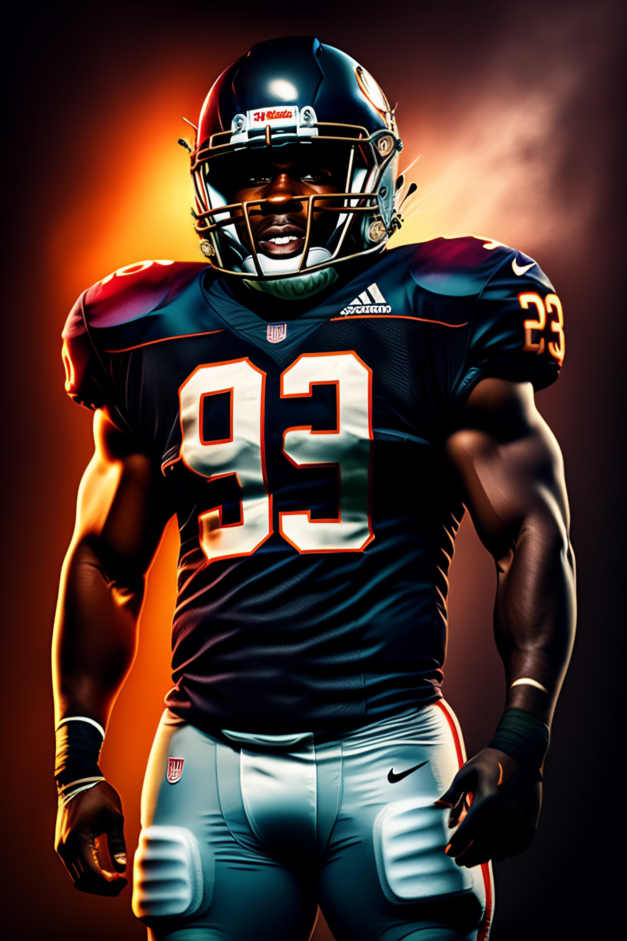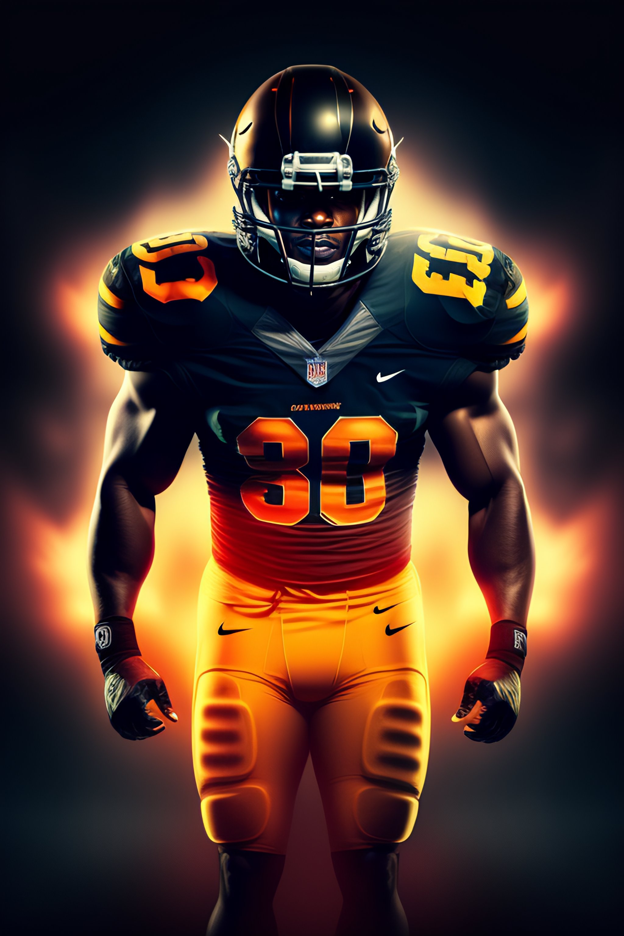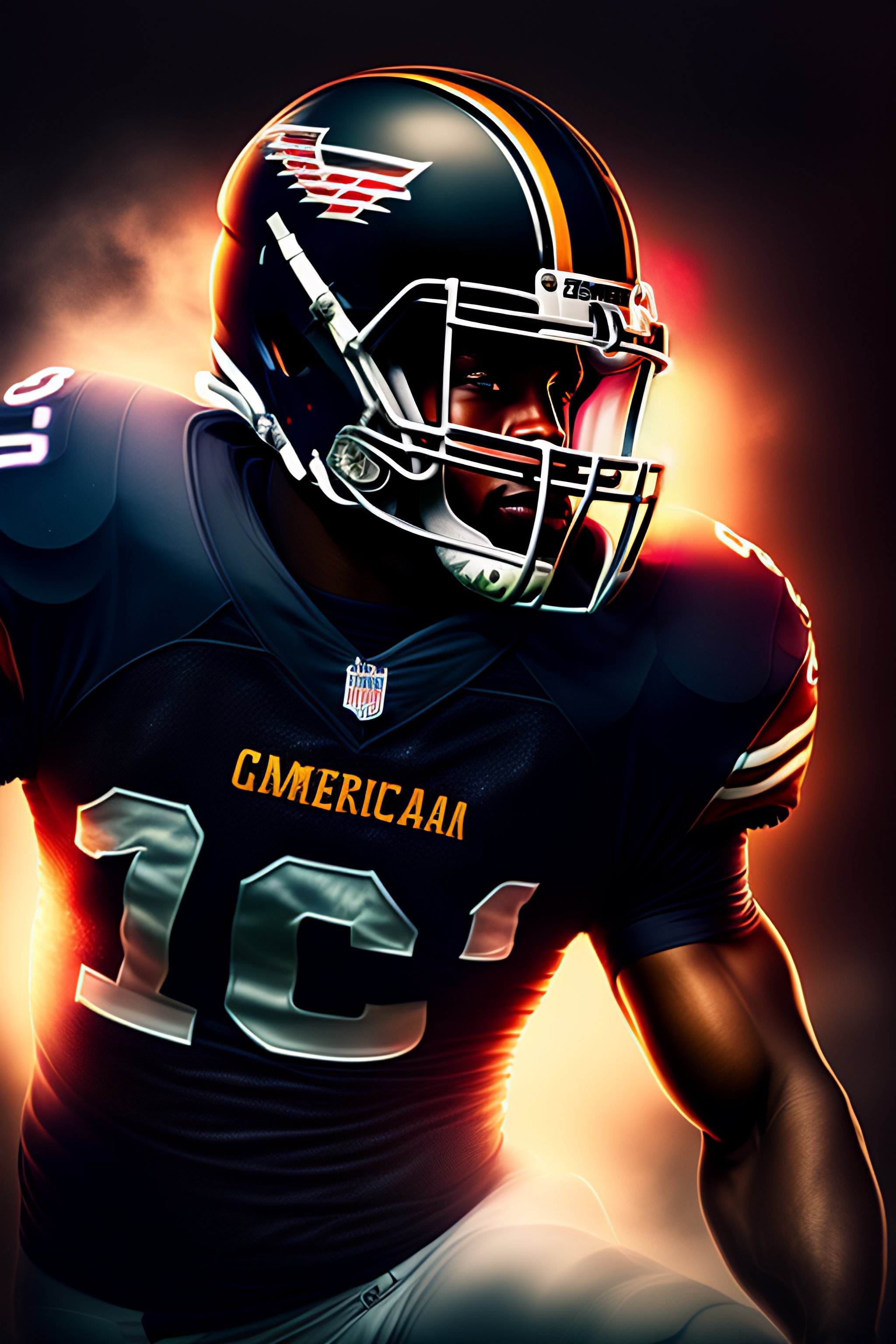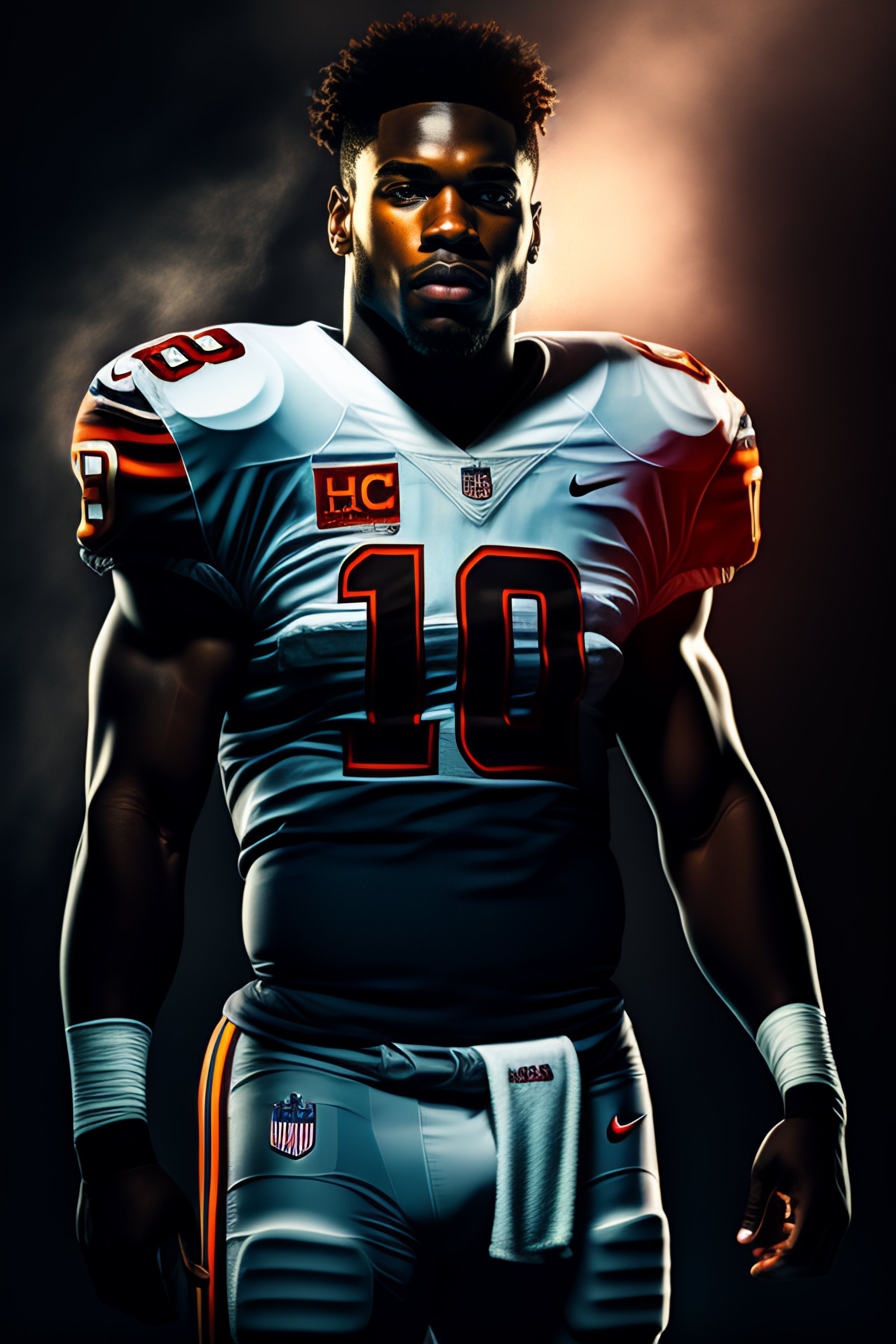 Portrait of american football player, photography, dramatic lighting, hyper detailed, hyper realistic, black background