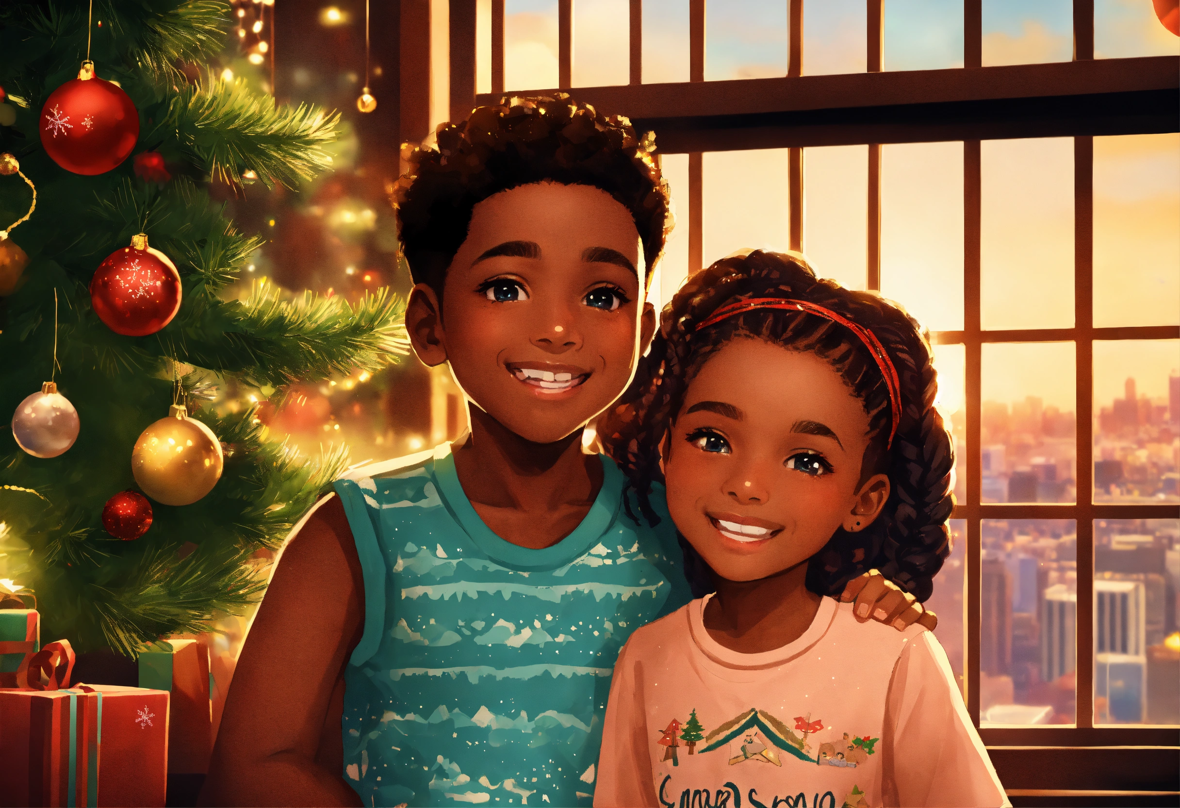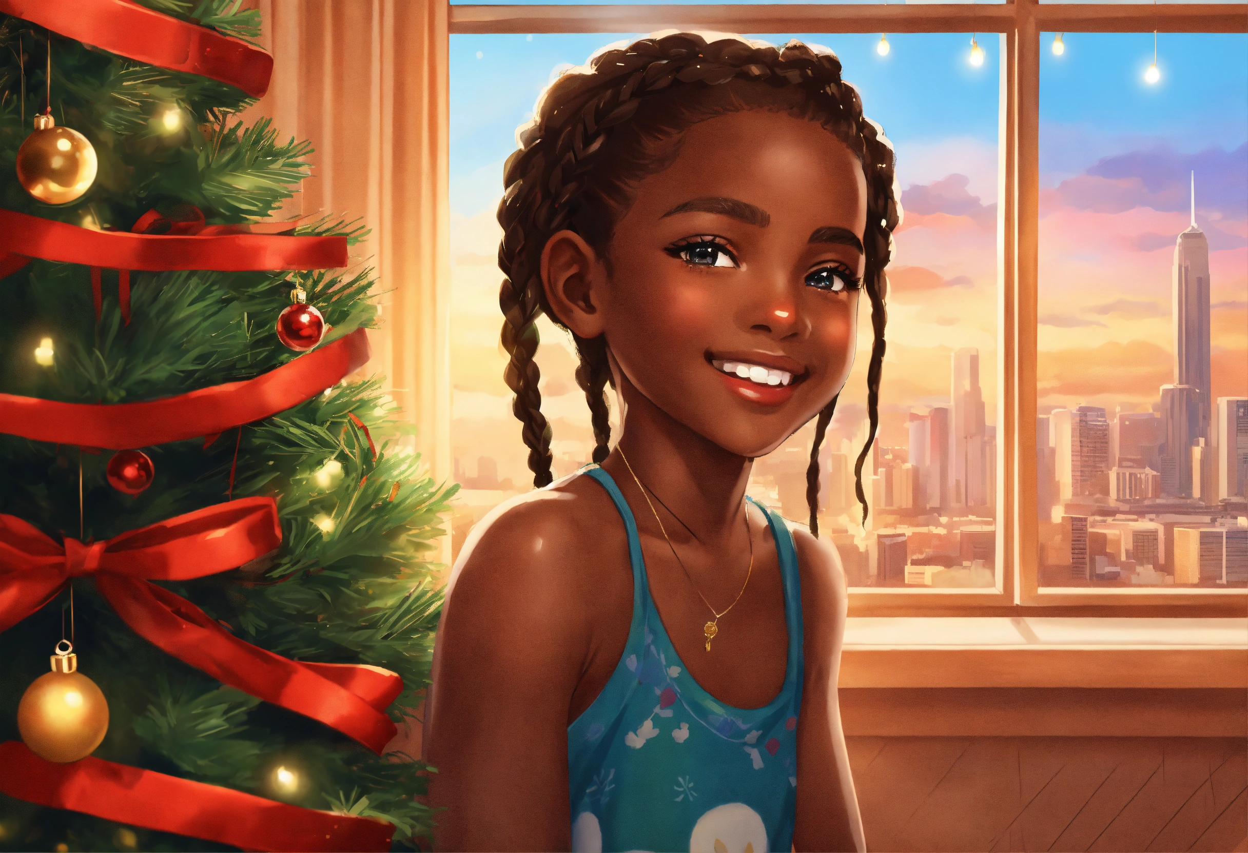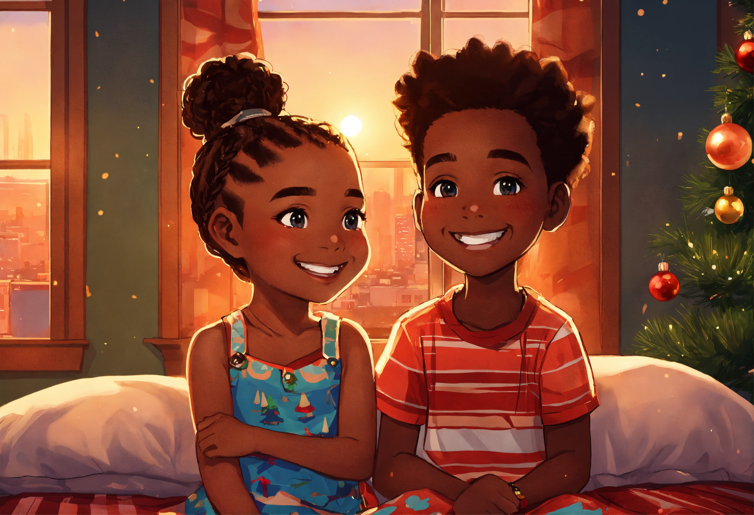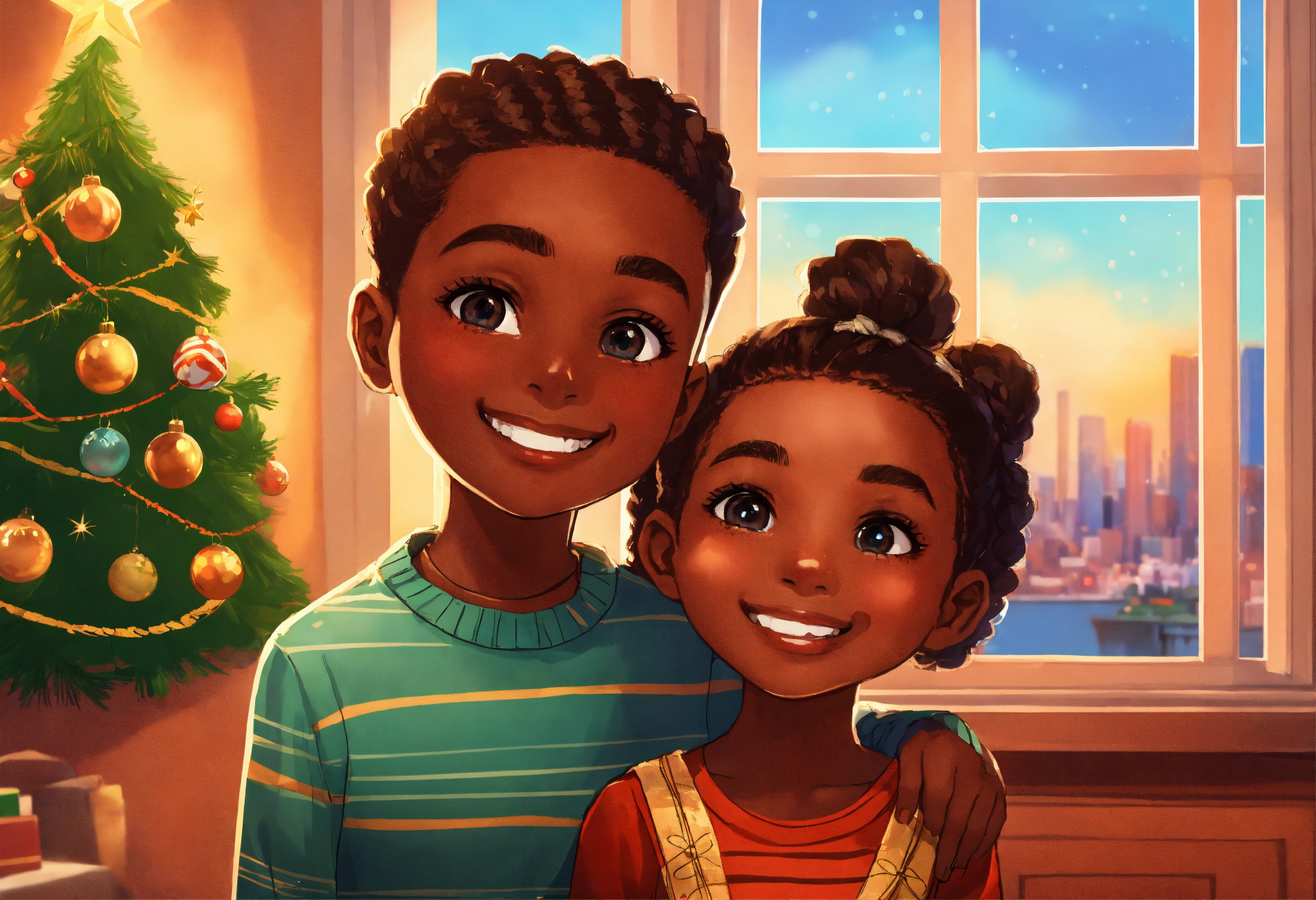 Image of a 7 year old dark brown skin girl and boy smiling with beautiful eyes, girl has braids and the boy has a low fade haircut, both wearing pjs, decorated christmas tree in background, sunny san diego skyline view outside of window, realistic vector