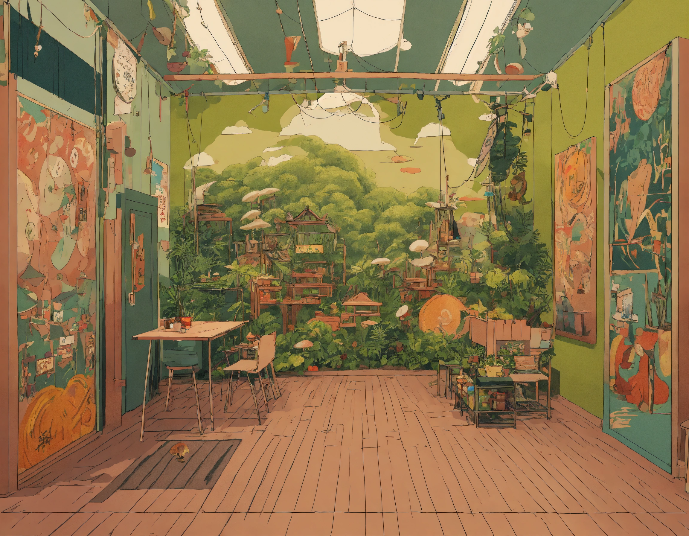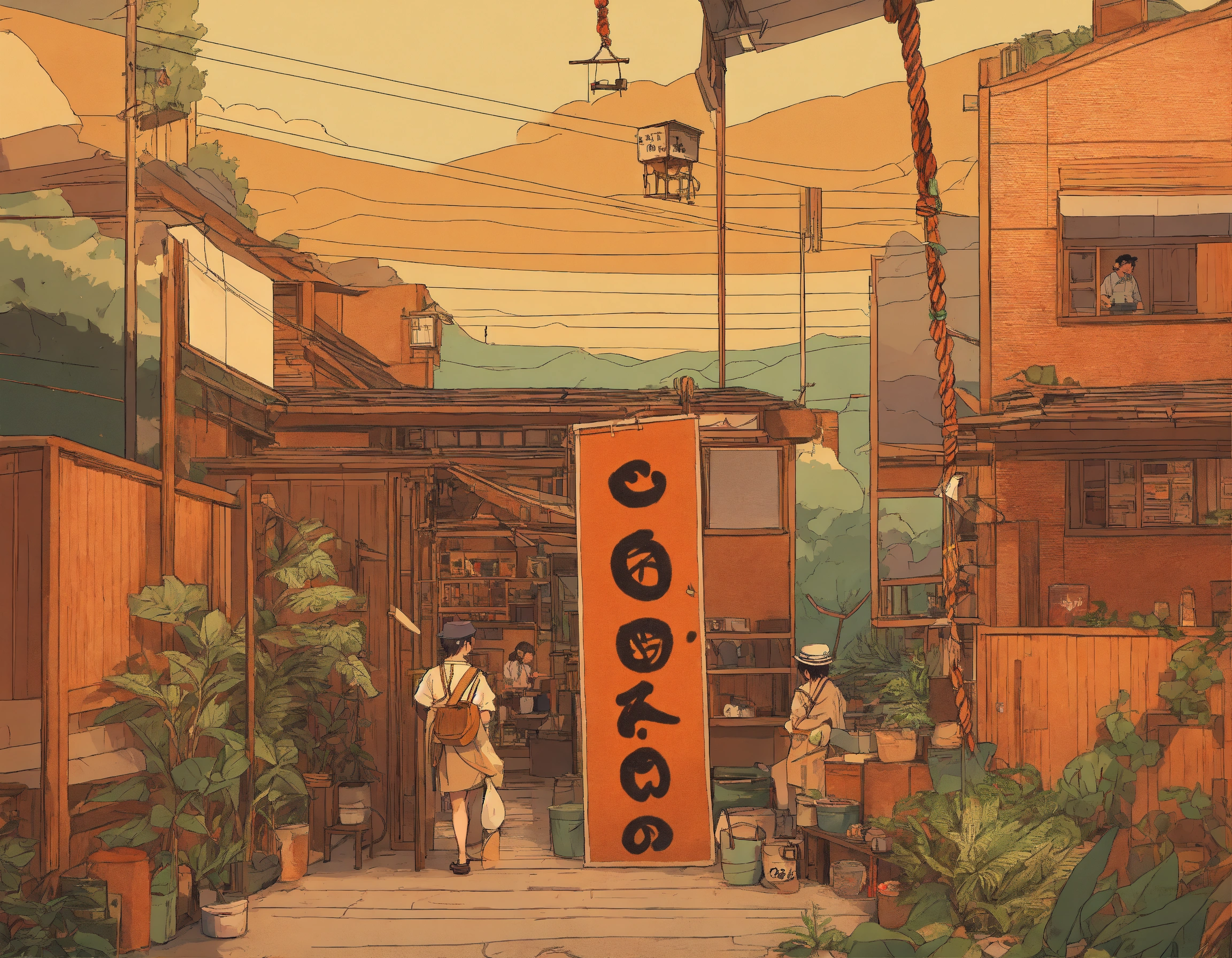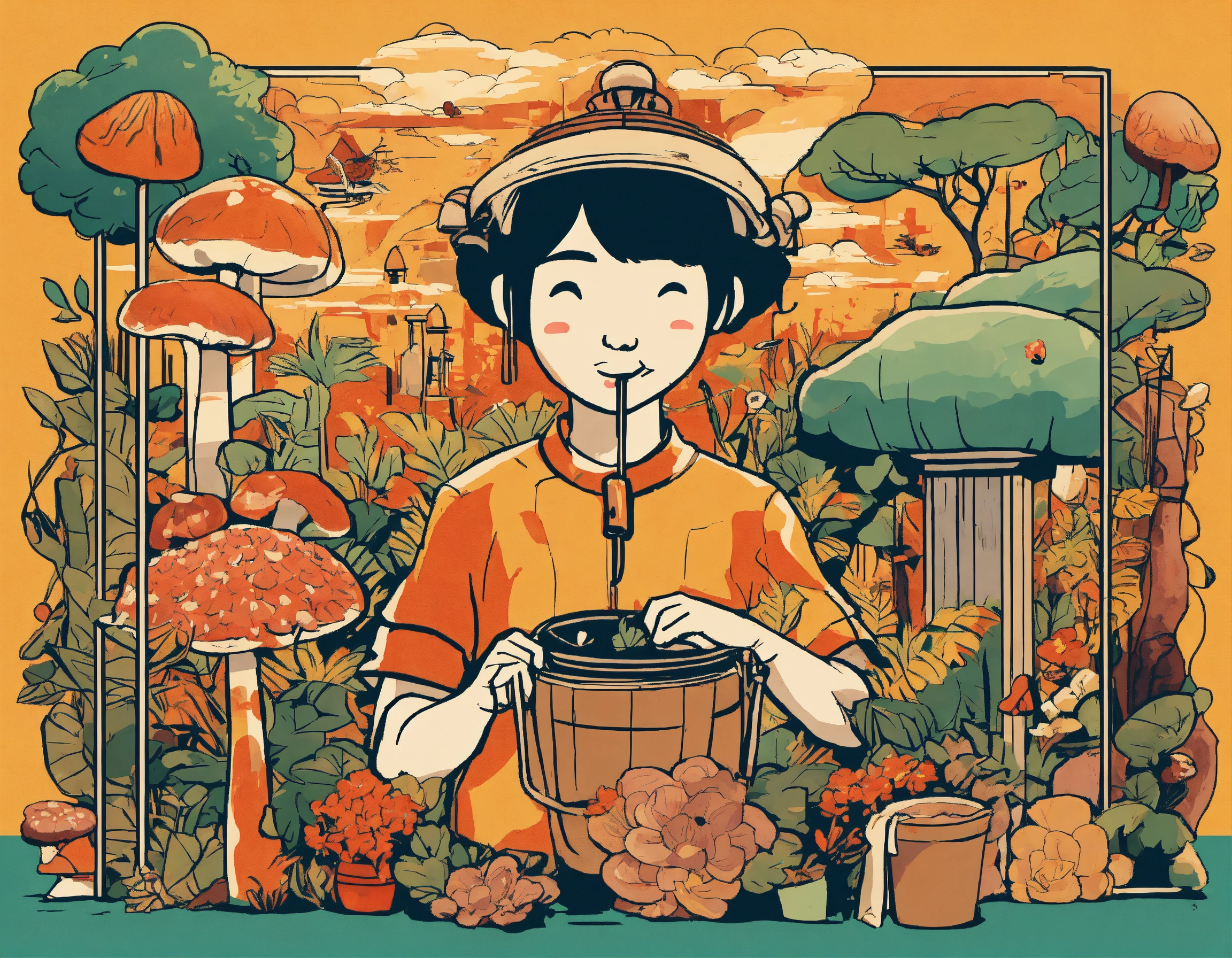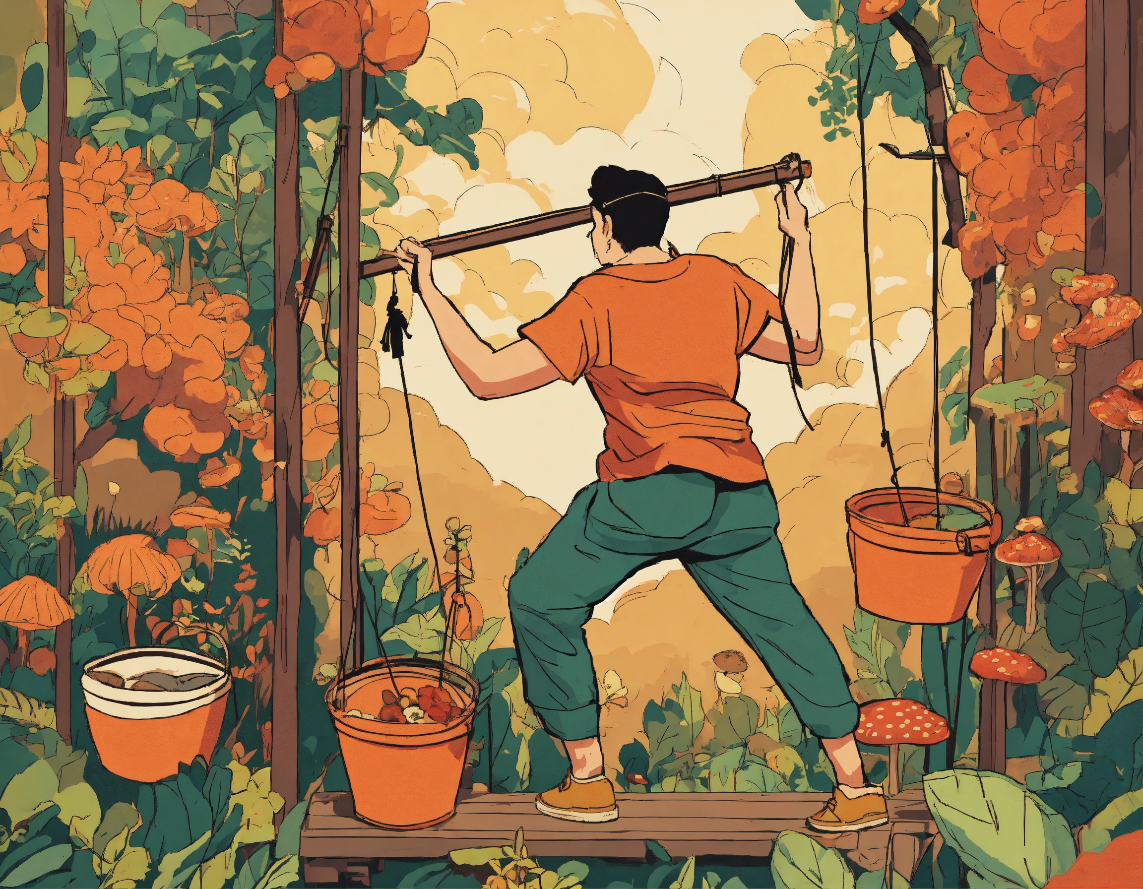 (hand lettering production) wall mural, japanese sticker minimalism, jovial man, wooden rod on shoulders, hands holding rod, fists near face, aerial view walking, two buckets hanging from ropes, rope attached to pole on mans torso, asian botanical them, studio ghibil animation dvd screengrab, graffiti style, bauhaus, stylized ferns, mushroom canopy, woman in summer dress, outdoor crowded food festival, art on wall, 10 feet by 8 ft graphic muralism, food festival antics, mrseaves101, hand lettering composition, limited palette