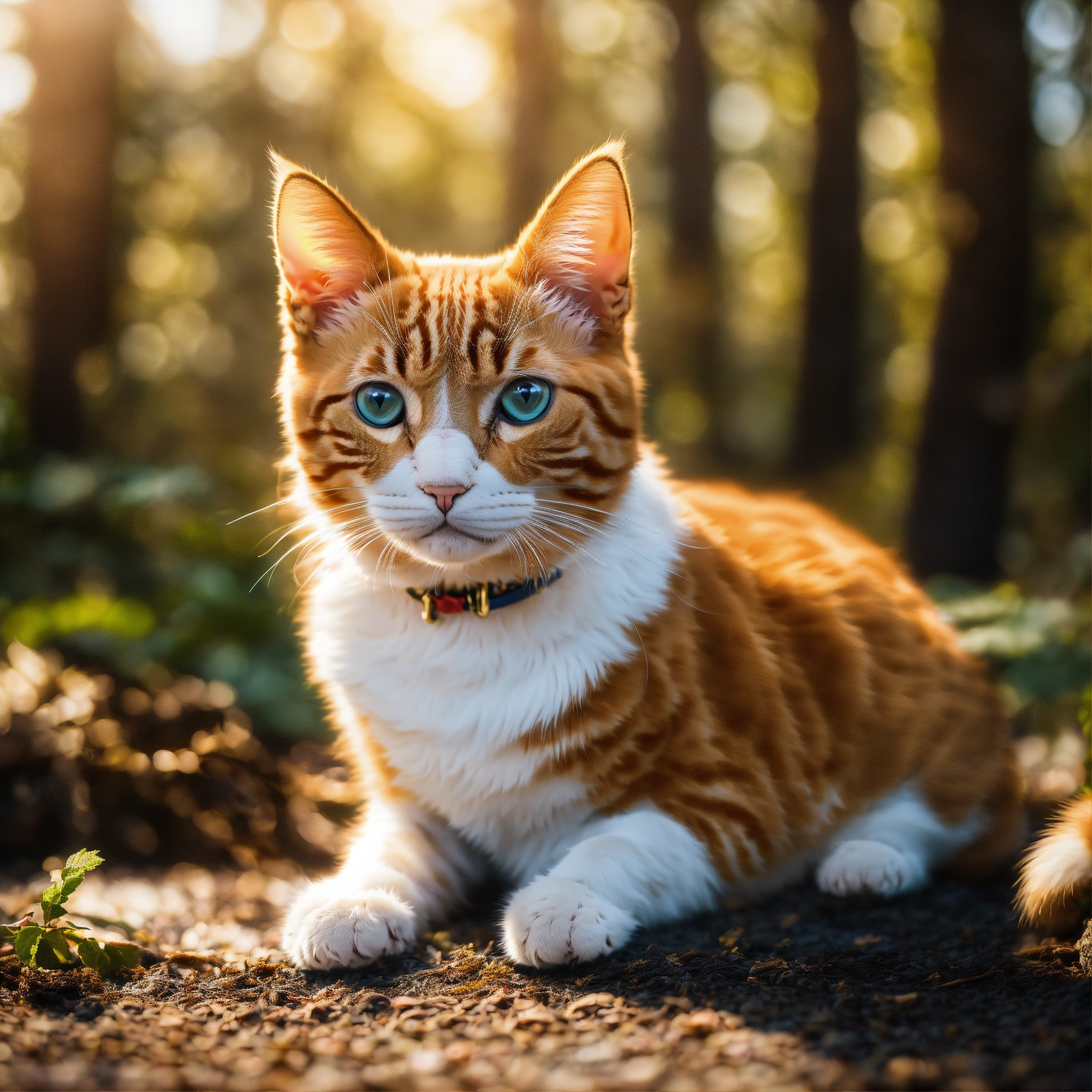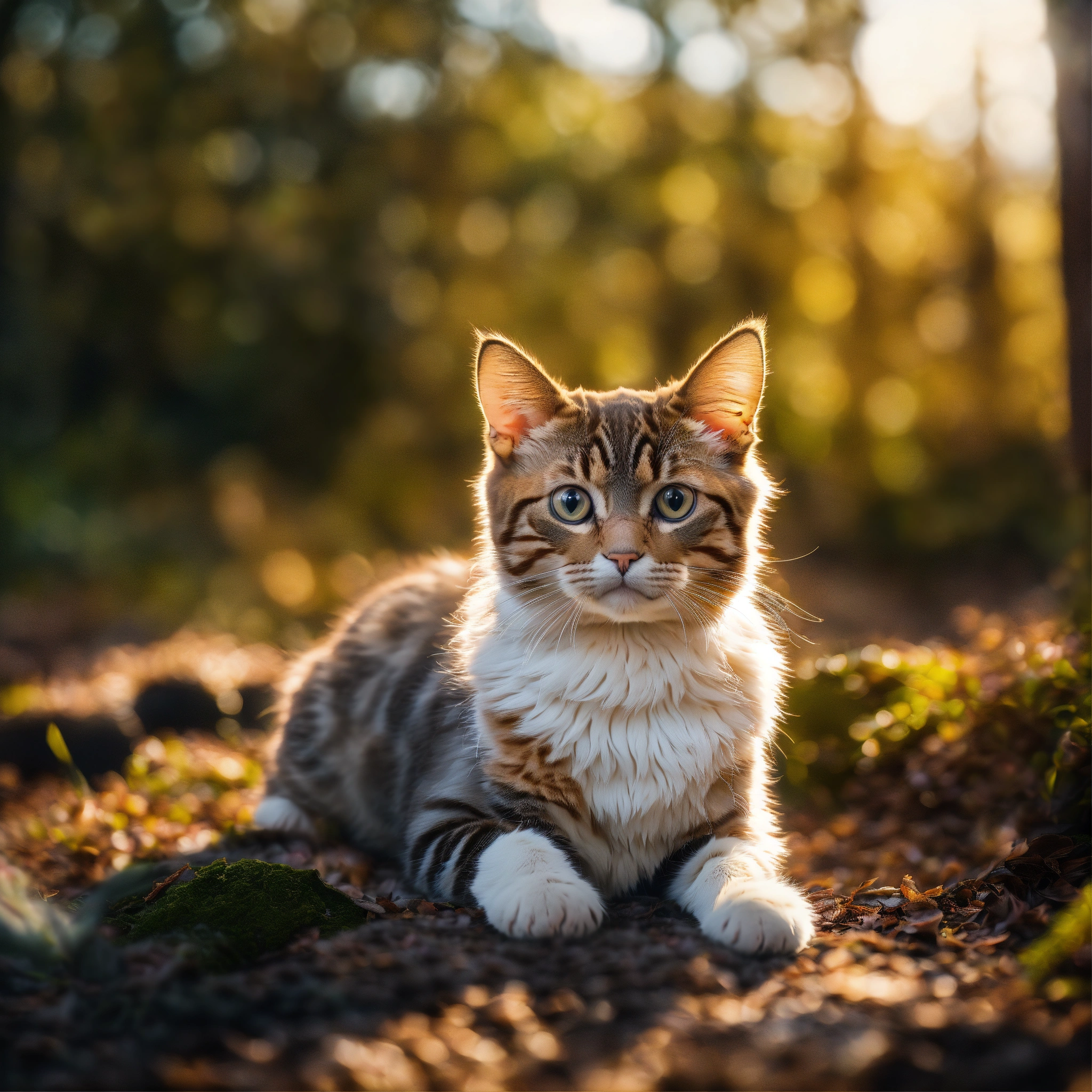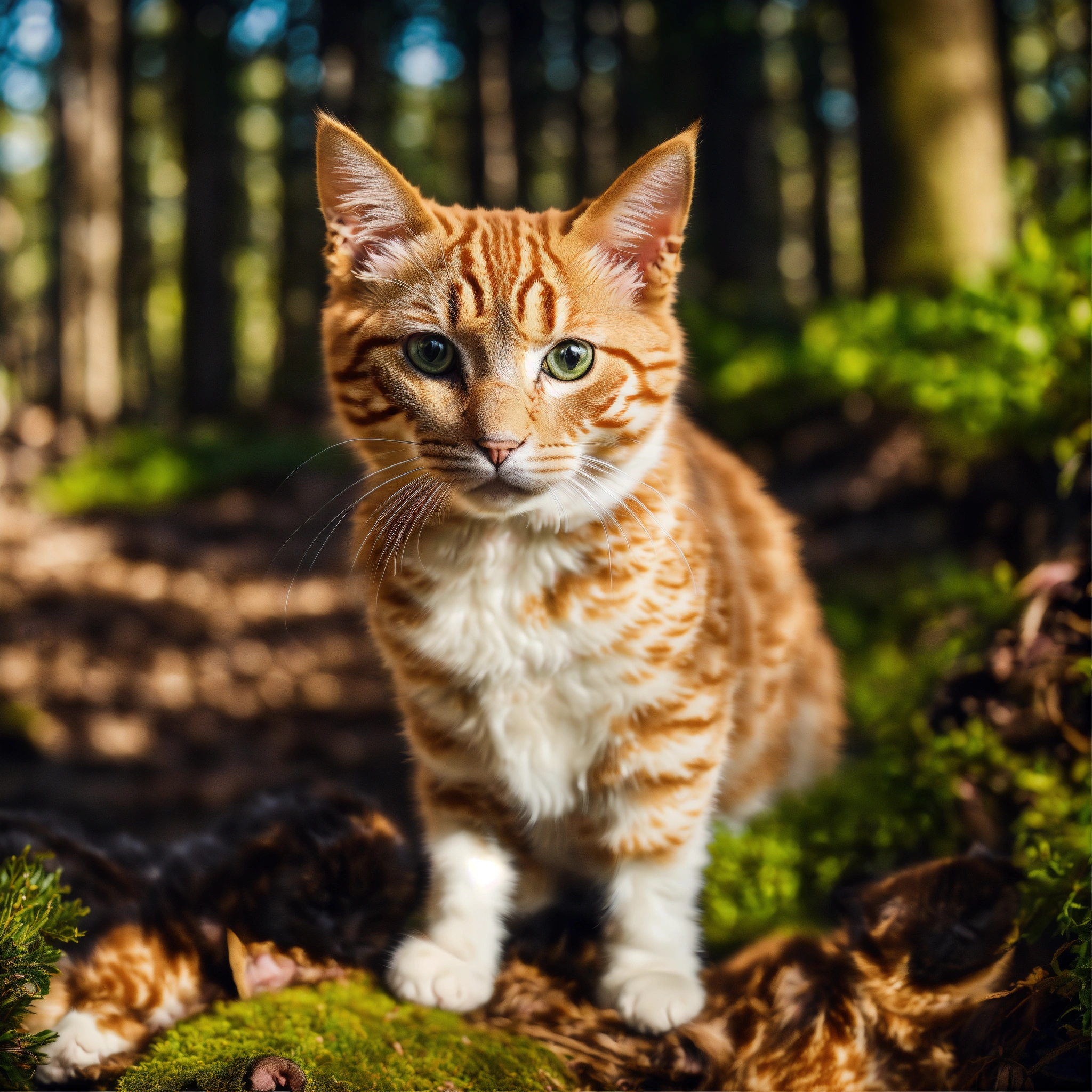 Medium shot, a cute ((cat as dog1.2)), moody lighting, best quality, full body portrait, real picture, intricate details, depth of field, in a forest, fujifilm xt3, outdoors, bright day, beautiful lighting, raw photo, 8k uhd, film grain, unreal engine 5, ray tracing
