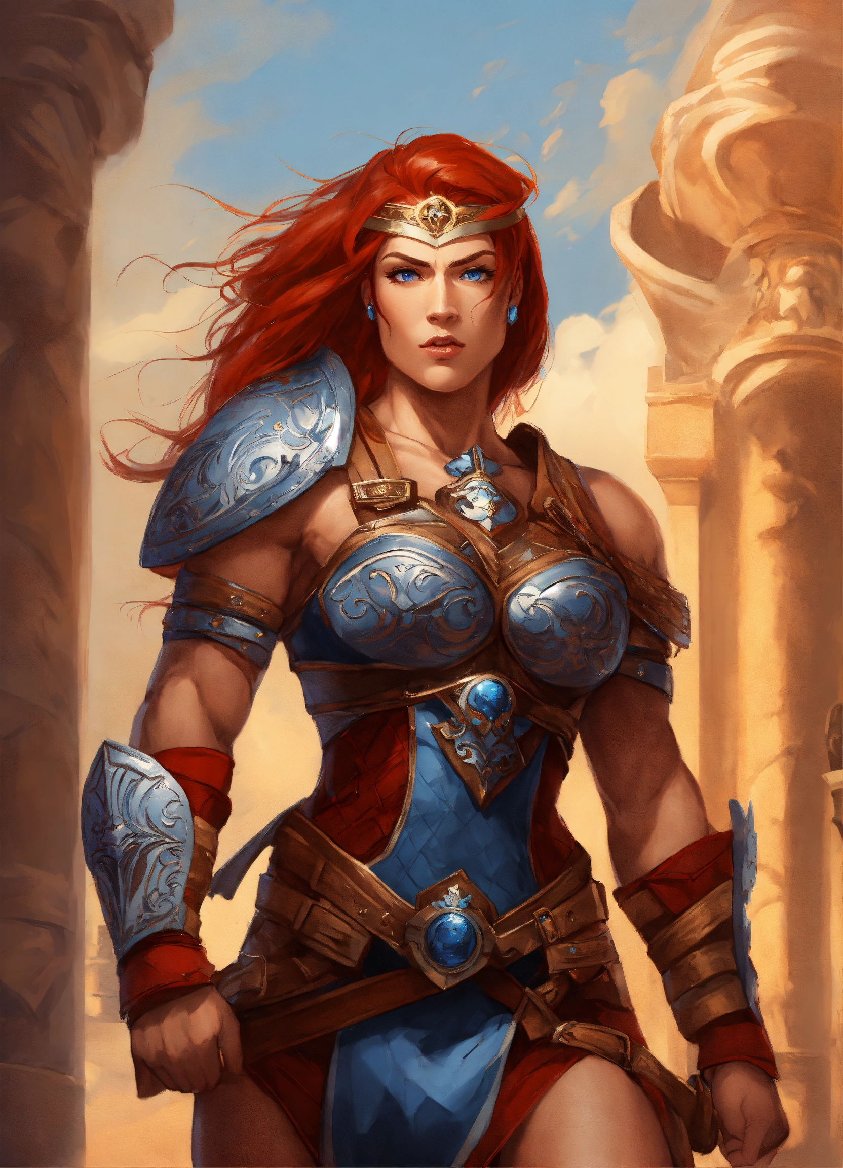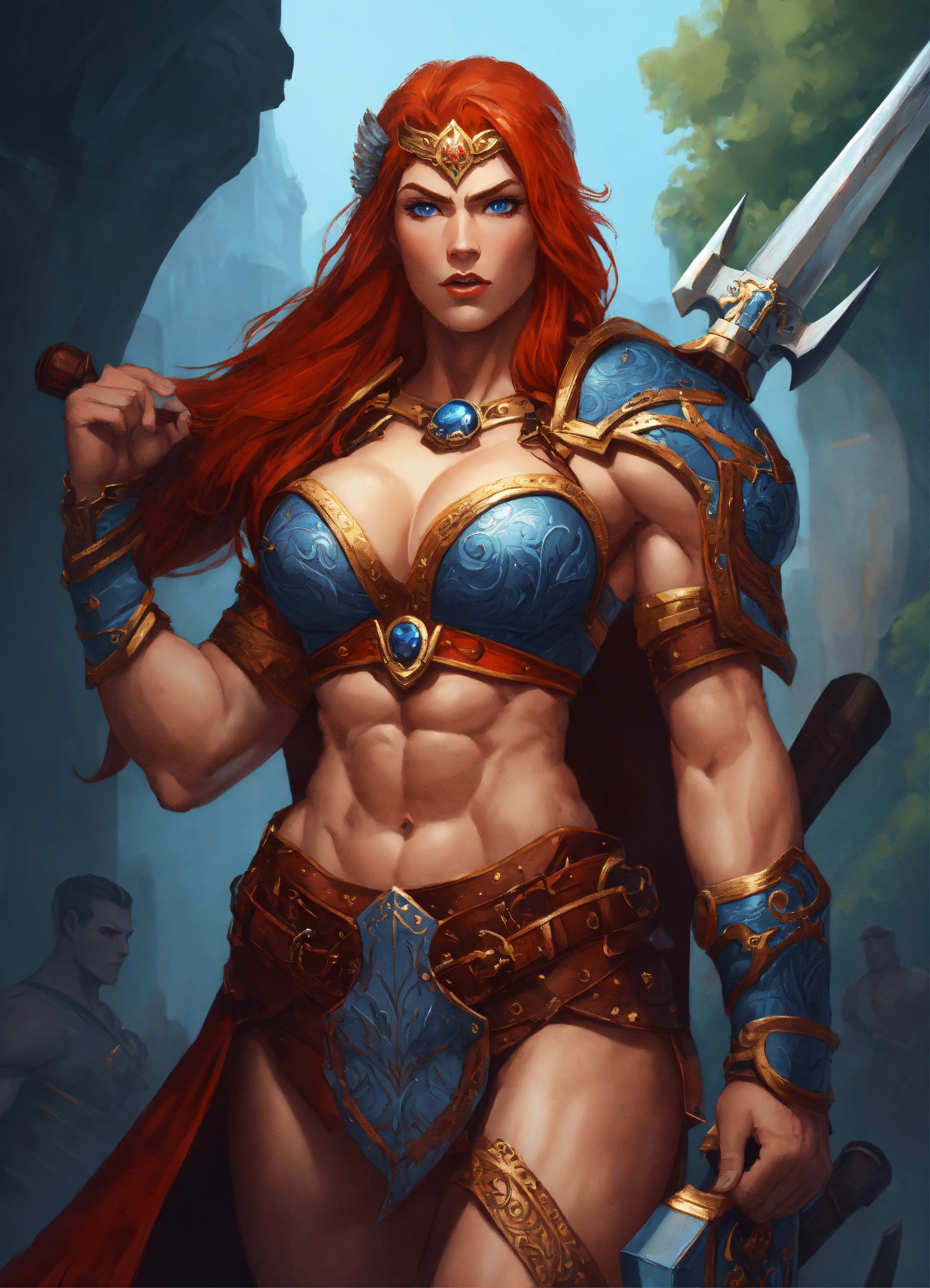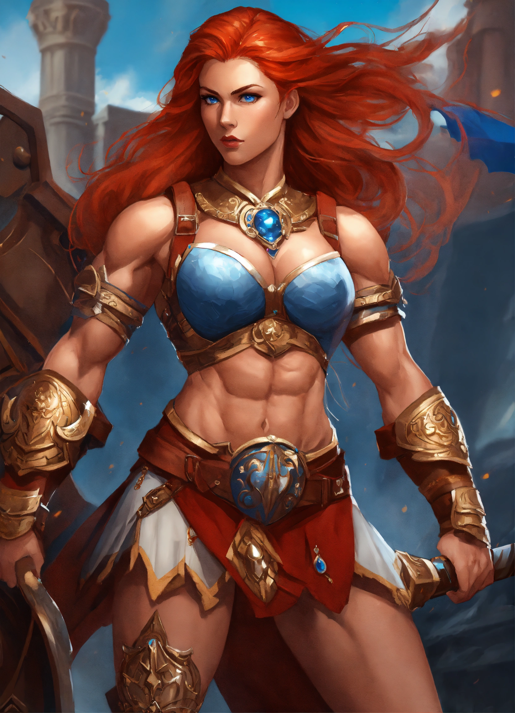 Fantasy art, muscular norse goddess, strong, buff, tall, bulky shoulders, muscular arms, muscular legs, handsome woman, female, red hair, blue eyes, portrait, ornate shoulder guards, nordic chieftess, giantess, very muscular, warhammer-inspired artwork.