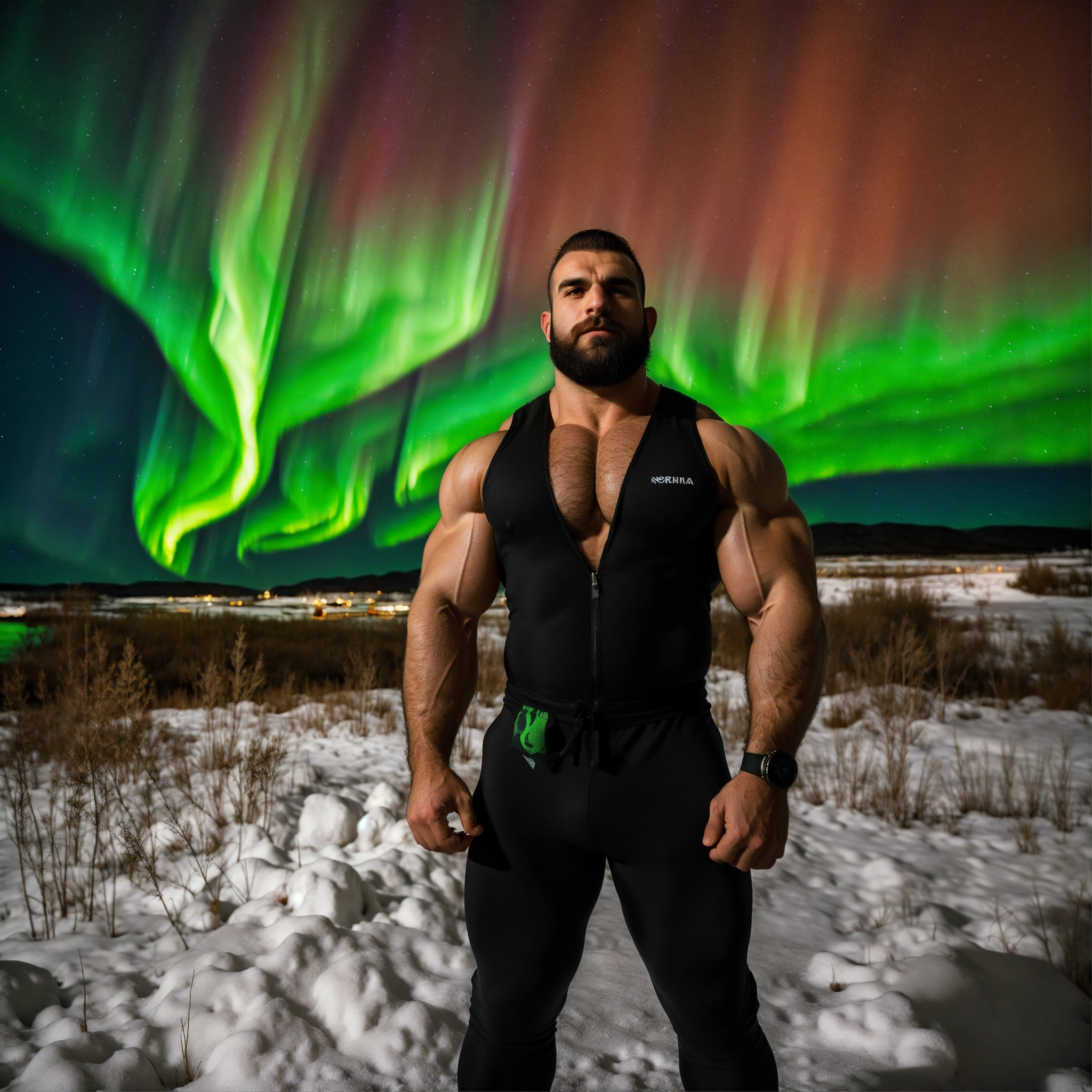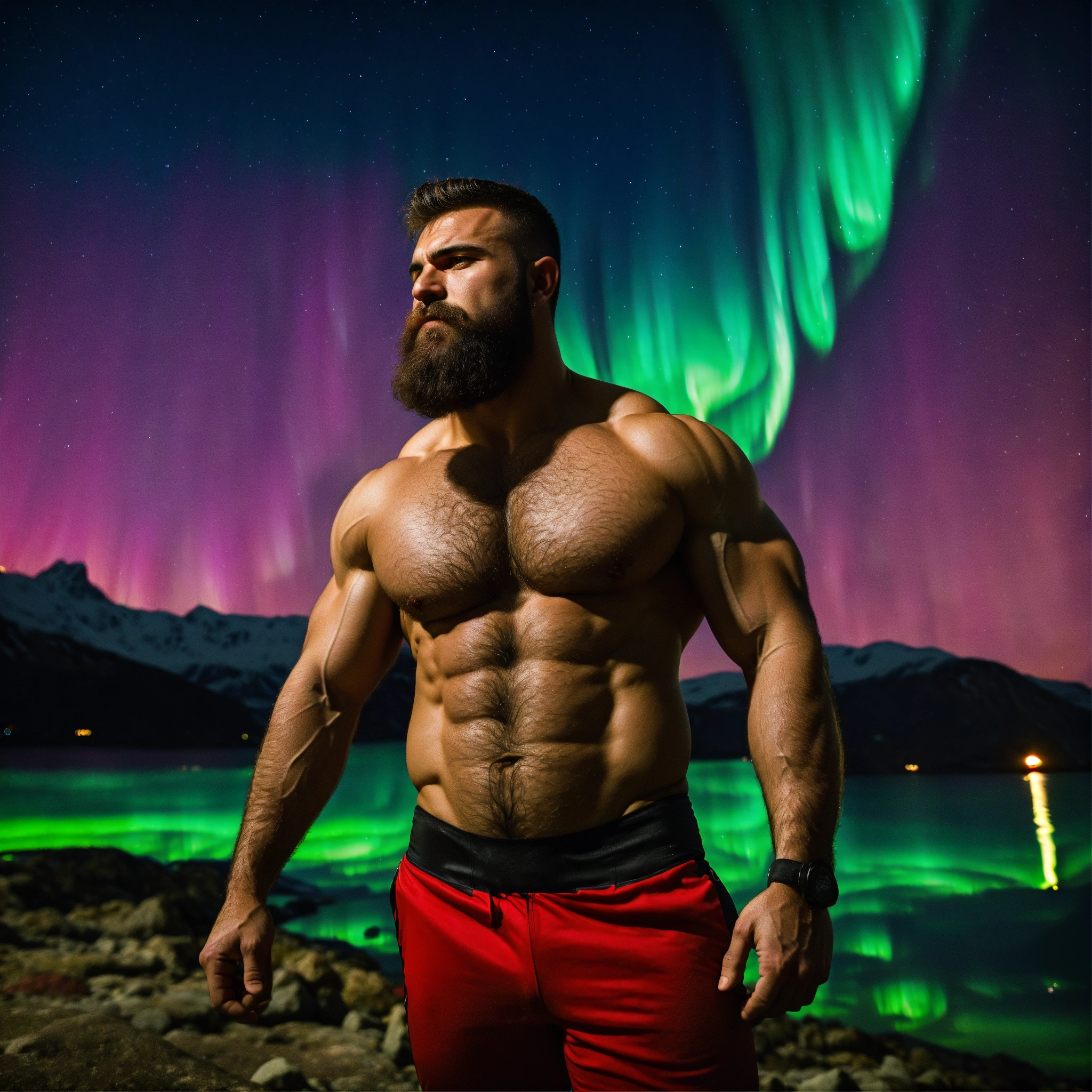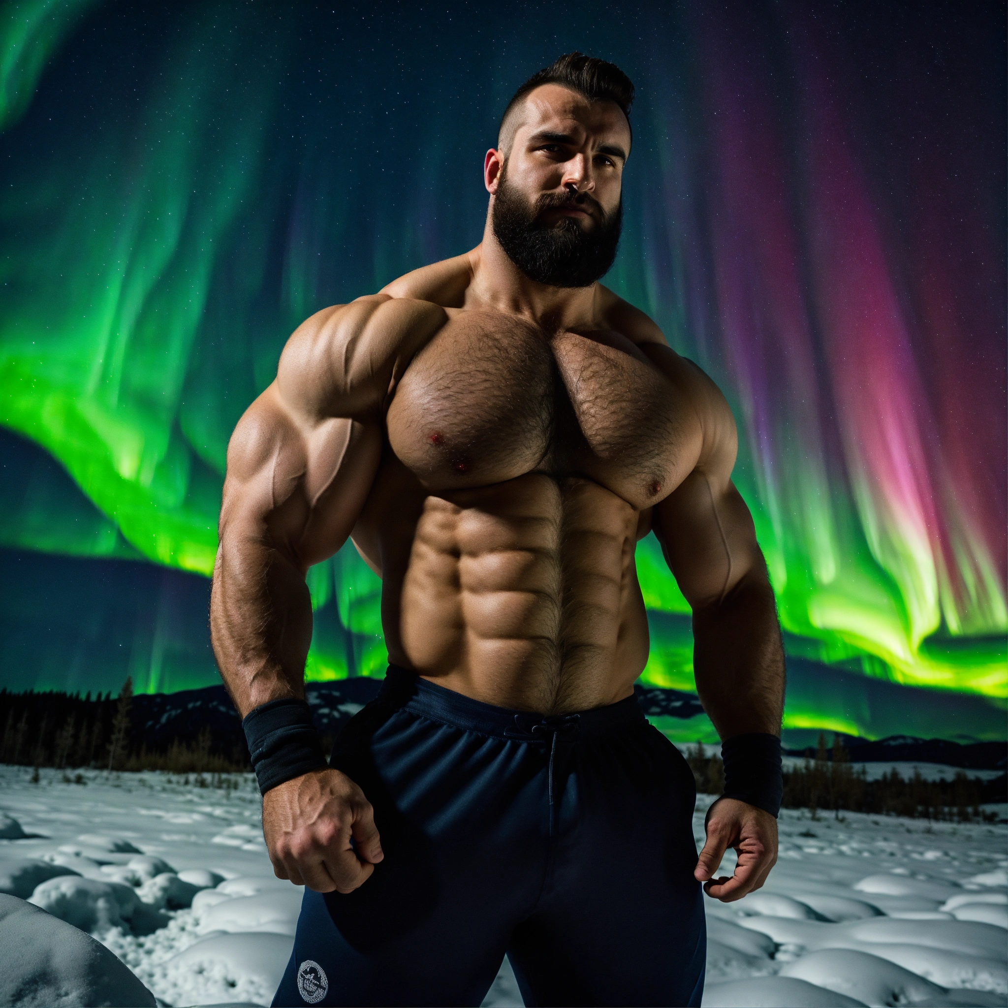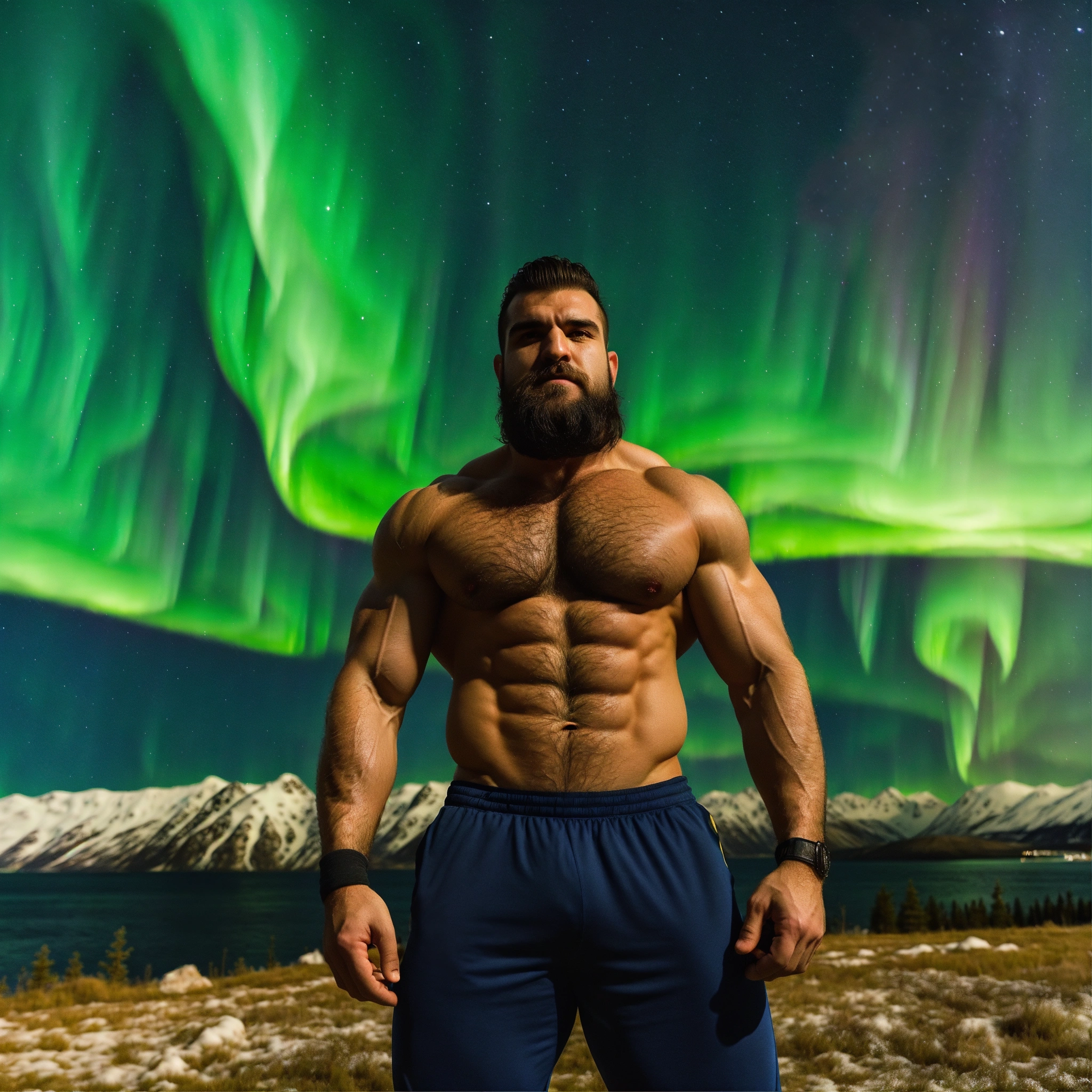 30-year-old hairy albanian man with big muscles, big bodybuilder, body like a wrestler, under the northern lights