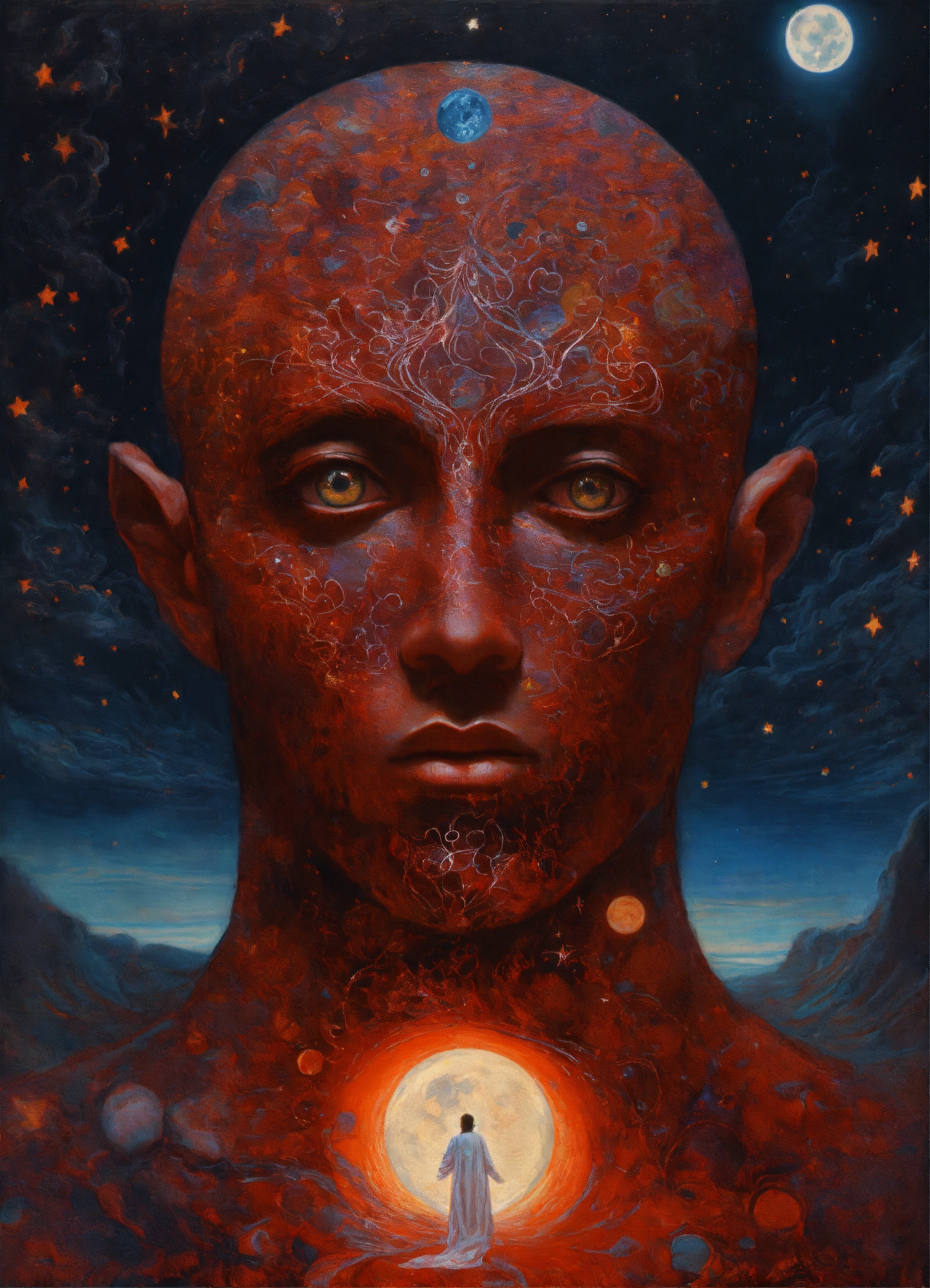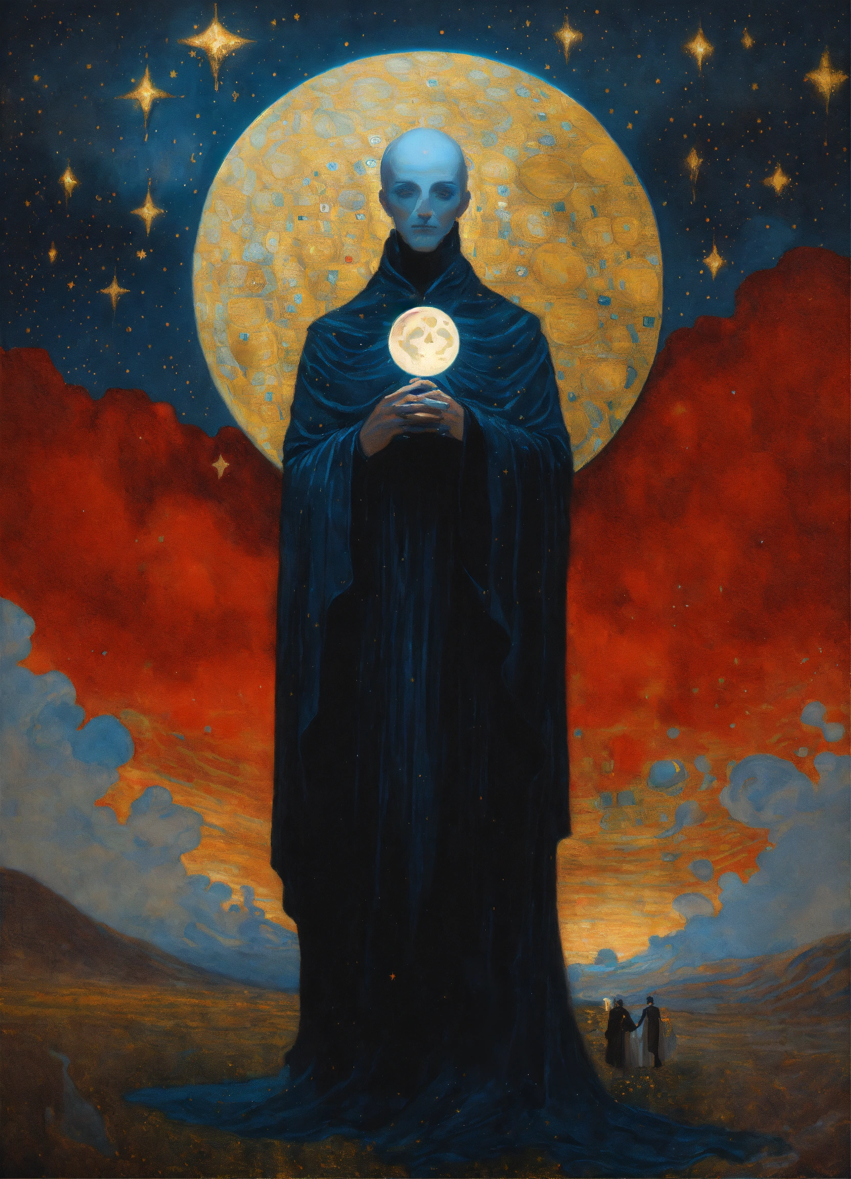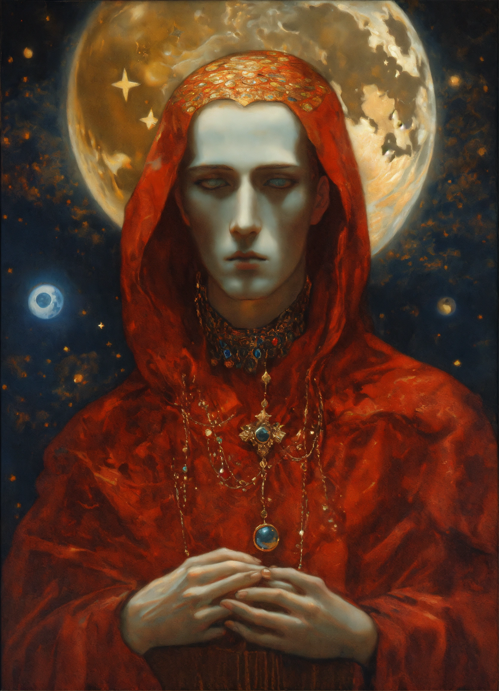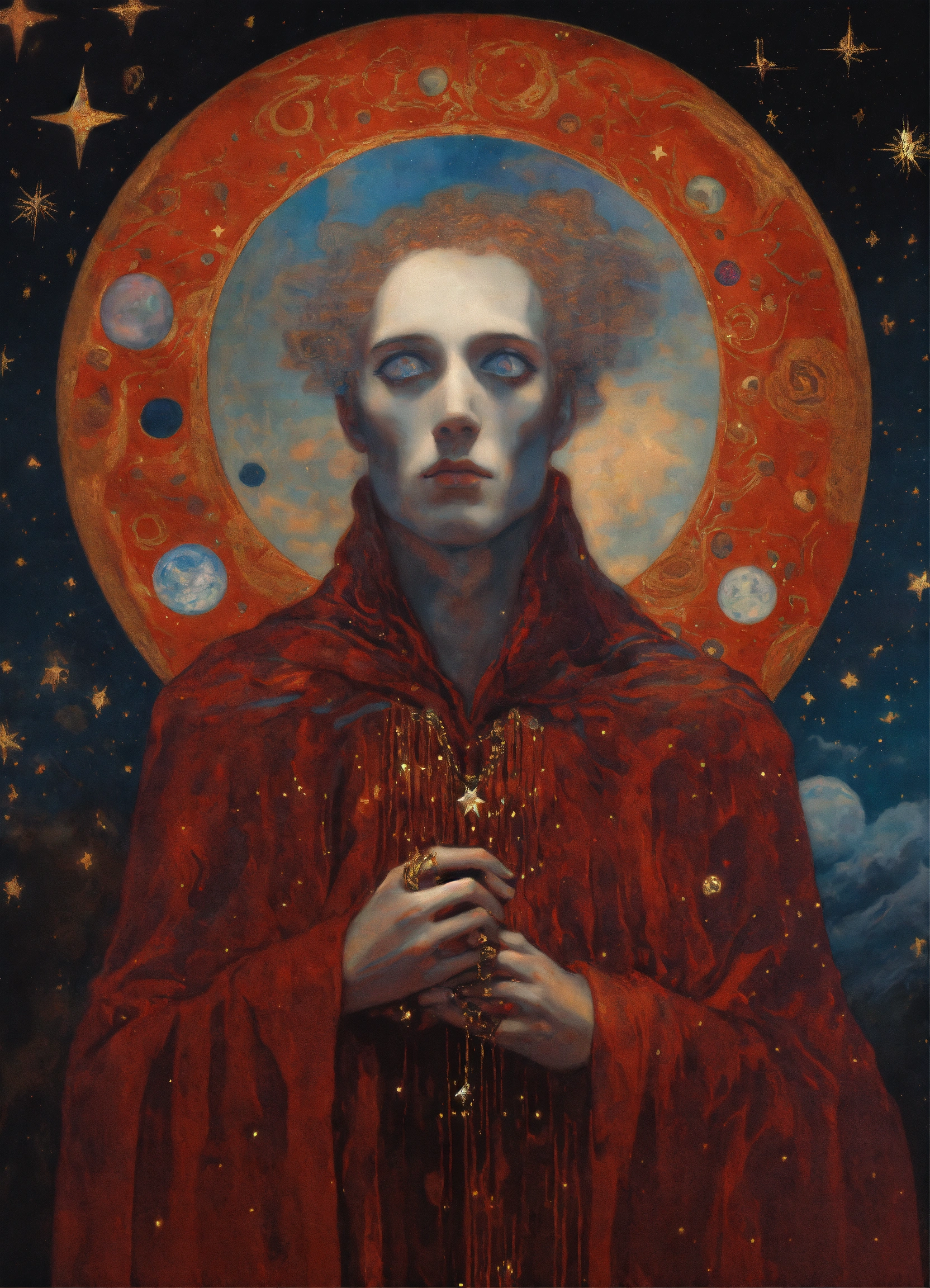 Romantic dark fantasy novel illustration of a gothic ghost man stands under the stars and moon, anatomically correct hands, perfect hands, perfect faces, dreamy, by artist gustav klimt, by artist "agostino arrivabene". candy clouds, stars by artist "eileen agar", royo, beautiful face, detailed eyes, red