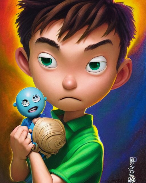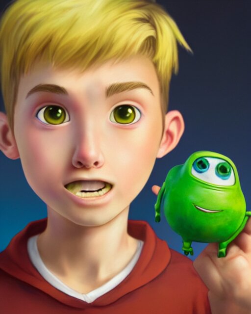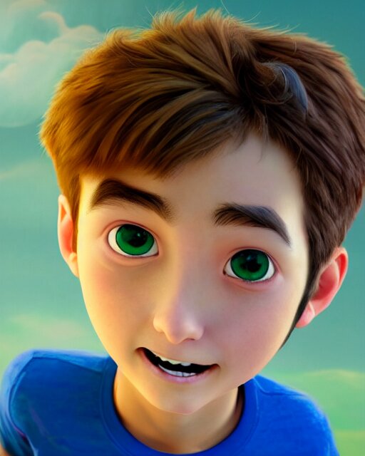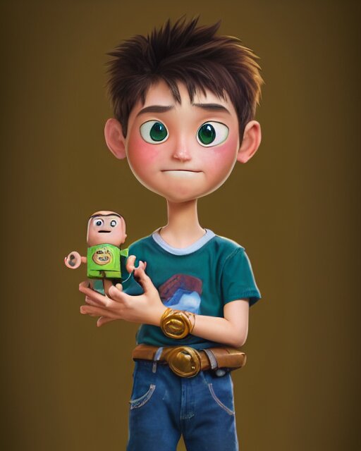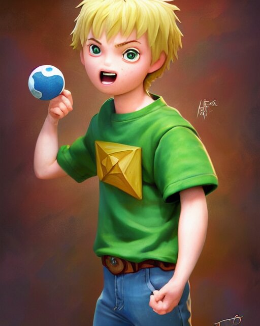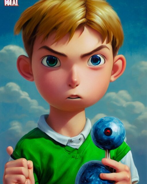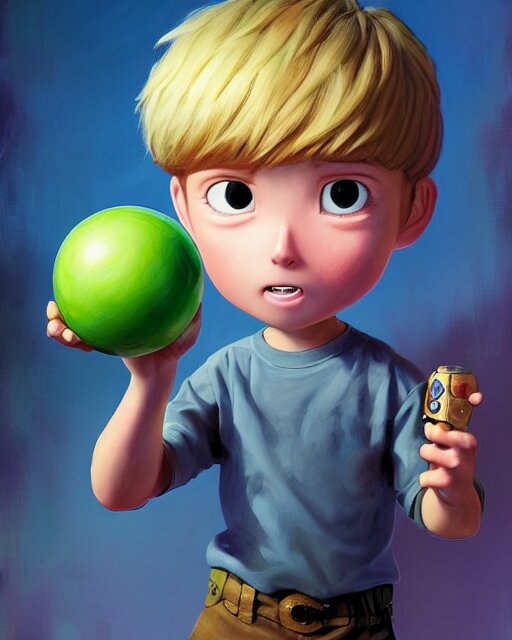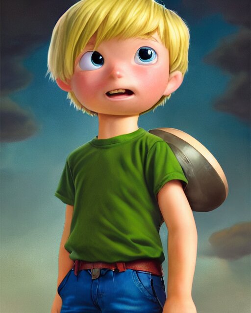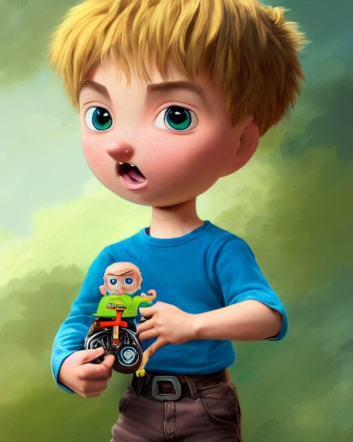 An epic fantasy comic book style portrait painting of a young boy, very expressive, light brown piercing eyes, mischievous, smirk, round face, blonde medium hair, wearing a blue shirt and green shorts, holding a toy car in his hands, awesome pose, character design by mark ryden and pixar and hayao miyazaki, unreal 5, daz, hyperrealistic, octane render, cosplay, rpg portrait, dynamic lighting, intricate detail, summer vibrancy, cinematic