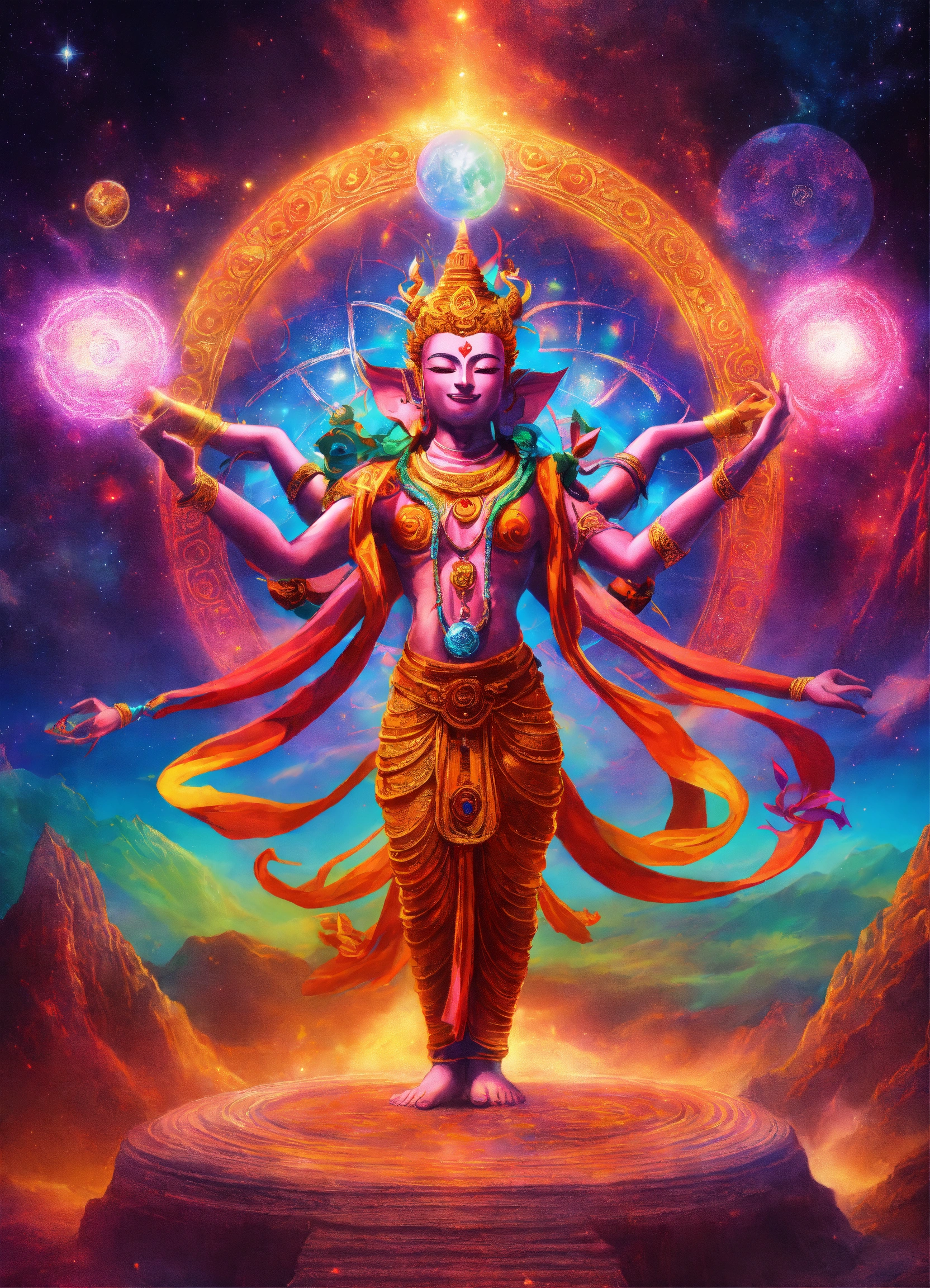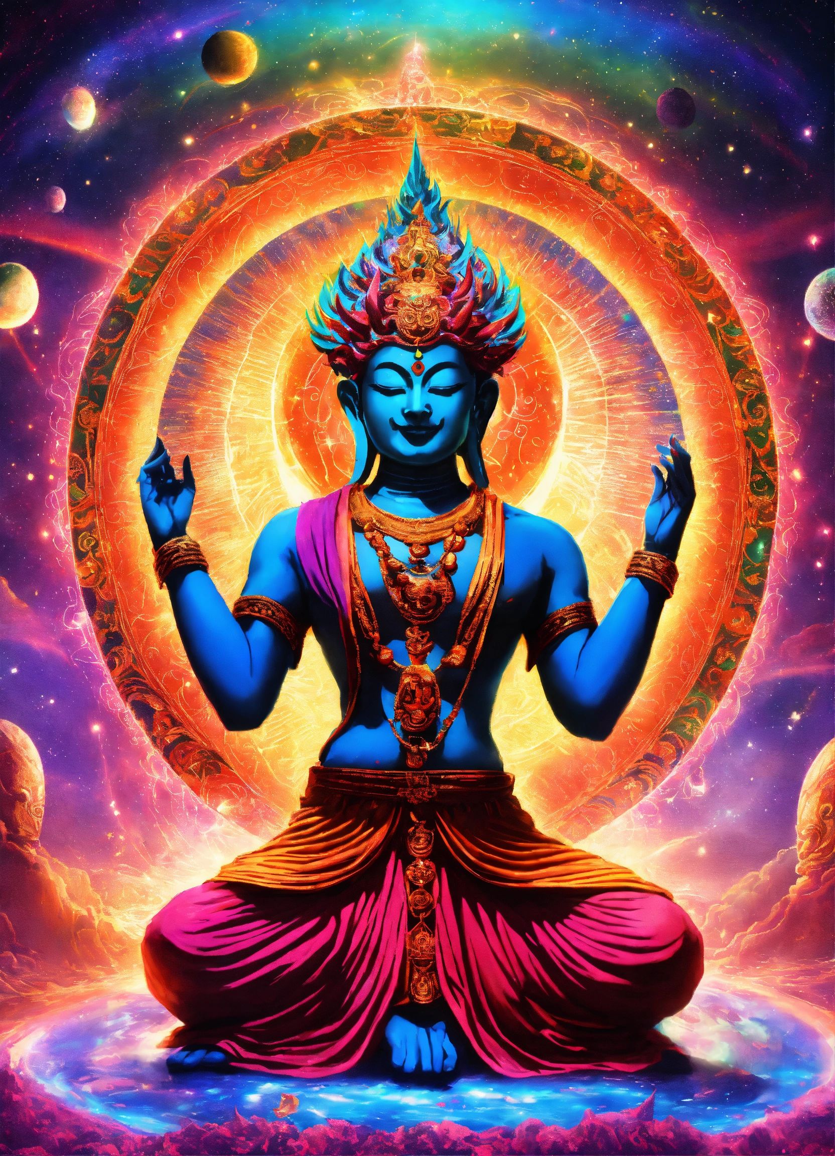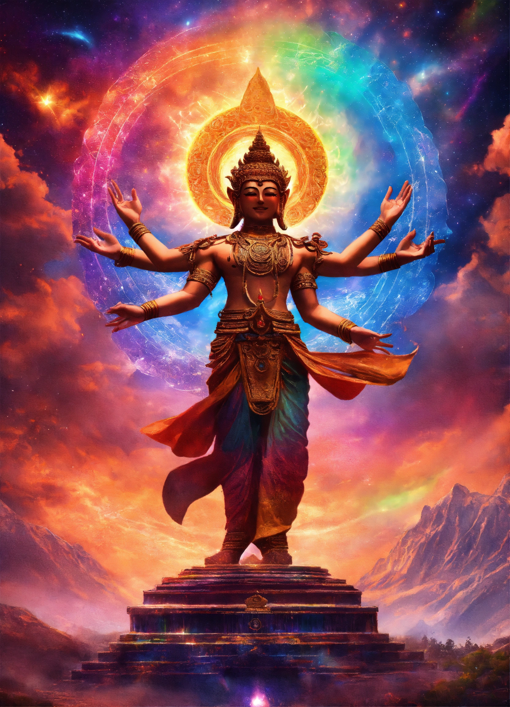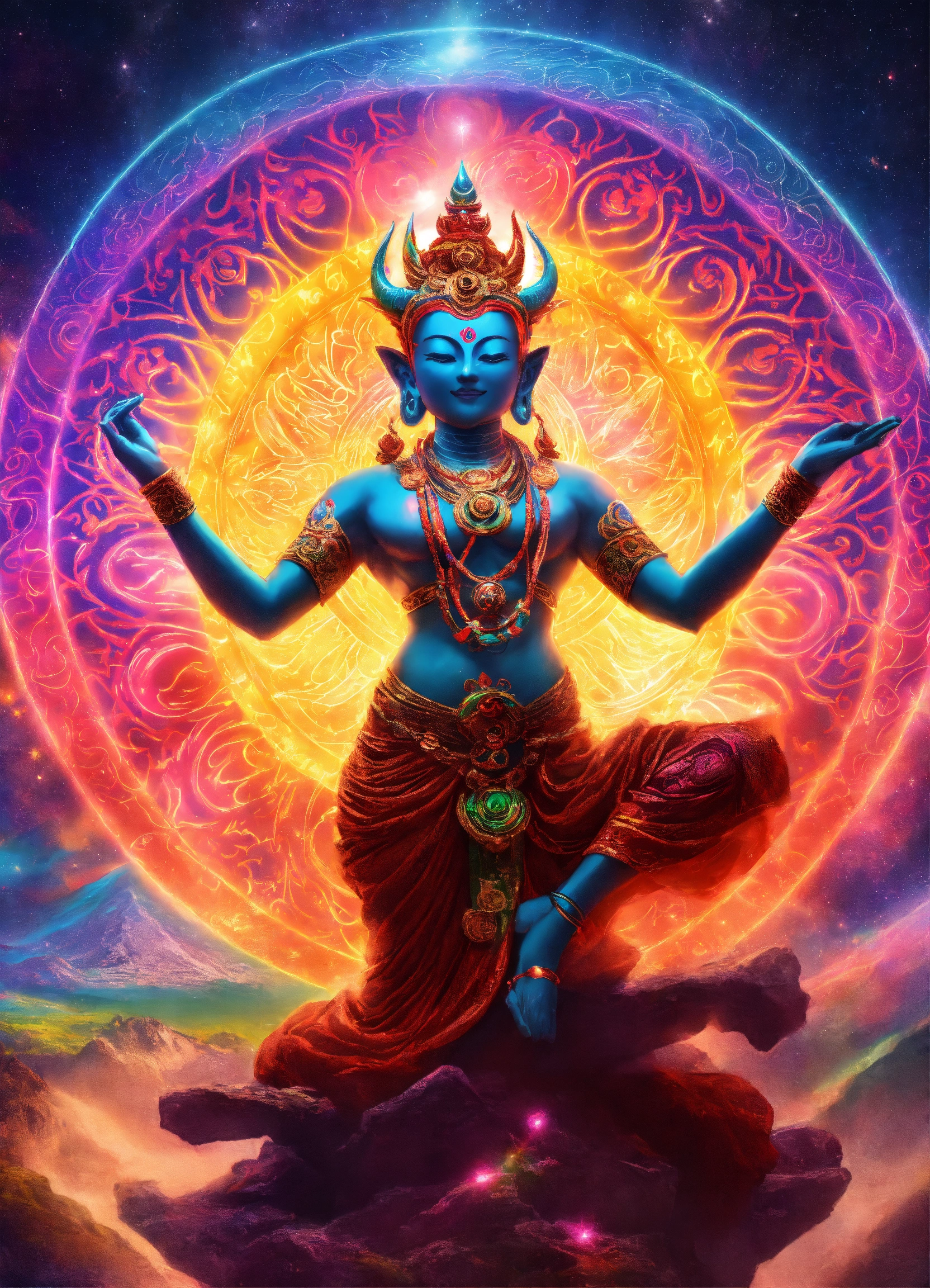 Buddhist demon diety dancing in cosmic rainbow light with dmt light beings in a celestial realm