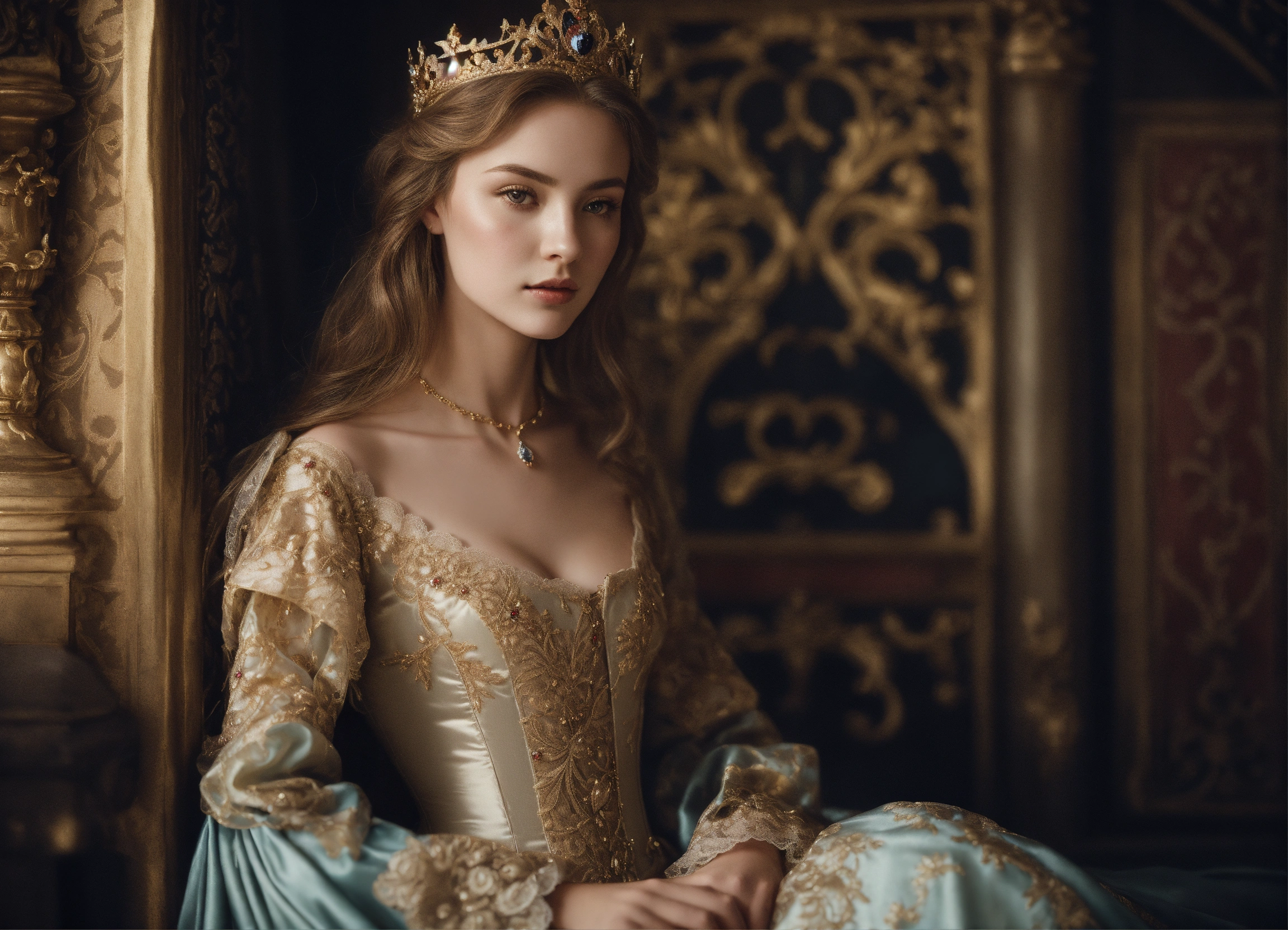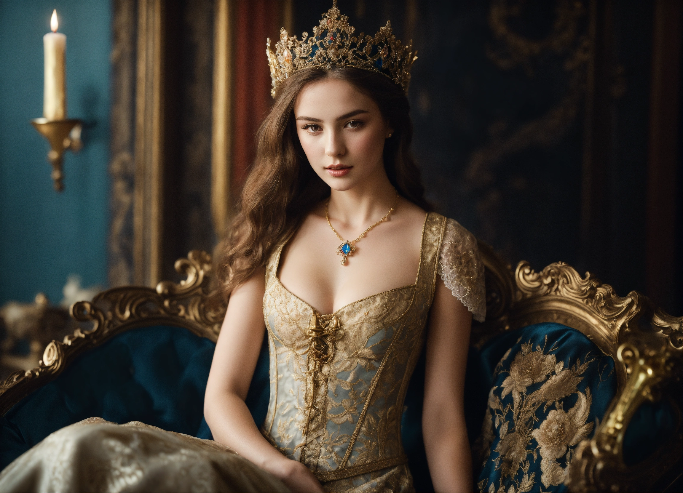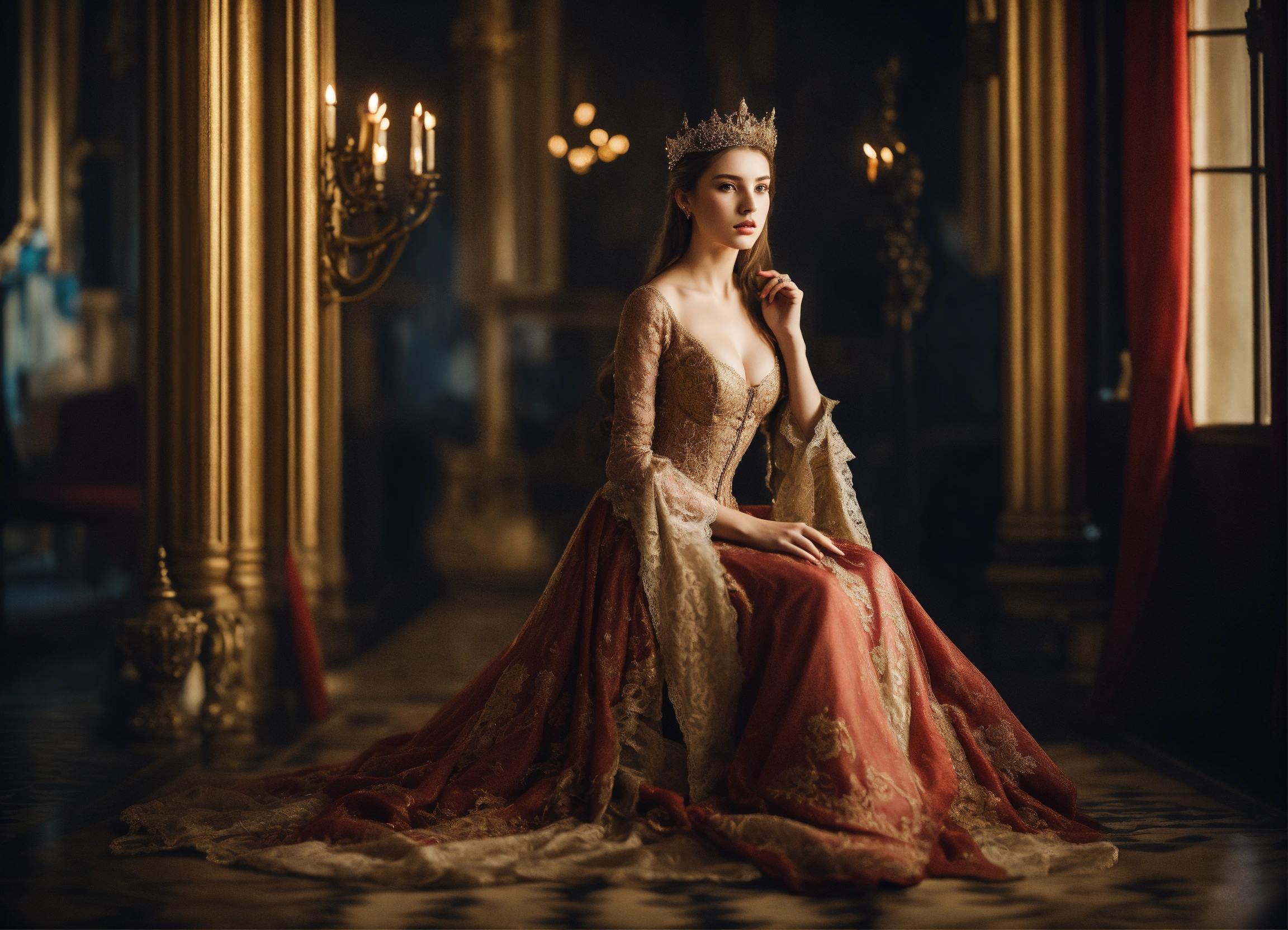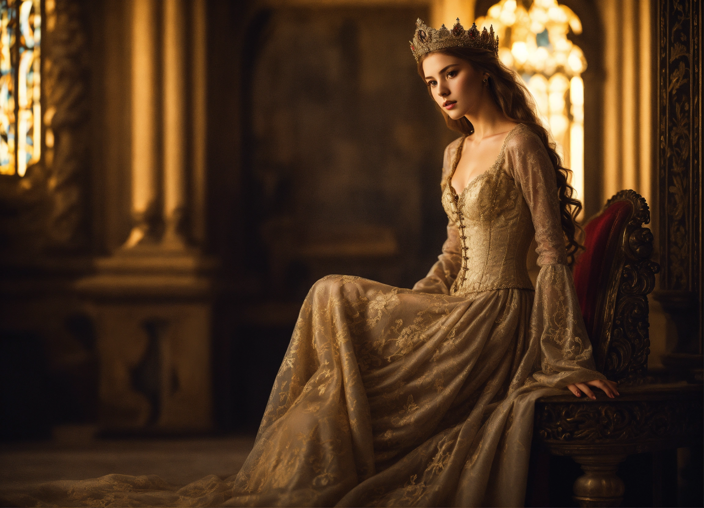 Fine art portrait photography, medieval setting, full body, very slim juvenile noble baroness, very young and juvenile apperearence, 18 years old, beautiful face, very childish appearance, stunningly beautiful, beauty in perfection, lordly, darkblond hair, narrow cheeks, ultra slim, ultra fragile build, ultra slim body, very flat bust, emaciated and thin, she seems ultra fragile, flawless skin, charmful, very narrow face, very pale, bright eyes, noble and elegant narrow medieval lace silk dress with very low-cut decollete and trumpet sleeves, underneath a tight corset, ultra expansive and deep neckline, magnificent finely chased baroness crown richly set with gemstones and a veil, choker, brocade coat, body portrait, intimate, she sits in a noble pose on a throne in a castle, photo realistic, 8k, soft light, volumetric lighting, highly detailed