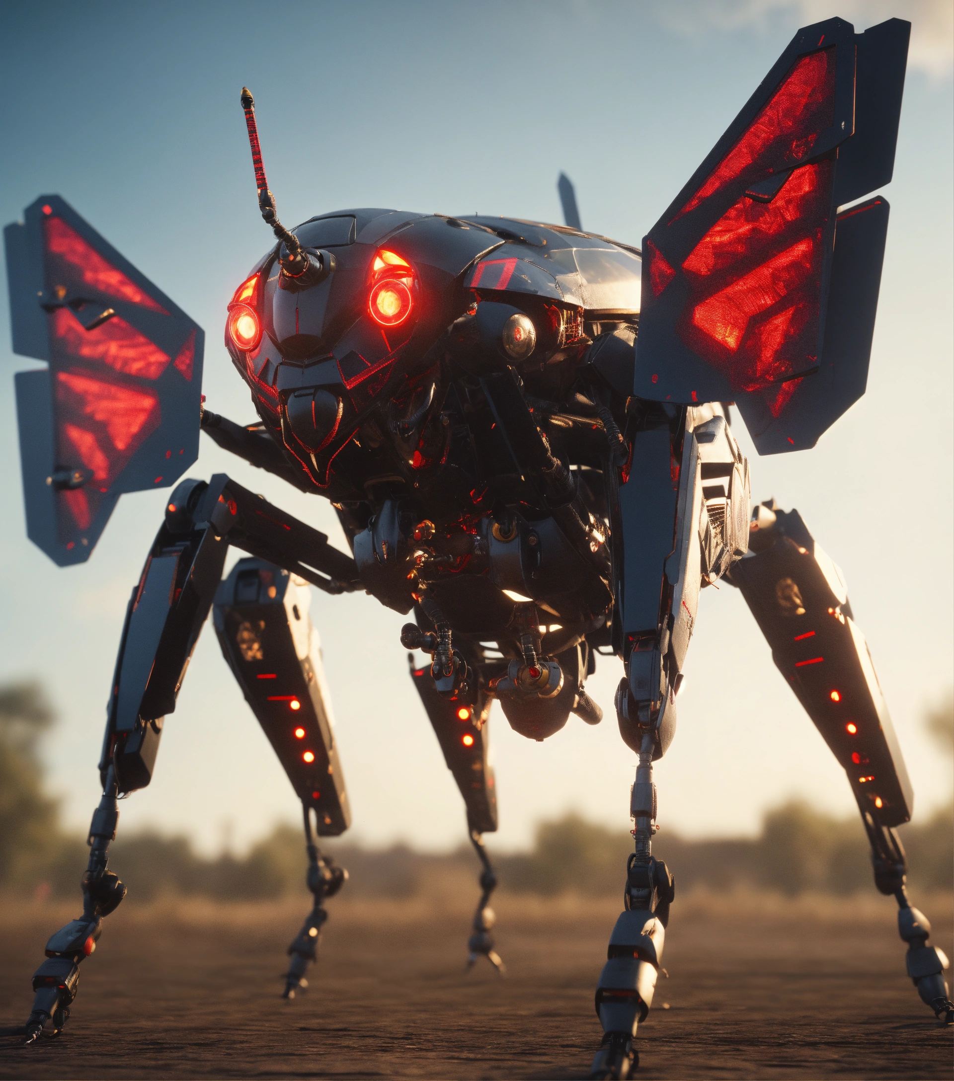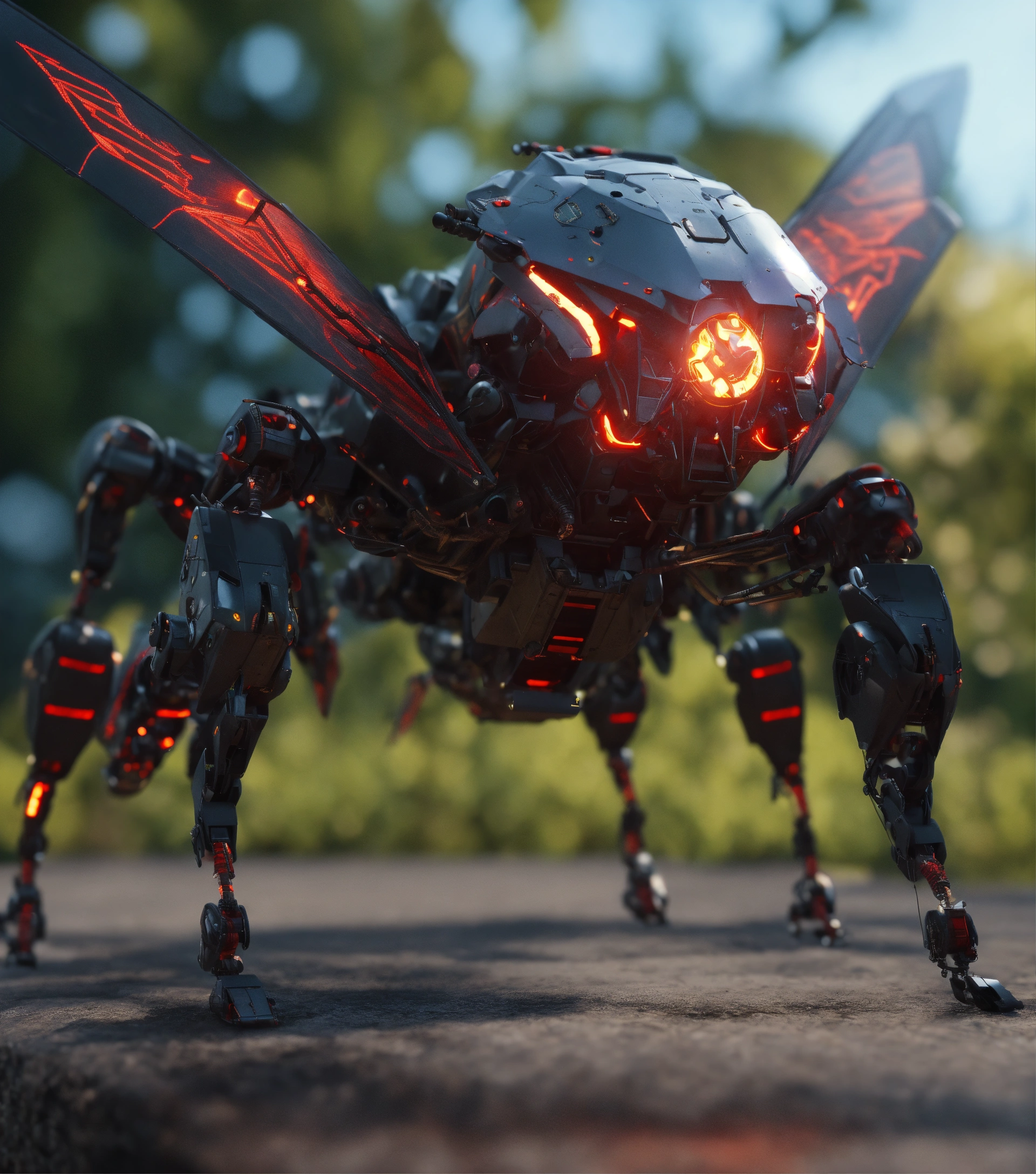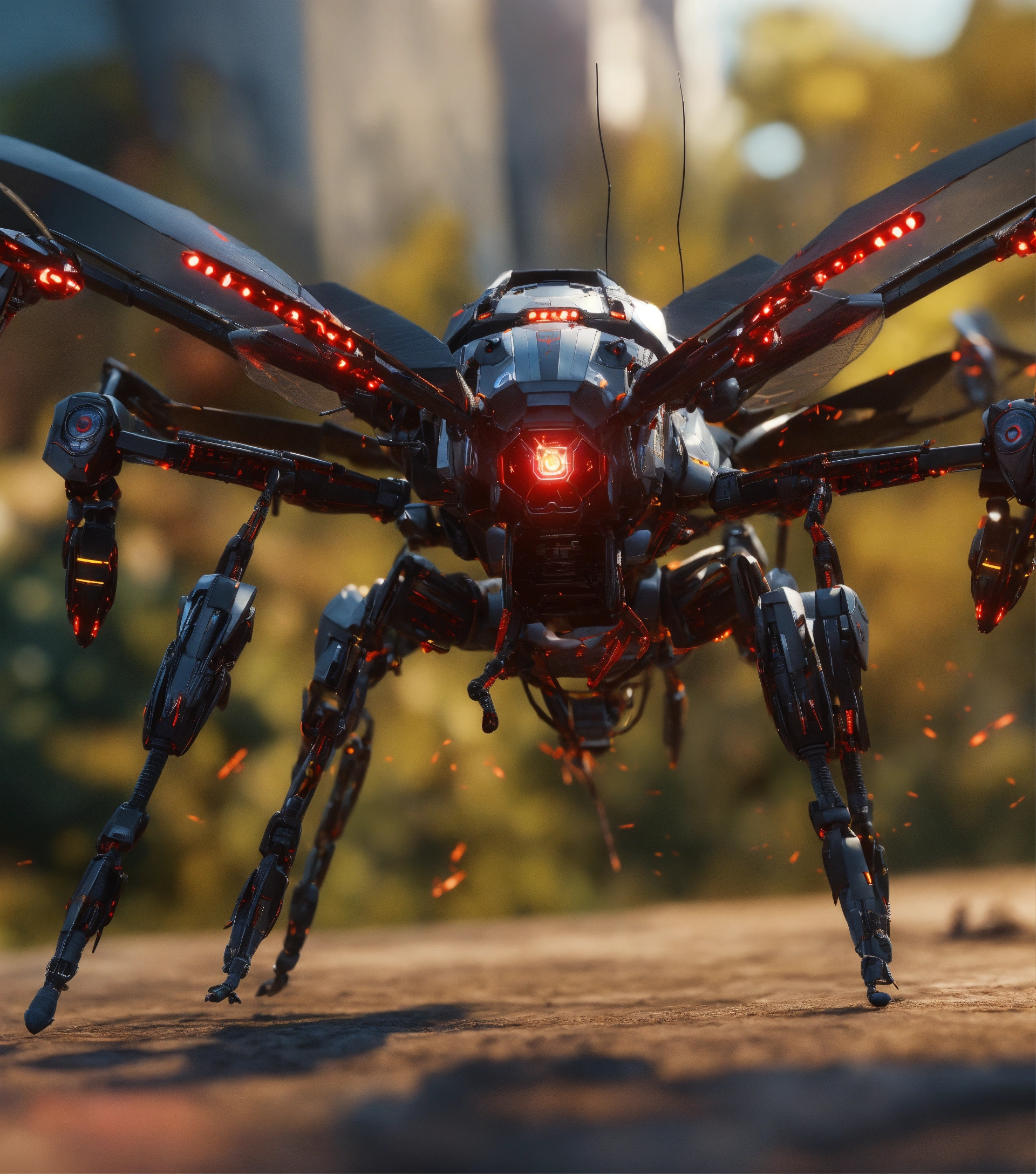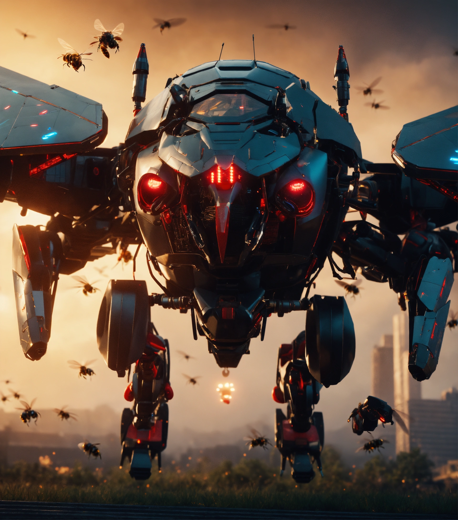 Large flying black angry robotic hornets with red eyes and detailed circuitry markings, fly to attack their prey, realistic, 8k, unreal engine, pixar