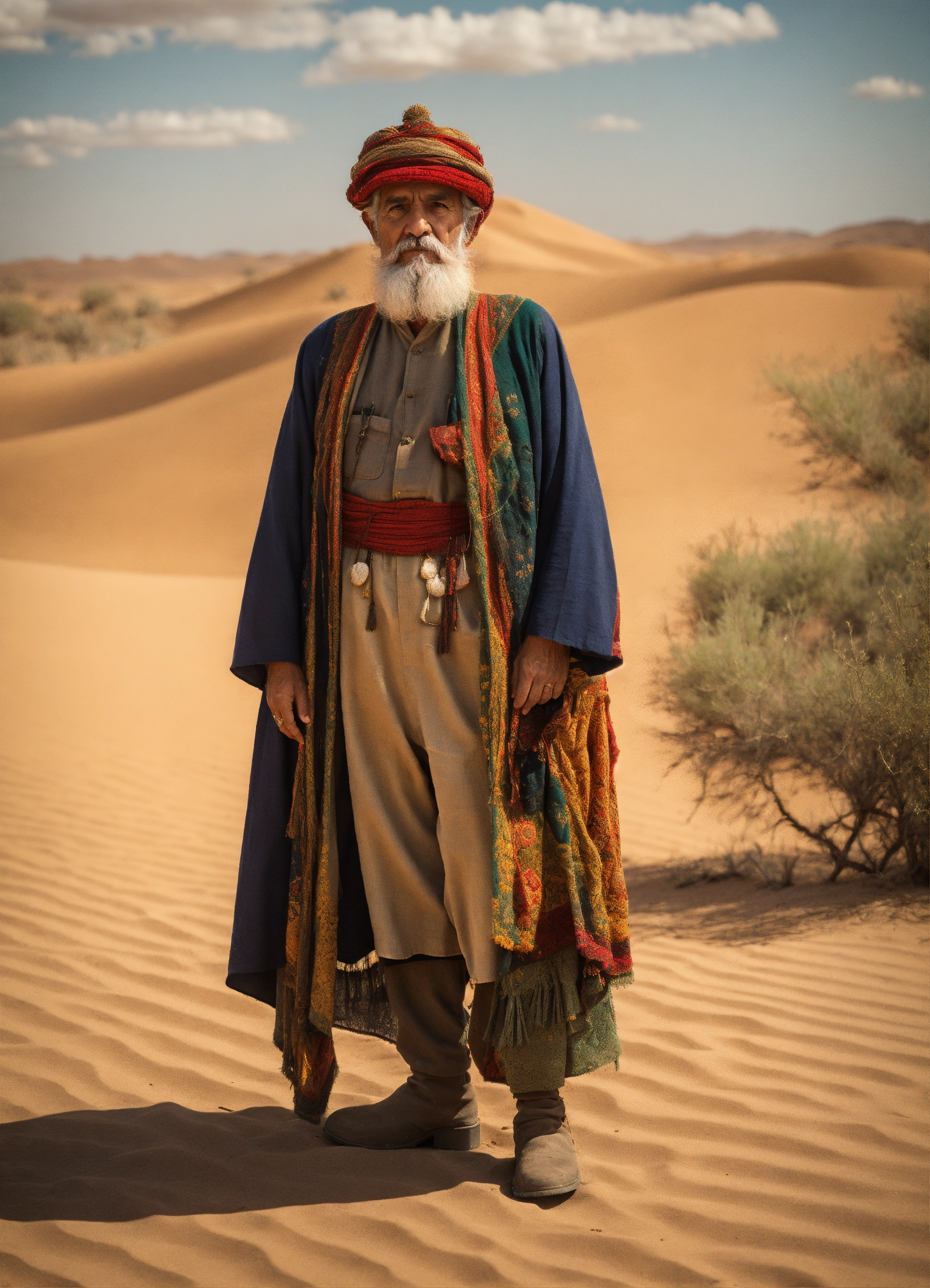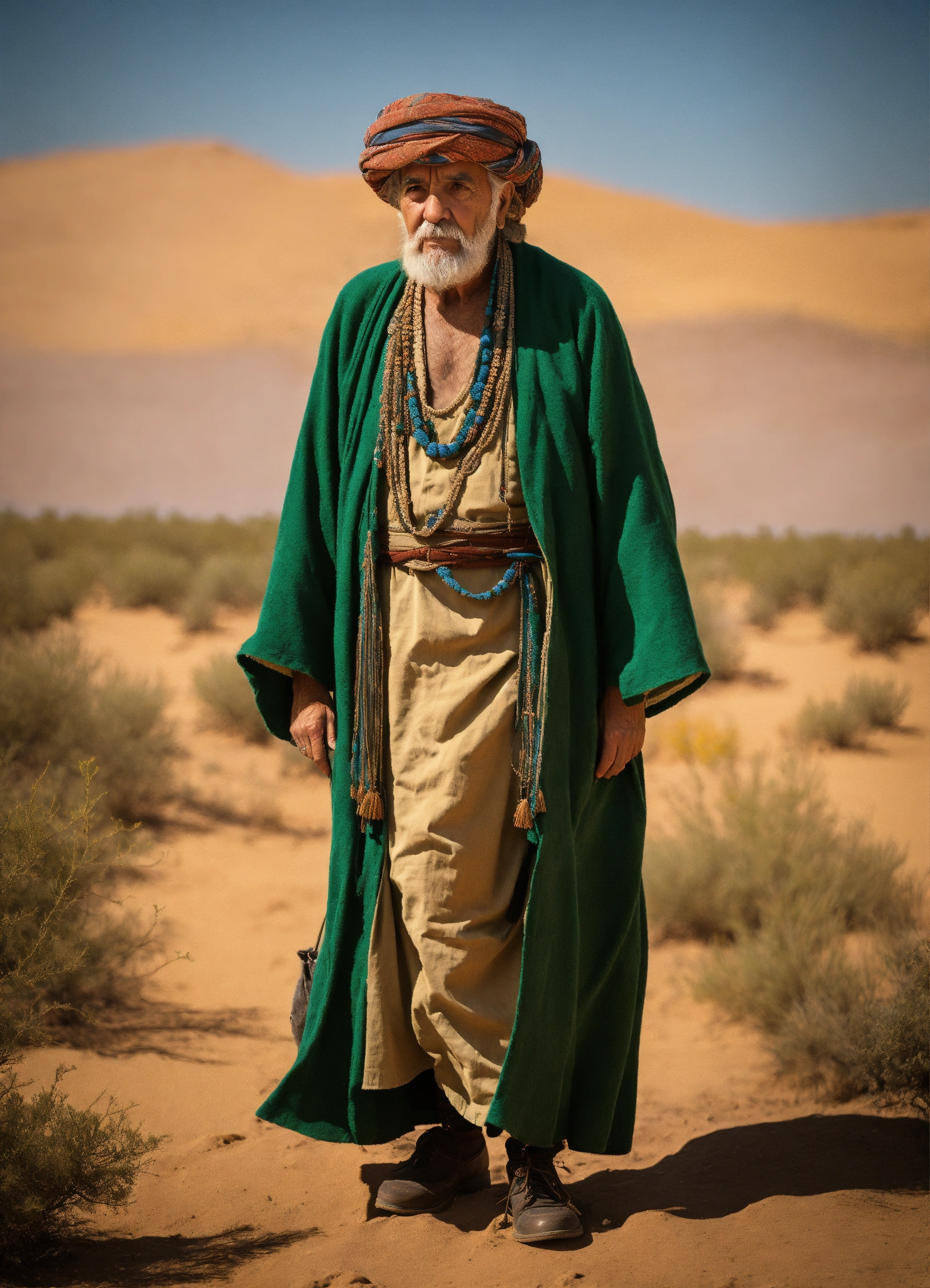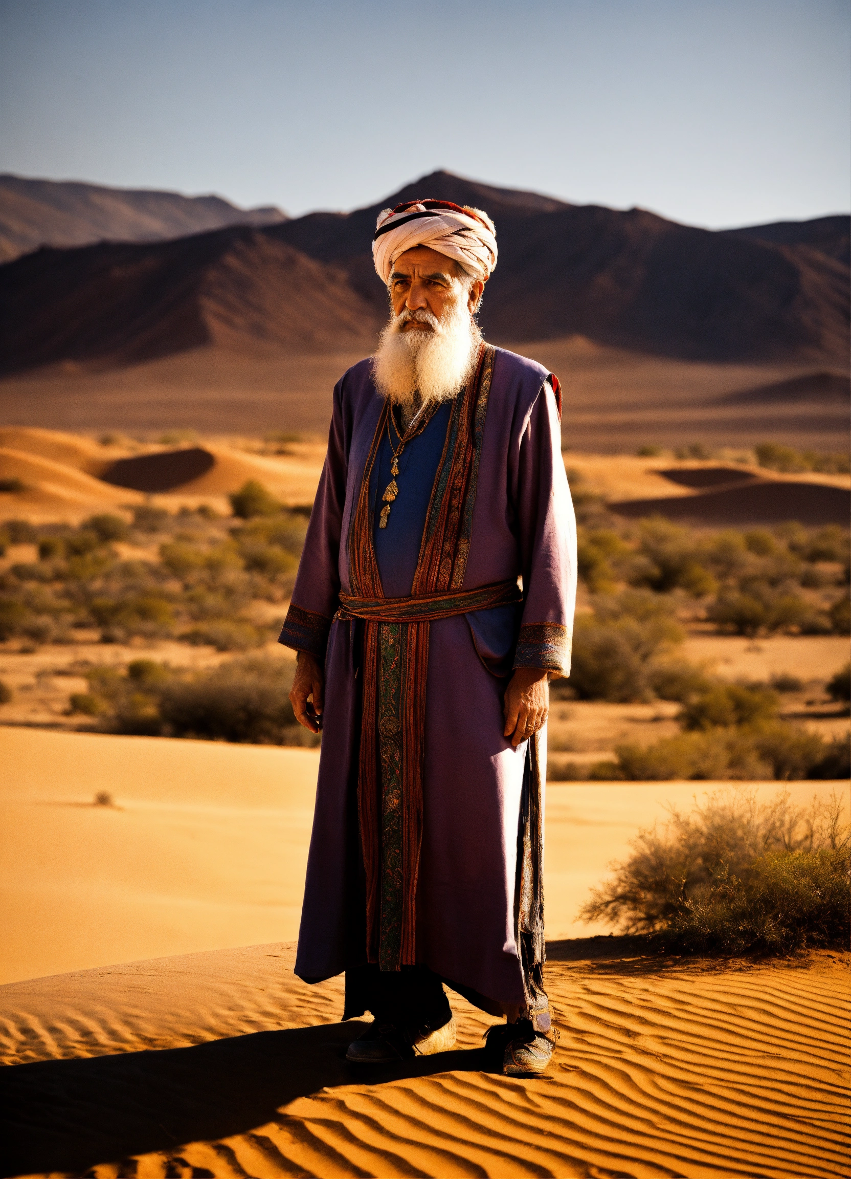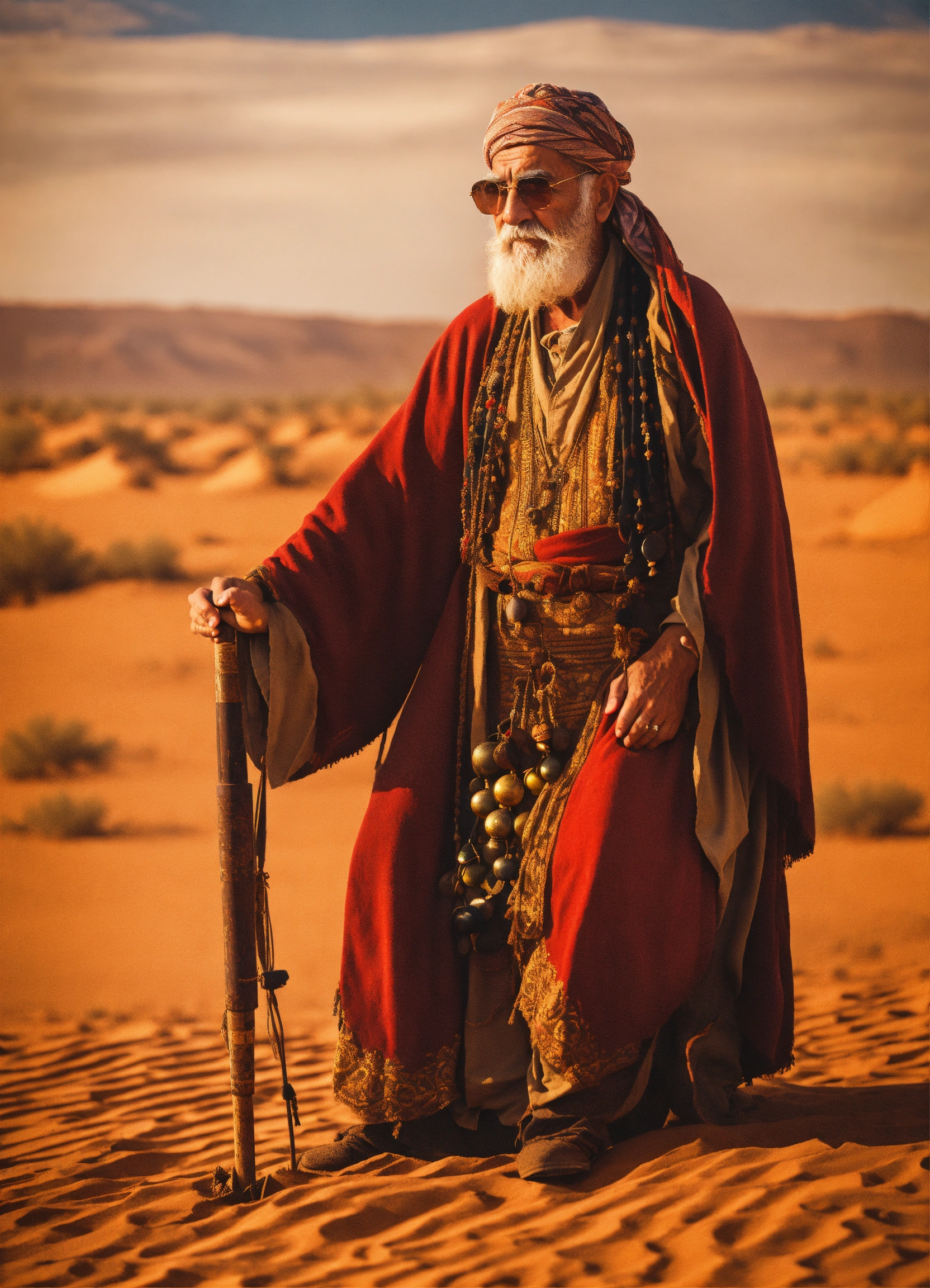 Anciano ermitaño en el desierto, vestido con ropas antiguas, barbudo mirando hacia el oriente con actitud de preocupacion, hiperrealista