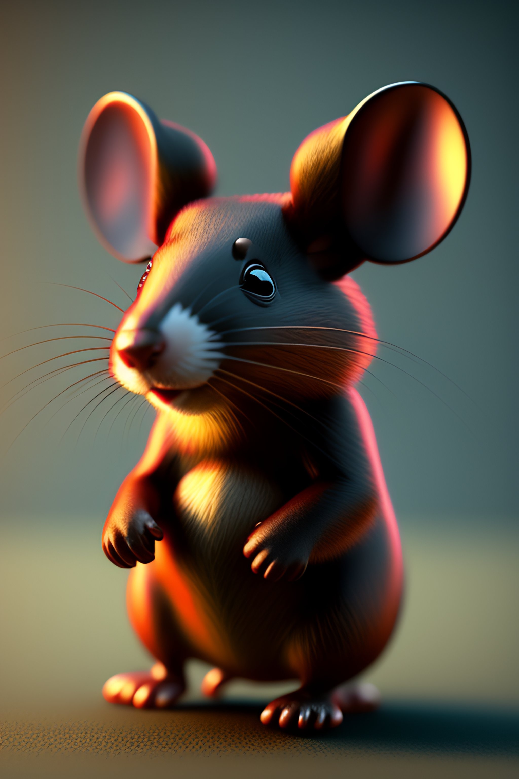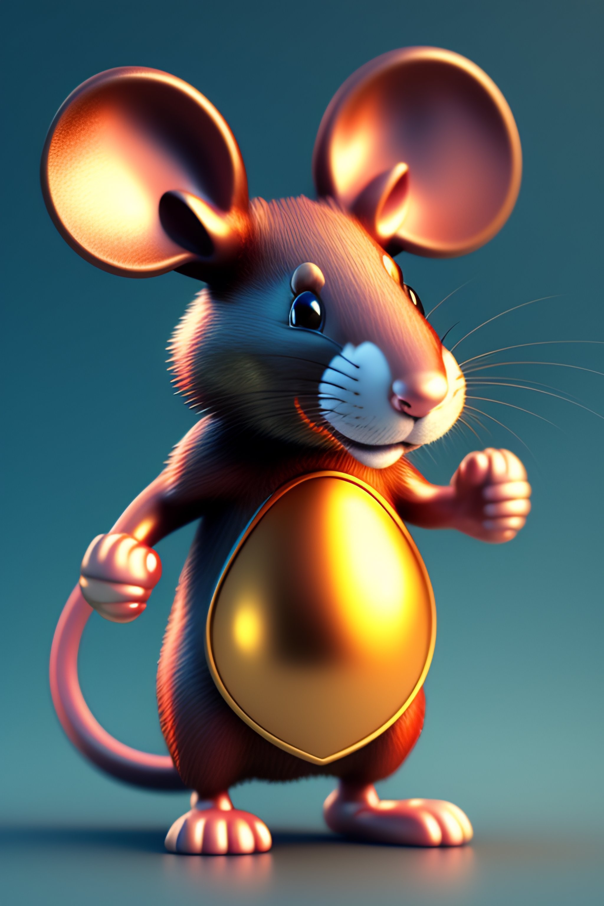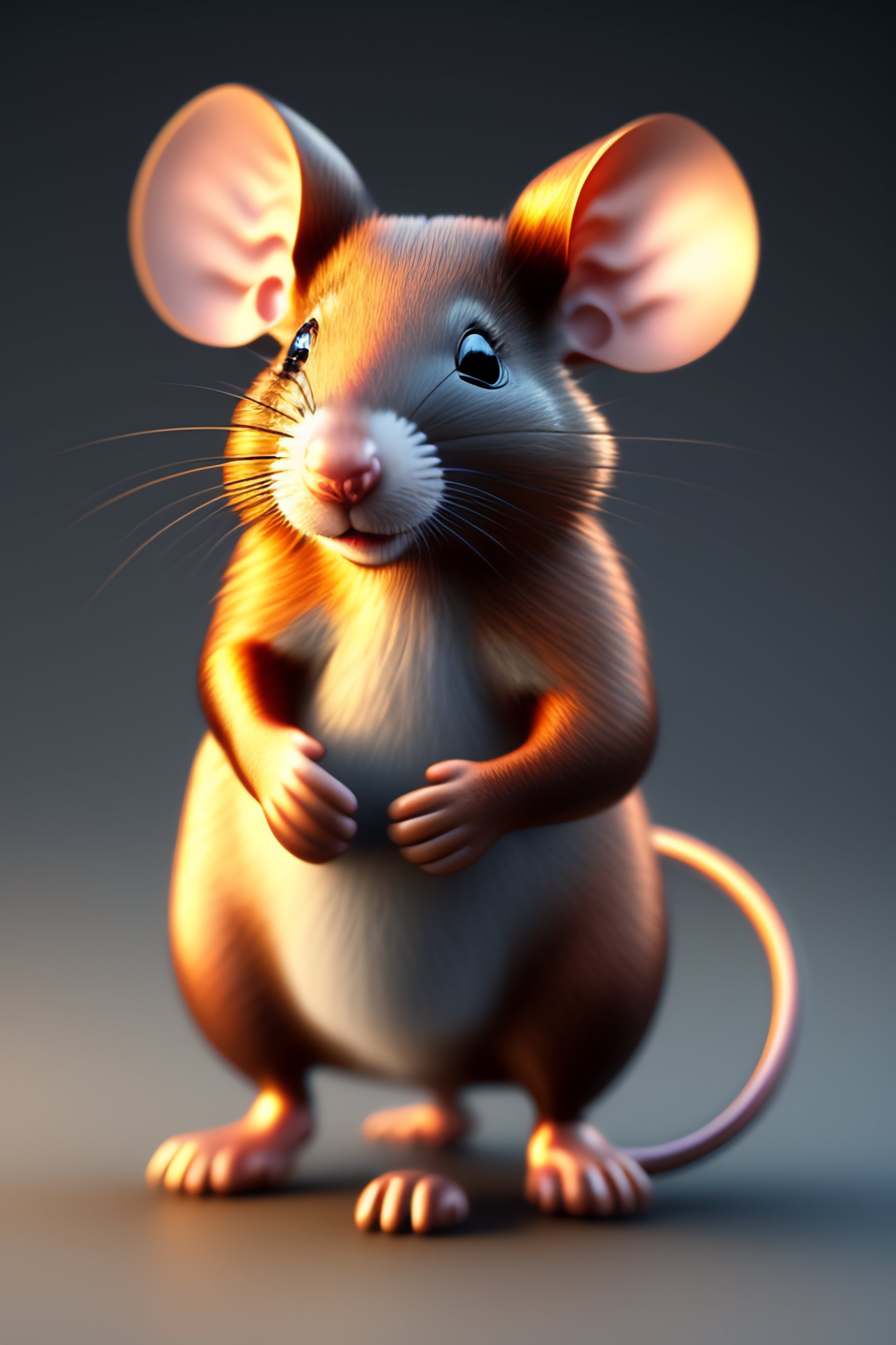 A 3d render standing realistic rat, it has two mickey mouse ears, it has mickey mouse clothes drawn on its skin