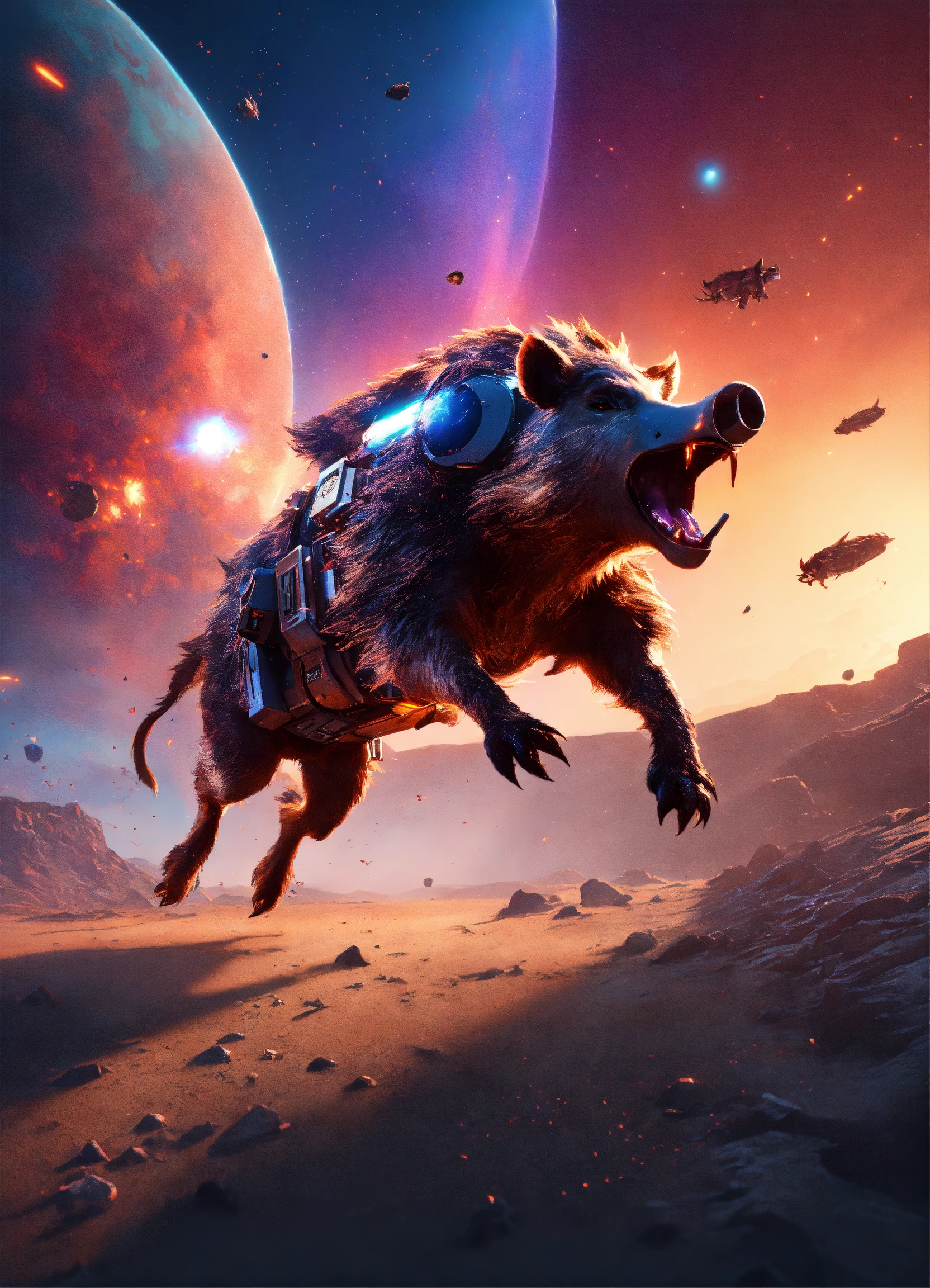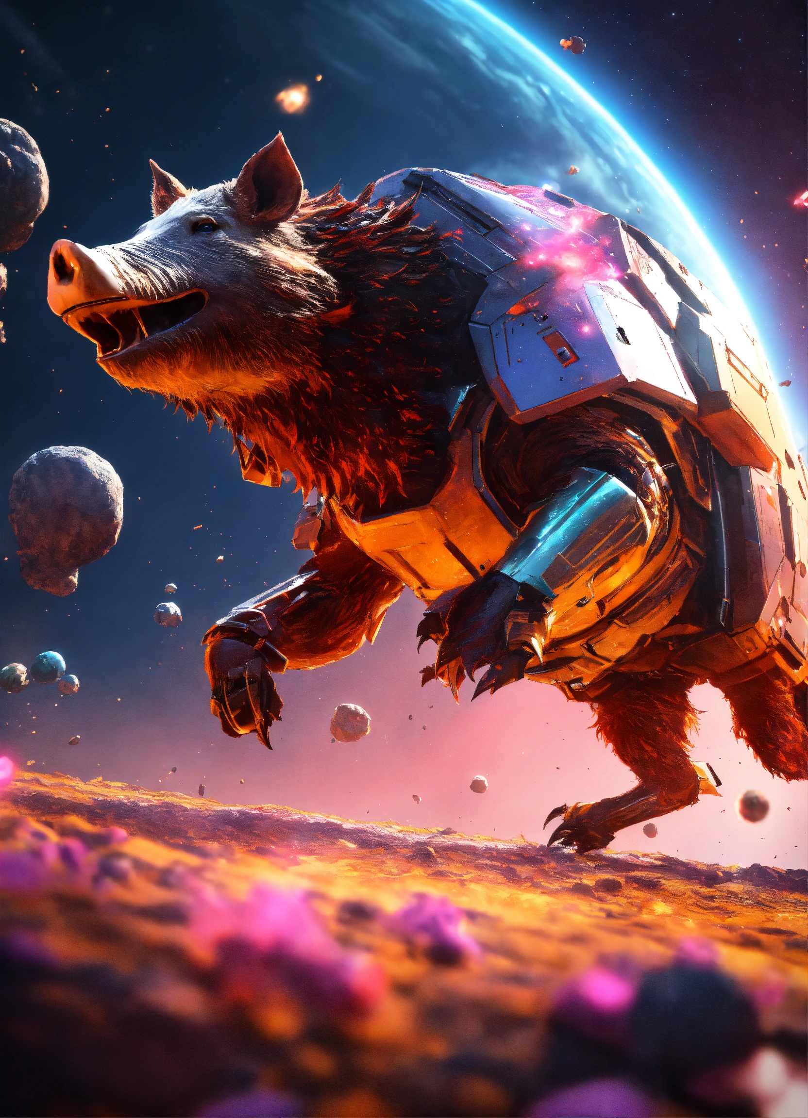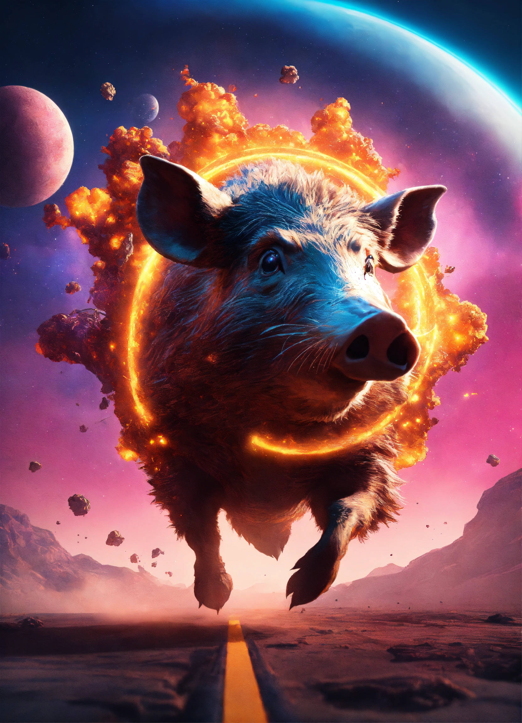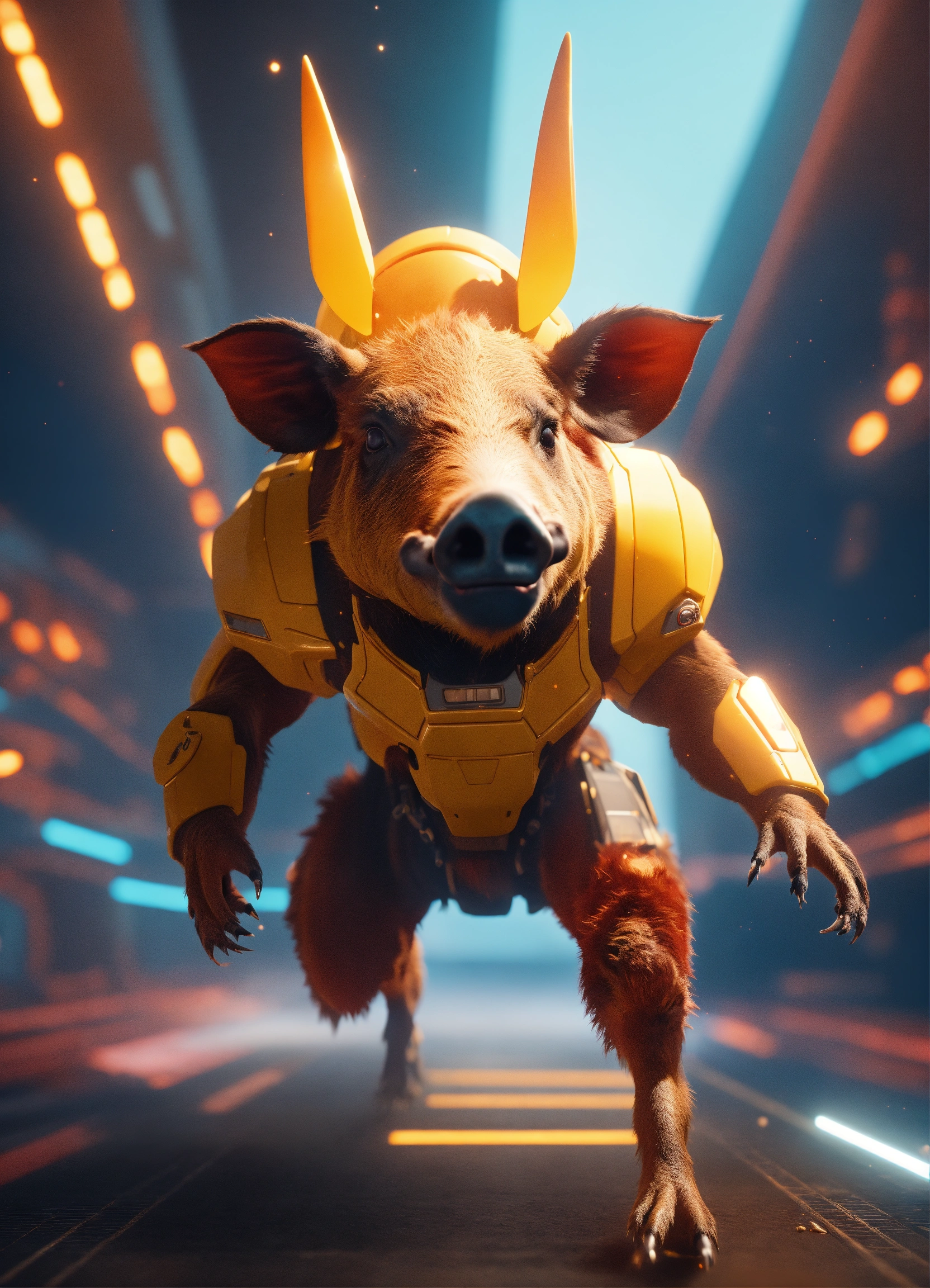 A humoristic sweets body mixed with wild boar head running on a galactic space station, morning sunrise explosions, unreal engine 5, 8k, futuristic minimalism