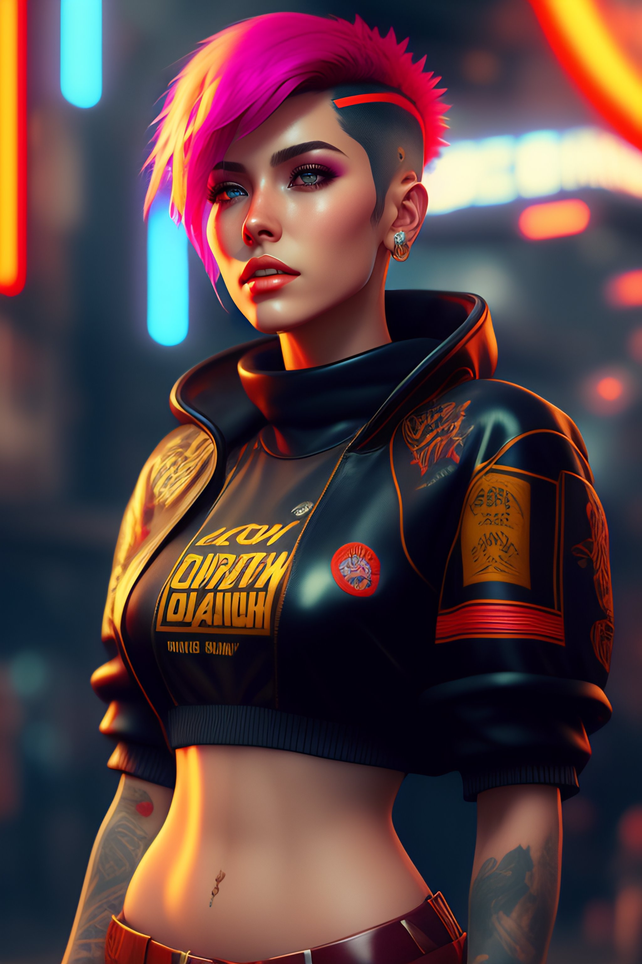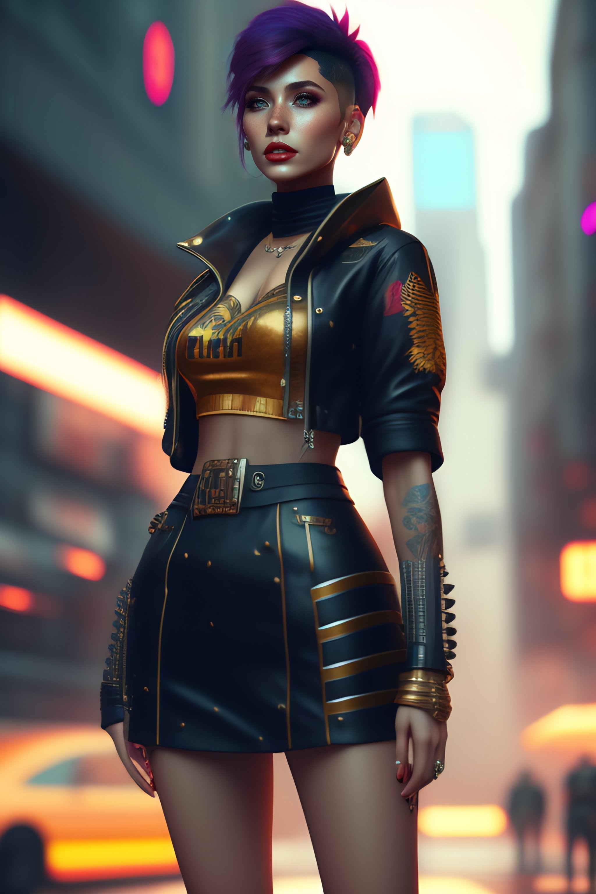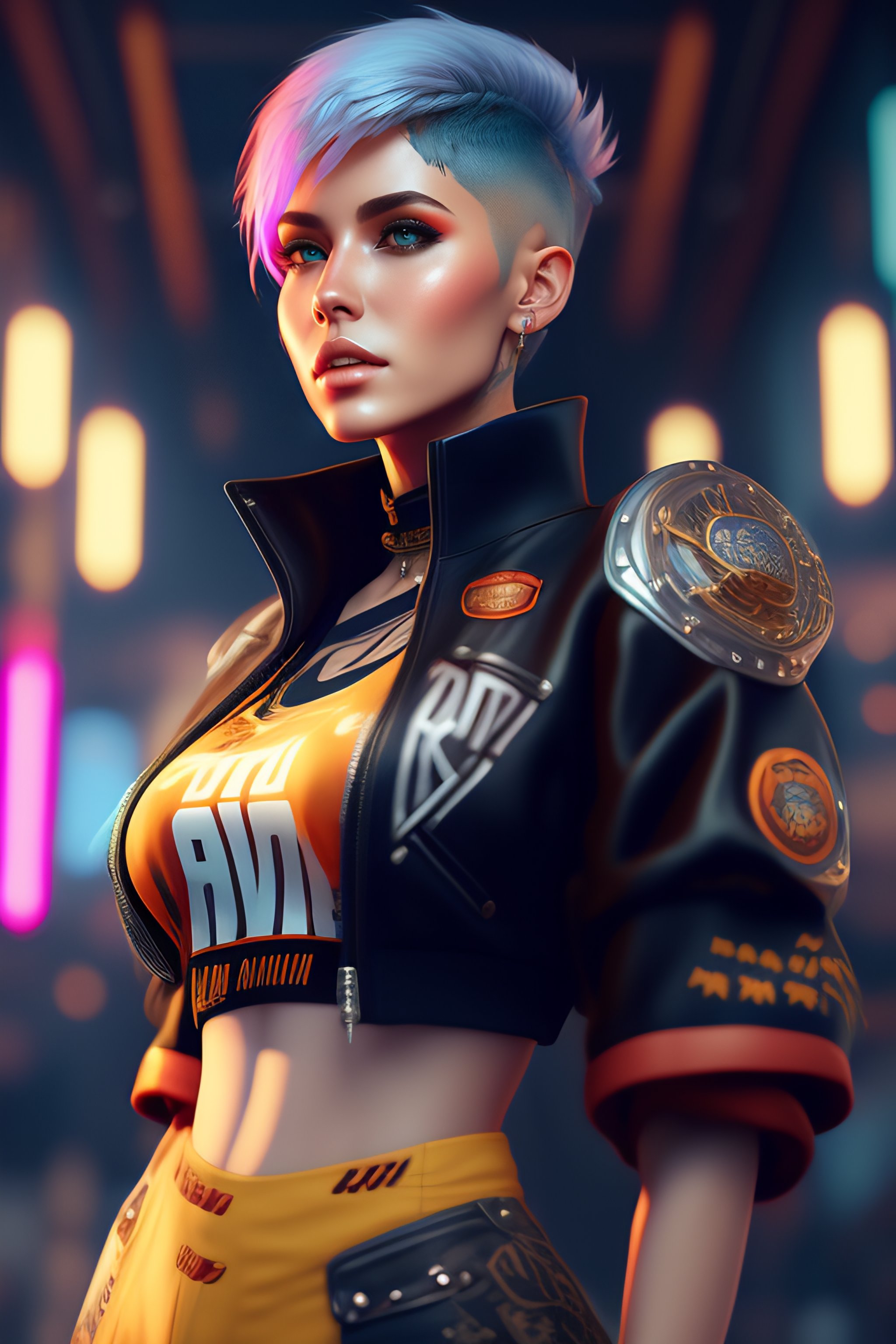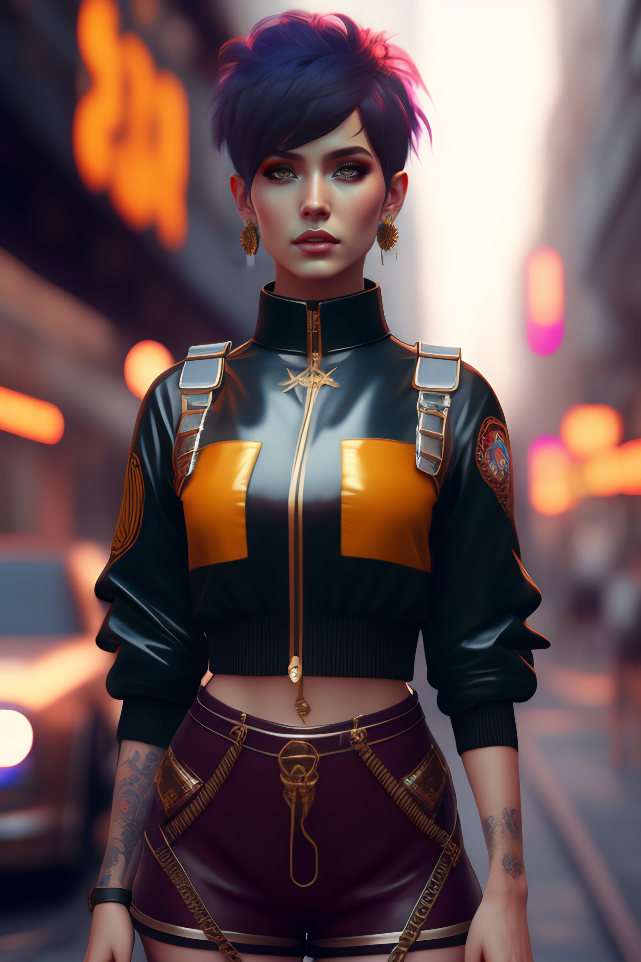Retro punk clothes with short hair girl, battle status, hyper detailed, digital art, cyberpunk style, cybercinematic lighting, studio quality, smooth render, unreal engine 5 rendered, octane rendered, art style by klimt and nixeu and ian sprigger and wlop and krenz cushart