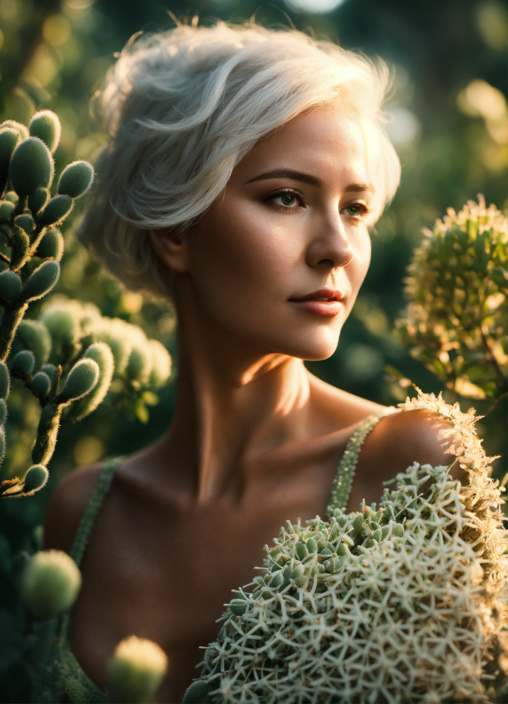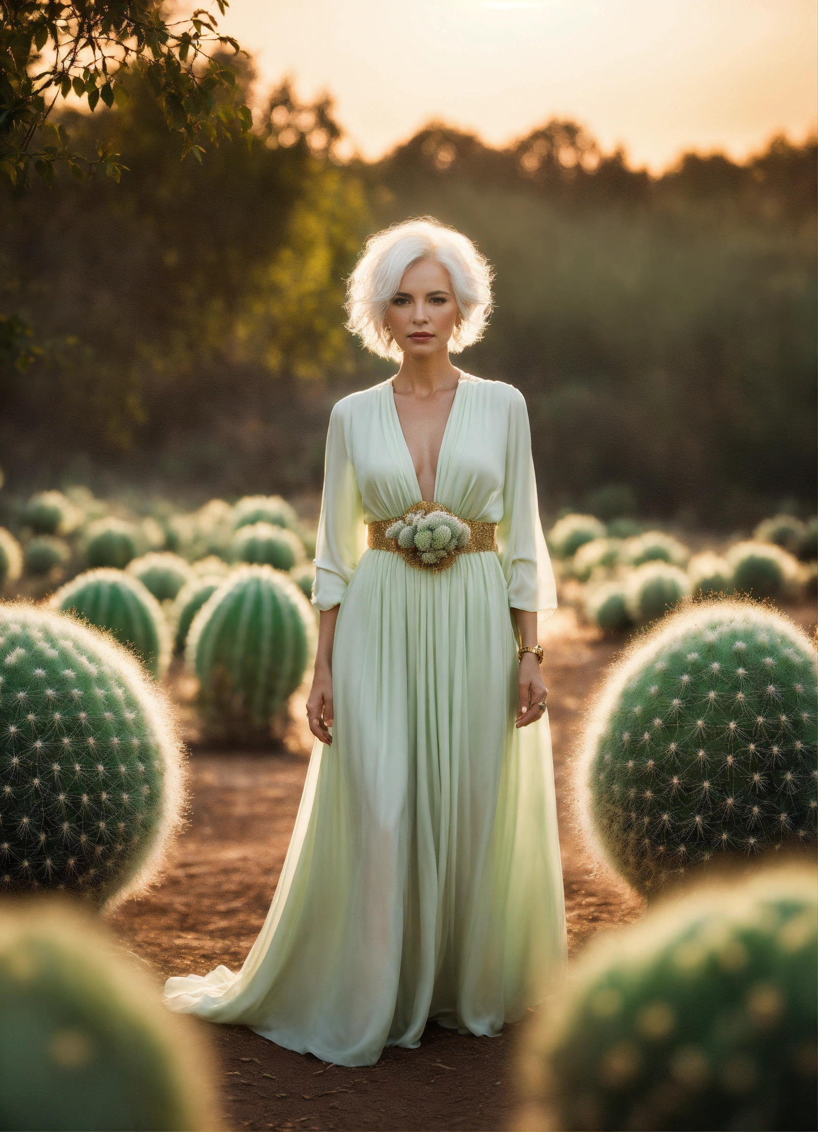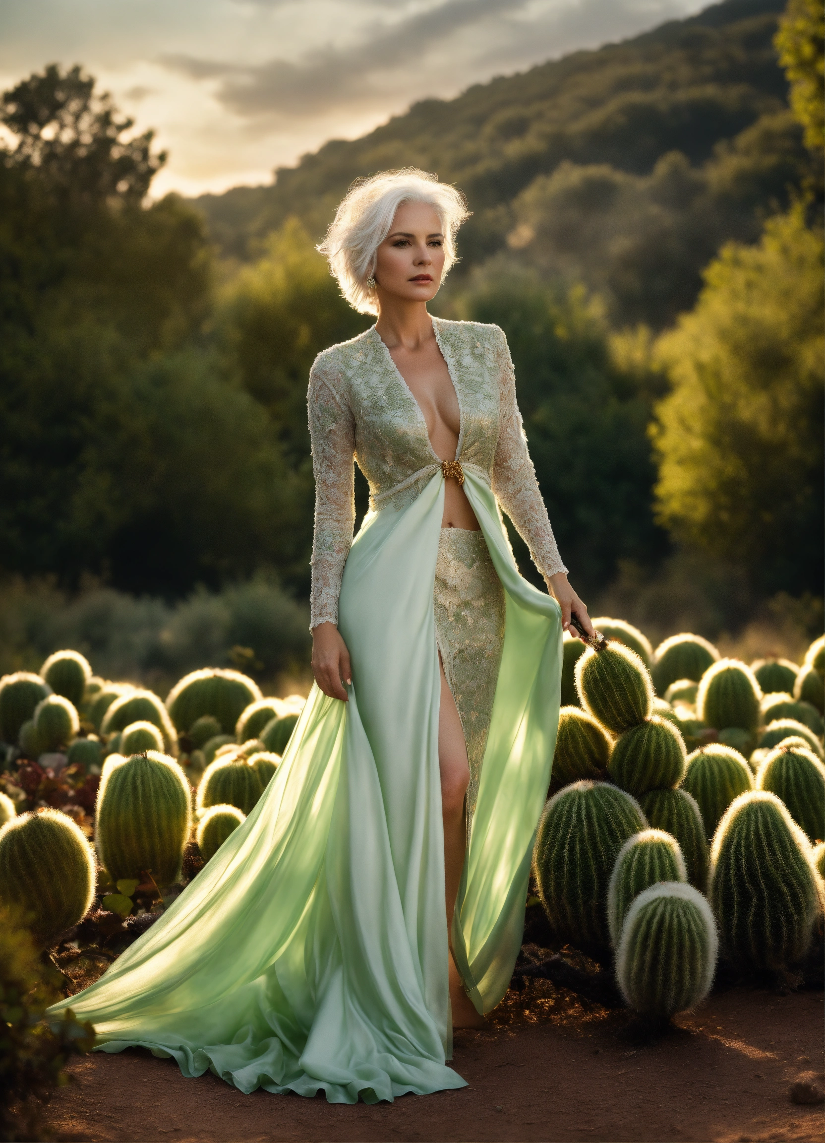 A real perfect full portrait fashion photography, a beautiful anatomy of a female, 52 year old, white hair like a wise woman in the shape of green white silk in the middle of a forrest, mammillaria, mammillary anatomy, front attractive, masterpiece elegant, third golden ratio photography, dramatic light pale sunrise cinematic lighting ultra detailed sharp focus, hearthstone, dramatic night light, pale sunrise, cinematic lighting, 8k, 16k uhd. a big hatt with roses and leaves