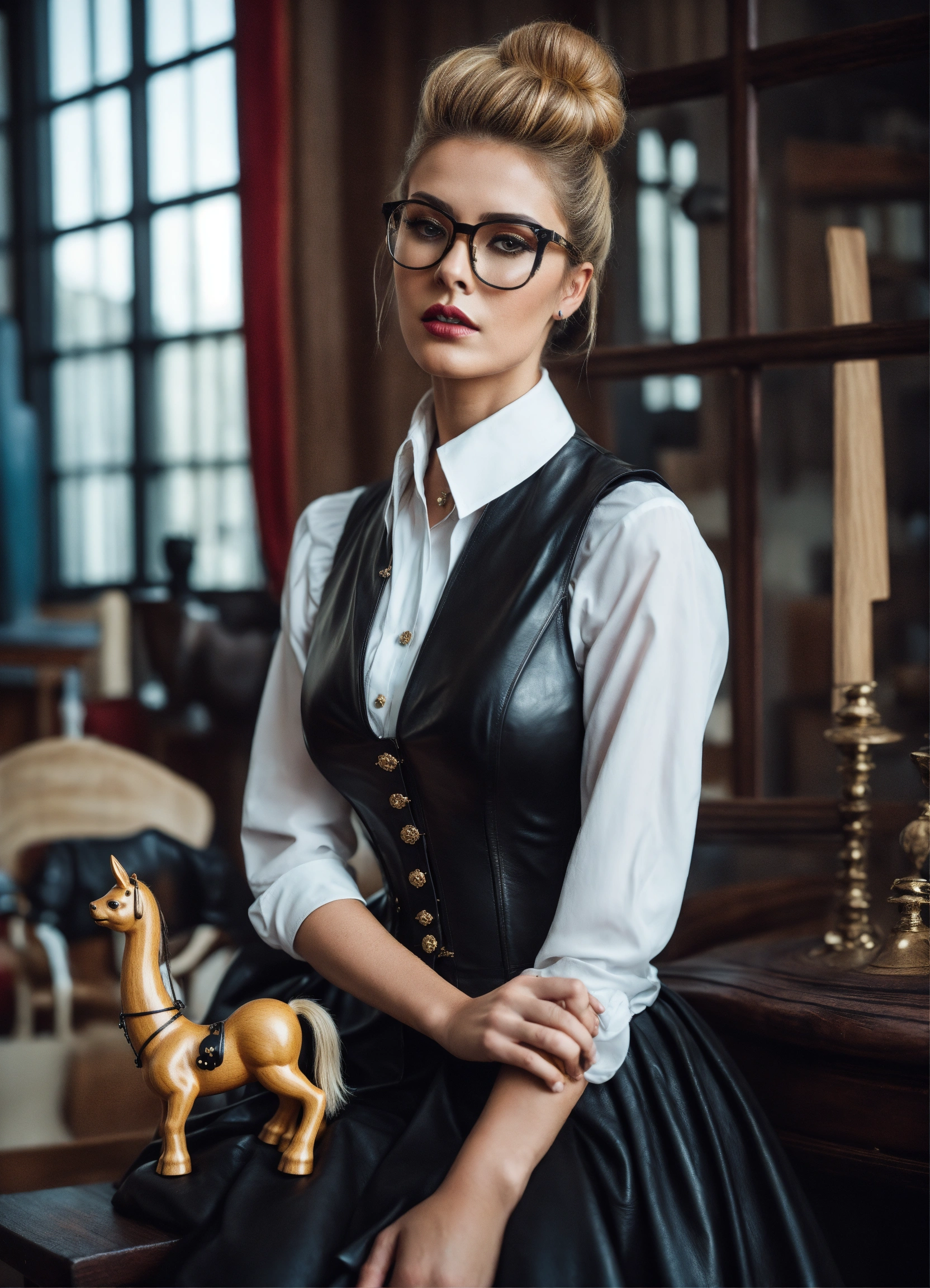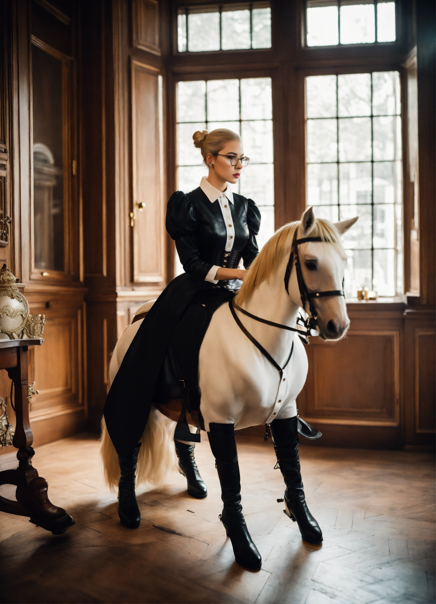 Stunning strict arrogant looking french seductress woman fashion model riding a wooden rocking horse, blonde hair bun, glasses, strict governess black leather corset dress vest and big buttons, black leather skirt, white office shirt with big closed shirt collar and long puff sleeves, eyeliner makeup, leather boots, mansion room
