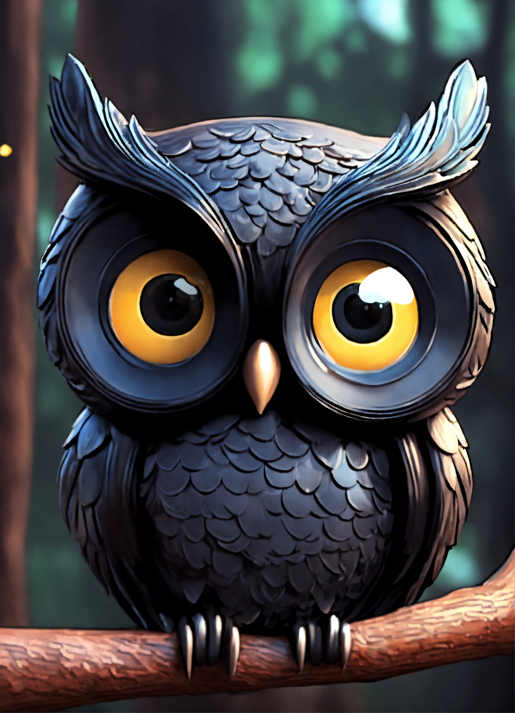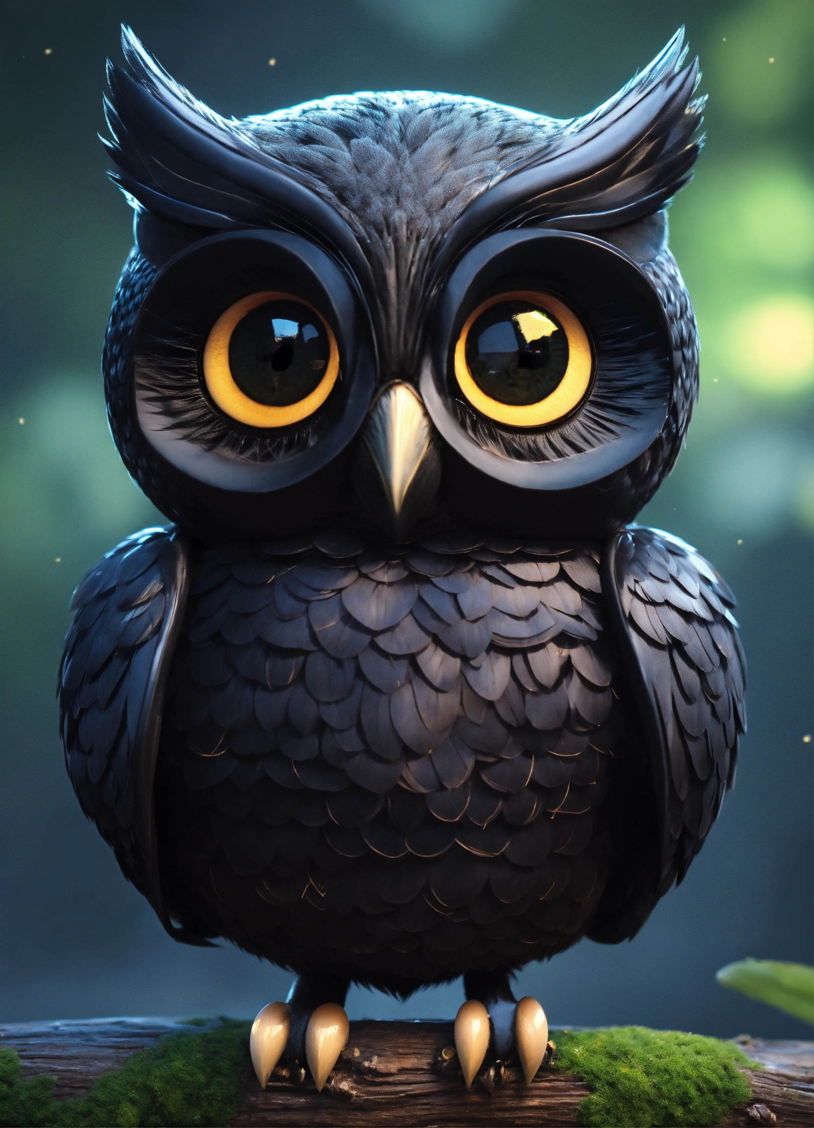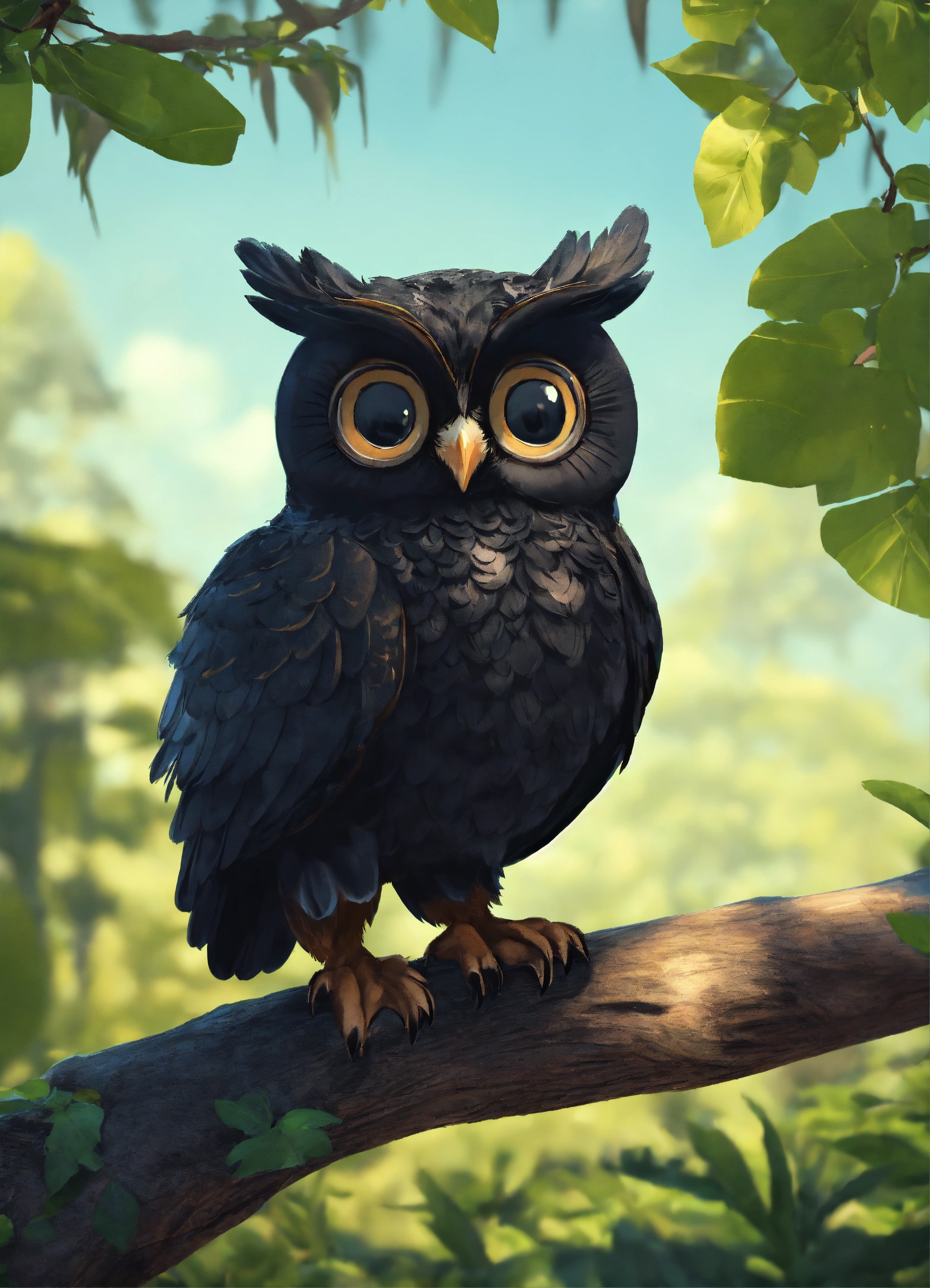 A cute all black owl with big eyes