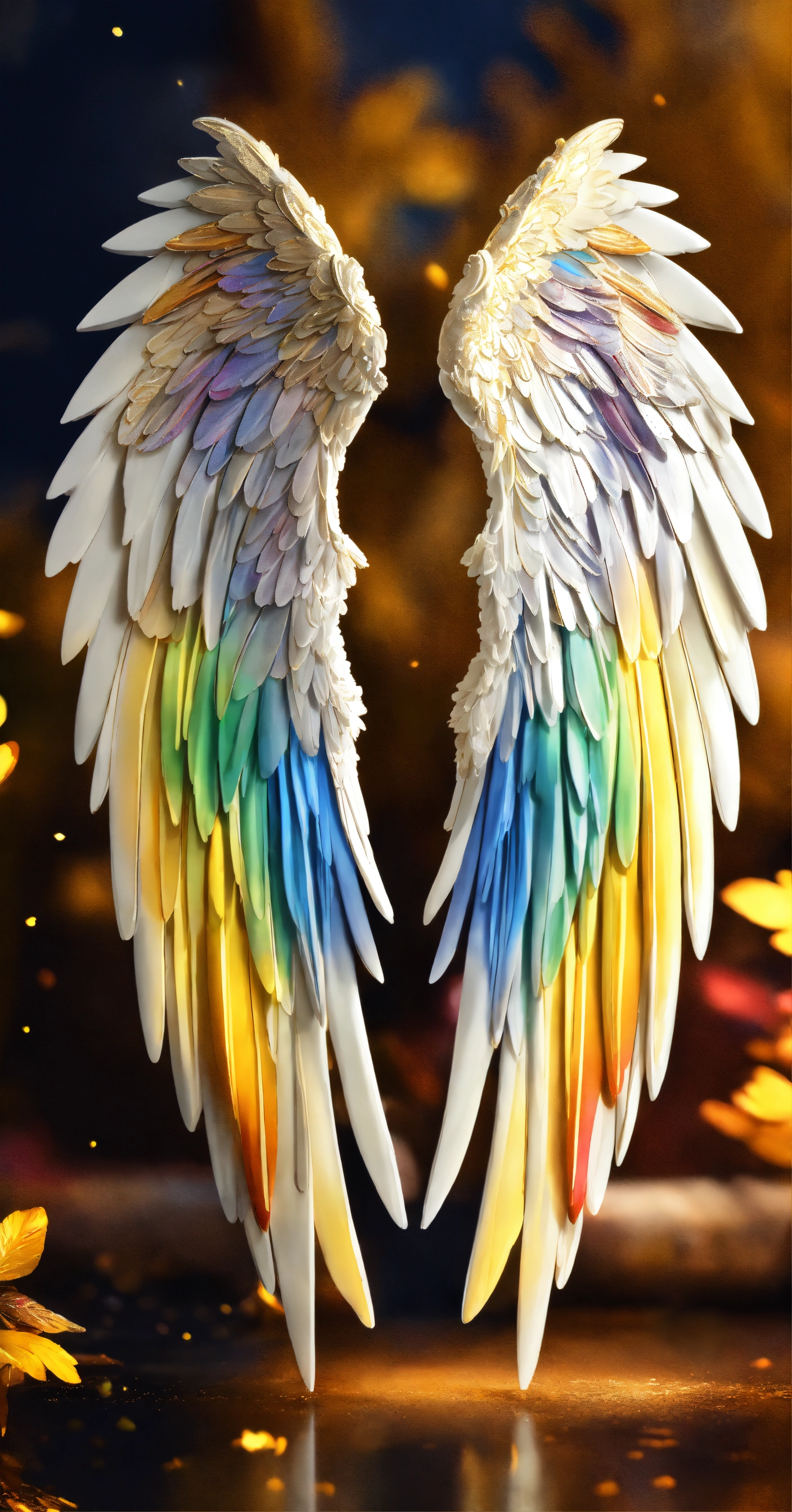 Beautiful and perfect small angel wings in white, detailed and defined and at the same time rainbow details. just a pair of full little white wings and some rainbow details. hyper-detailed and hyper-realistic wings. wings with a slight decoration in shades of yellow and gold and golden details. small wings complete both the right wing and the left wing, the background is dark blue, 3d, masterpiece. hd. realism. high resolution. high quality. digital art. 8k