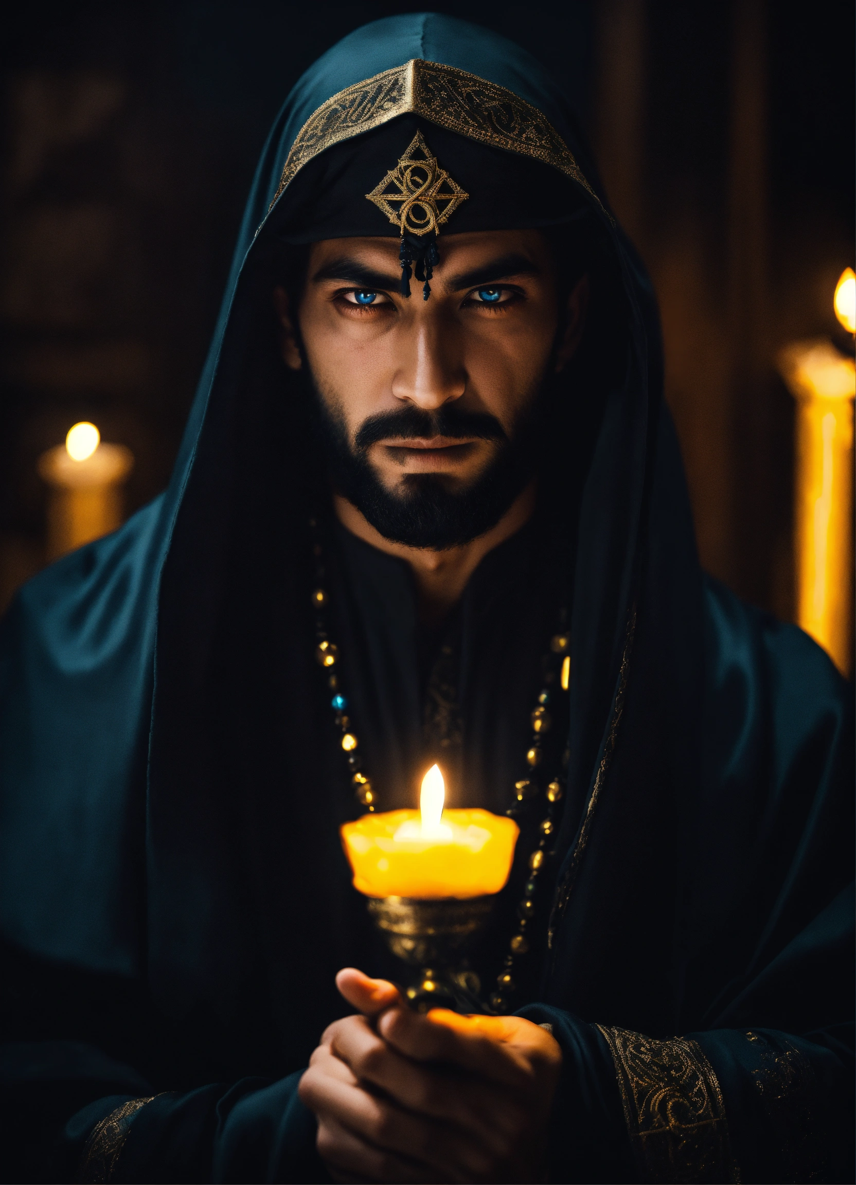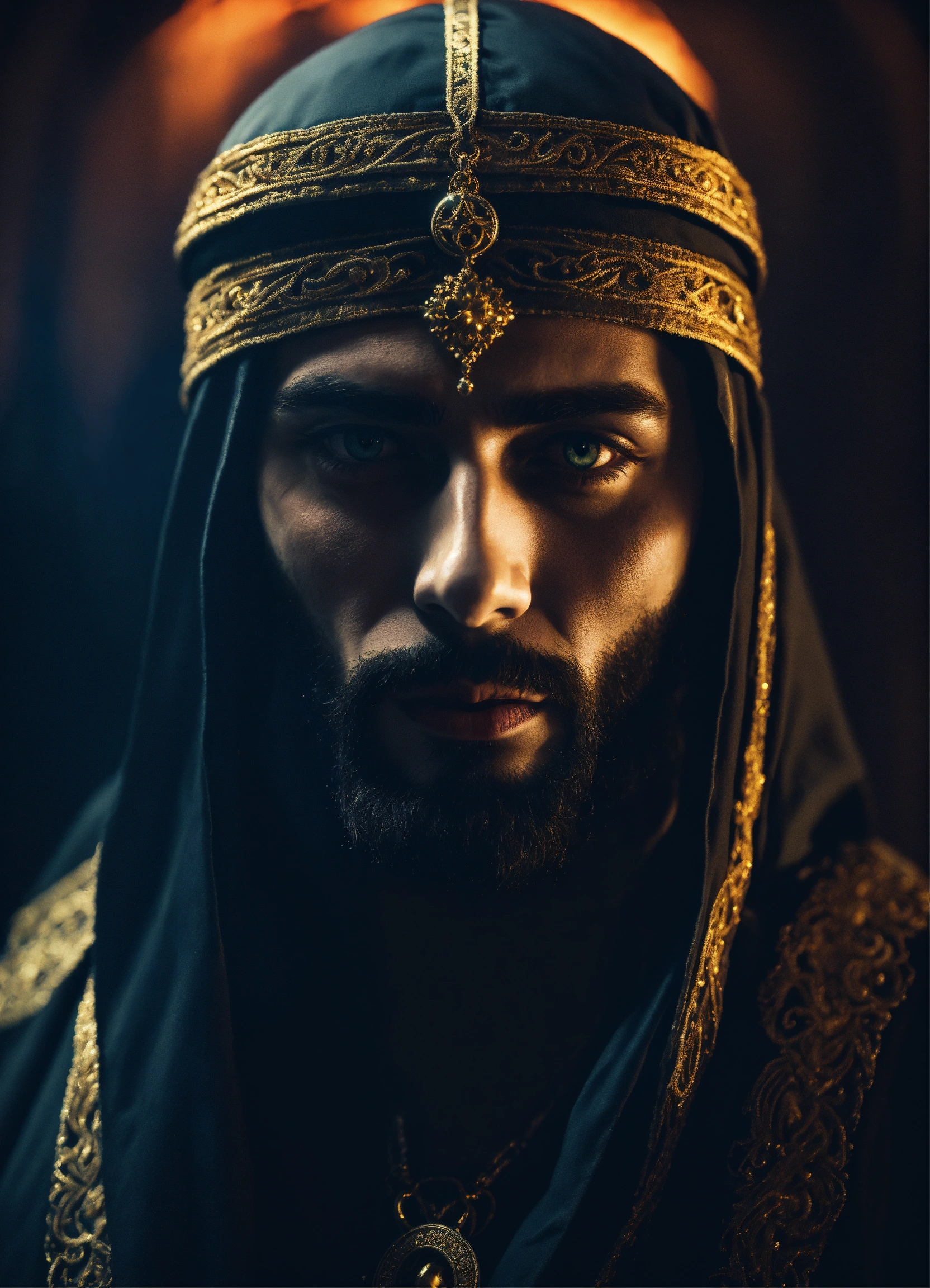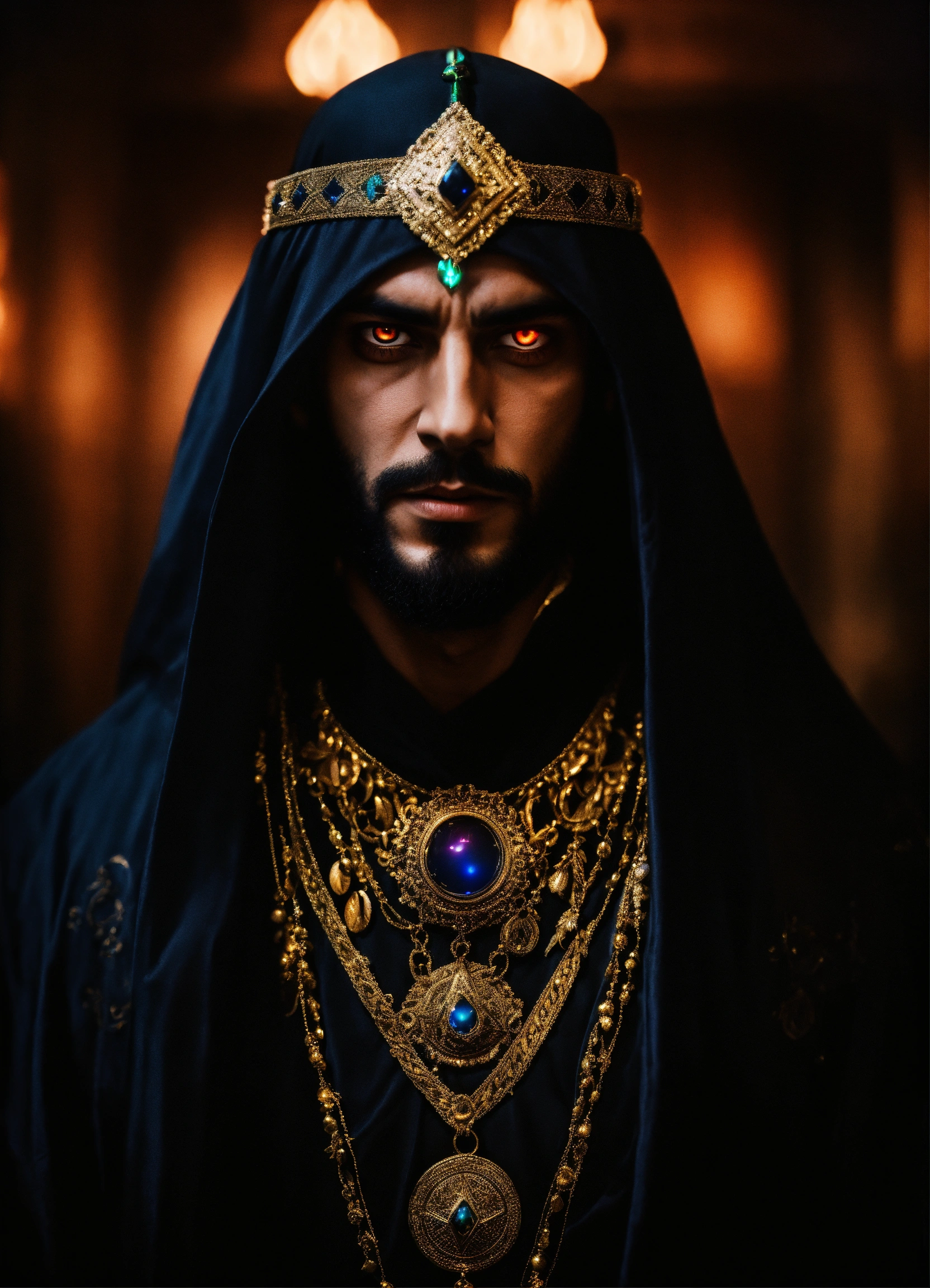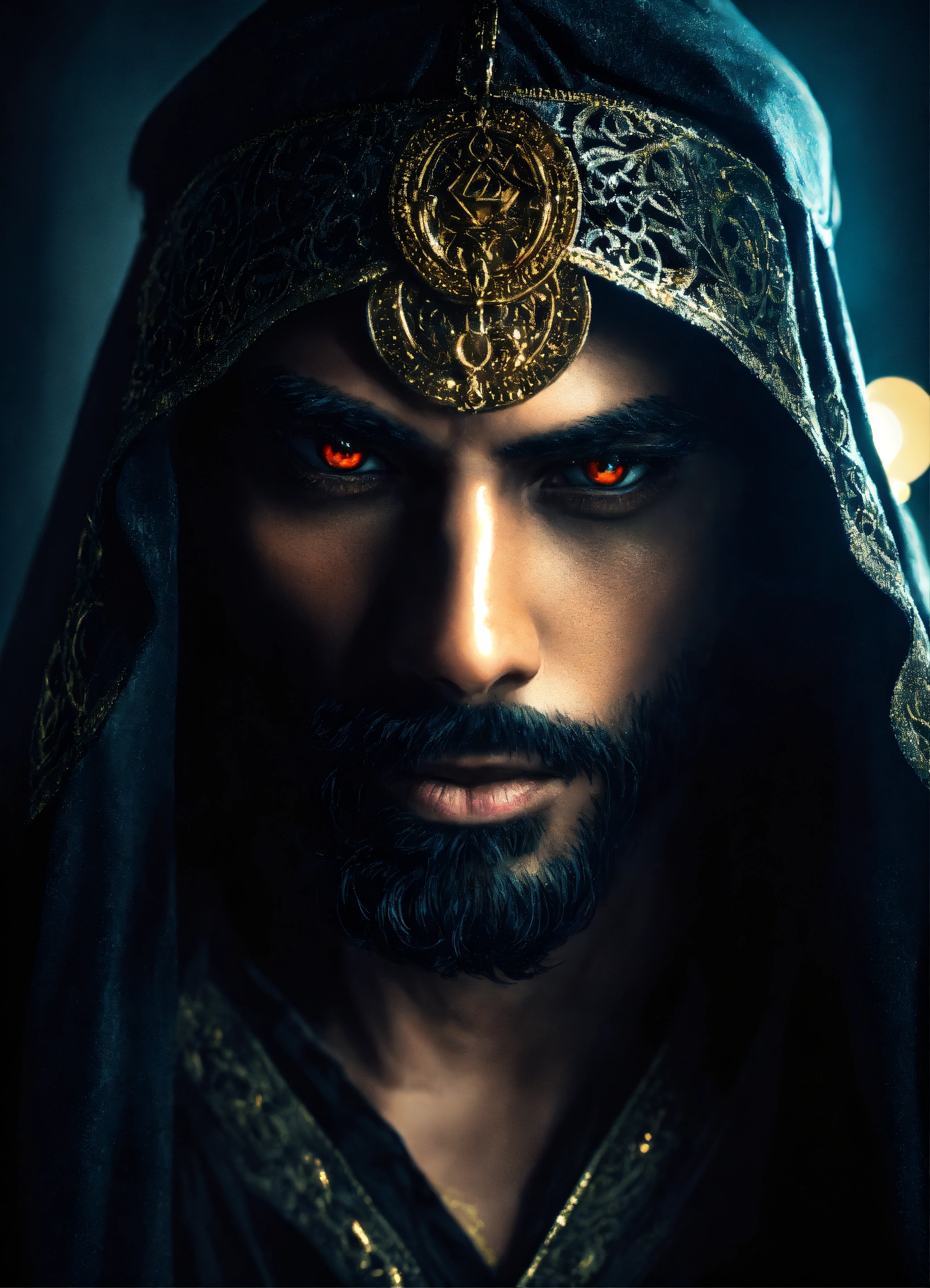 Dark, mysterious and dramatic headshot of a handsome arabic evil sorcerer with mesmerizing glowing eyes, occult powers, sinister aura, dark ceremonial robes