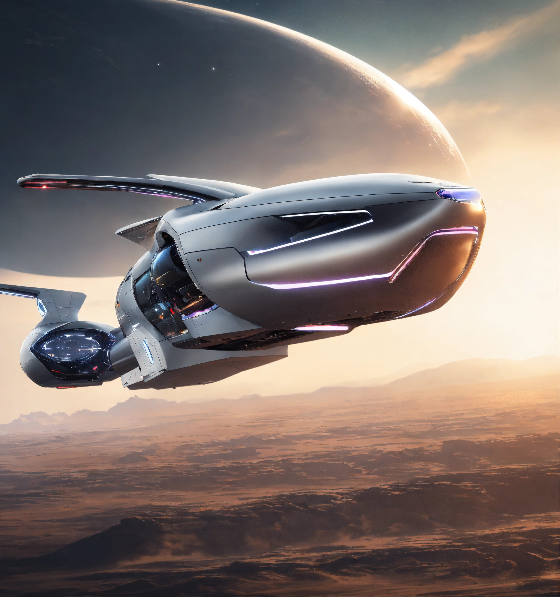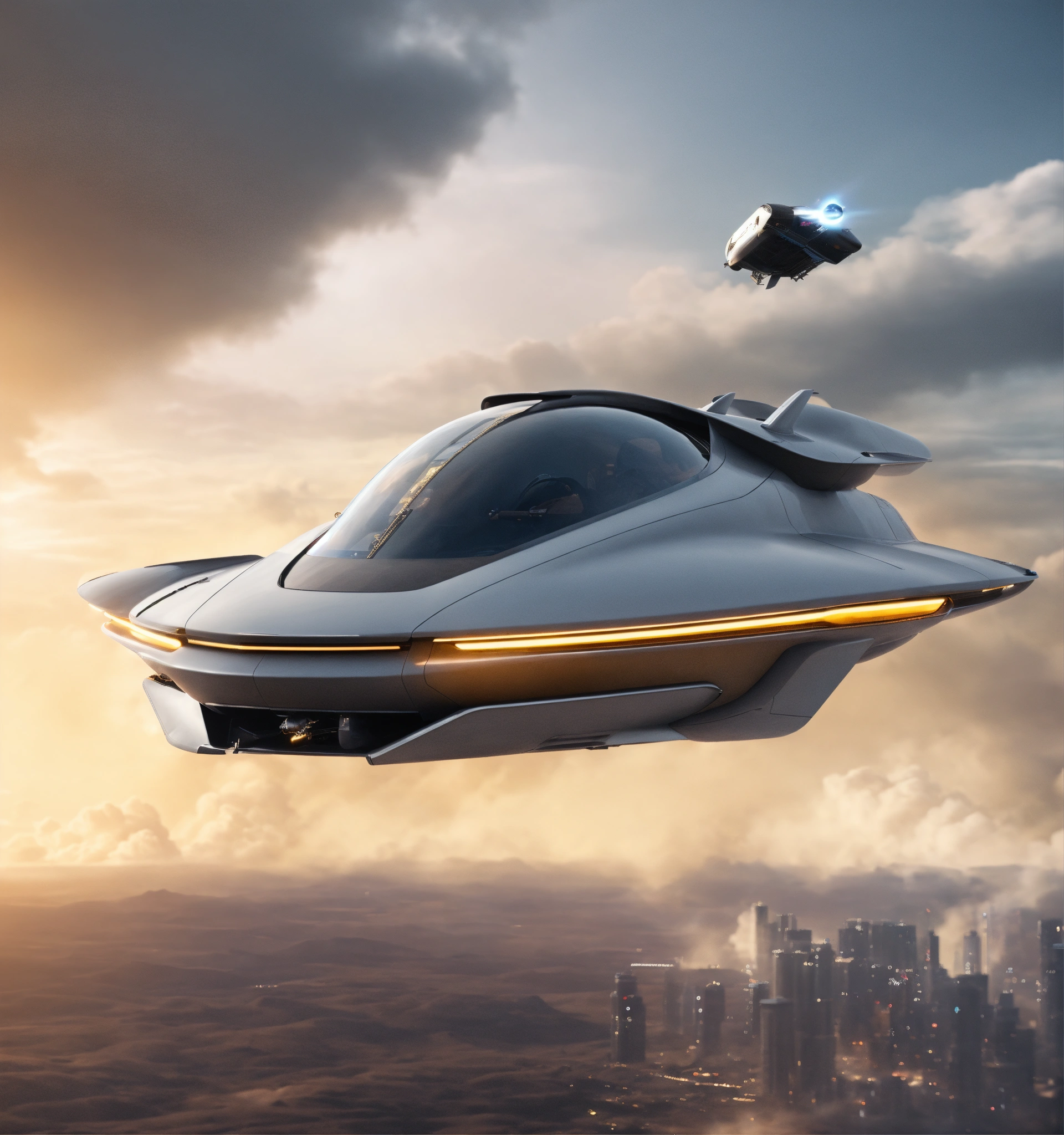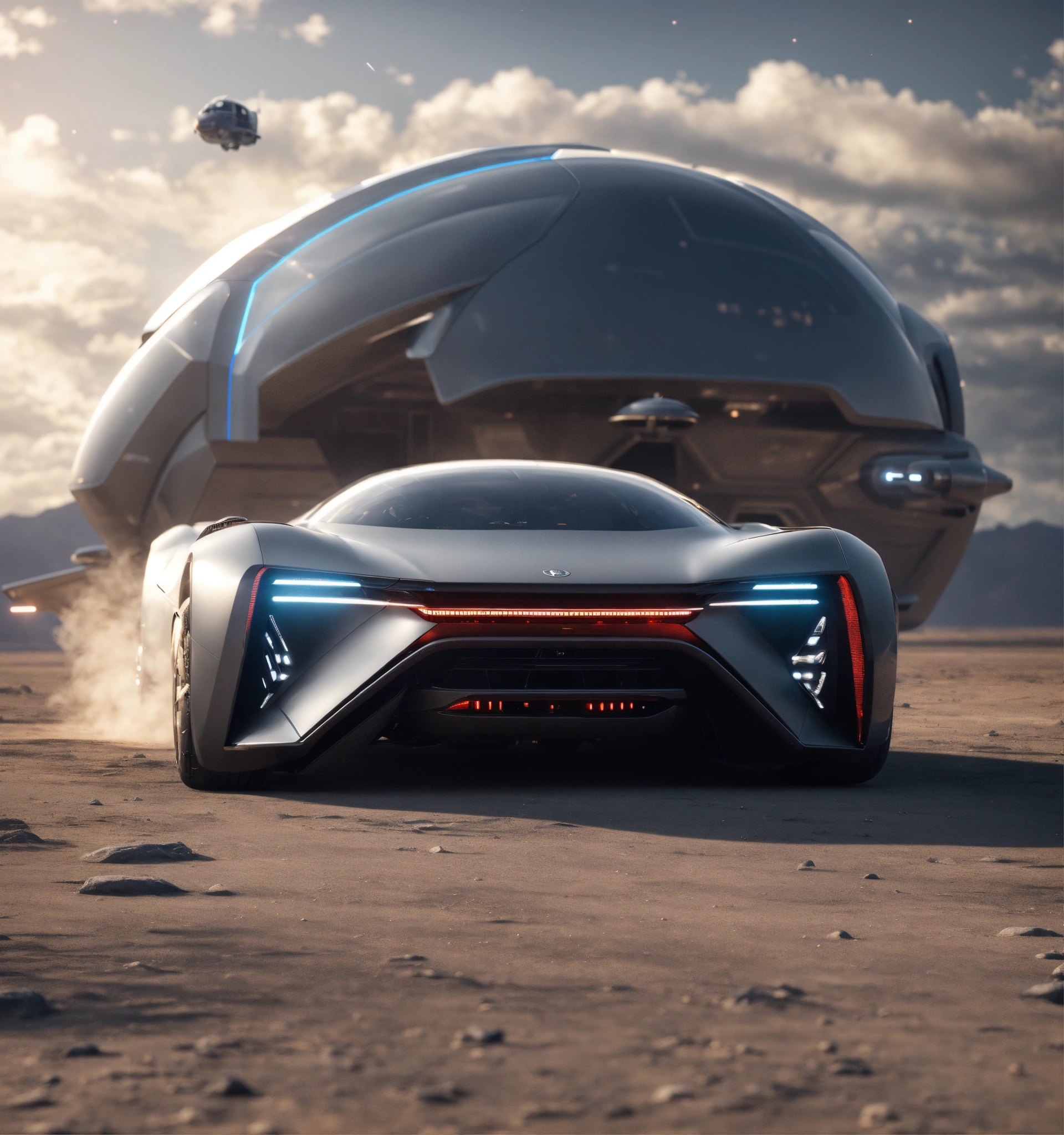Luxurious sleek gray flying space car shooting out in the sky, future, hi tech, exterior, sci fi, unreal engine, realistic.