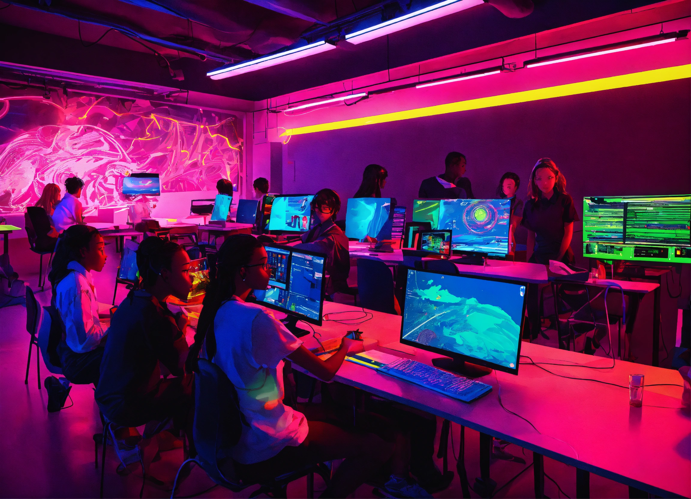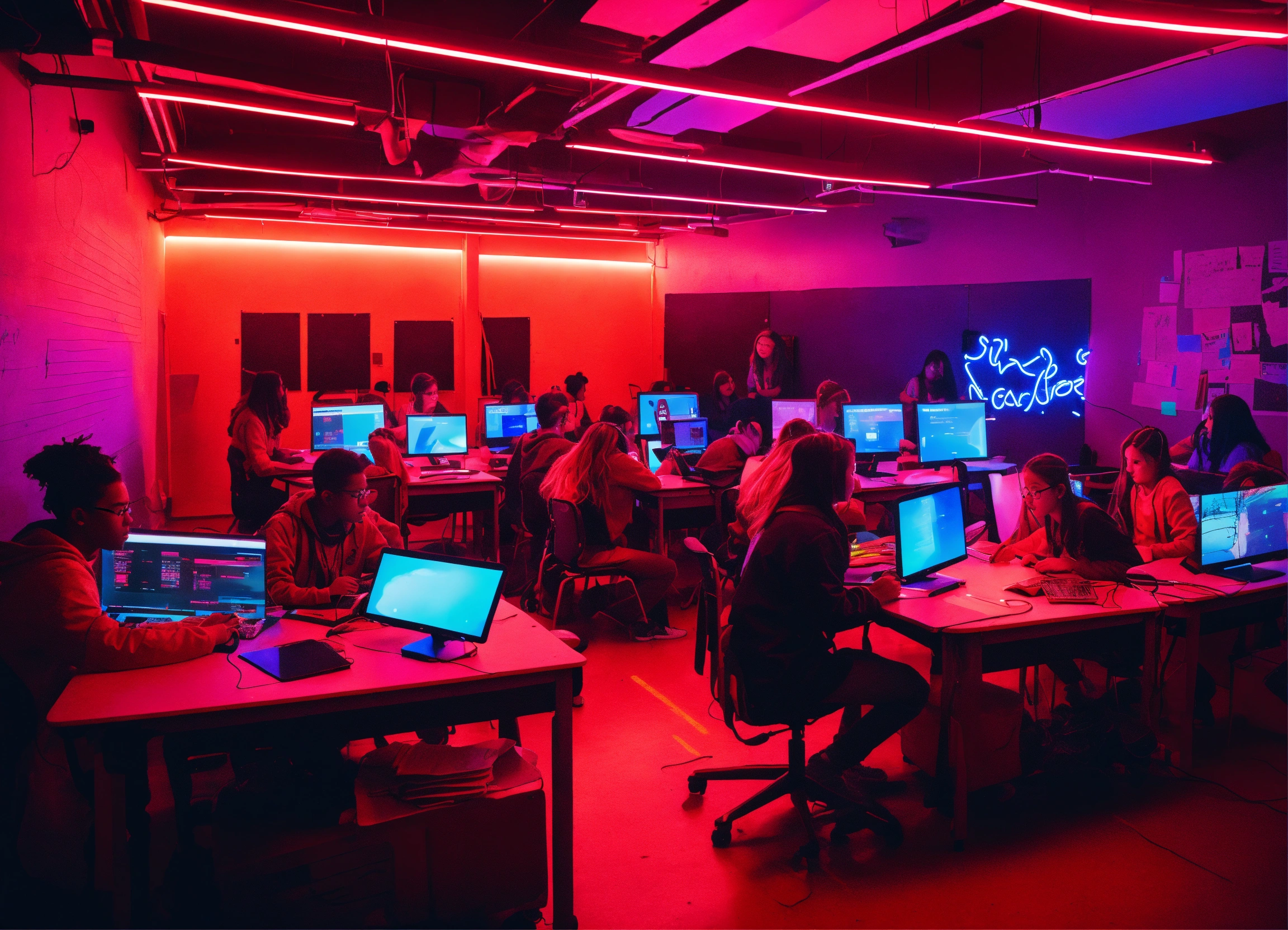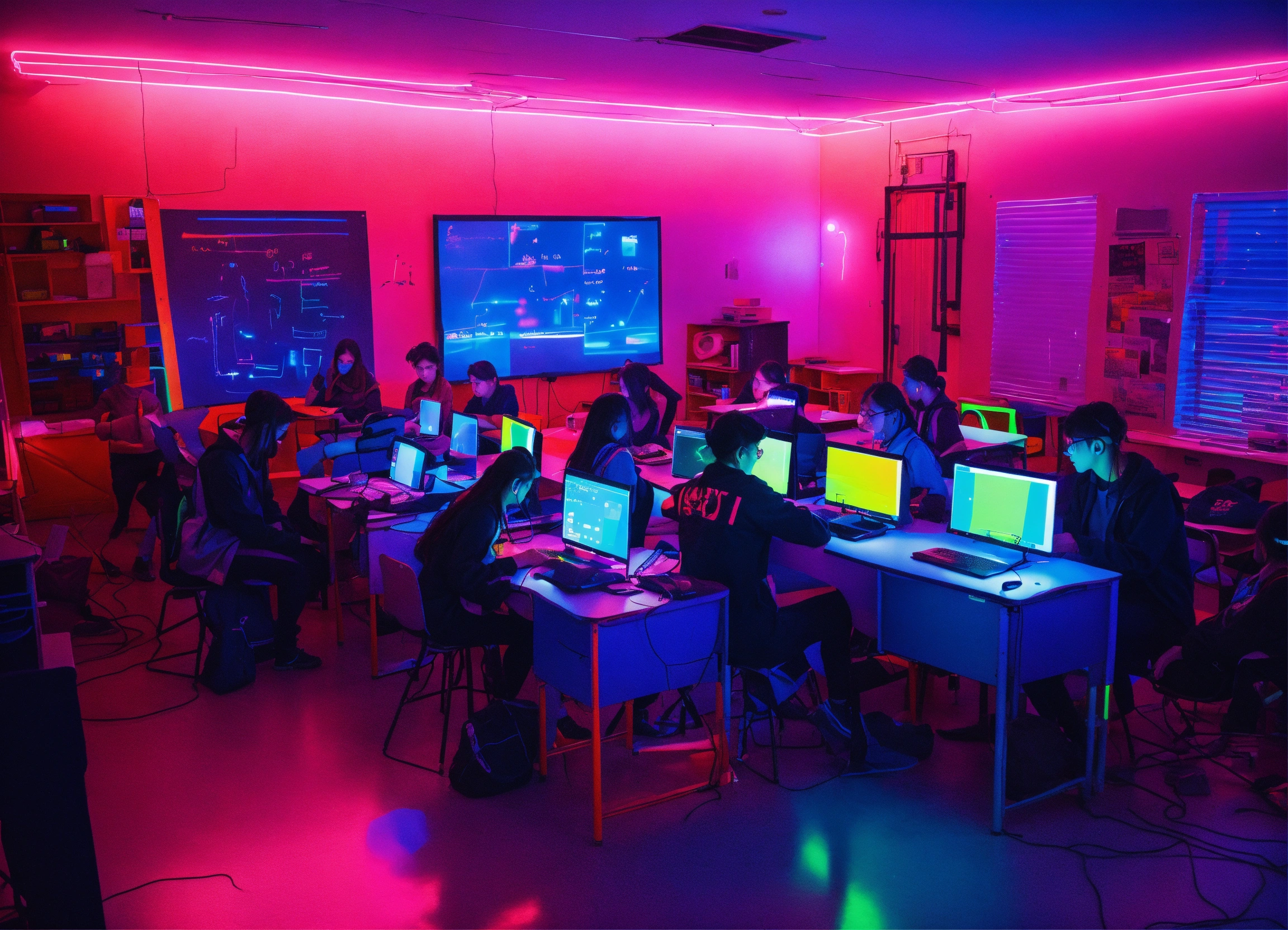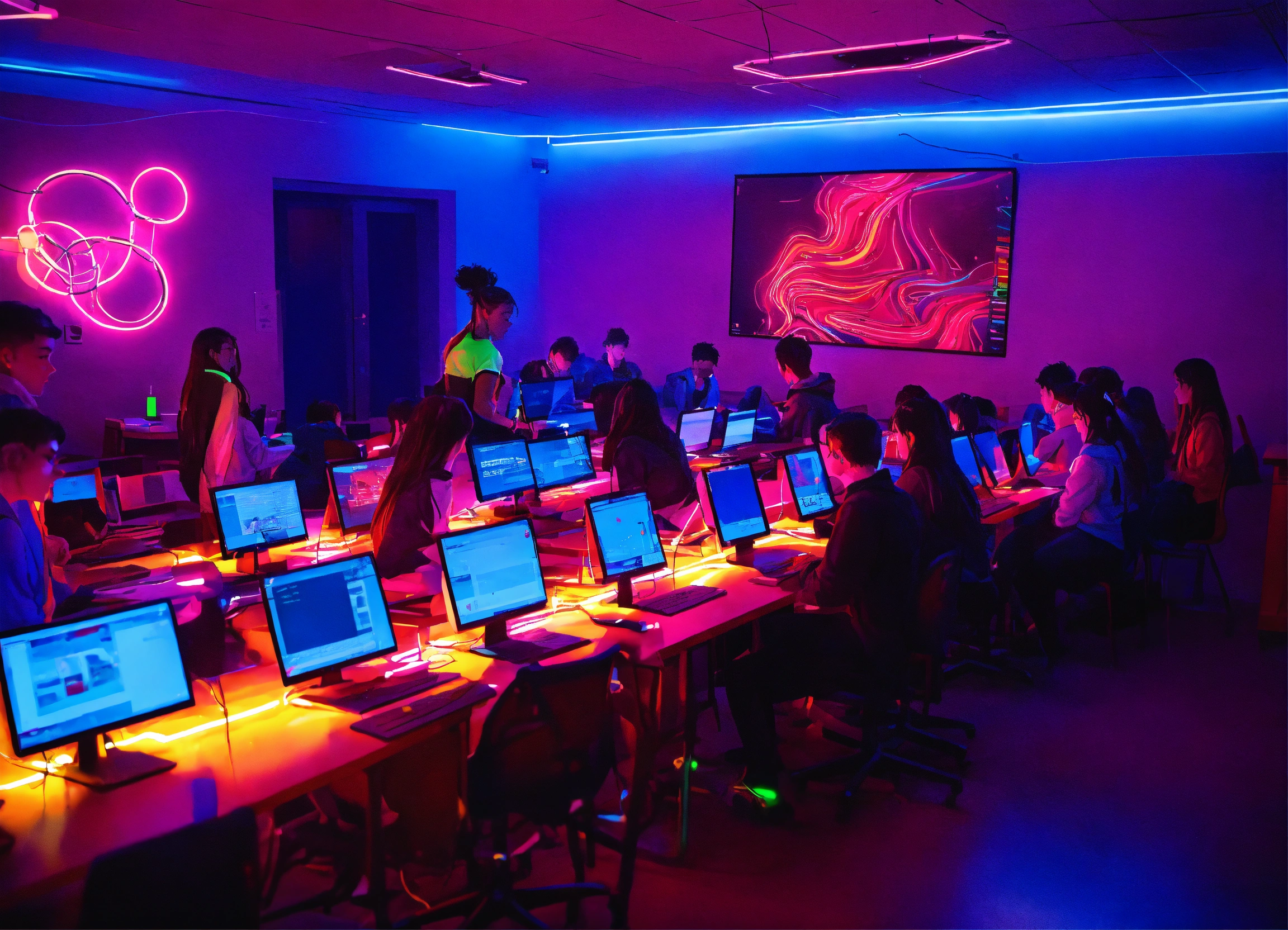 A group of 10 students in a classroom, all with computers, in an environment with neon colors and vibes and neon lights