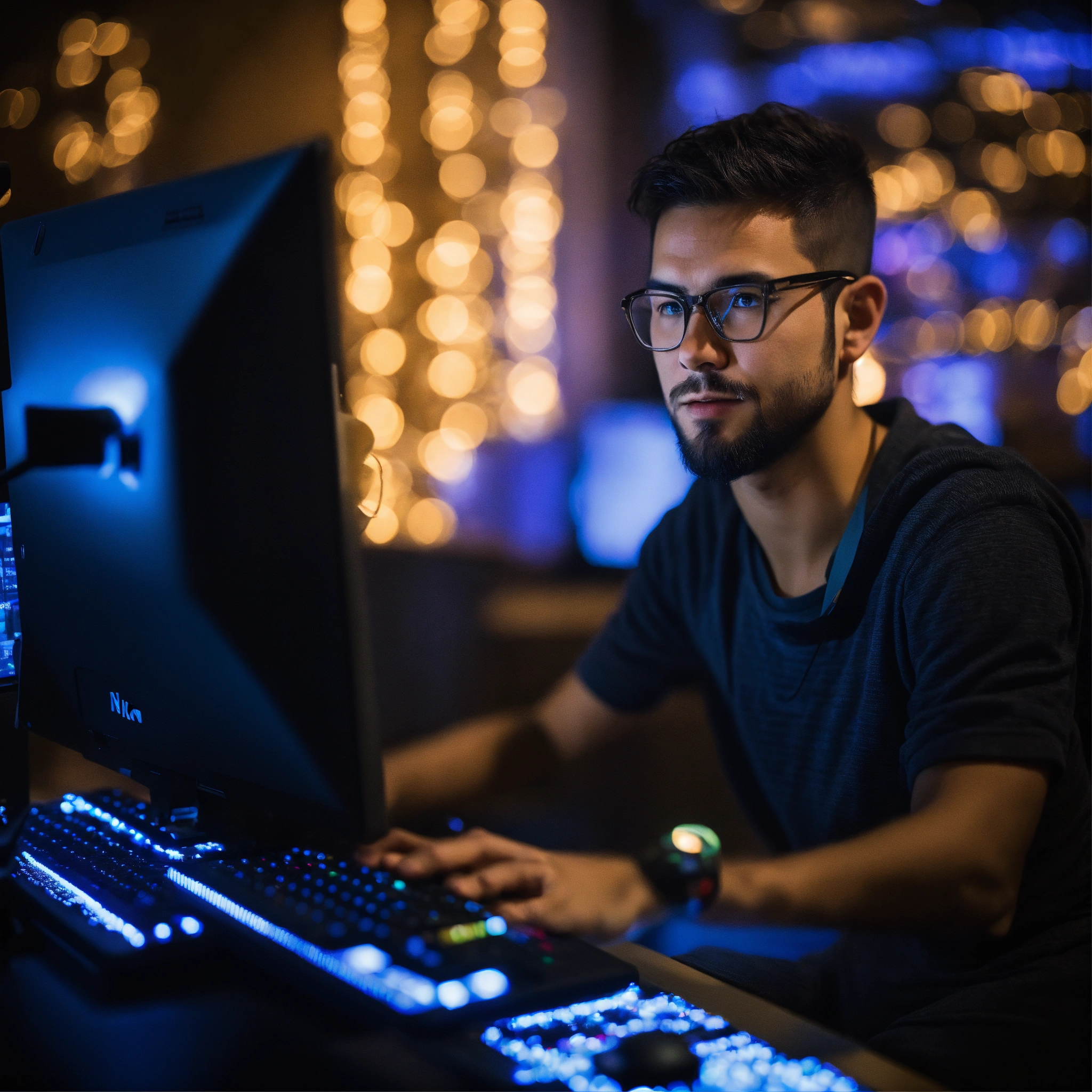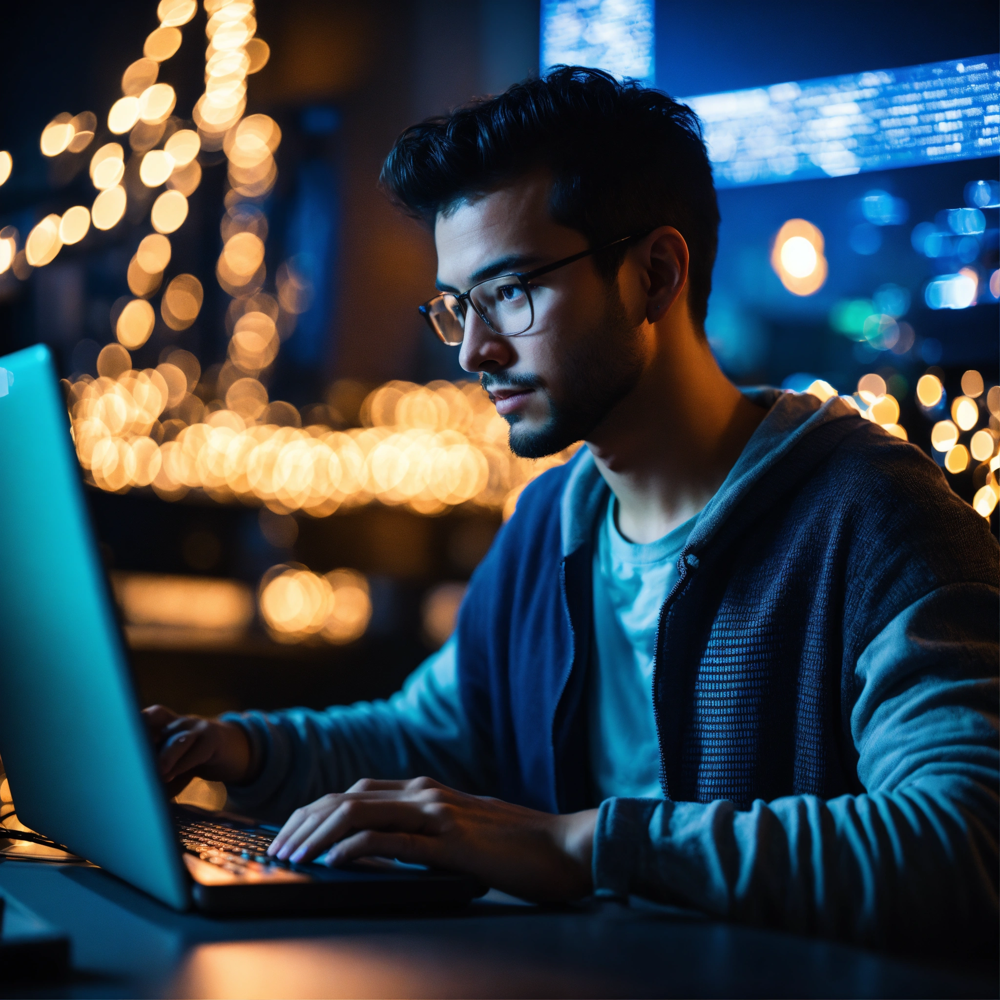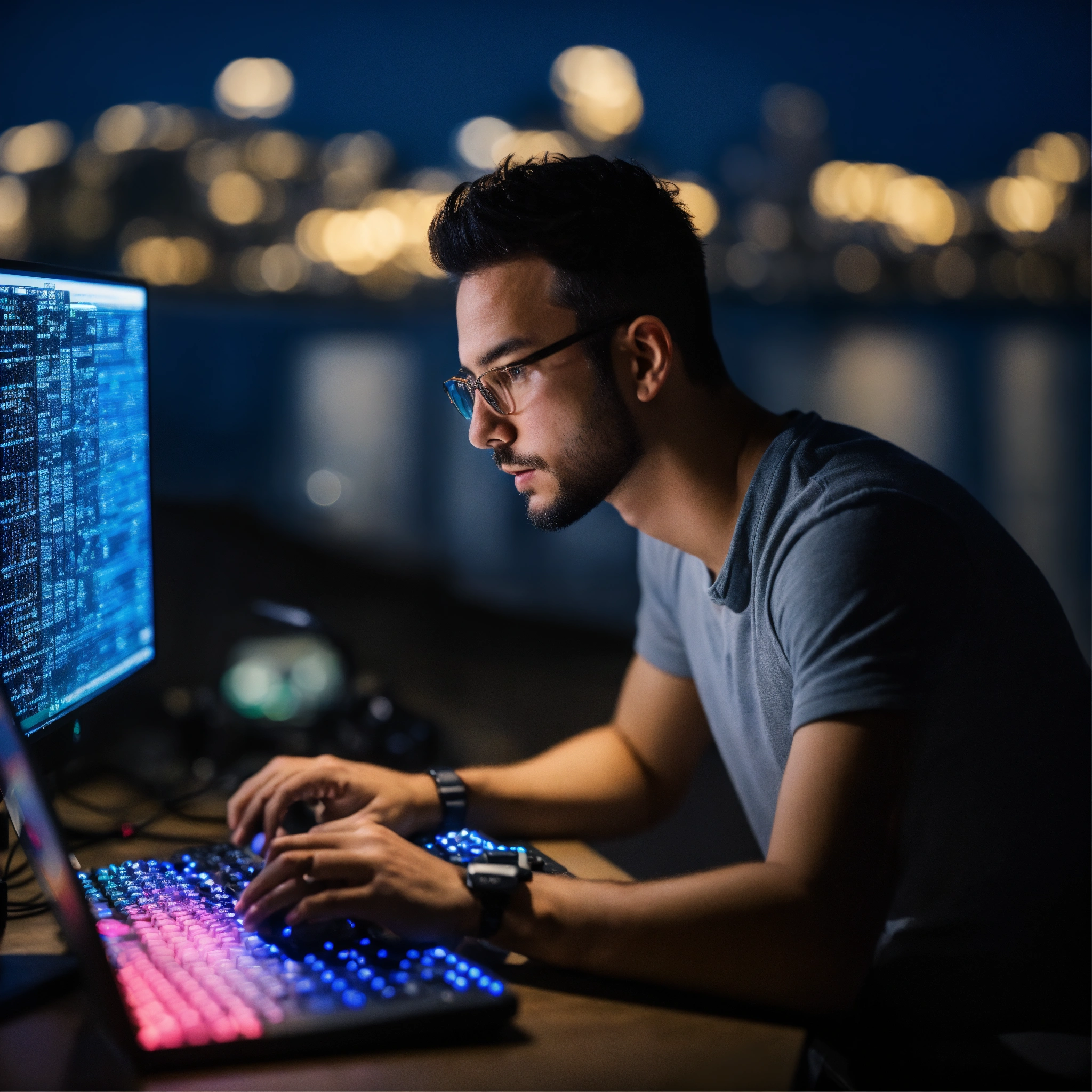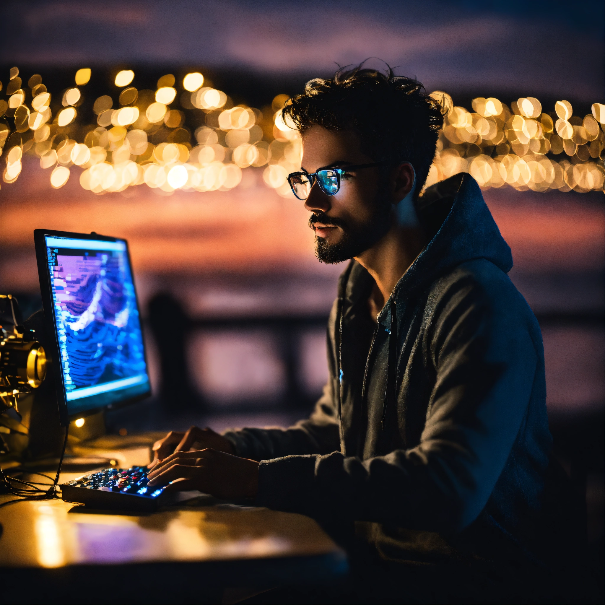 A portrait of a programmer with his computer, with a blurry backdrop of ocean lights. use a nikon d850 dslr 4k camera with a 200mm lens and dreamlike lighting to capture the passion and emotion of the performance.