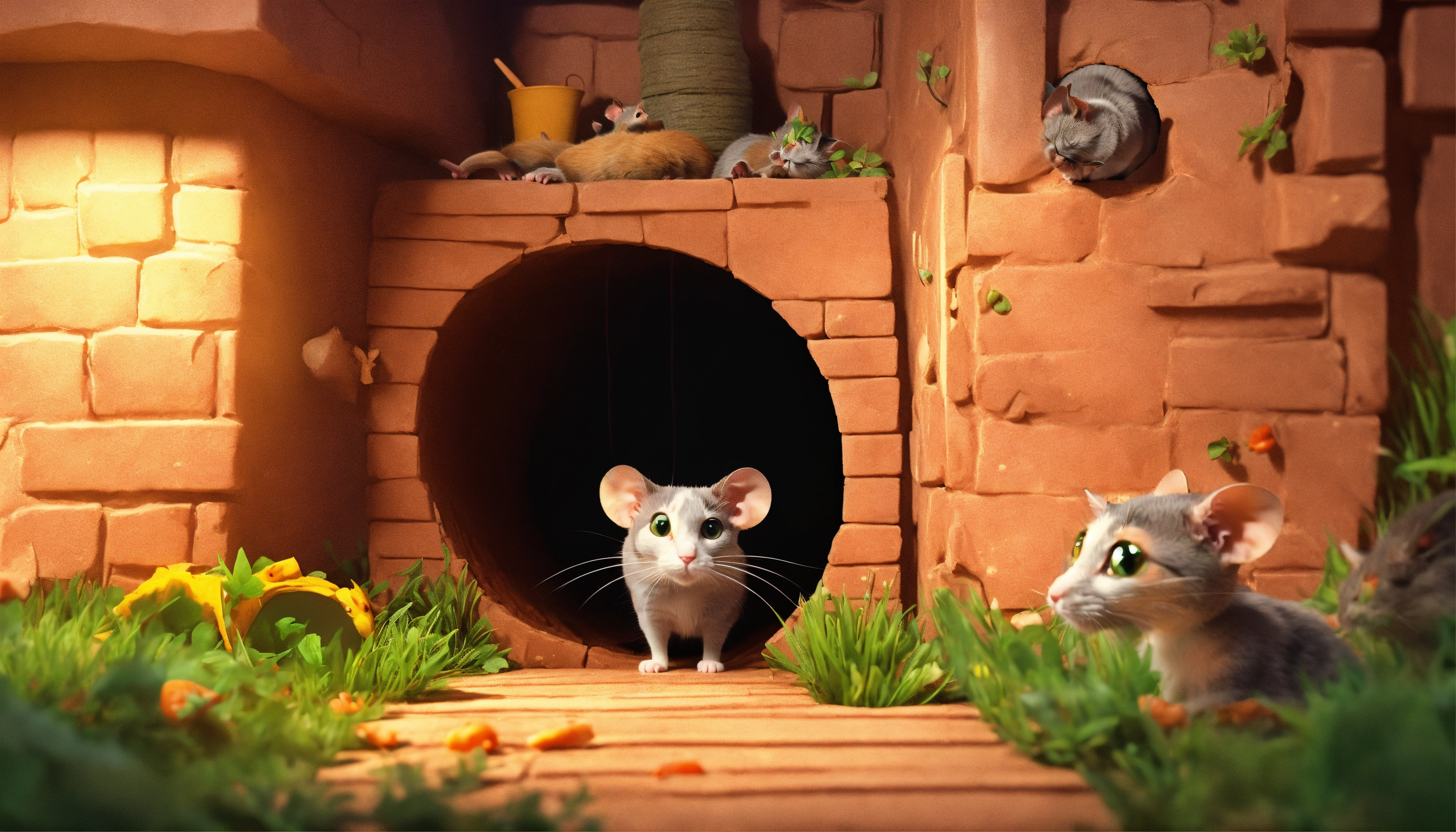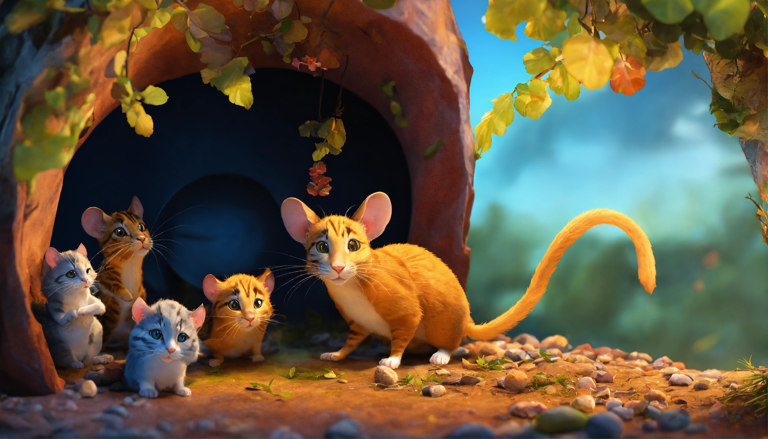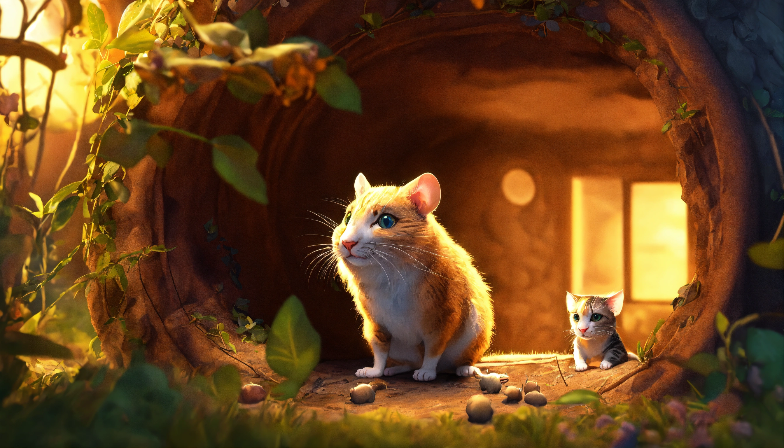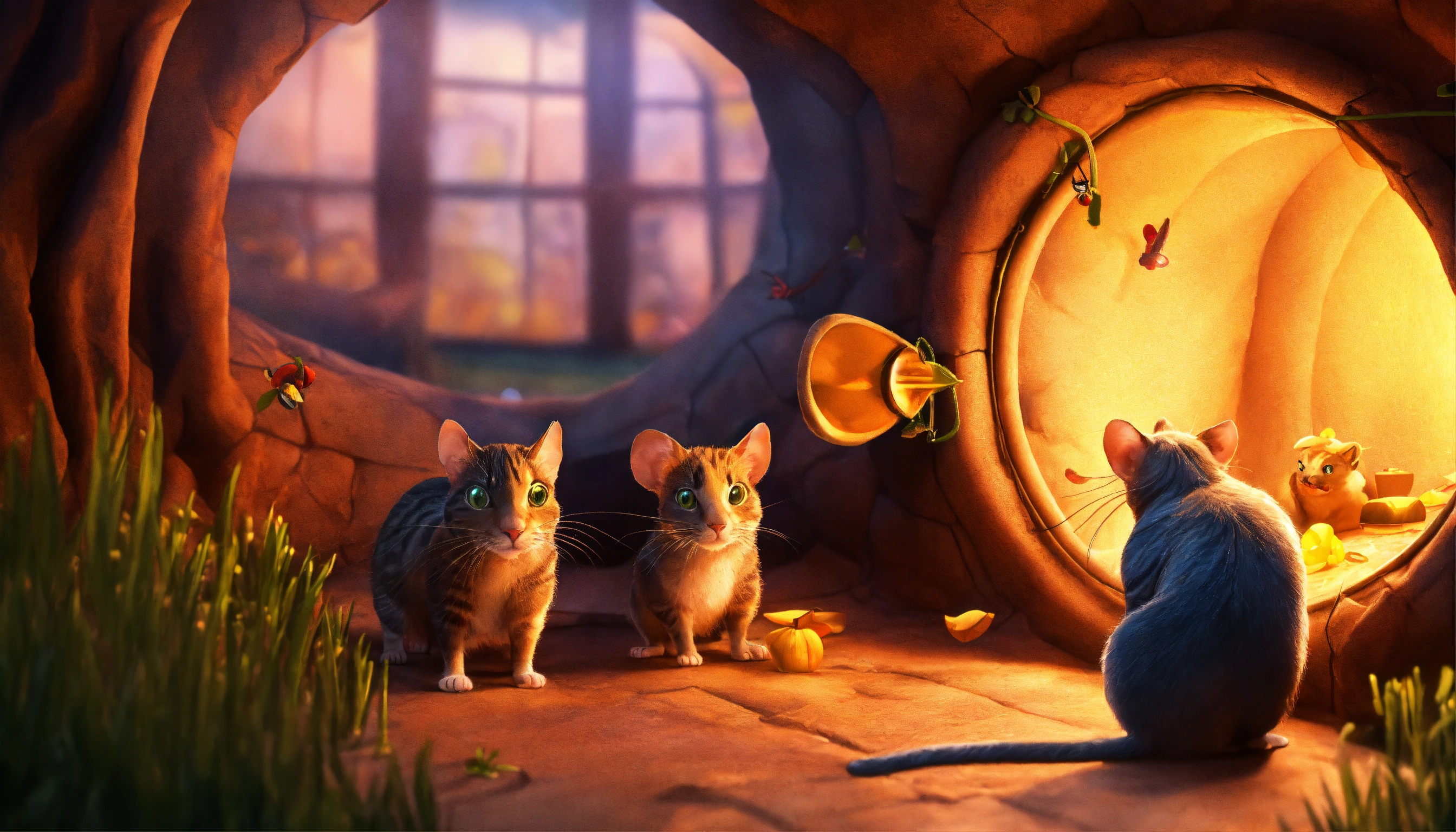 "the rats enter in his hole watching cat", 3d pictures, storybook illustration, digital art, professional, high quality, detailed.