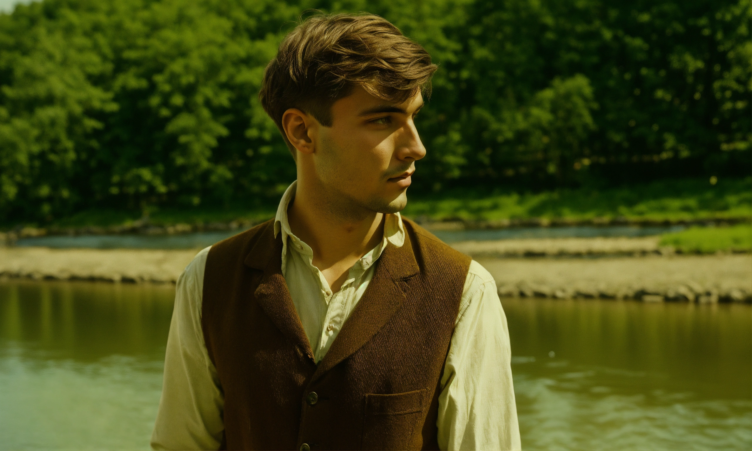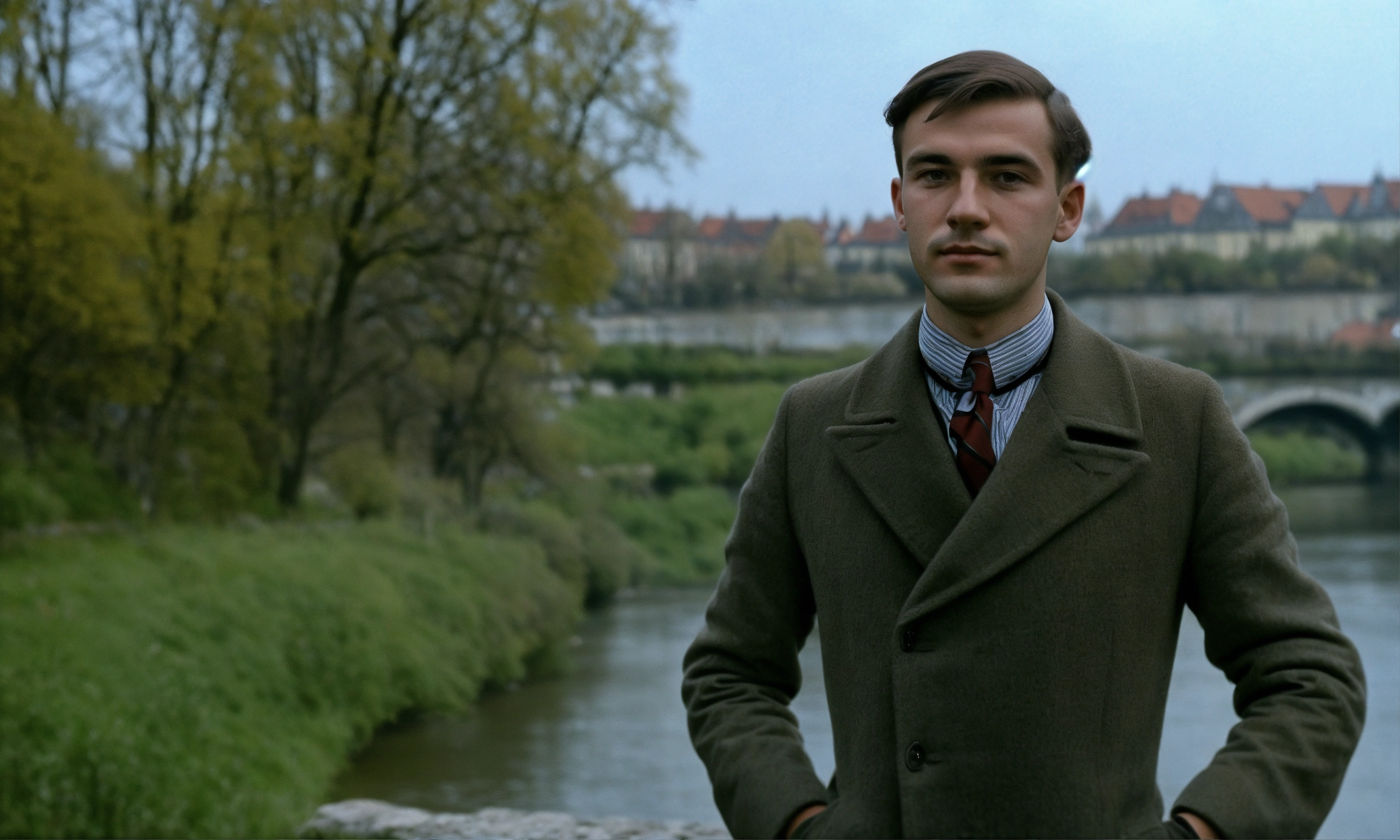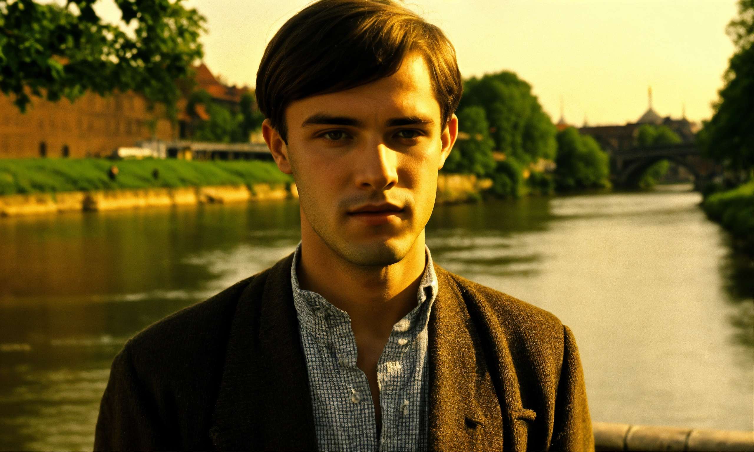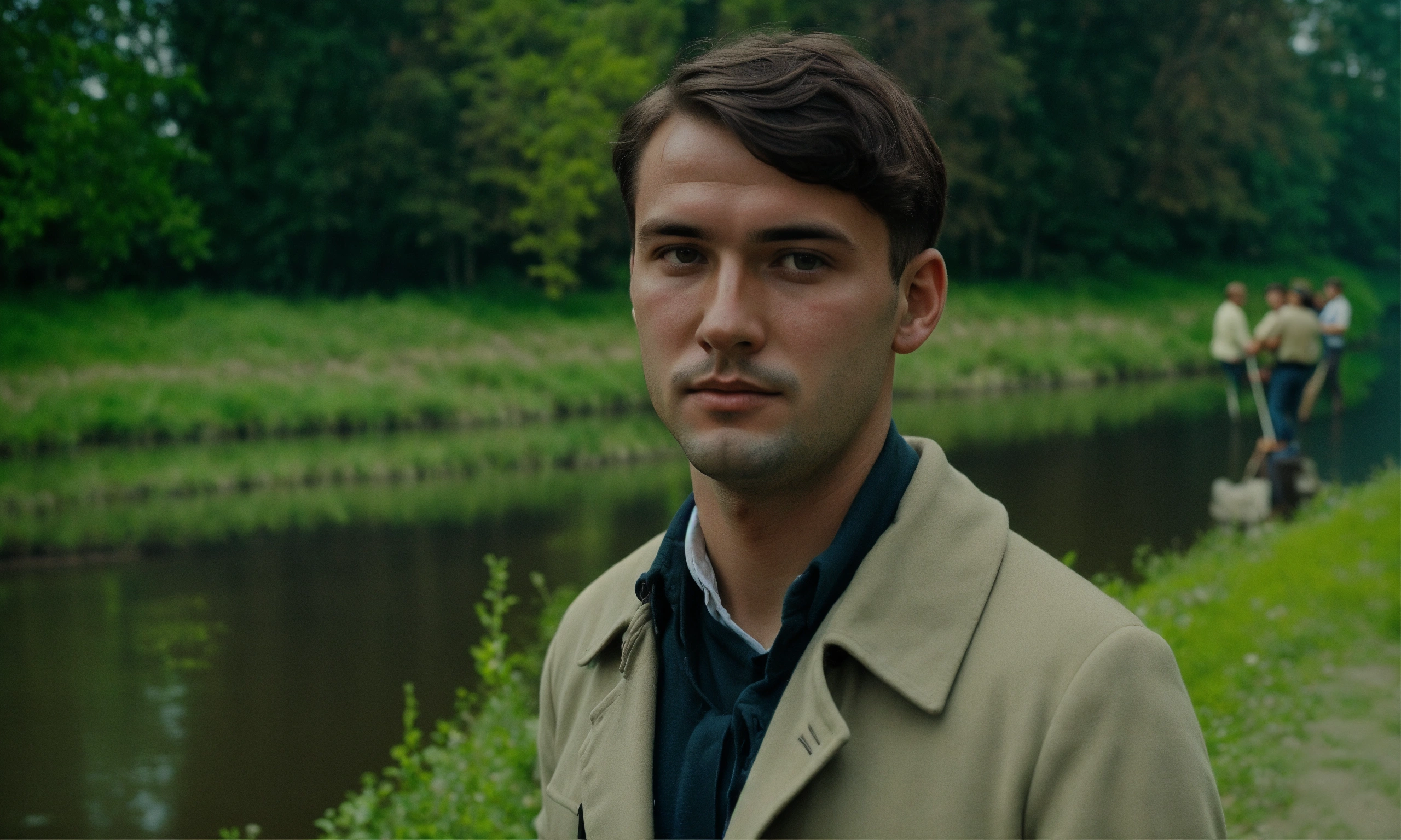 Retro warszawa 1920-1930, man age 25, by the river, looks at the camera at half height, short hair. man neen stay center
