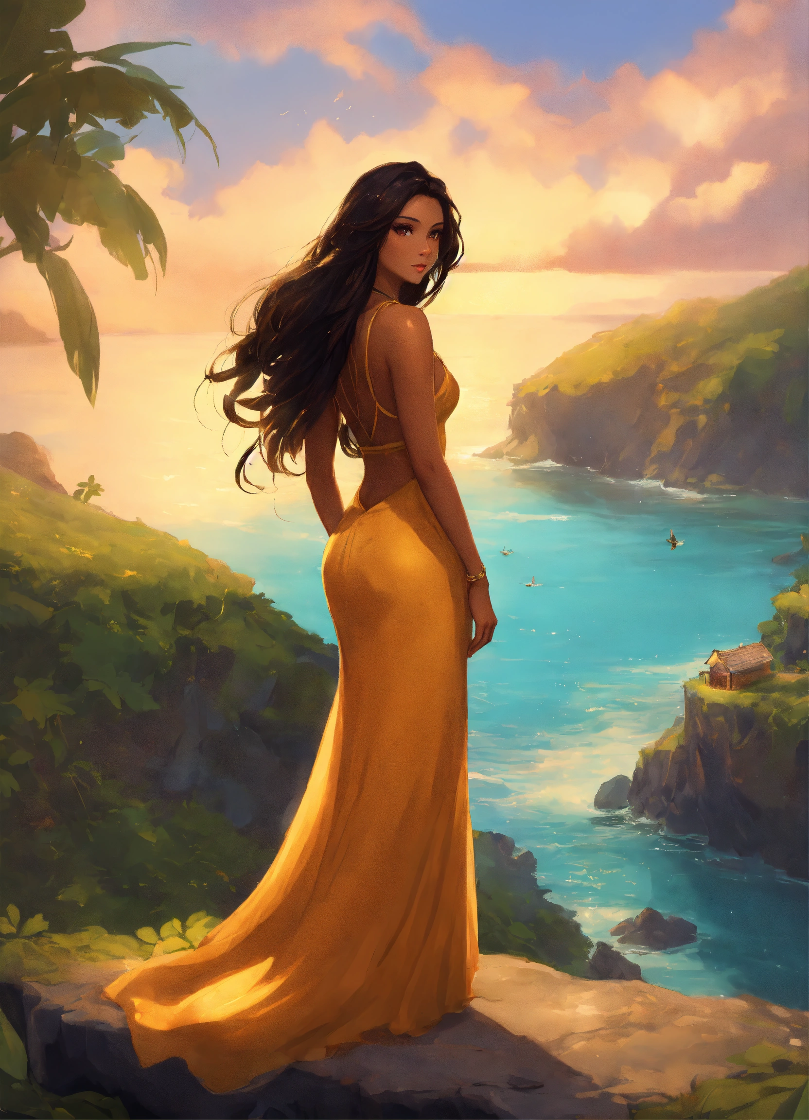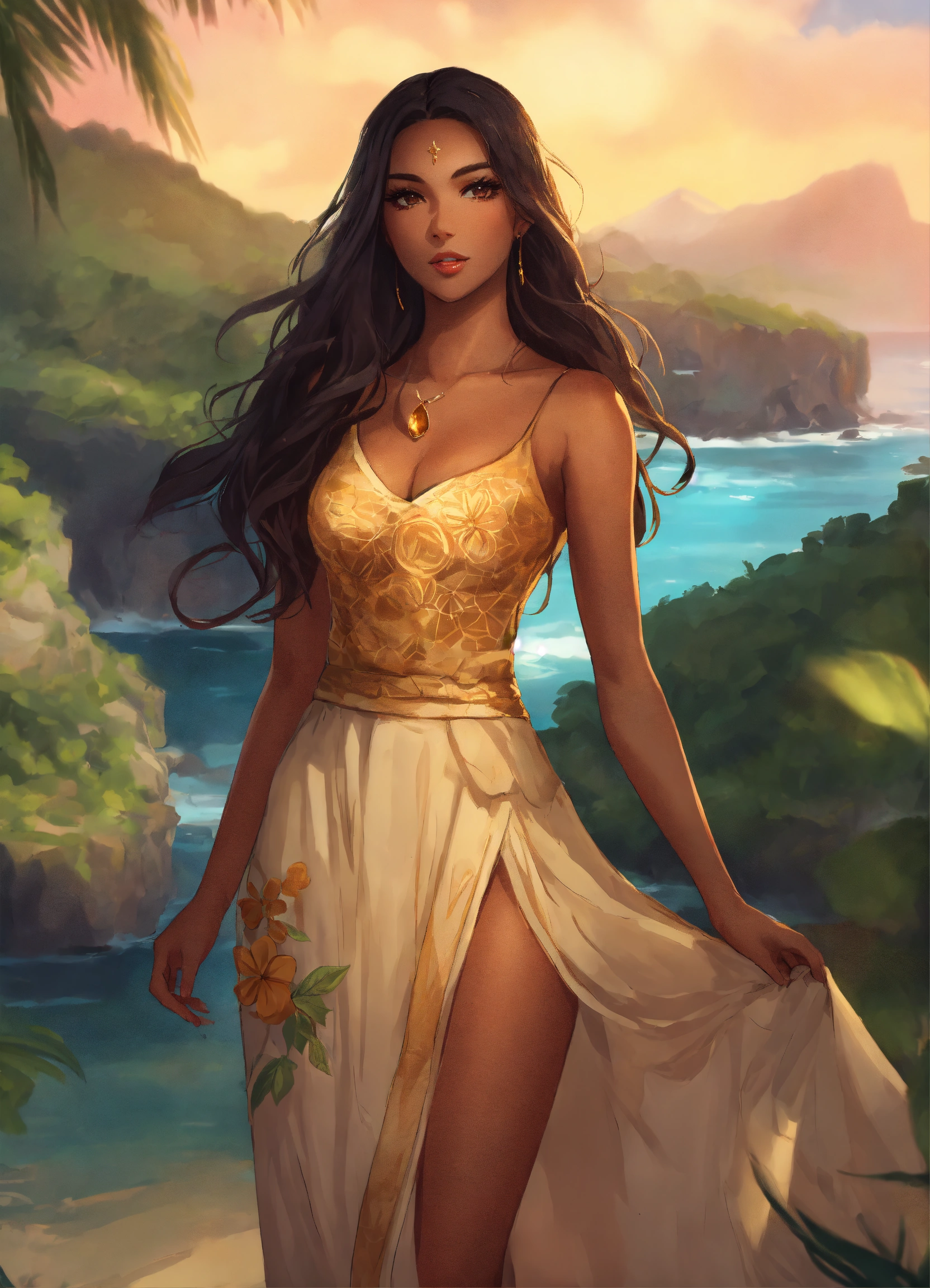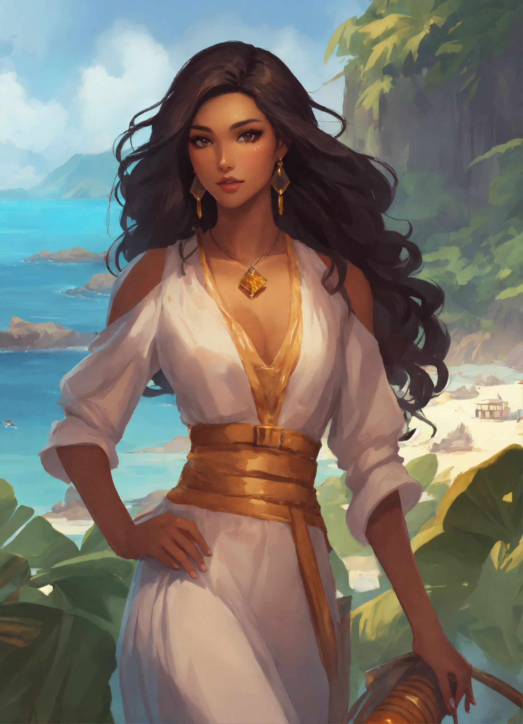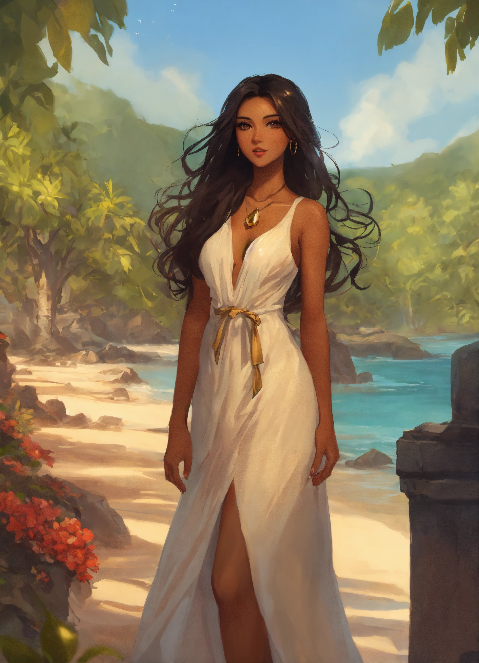A beautiful woman with tan skin and honey eyes with long dark hair in a dress on an island, radiant, reserved, slender, dnd character