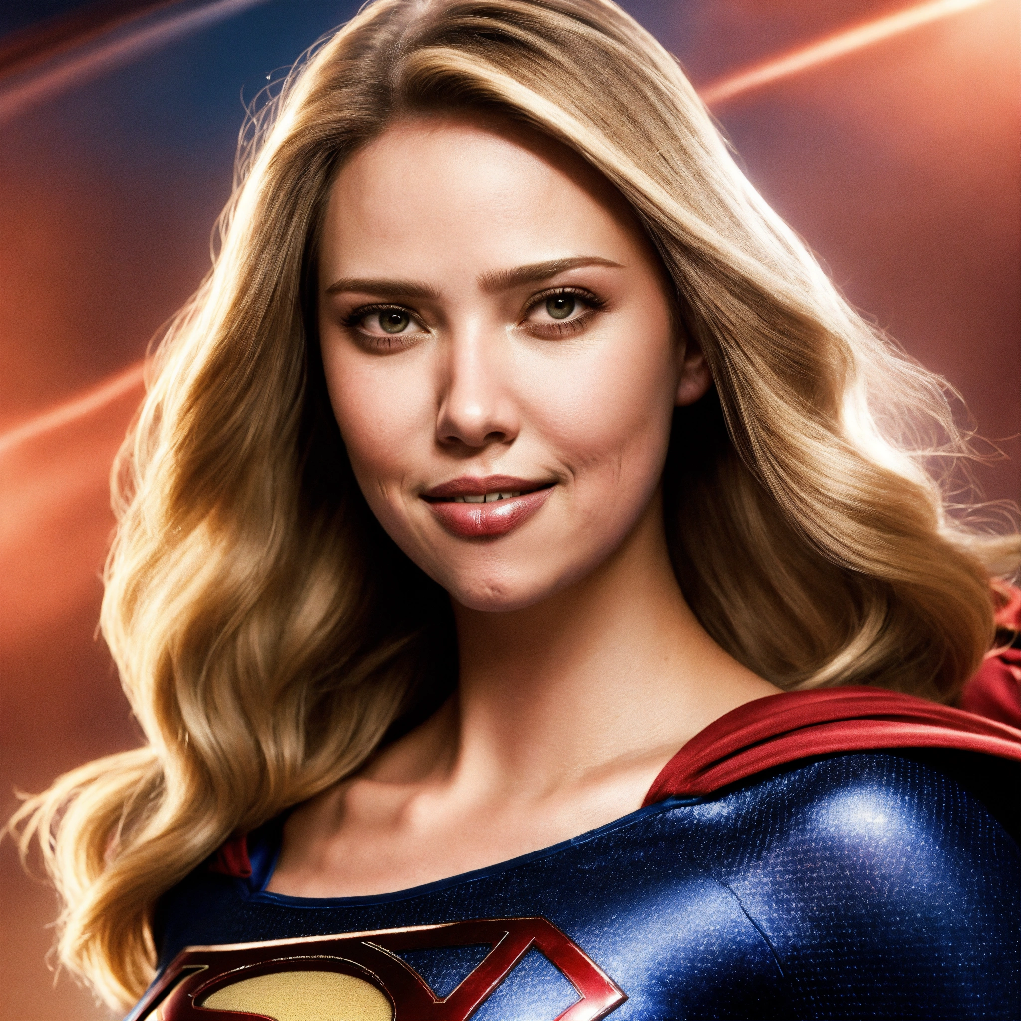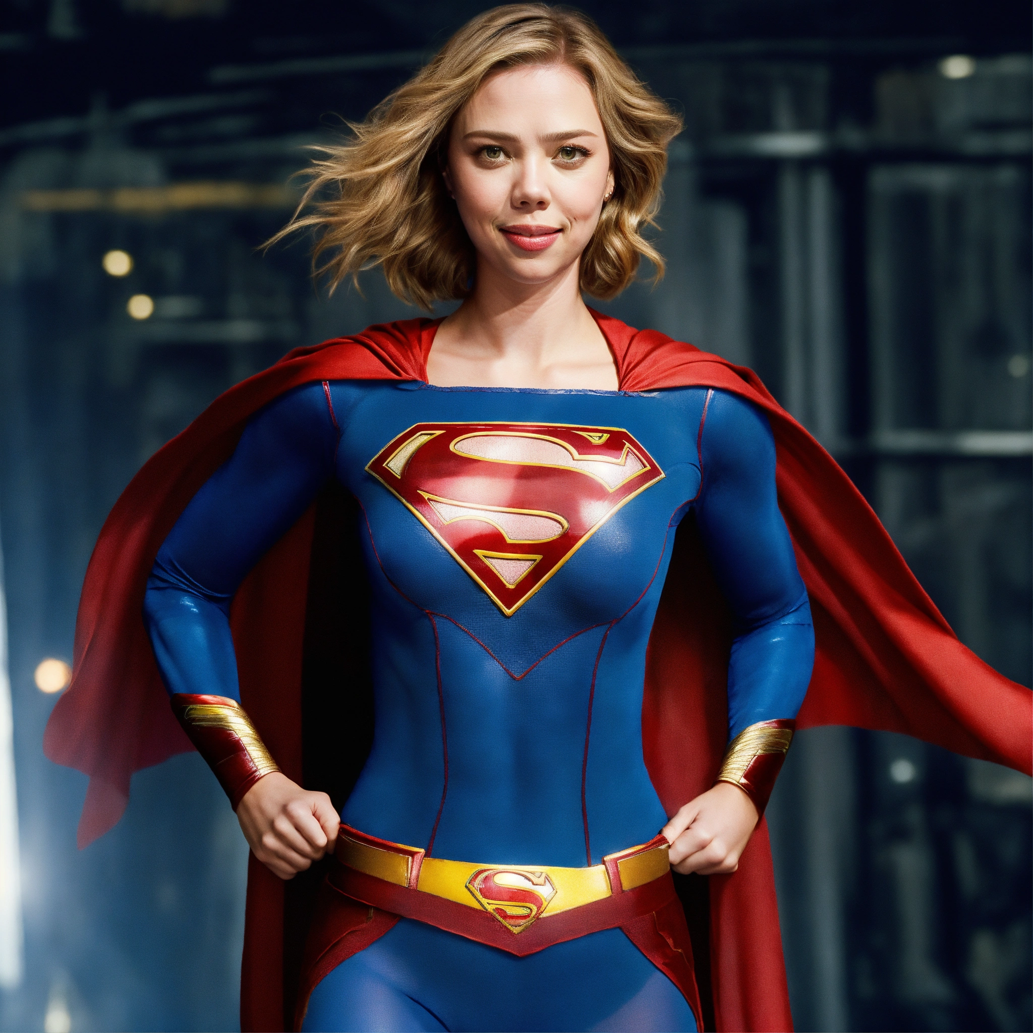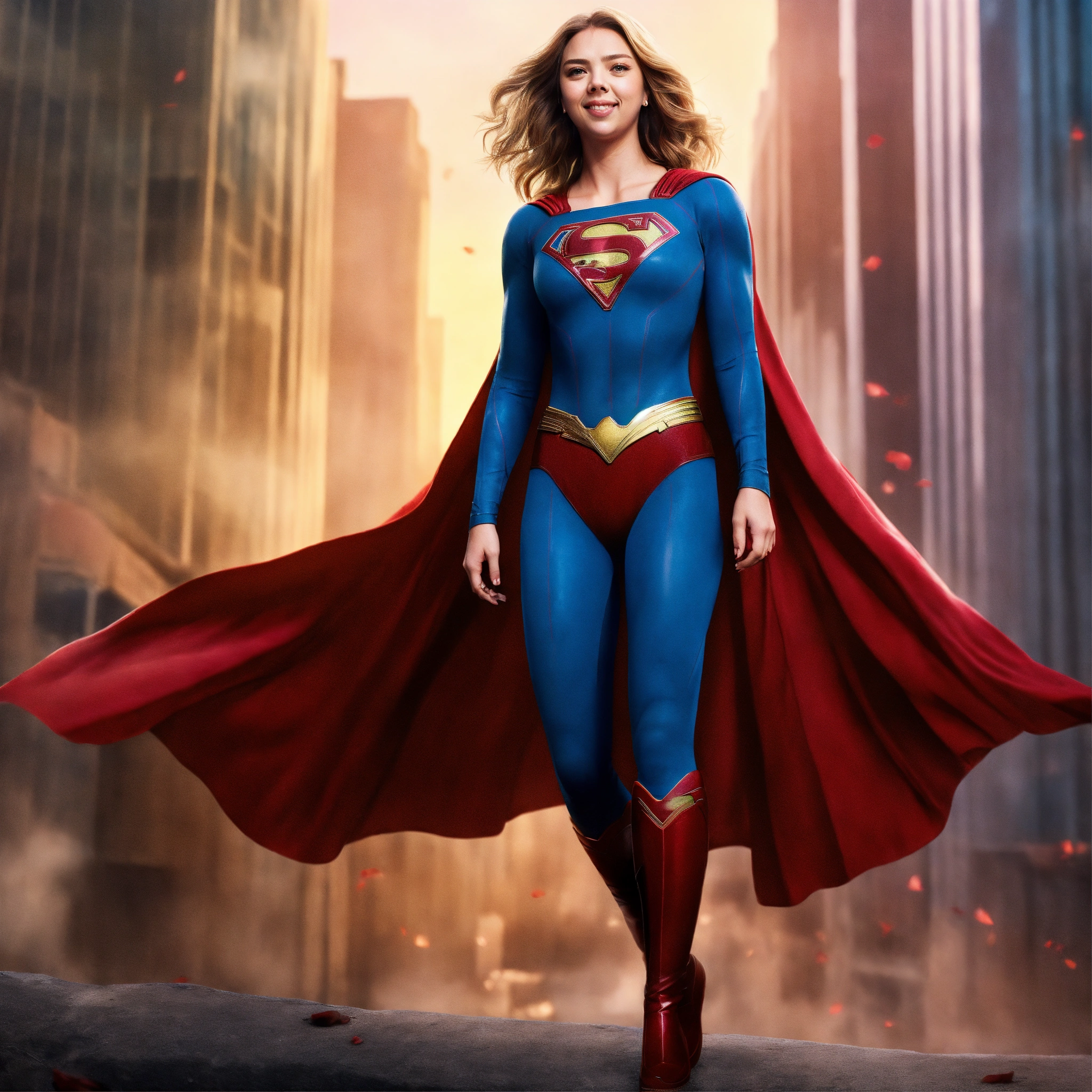 Snapshot like for men, scarlett johannson as supergirl with transparent, charming smile, blushed cheek, natural makeup, thin cape emphasis with feminine curves, full body