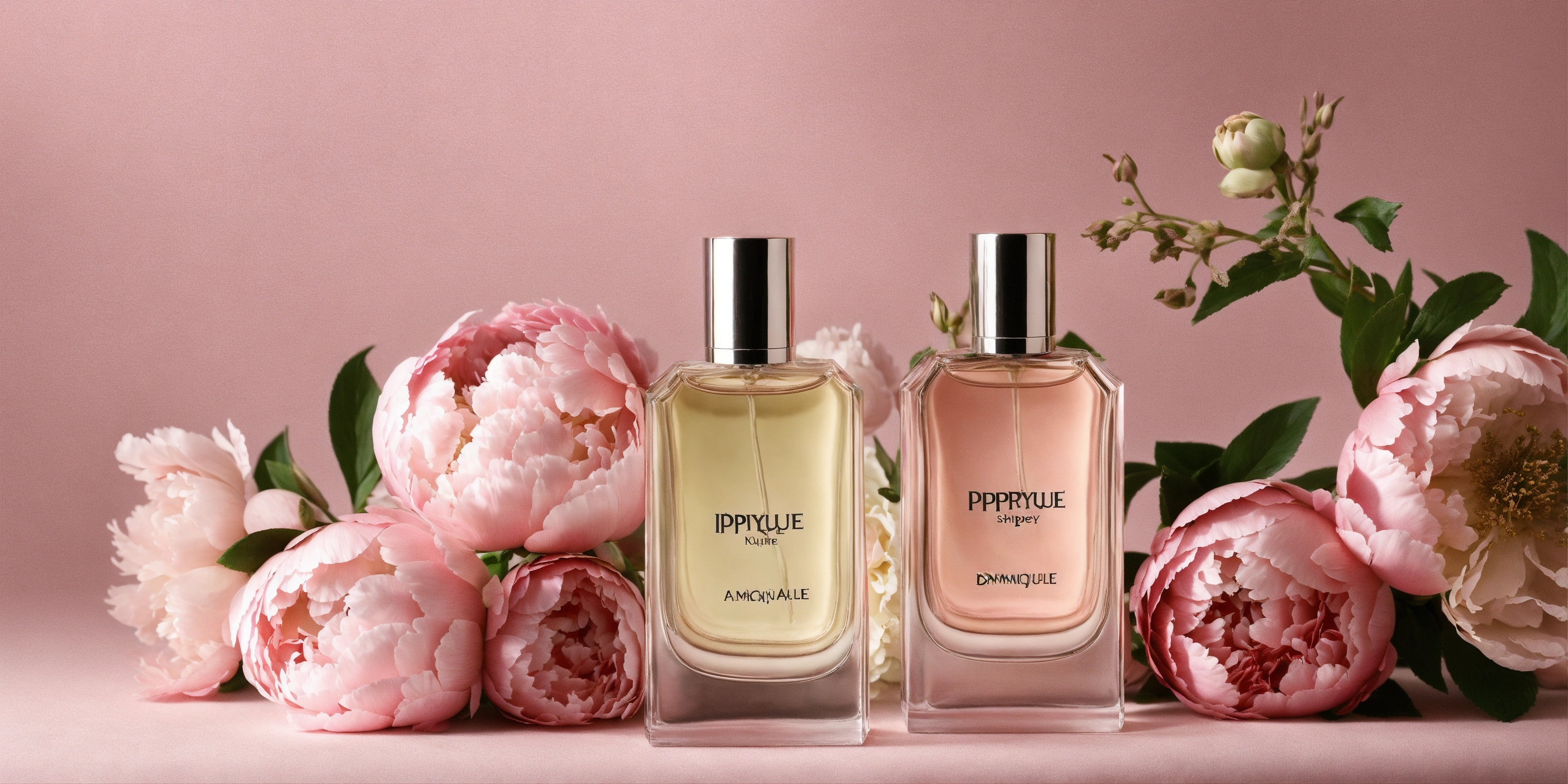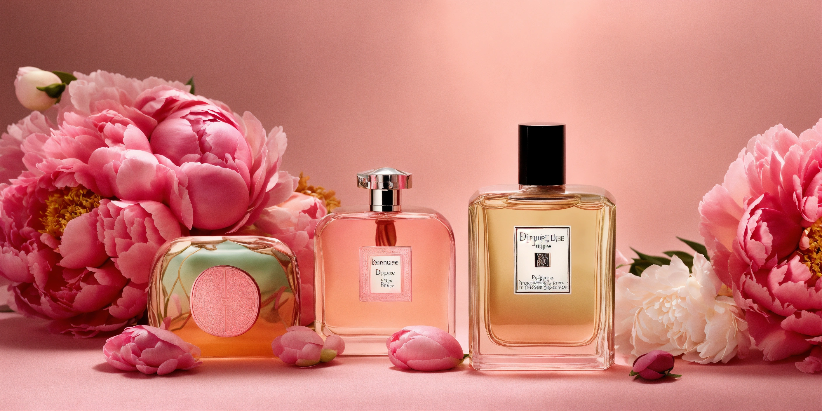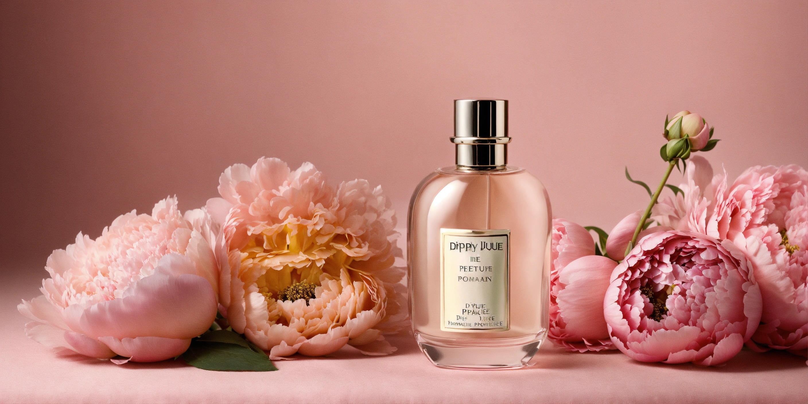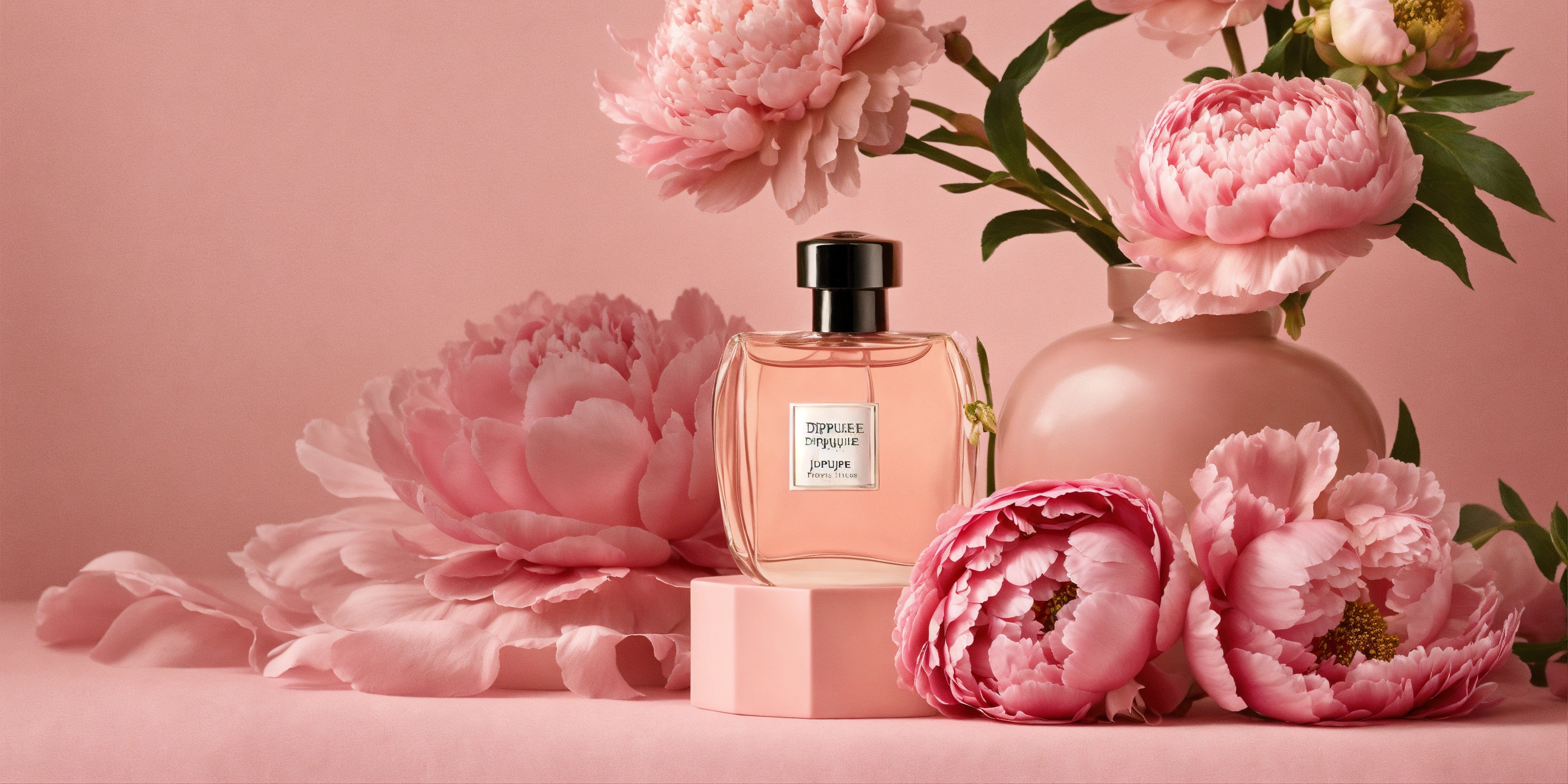 1 perfume bottles, soft curves and romantik, soft pink, professional photo studio inspired by diptyque perfumes with some pastel peony