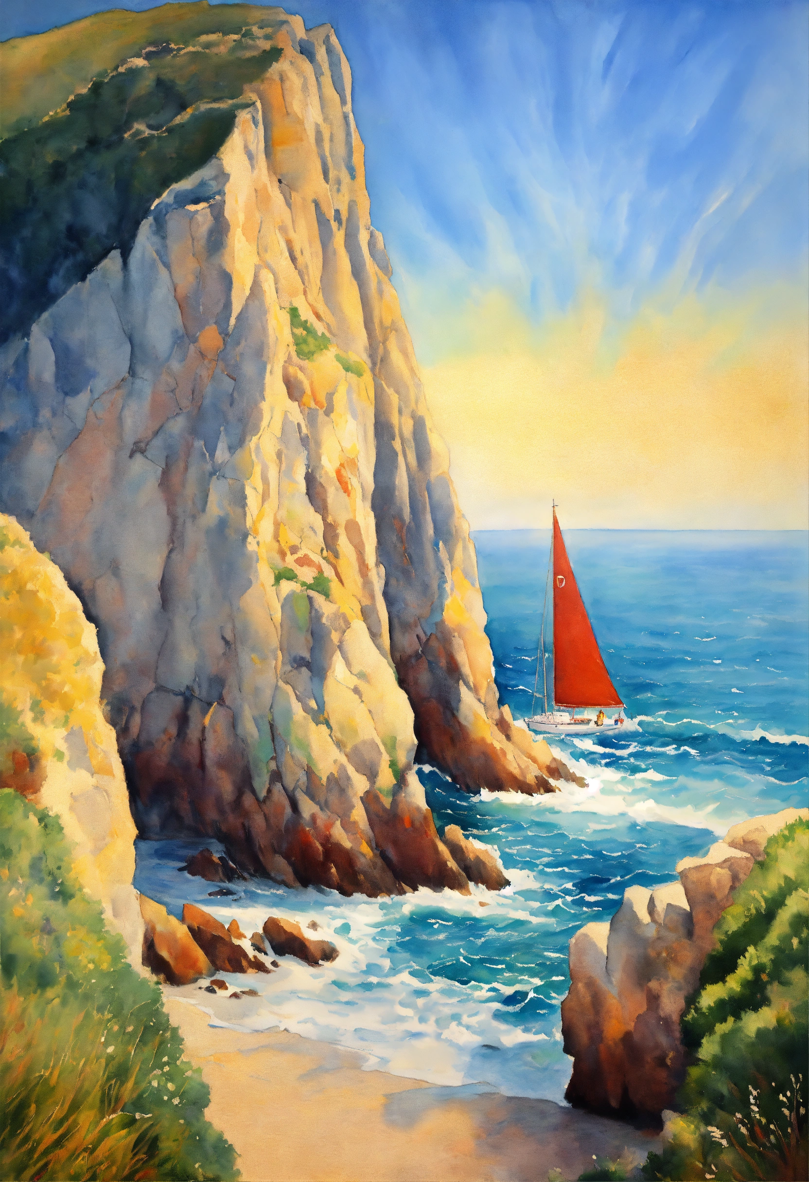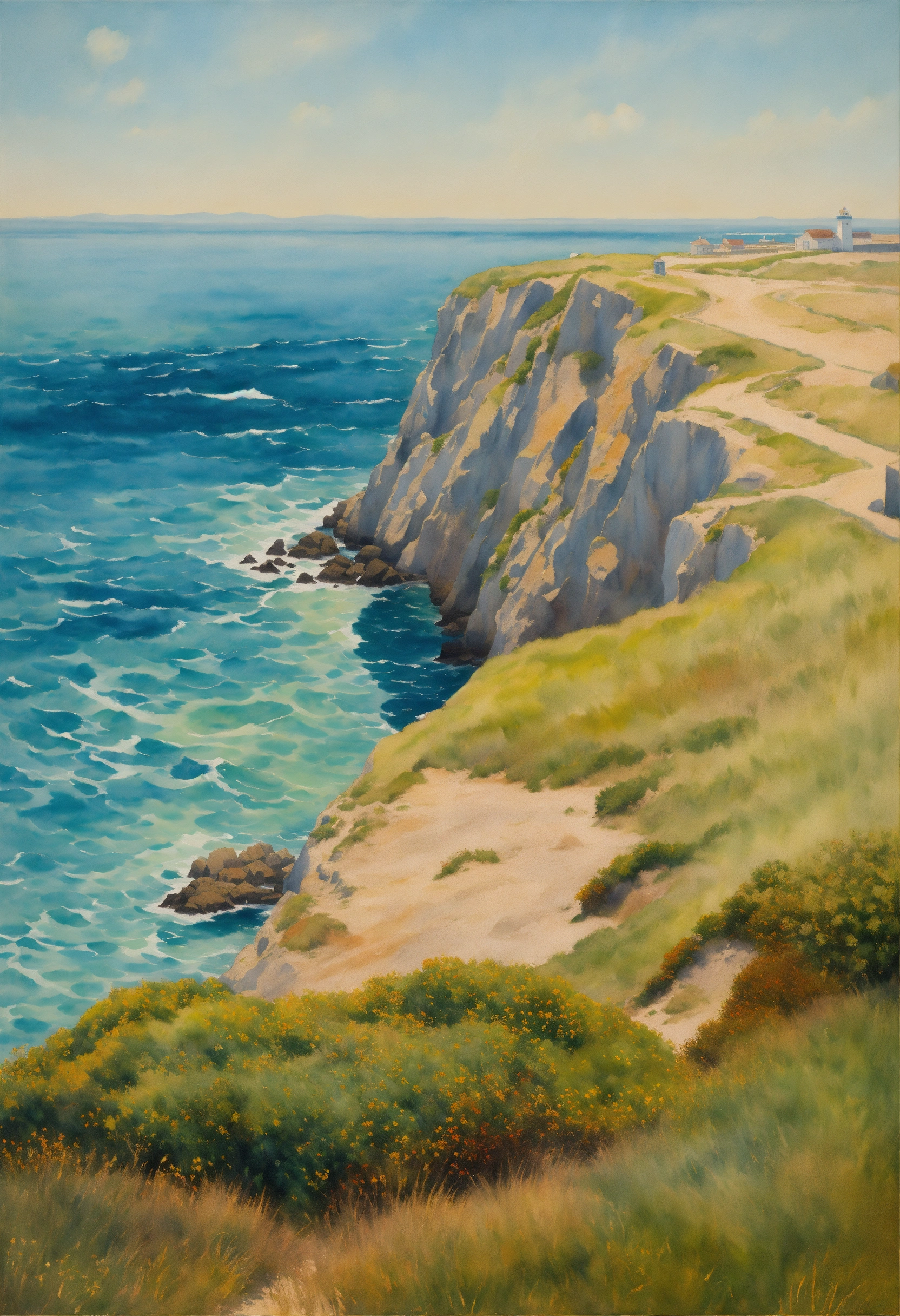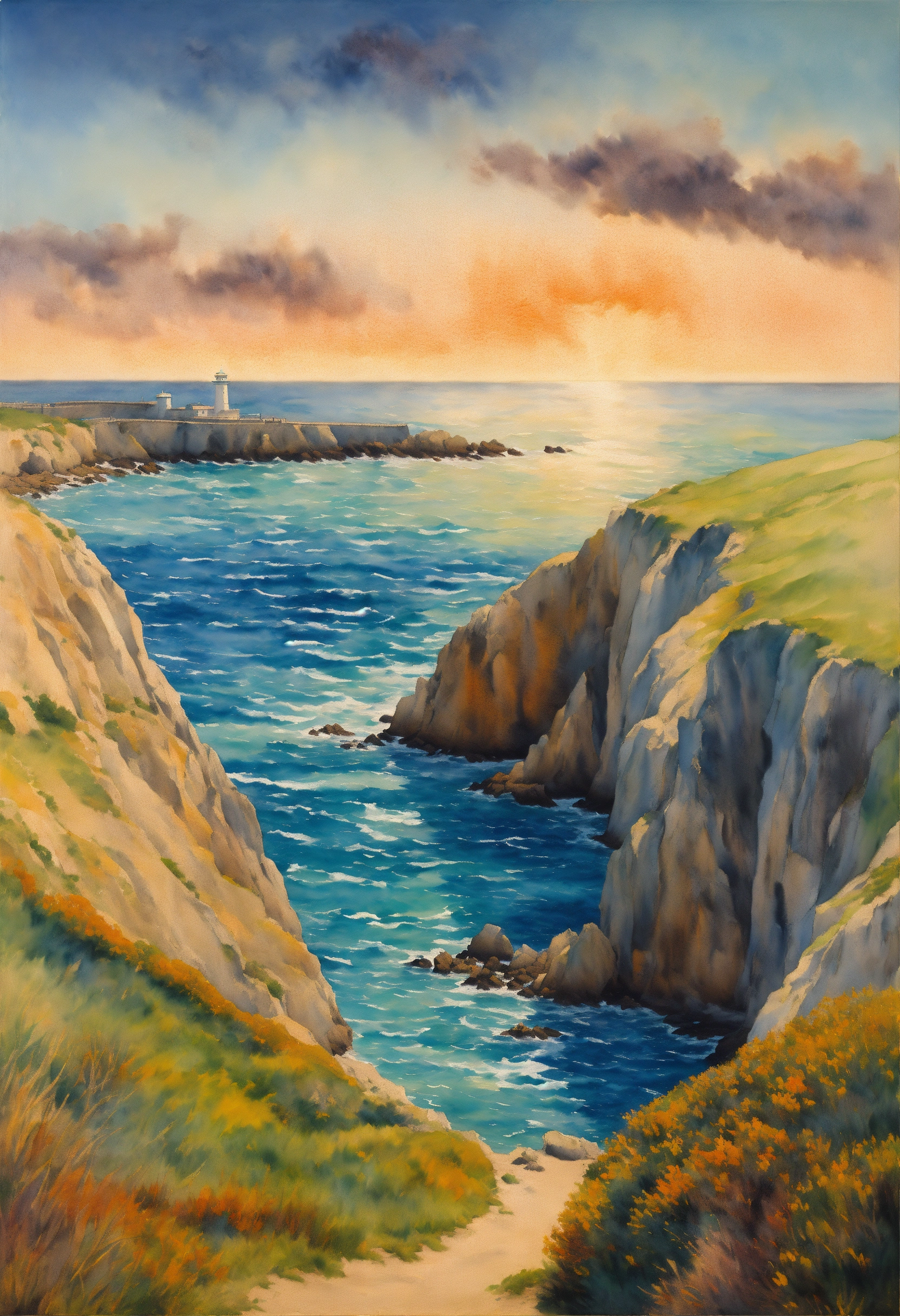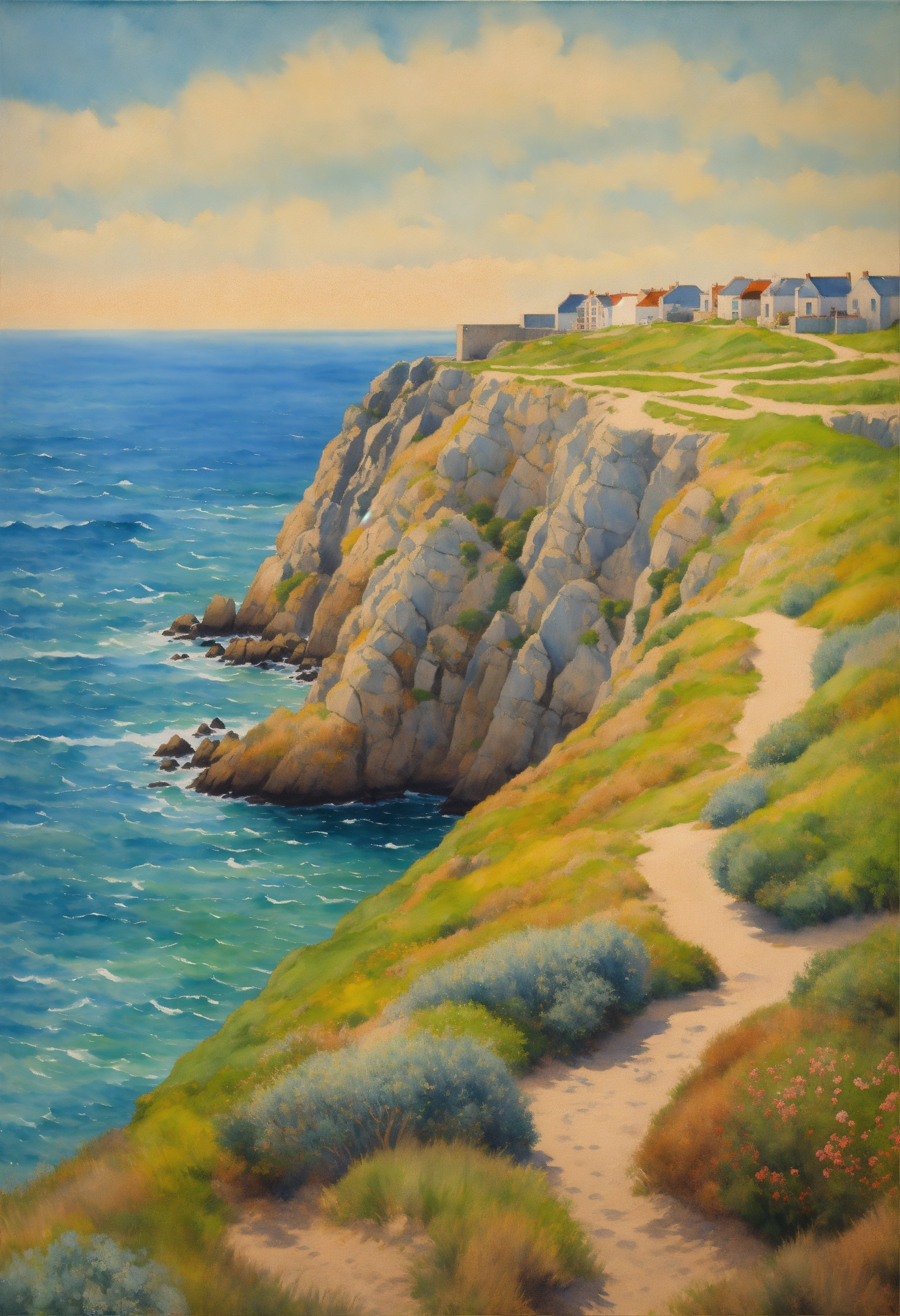 Op view of la pointe de la torche france by the sea, ocean light, good dynamic range, good color, by magritte, oil paint, watercolor