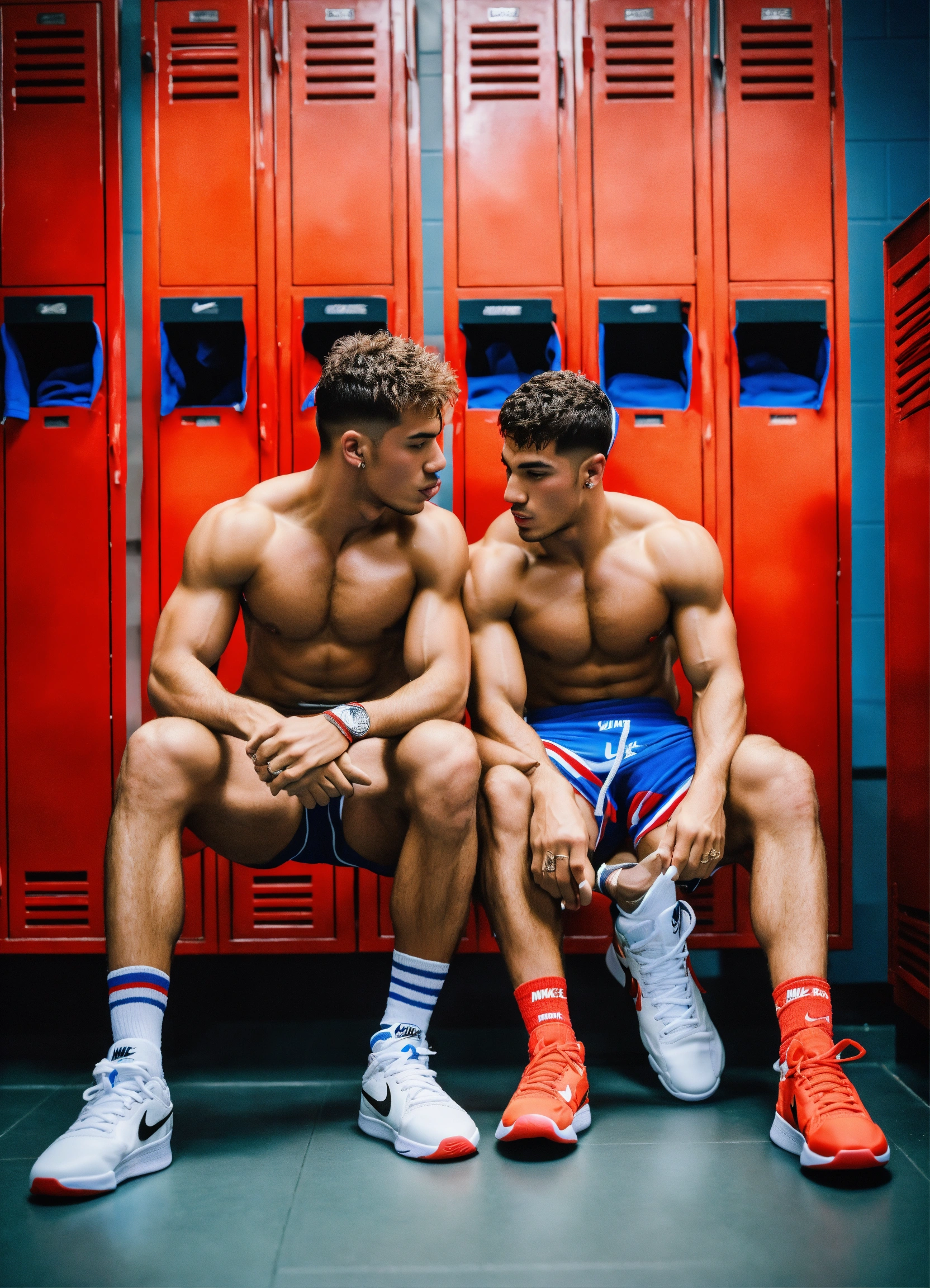 Bromance, group of french columbian fit slim sweaty sporty college handsome tanned boxer wrestlers young stud guys cuddling, smelling, holding hands, flirting, drooling, kissing, wearing sock and nike jordan sneakers, in a locker room lockers, with big bulges, sniffing sneakers, they like feet, gazing into each other, salivating