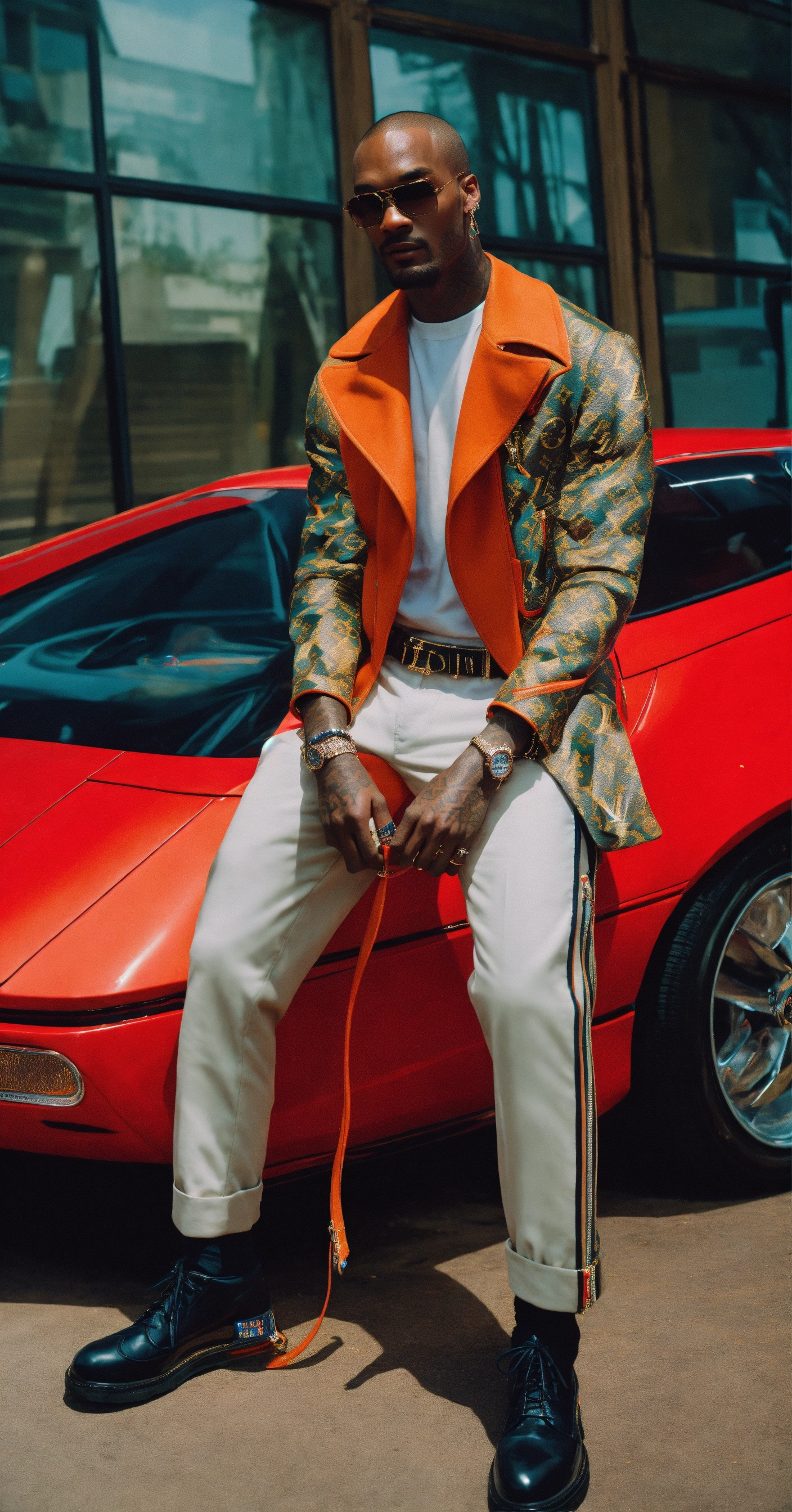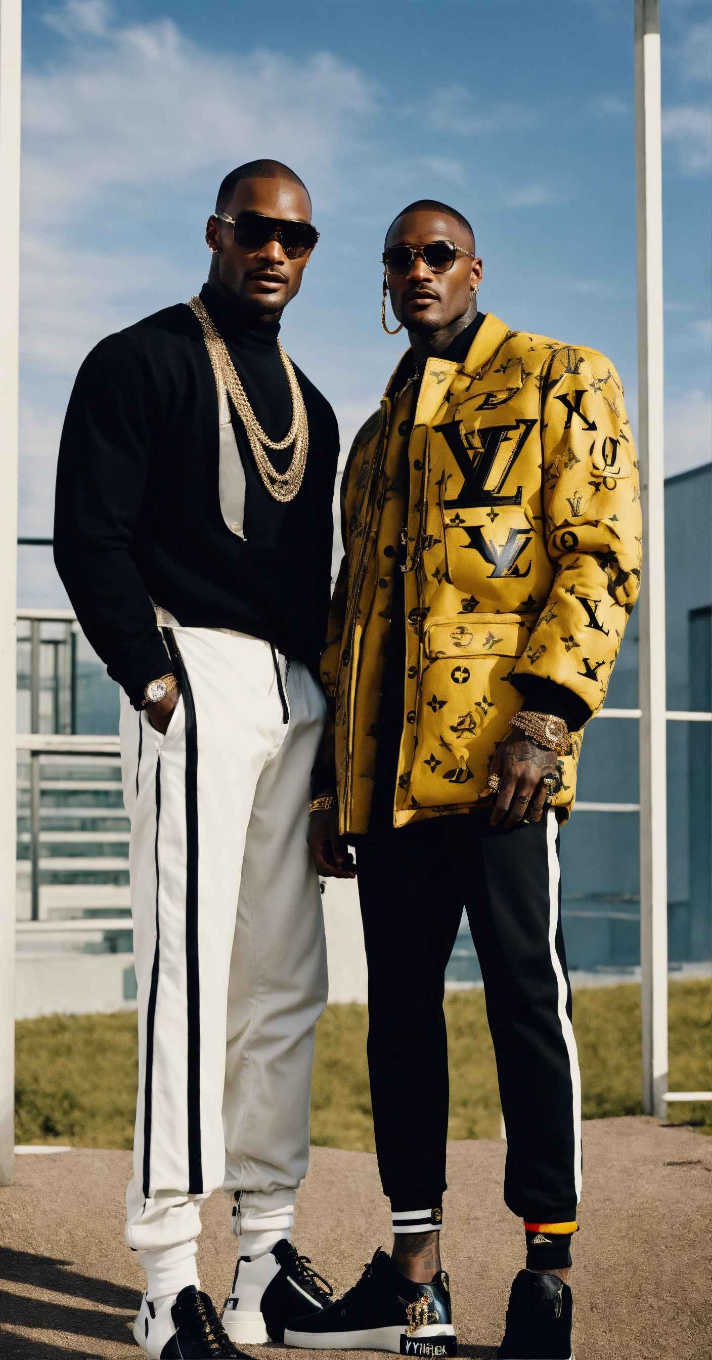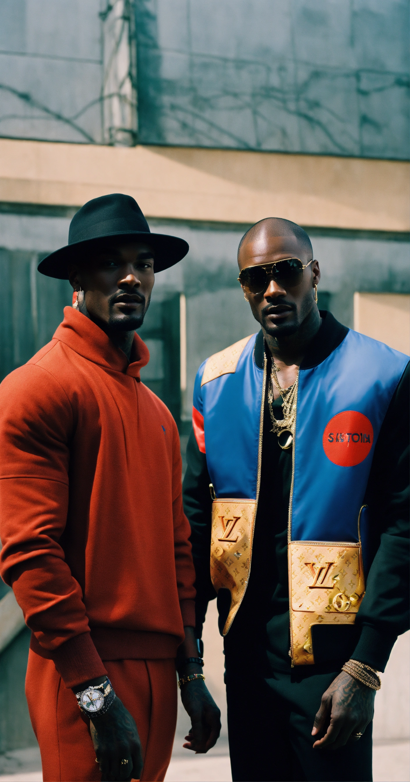 Tyson beckford and skepta, 8k resolution, hyper realistic, mid day, 35mm film, editorial, high fashion, louis vuitton, by virgil abloh