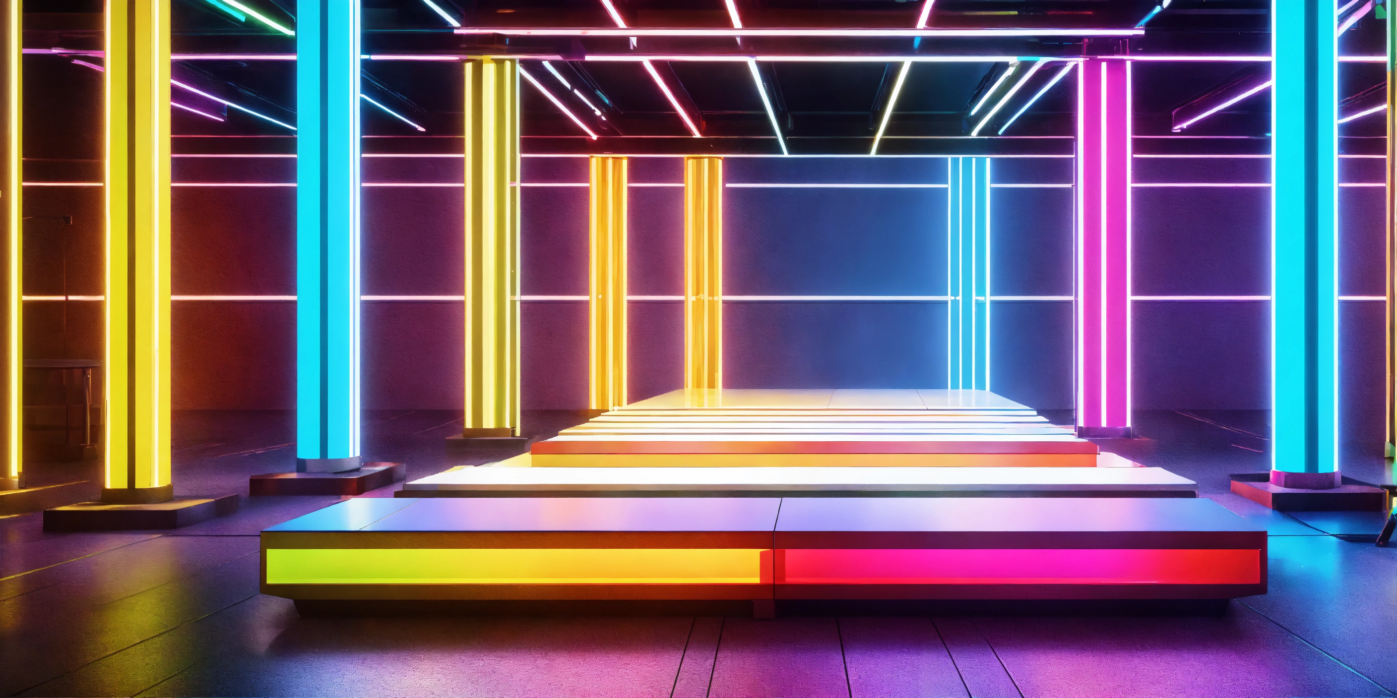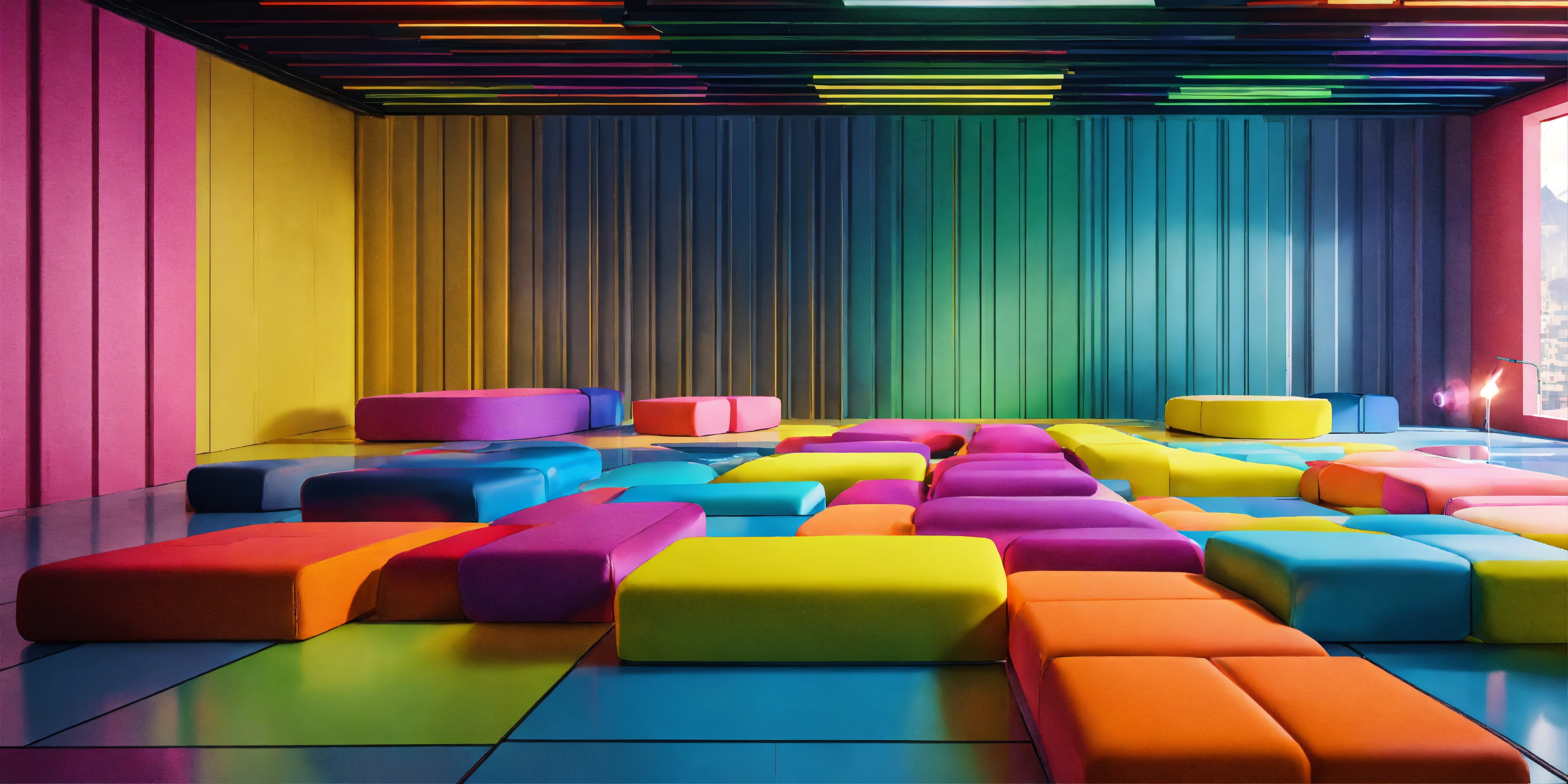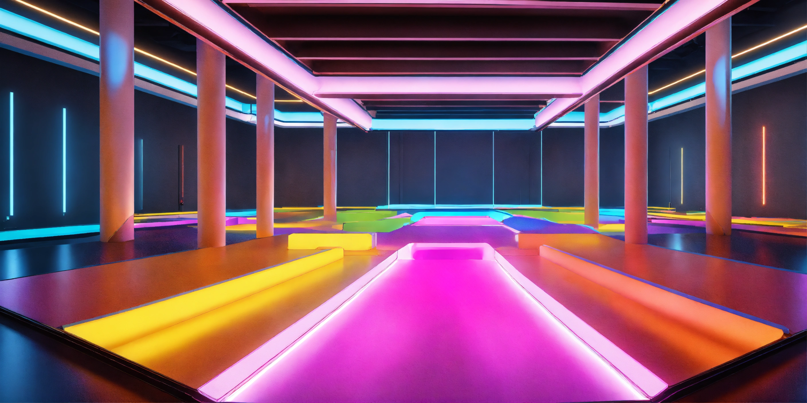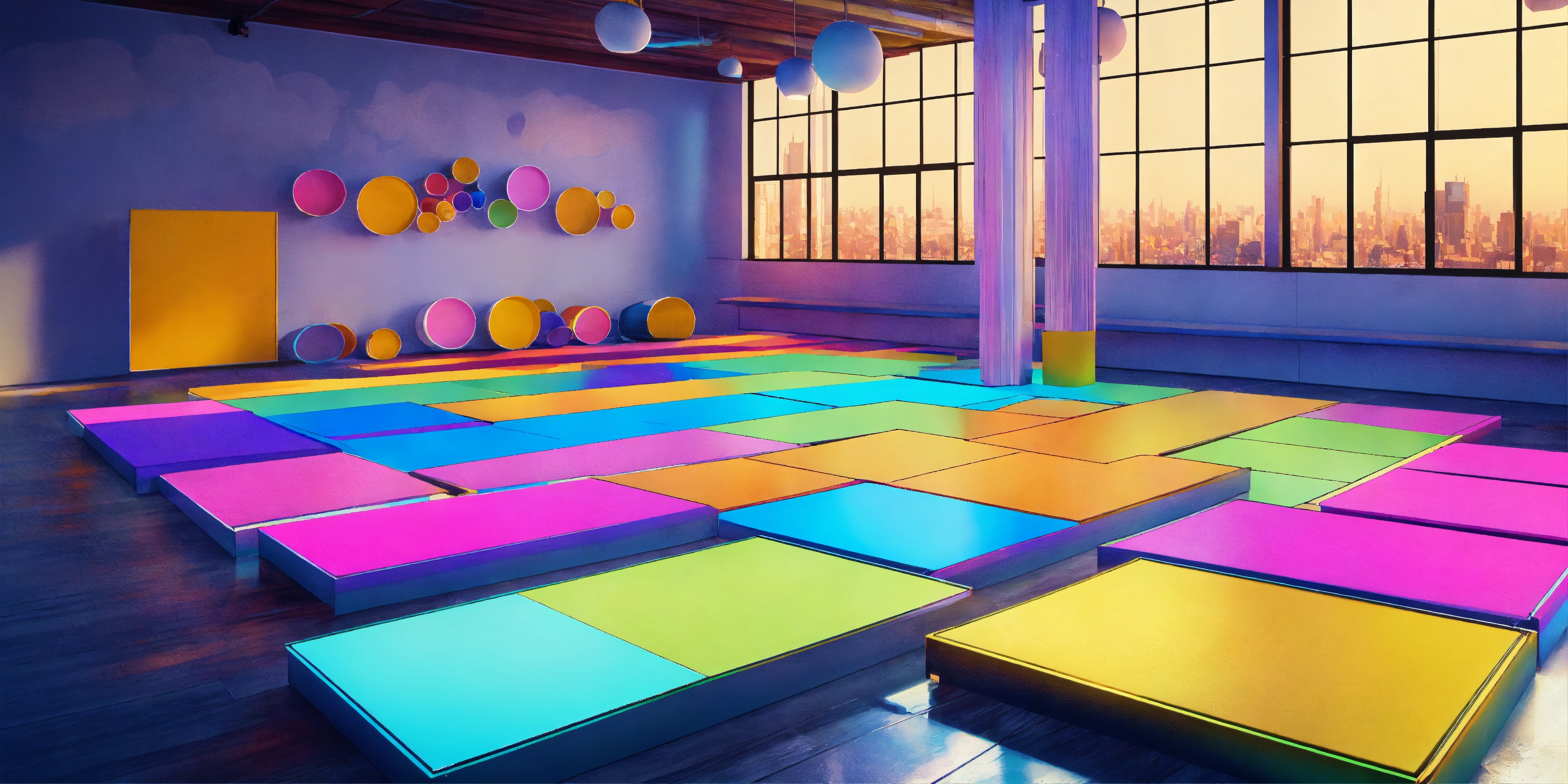 A colorful platform in a bright room with multiple platforms to stand on