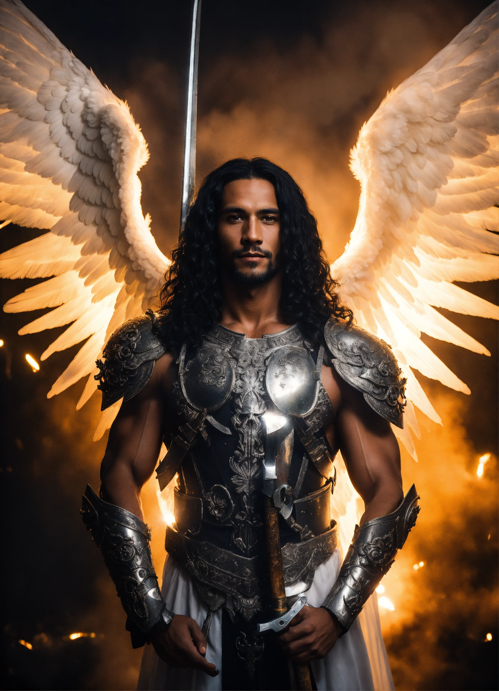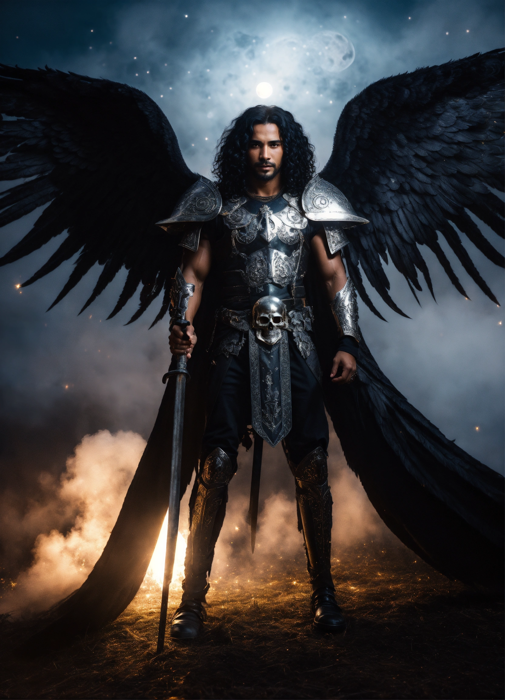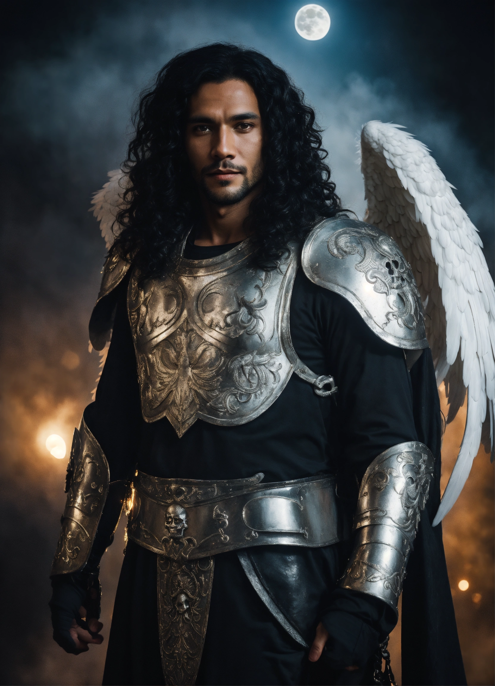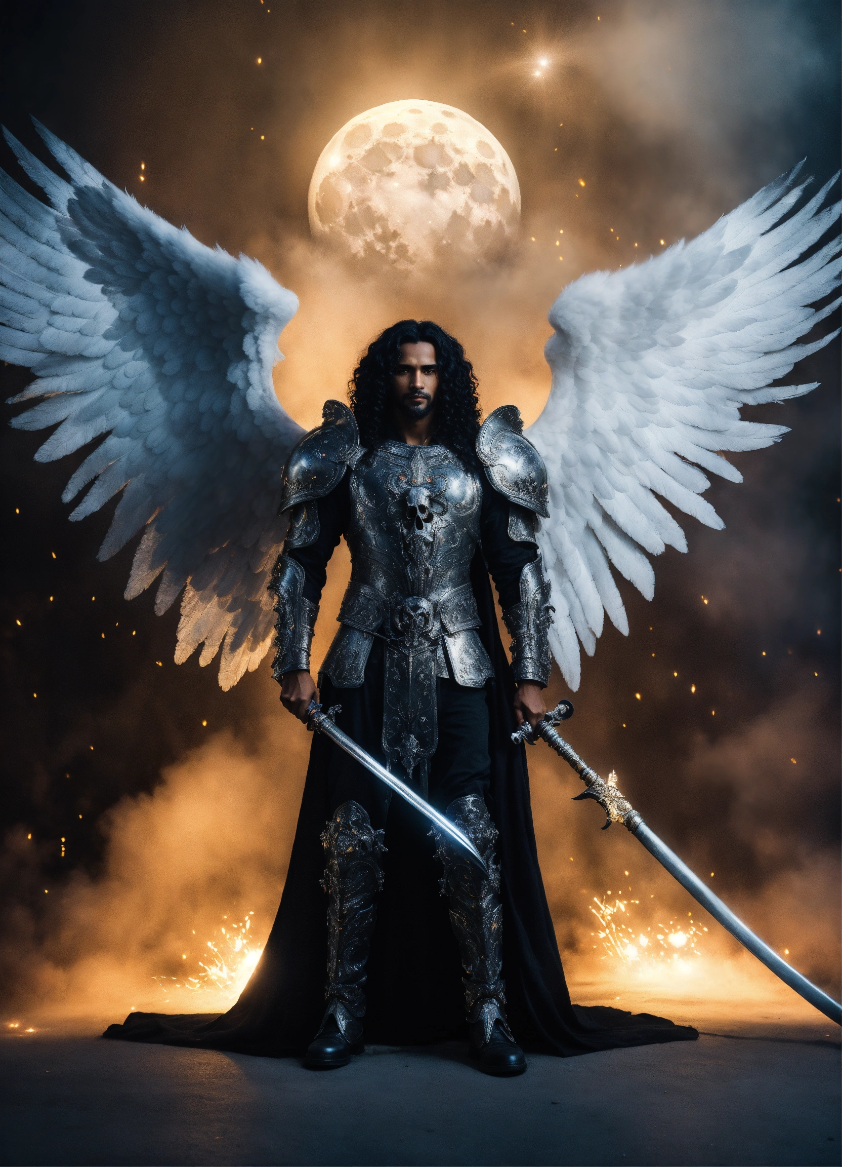 Full body photographic portrait of 35 year old robust, fit, masculine archangel of death with massive angel wings, male supermodel mixture of black and latino descent, background is misty fog and full moon, explosion of sparkling holy spirit lights, holding a scythe, death, transition, hope, power, destination is heaven, renewal, willing sacrifice, surrender to the light, servant of god, holy comforter, gentle smile and staring intensely at camera, long black hair with curls, eyes centred in shot, wearing futuristic platinum battle armour with skull details over a sparkling white tunic, ethereal, symmetrical, fantasy photoshoot. film grain.