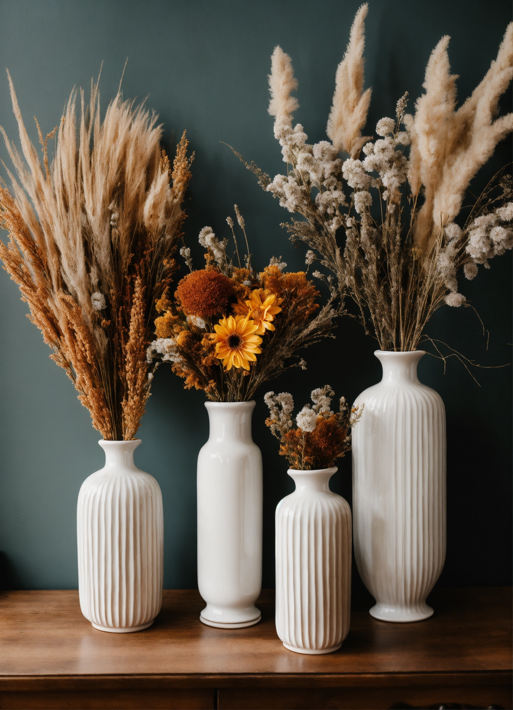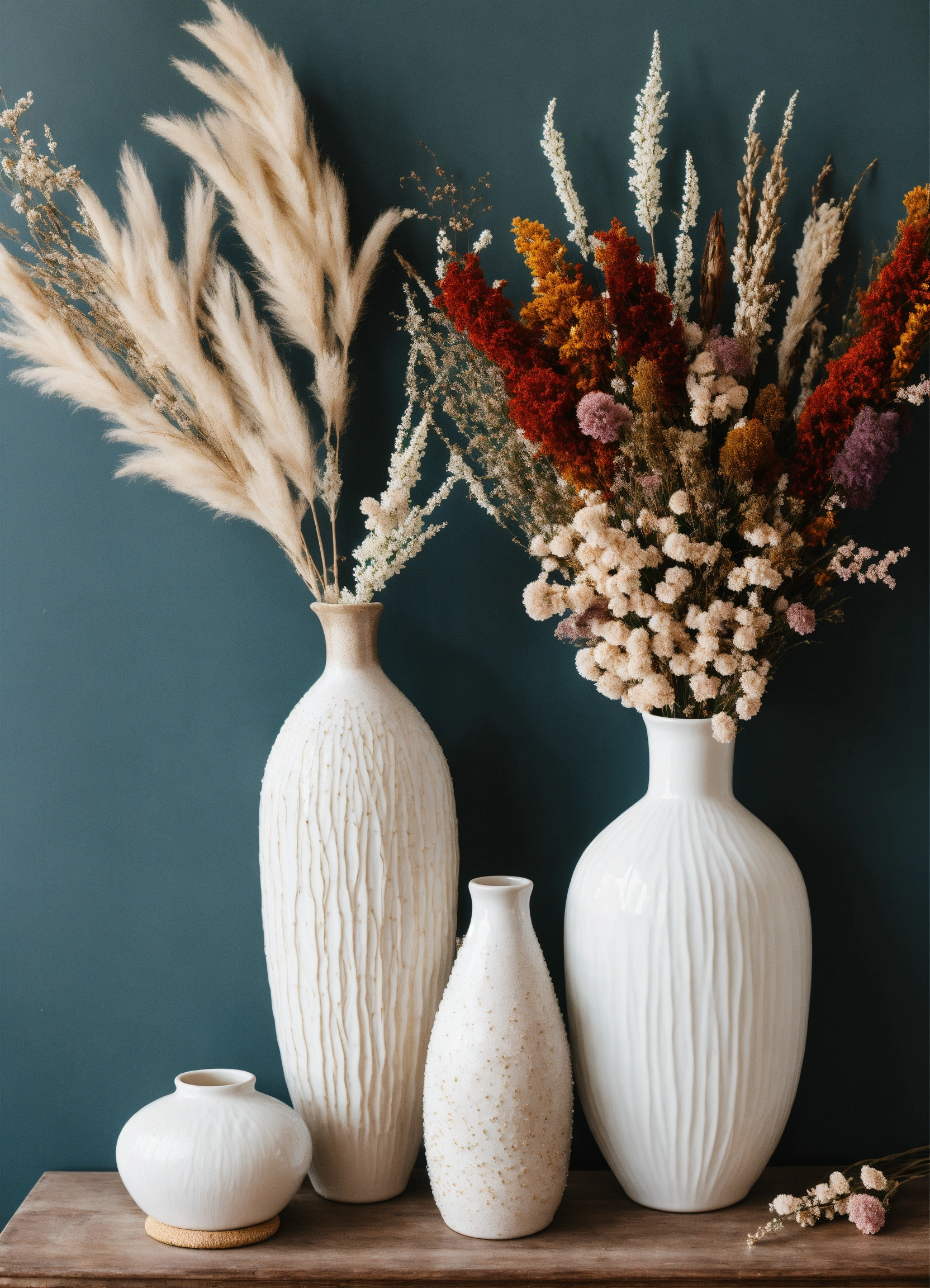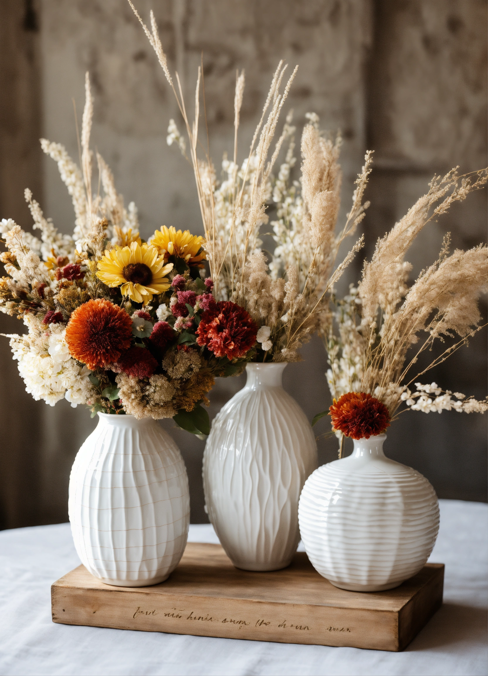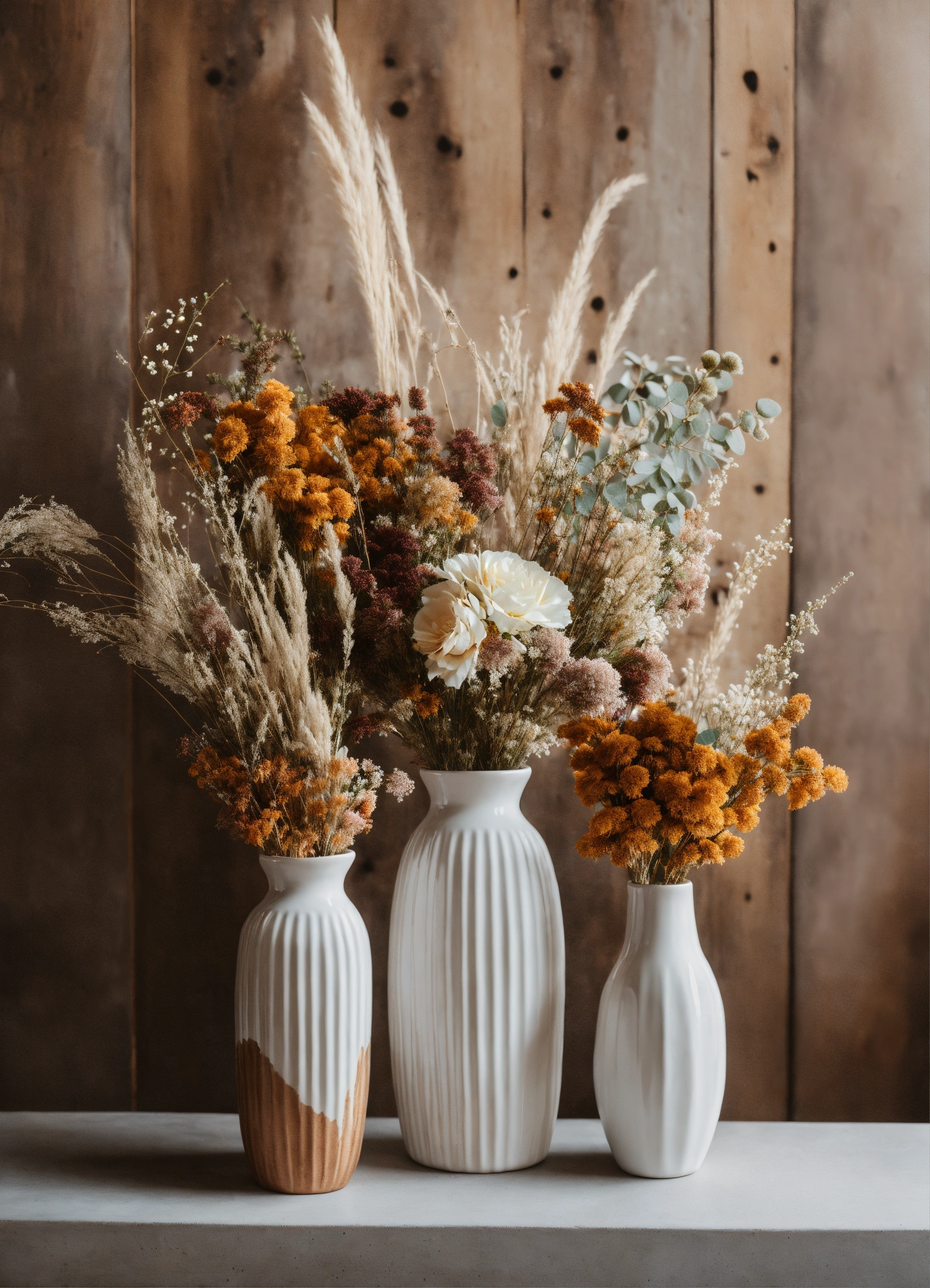 Floral arrangement with dried and fresh flowers in trio of white ceramic vases