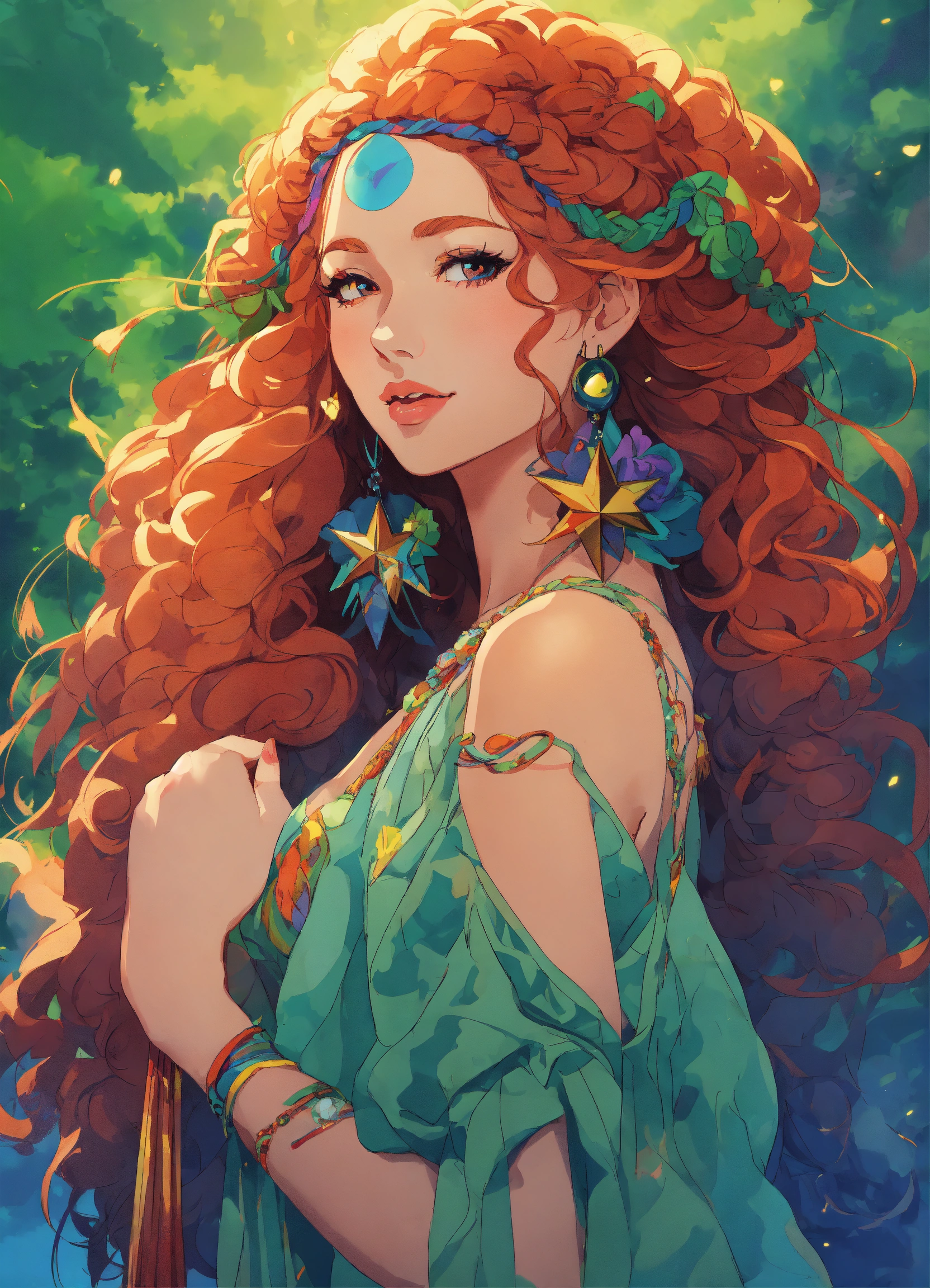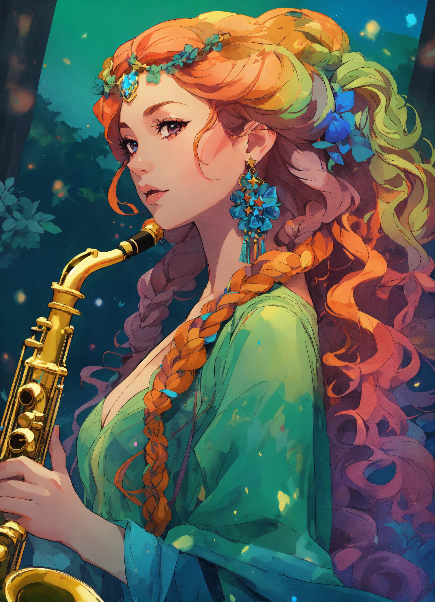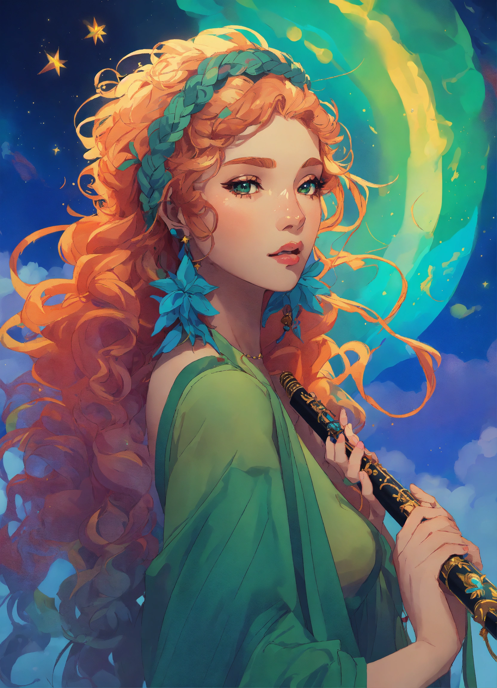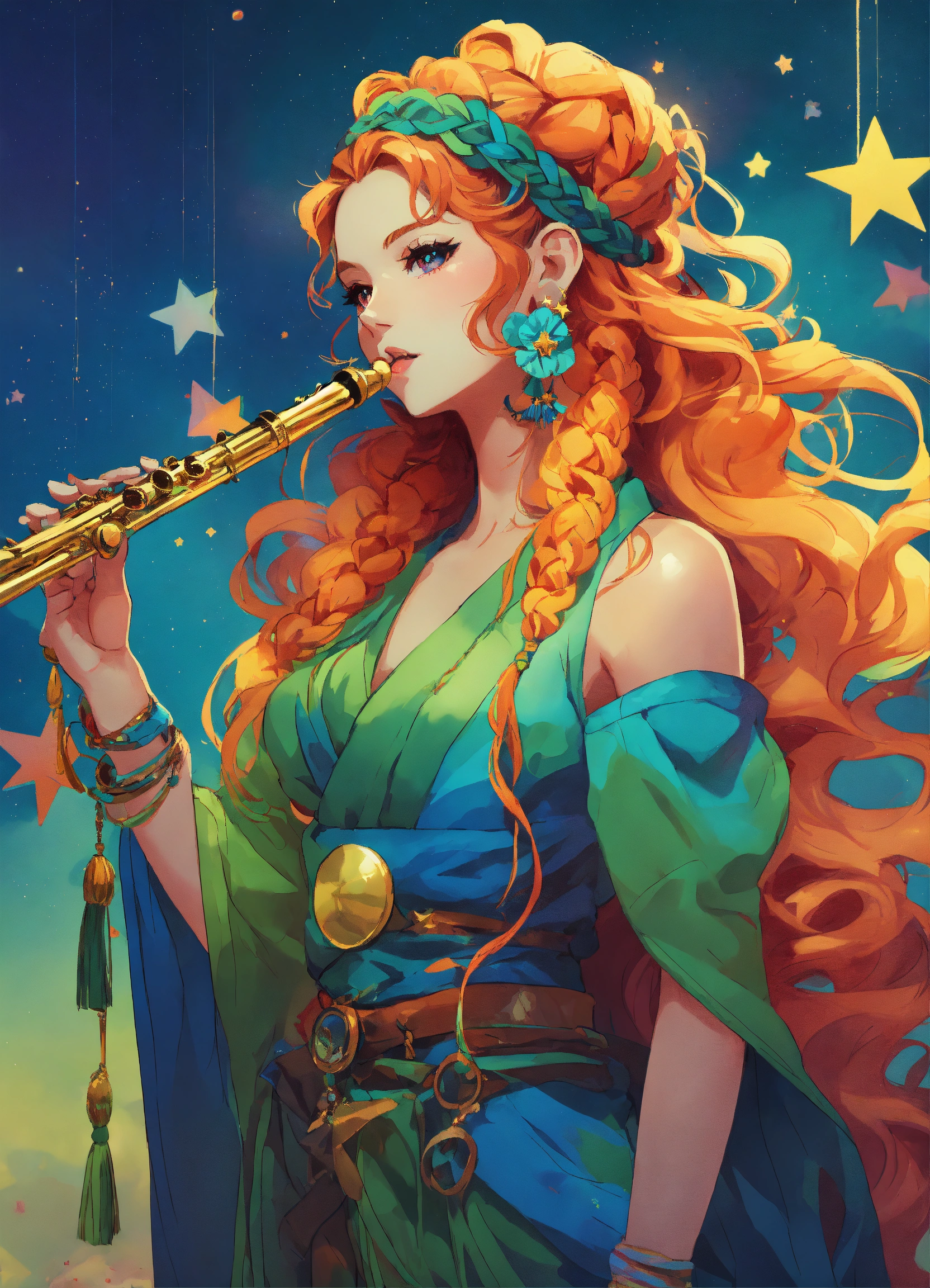 Anime female, beautiful girl, rainbow color long curly hair, braided into a french braid, black big eyes, fringed veil, wearing star tassel earrings, holding a flute, flat style, cartoon style, anime style, hovering, illustration by james jean + frank frazetta, vector art with saturated greens and blues inks, unreal engine 5 volumetric lighting