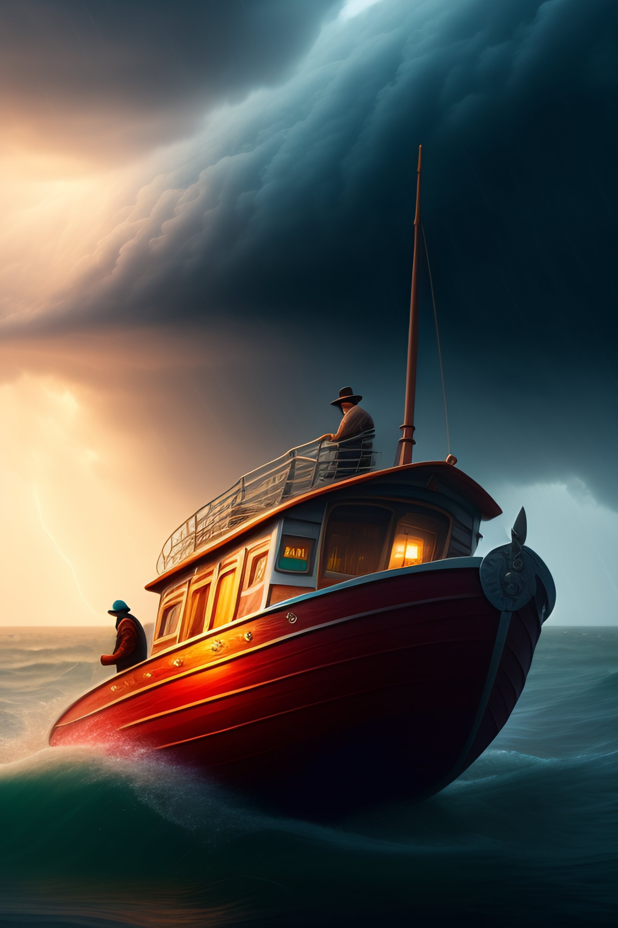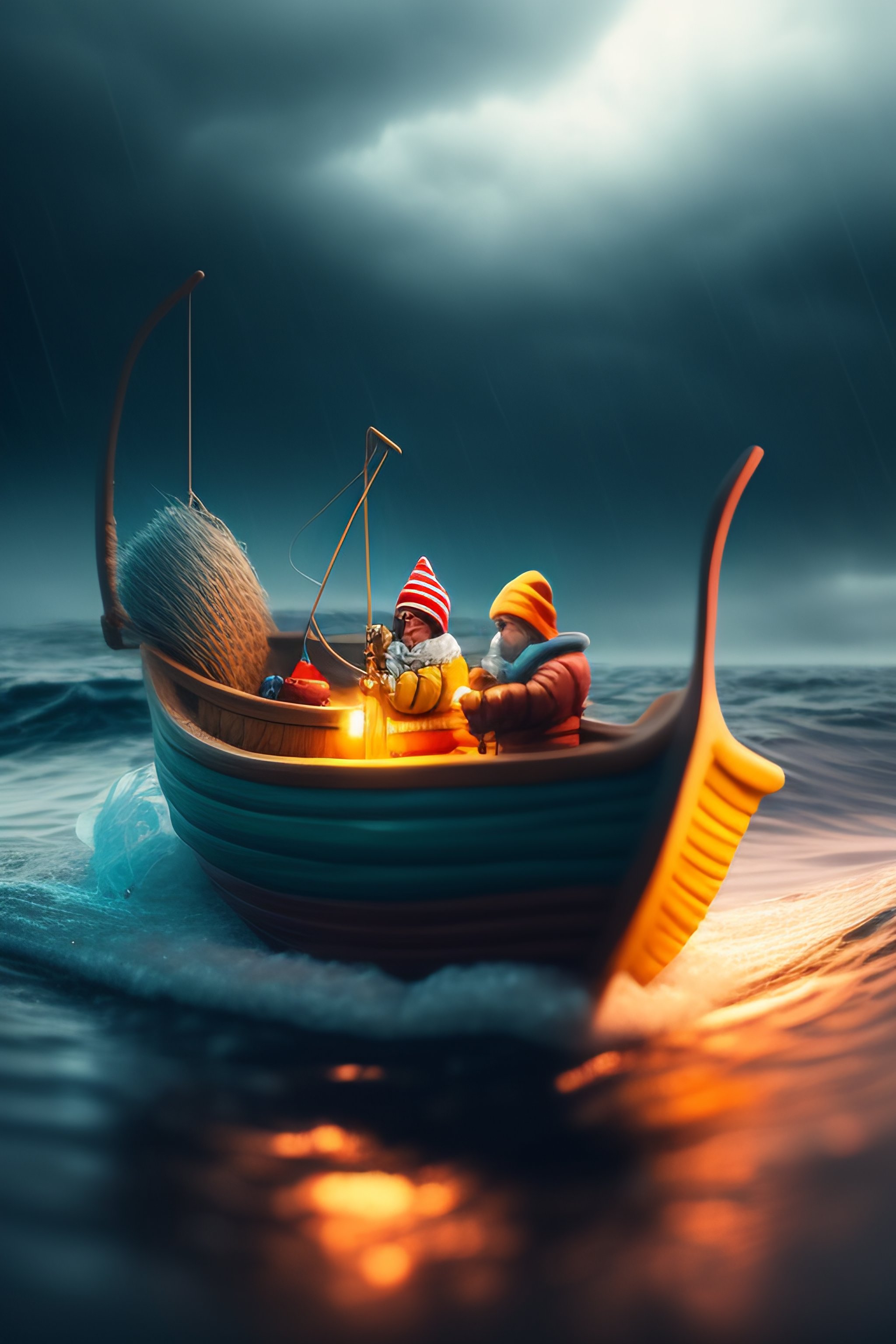 Fishermen inside a small boat in a big storm scared, style, 3d rhea cards, fantasy, dreamlike, surrealism, super cute, trend in artstation, 4k