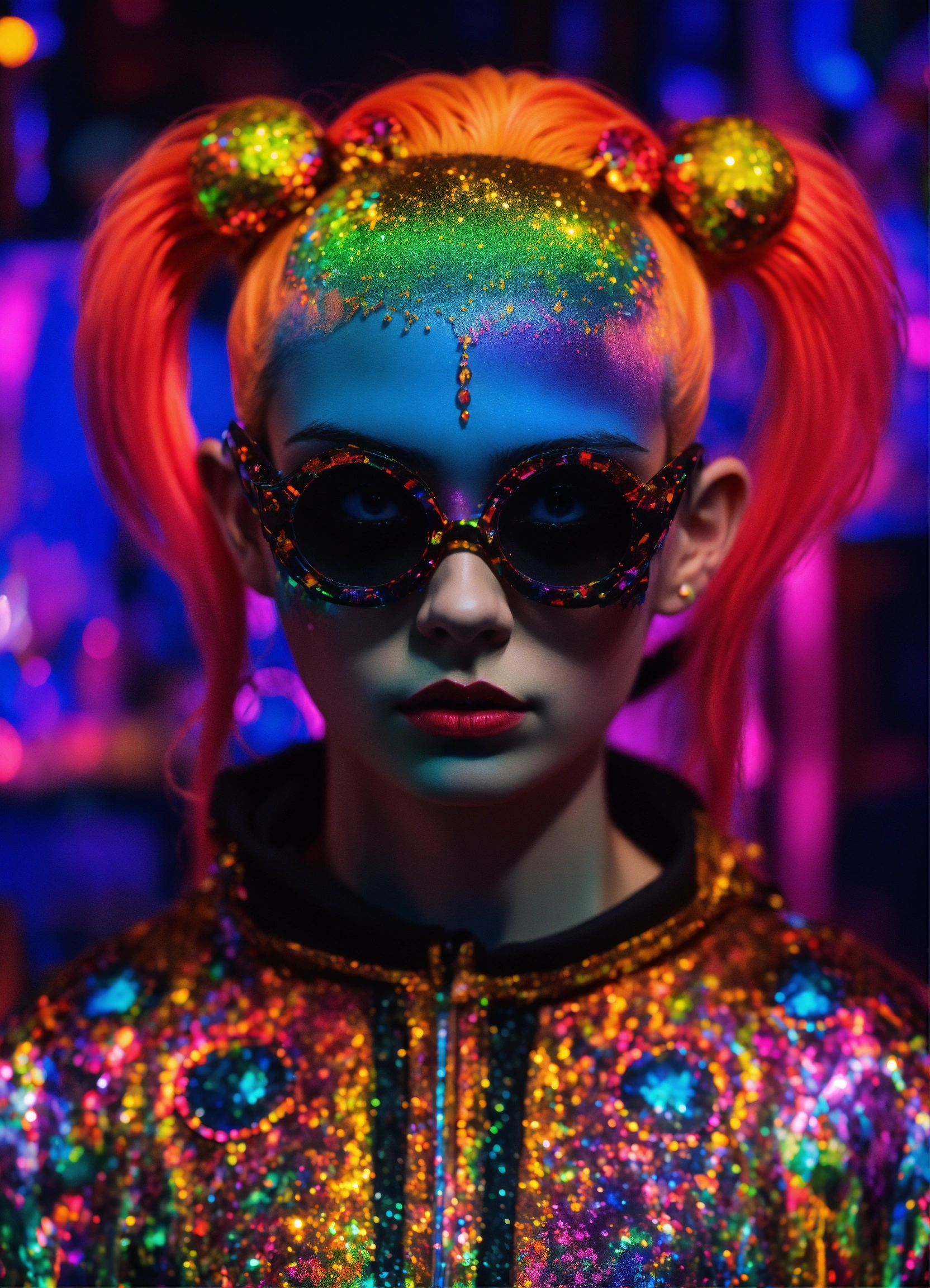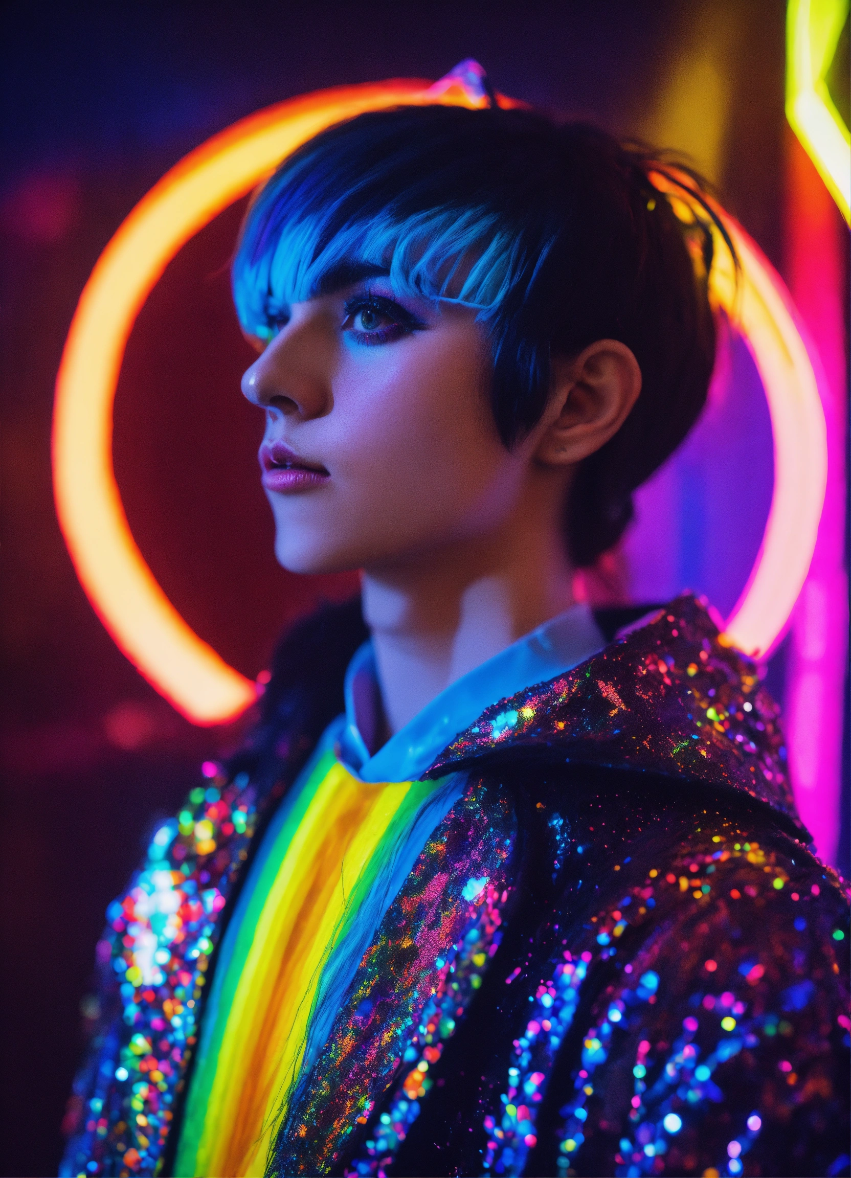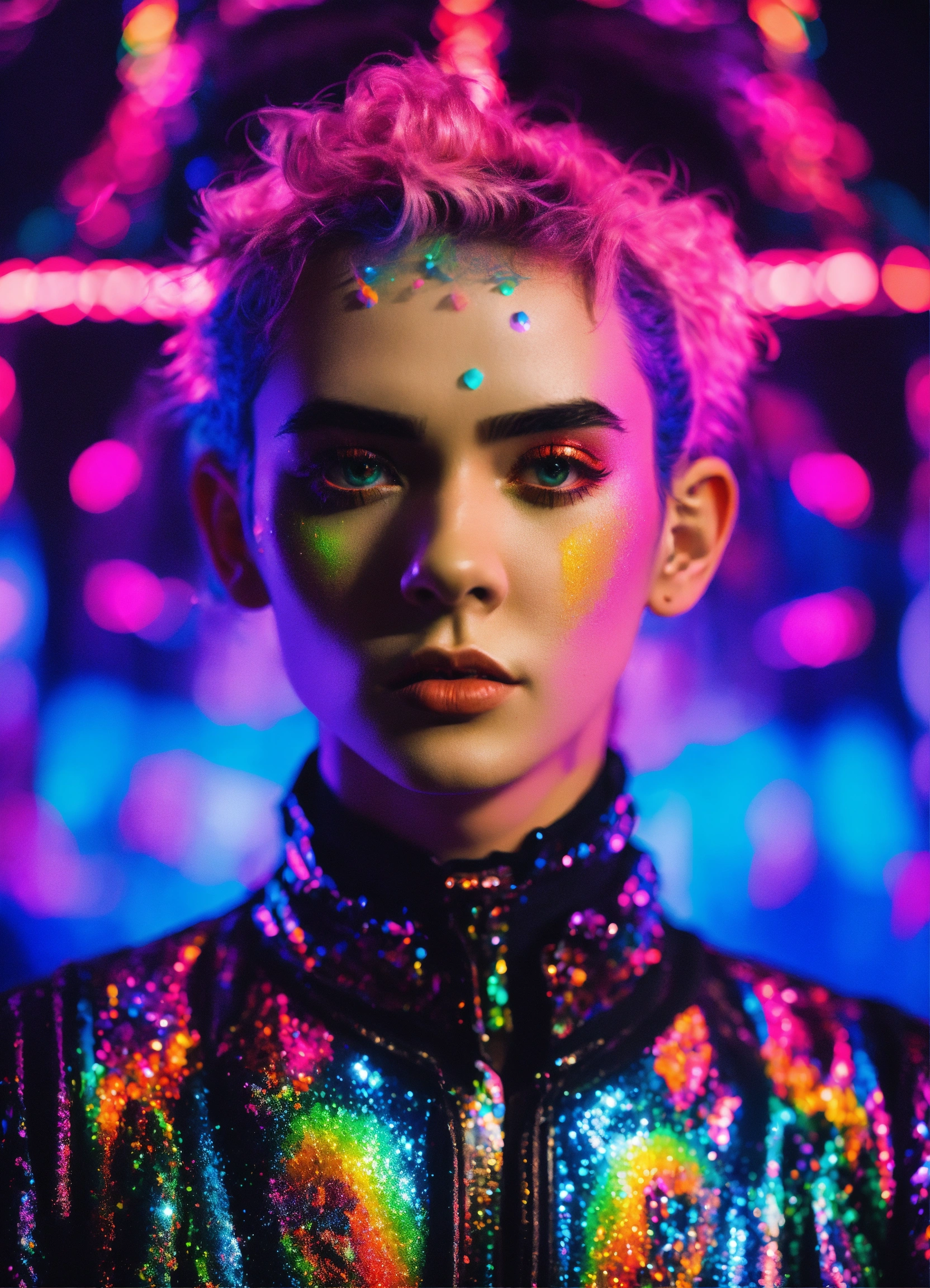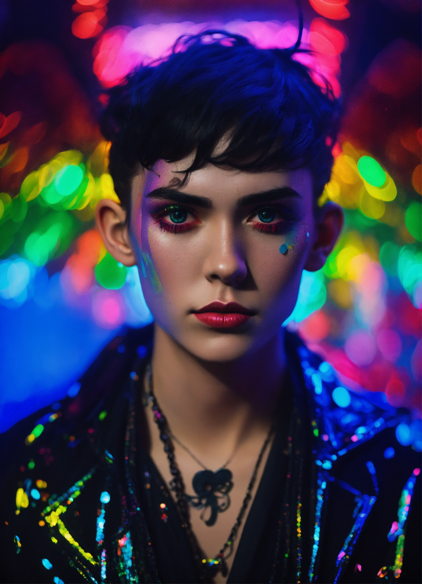 Photorealistic 3d full body portrait of gorgeous goth emo boy grimes angel kawaii punk rock anime haute couture costume, of cosmic alex grey painting in a dmt black light glitter neon black rainbow glitter holographic paris fashion night 70mm film, art by salvador dali and holy mountain the movie.