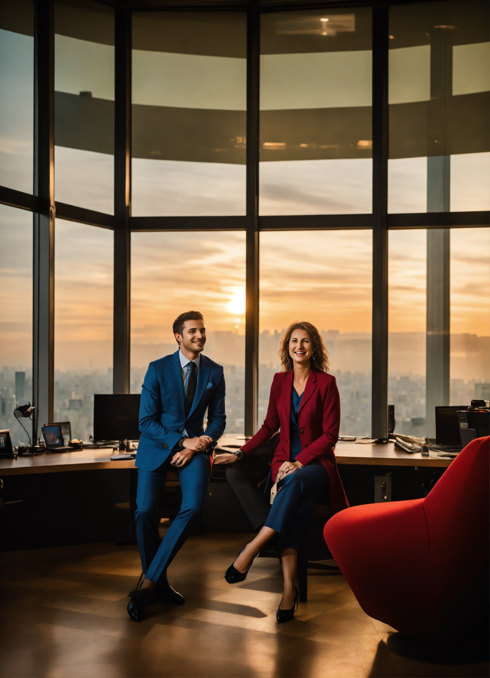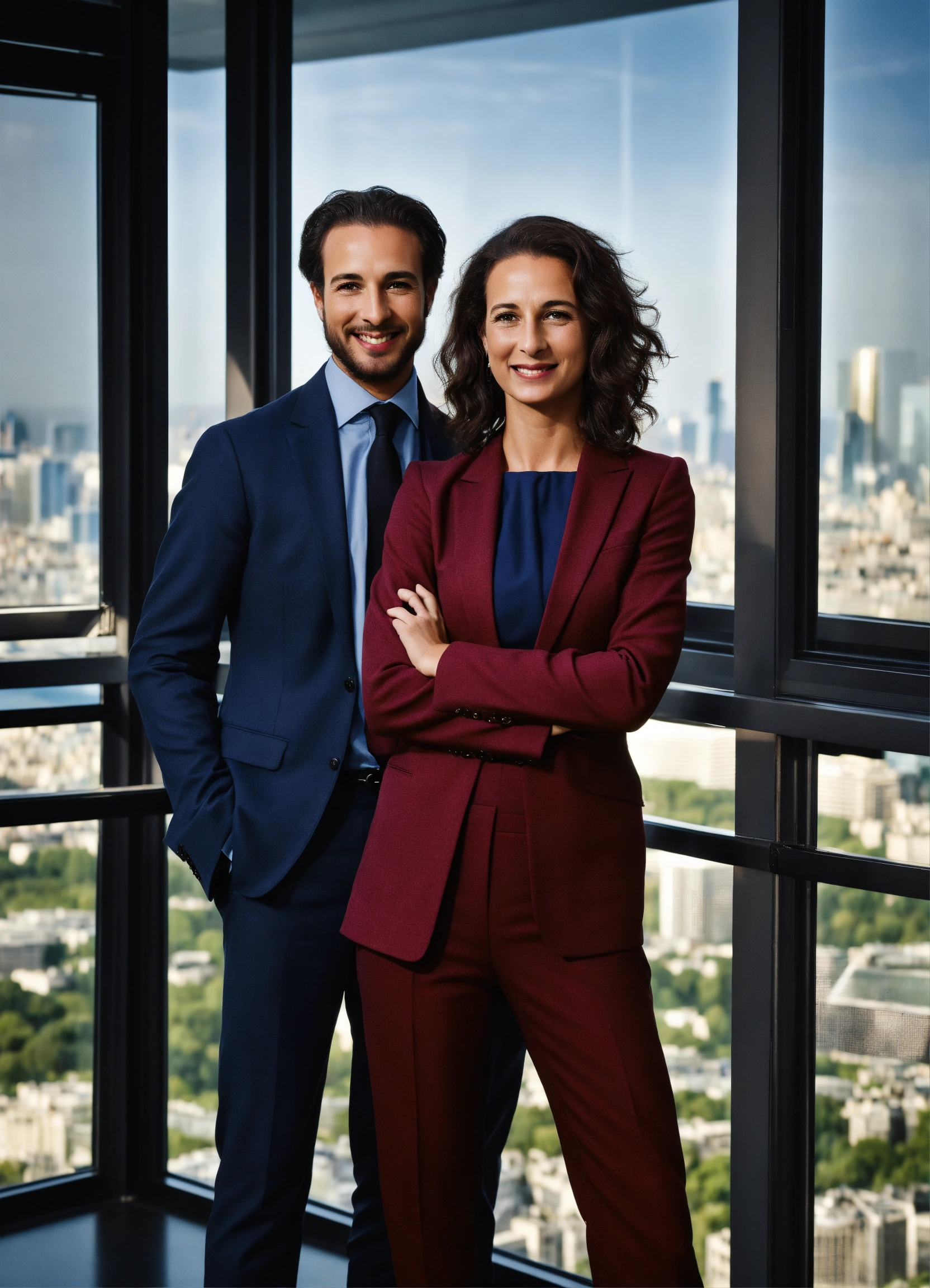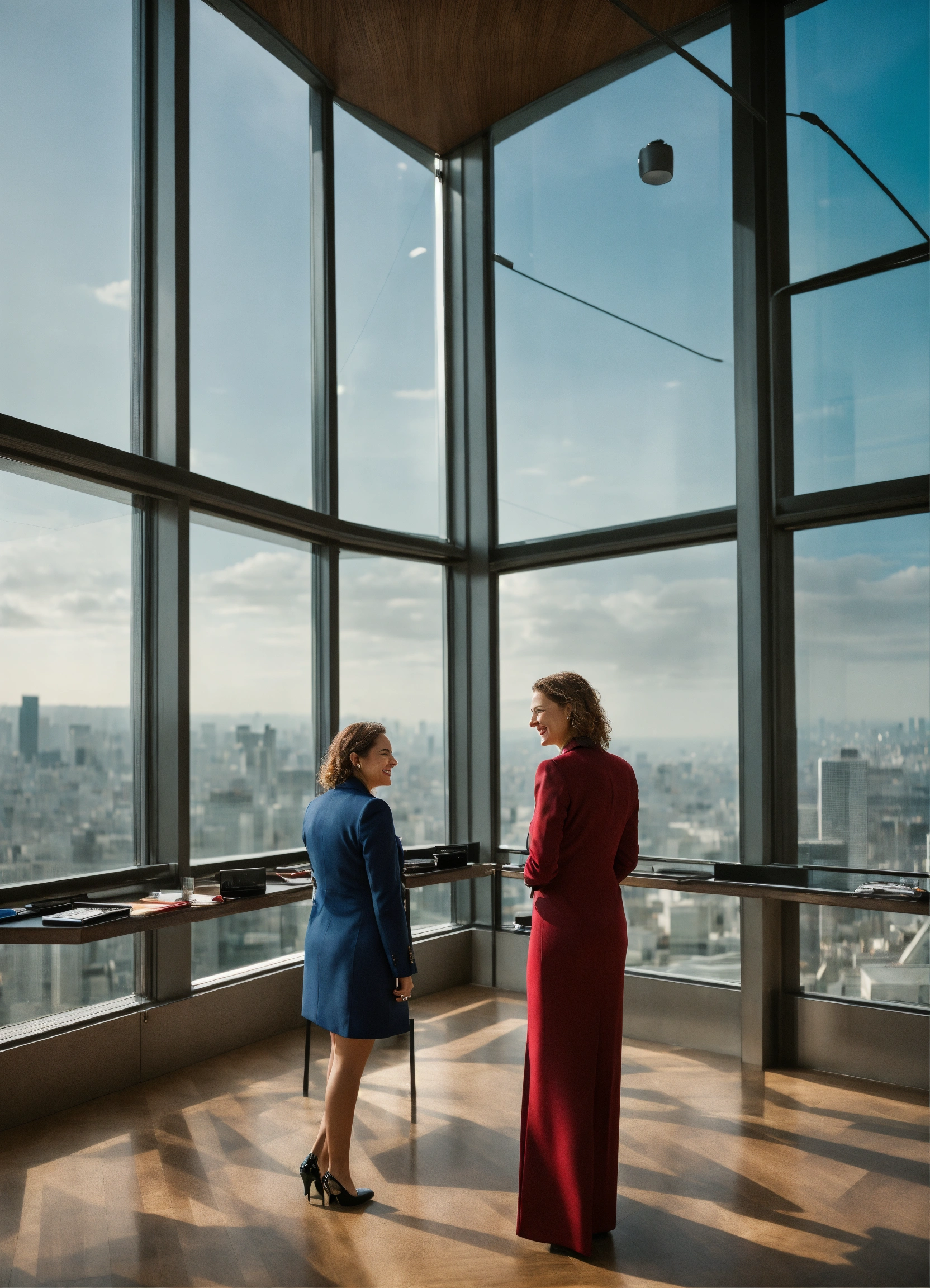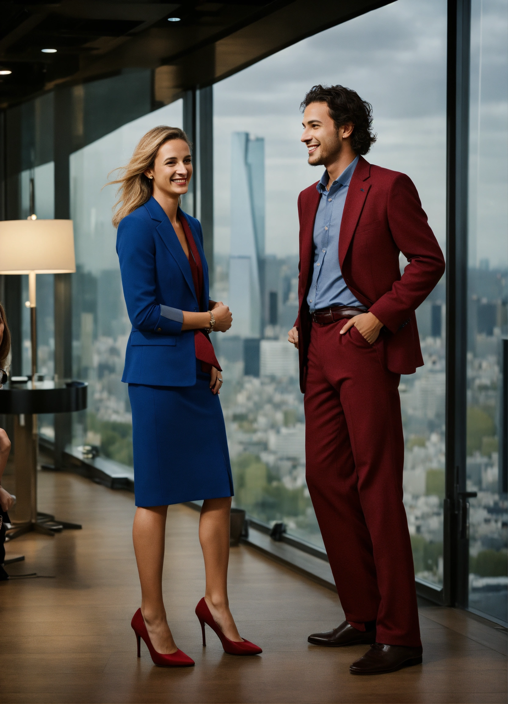 Create a 169 wide-angle, hdr, 4k resolution image that encapsulates the essence of annie leibovitz' photography style. the setting is in a creativity room, in france at la défense with expansive windows offering a panoramic view of the city. the atmosphere should be, bright, and modern. two persons speaking together, one convinced woman in her thirties she is dressed in blue business woman dress, she is logical and organised speaking with one man in his twenties, he is dressed in a causal dark red suit decontract and smiling.