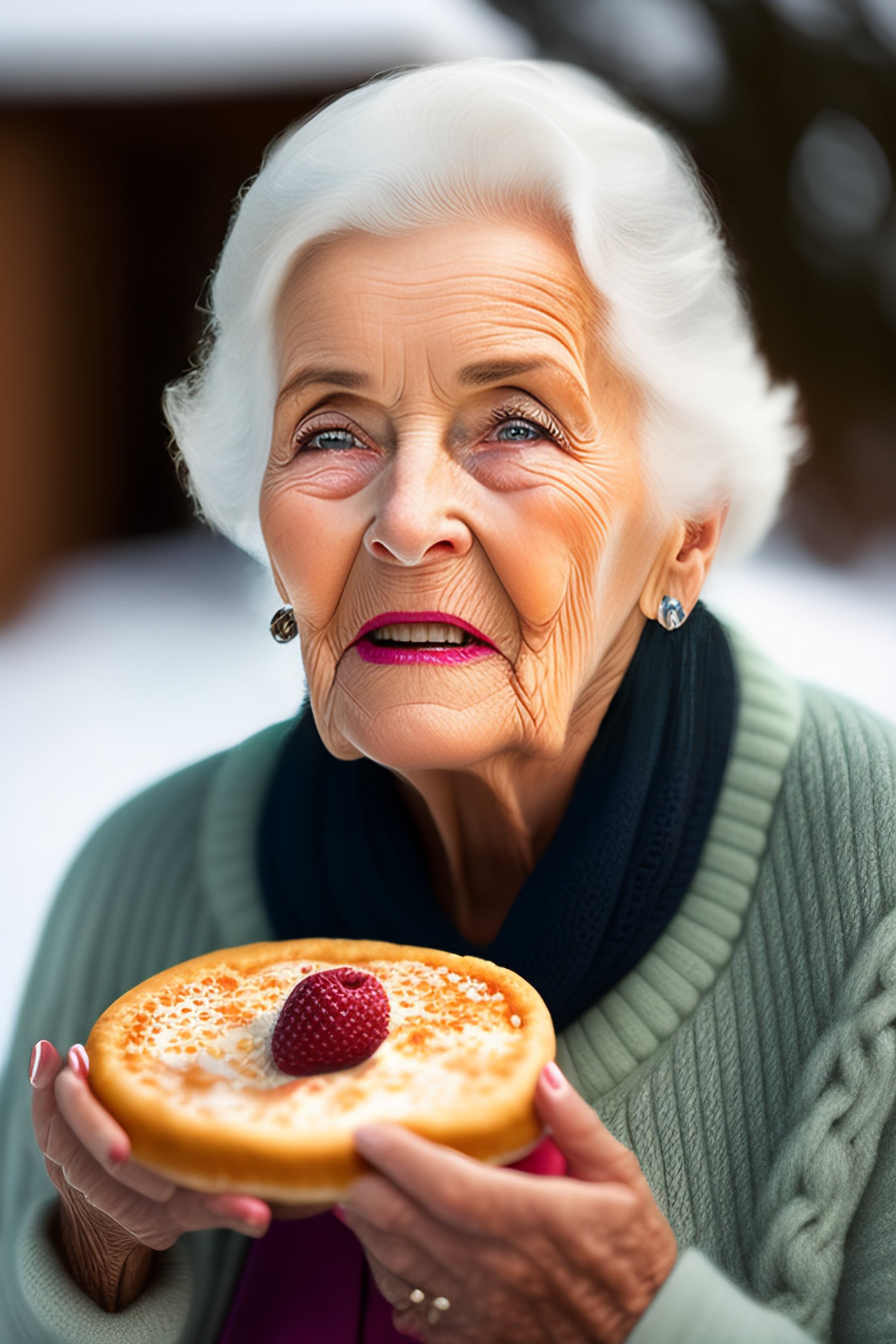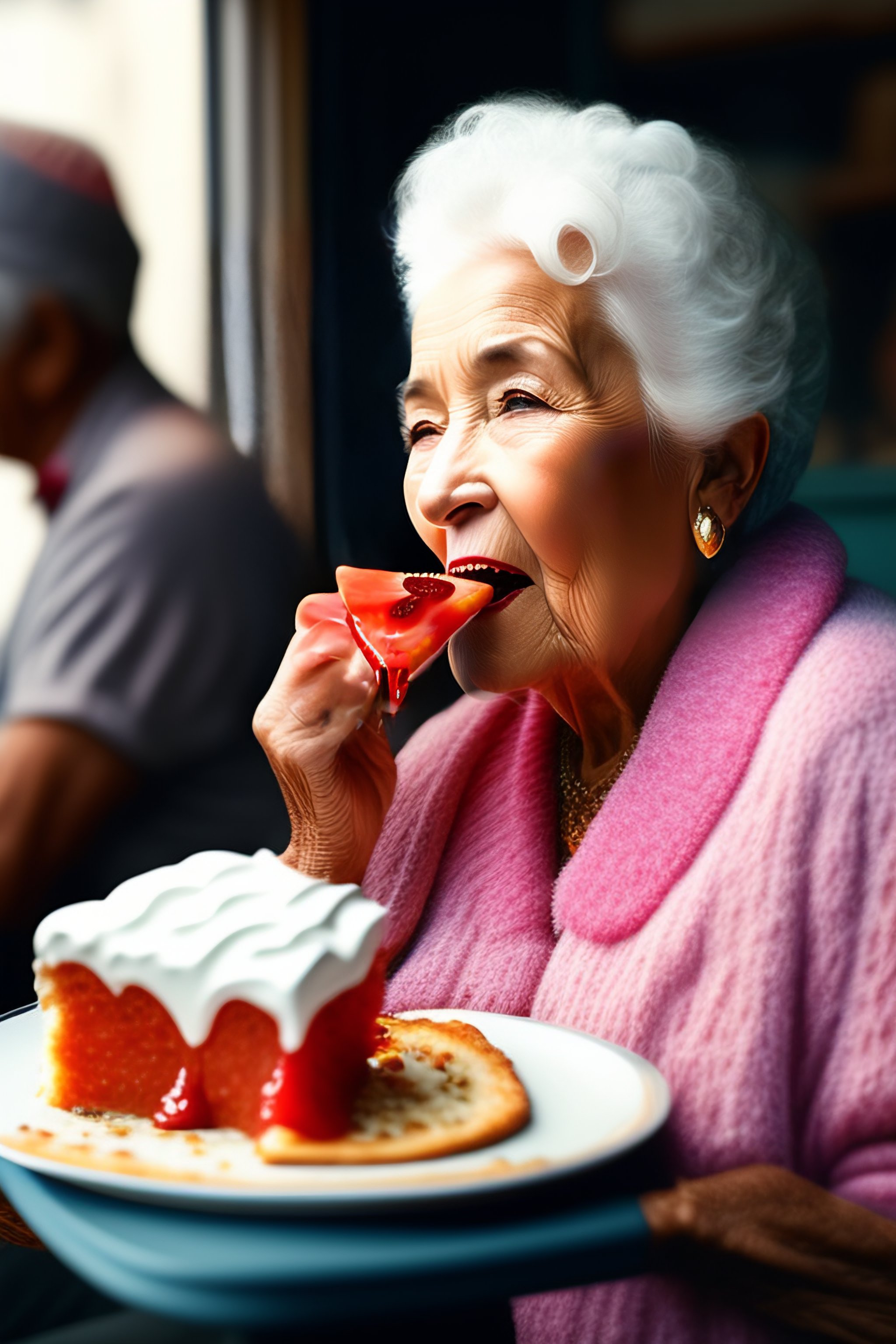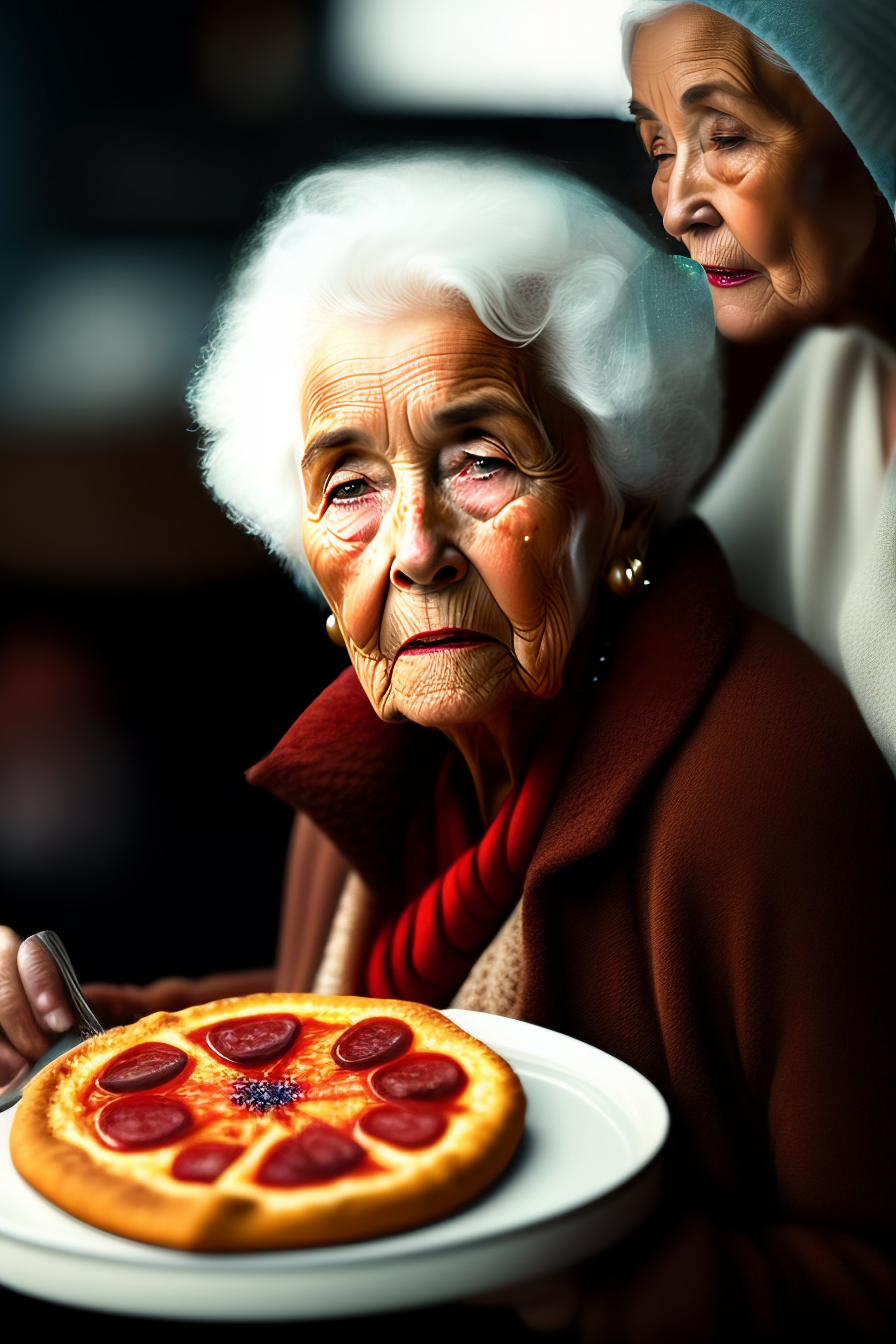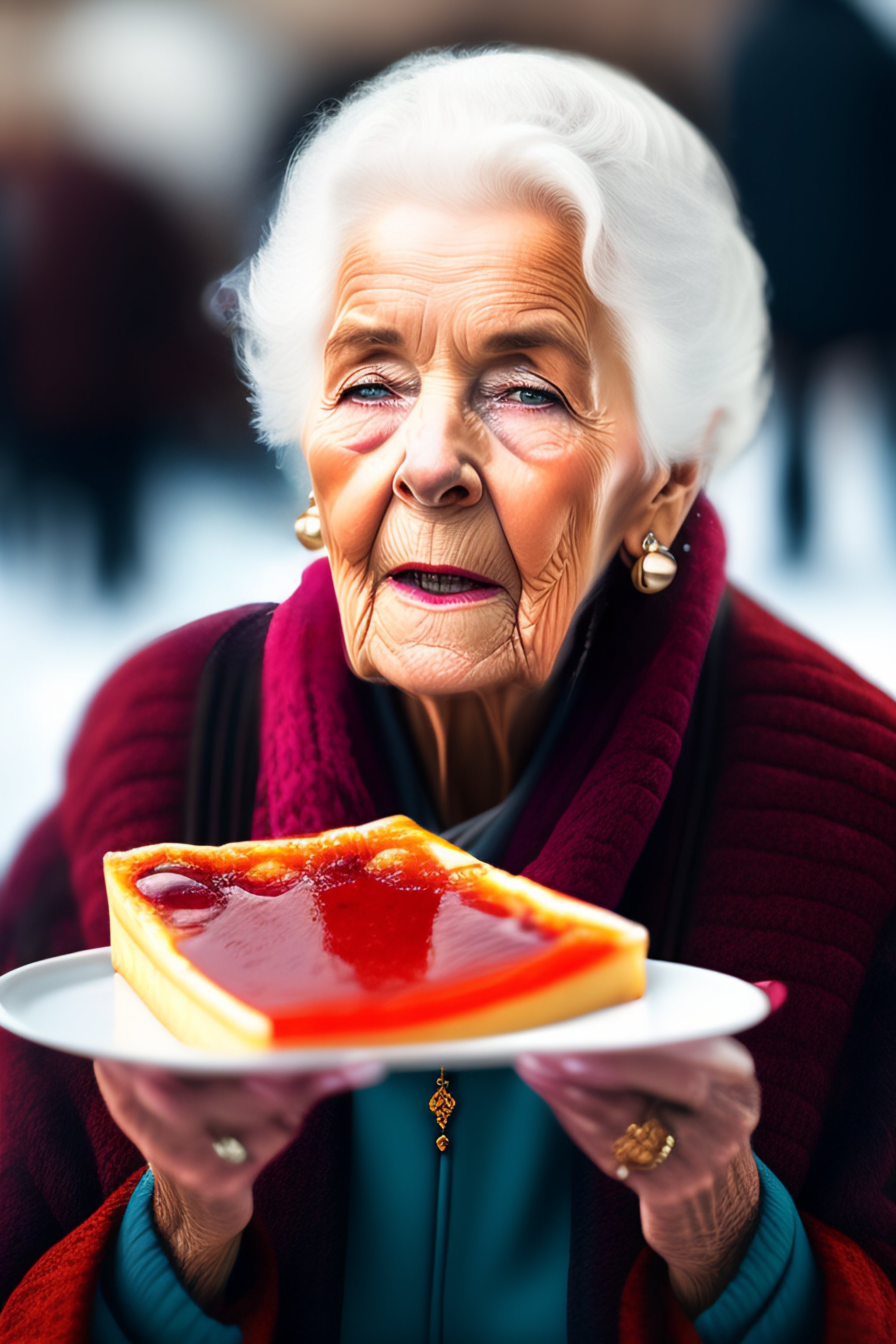 Old lady eating an ice pizza