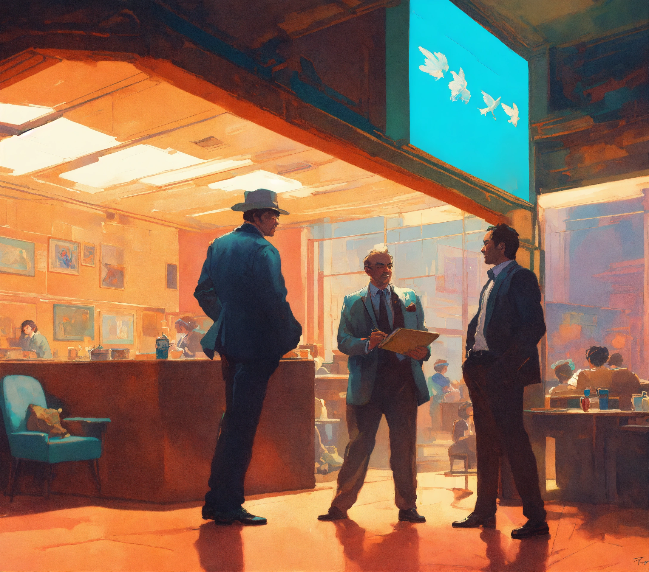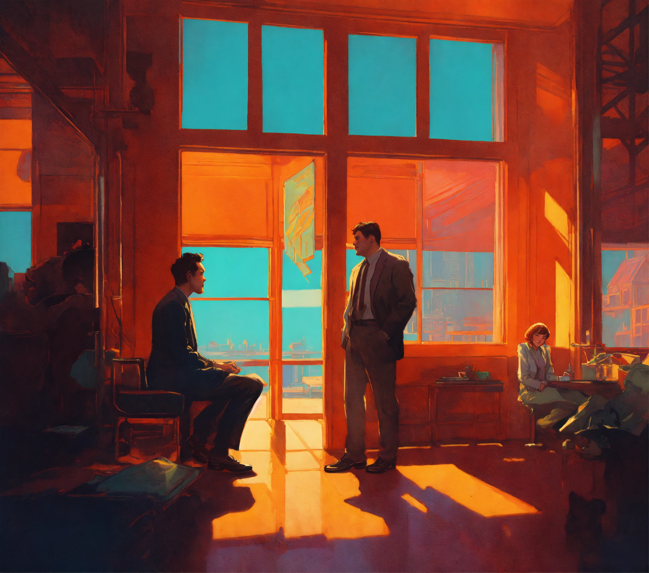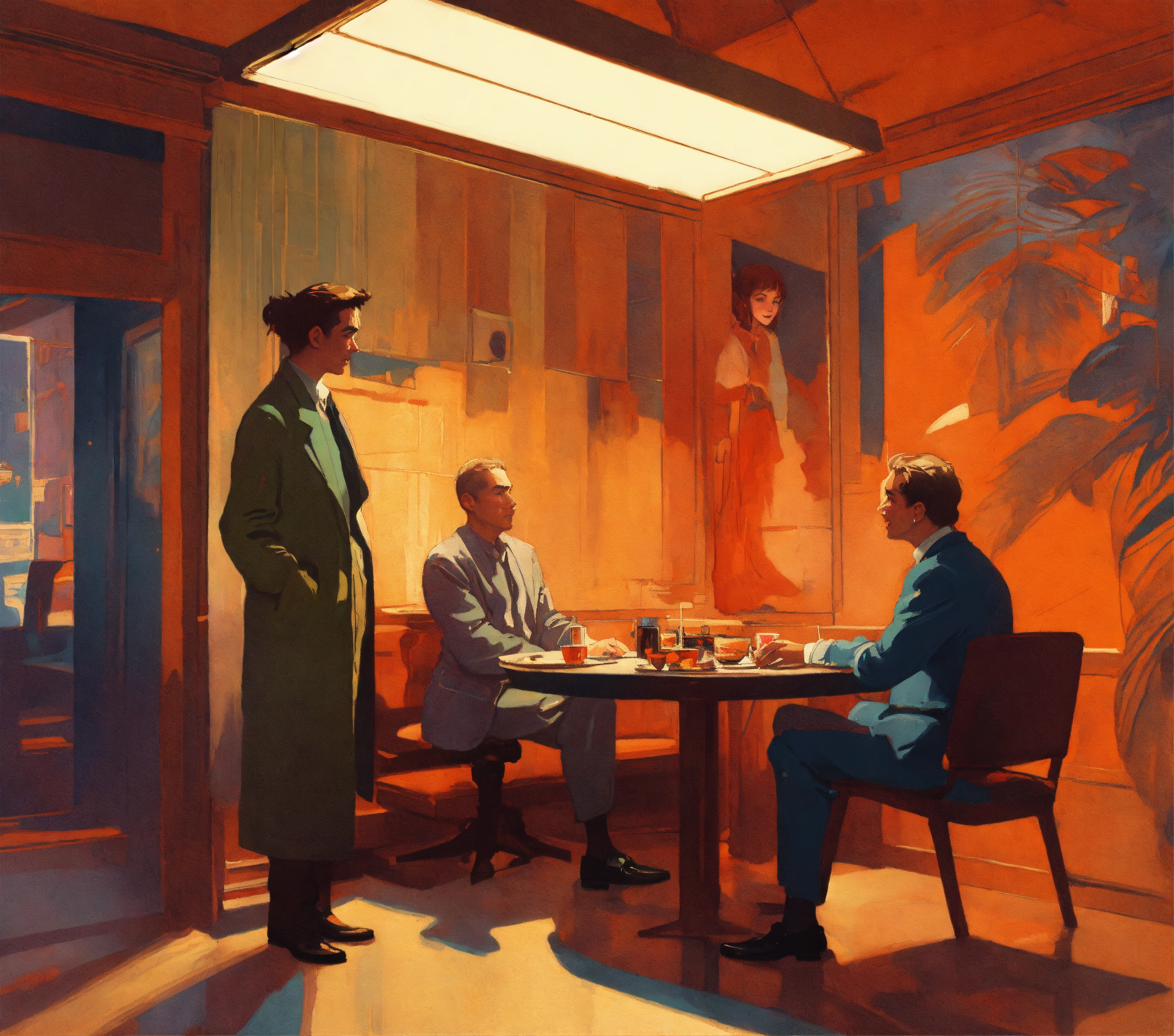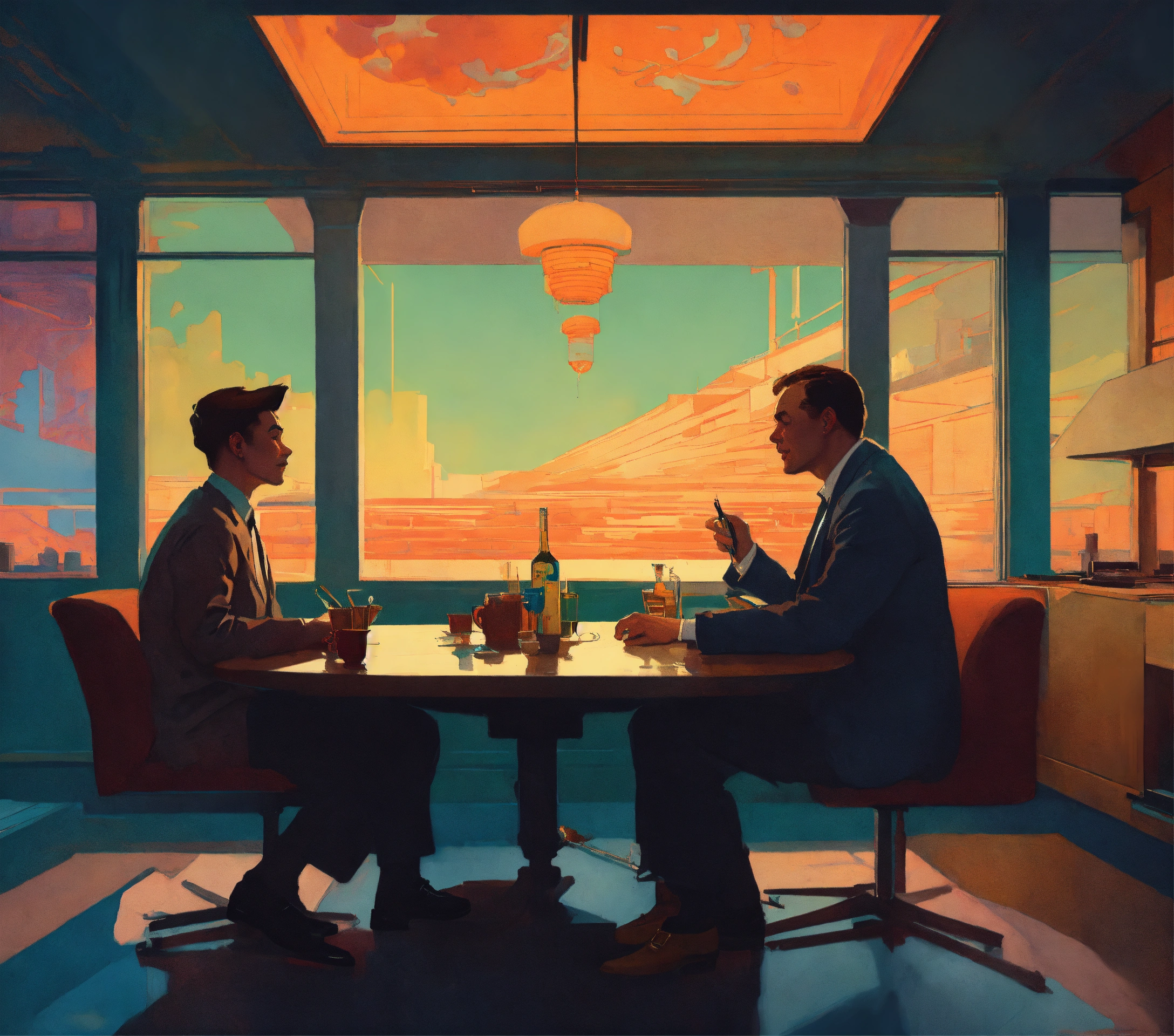 Two people making a deal happy in the style of francis bacon and syd mead and edward hopper and norman rockwell and beksinski, open ceiling, highly detailed, painted by francis bacon, painted by james gilleard, surrealism, airbrush, ilya kuvshinov, wlop, stanley artgerm, very coherent, art by takato yamamoto and james jean