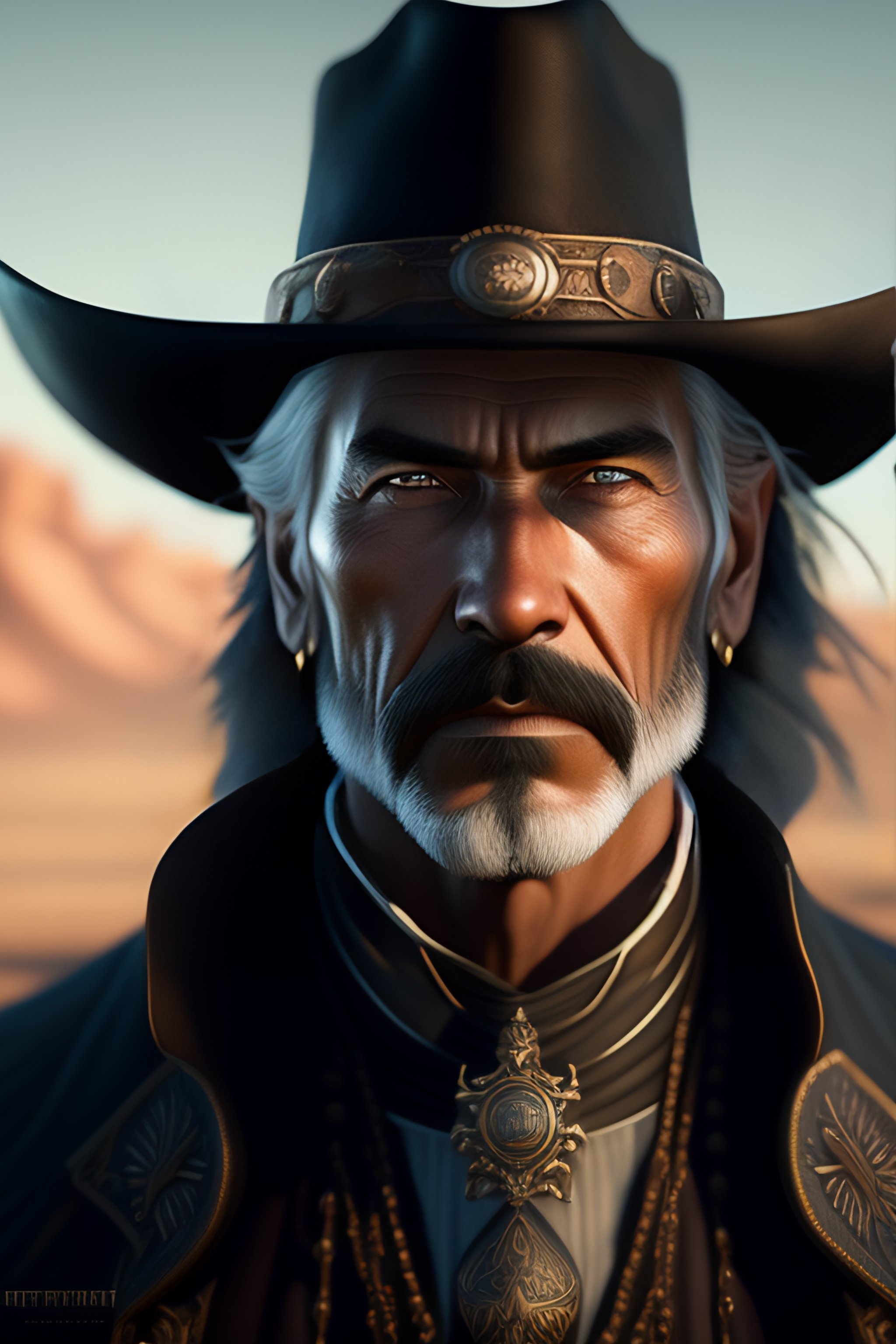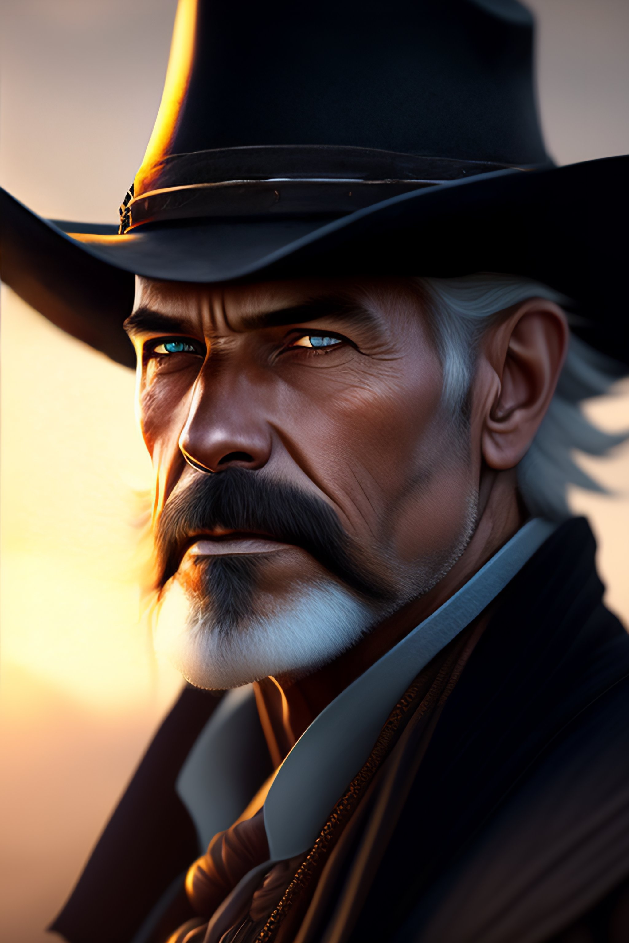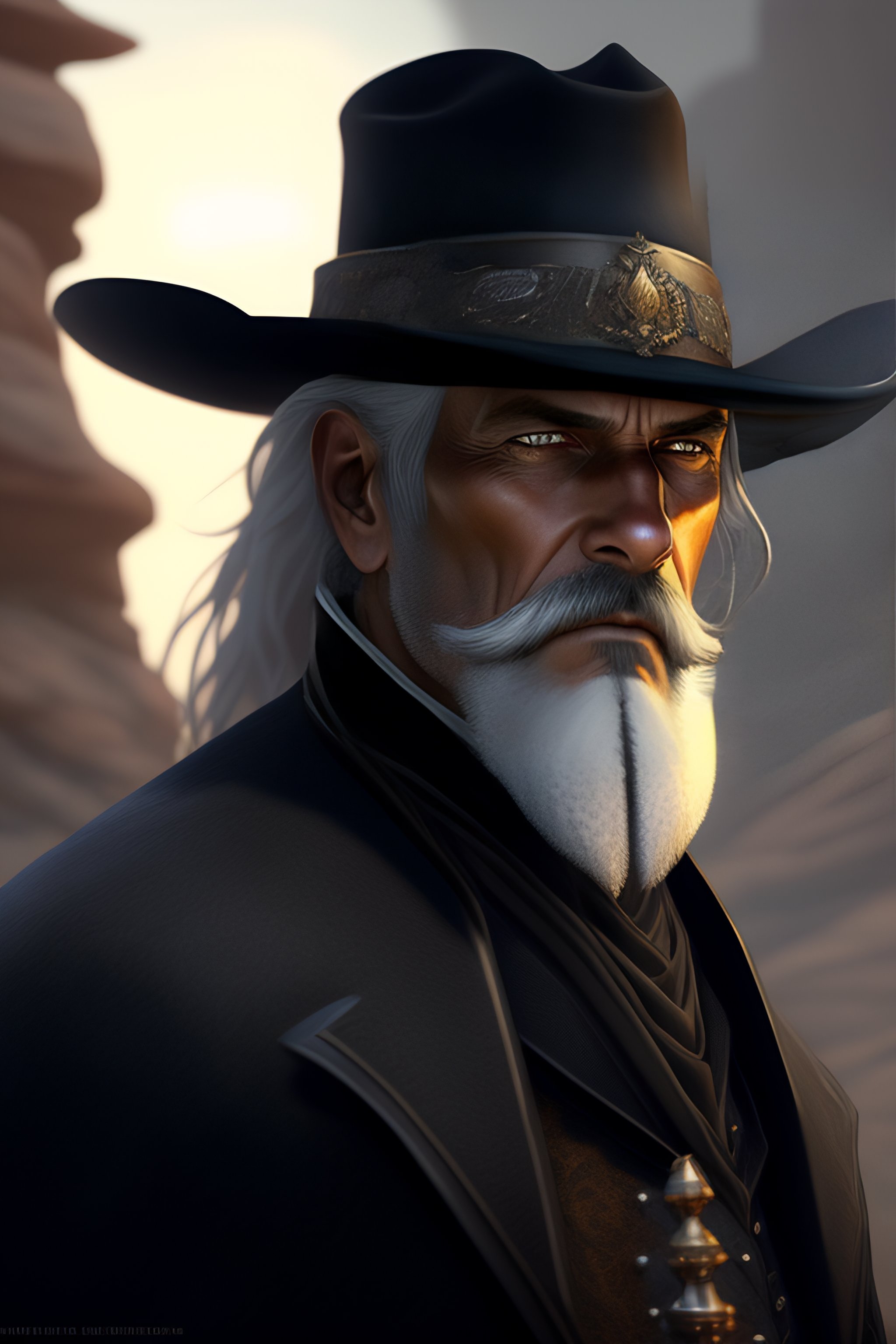 Wild west portrait of a undertaker old man in black duster with a goatee anime high quality, detailed, dark colors palette, intricate, realistic cartoon, head and shoulders portrait, 8k resolution concept art portrait by greg rutkowski, artgerm, wlop, alphonse mucha dynamic lighting hyperdetailed intricately detailed splash art trending on artstation volumetric lighting