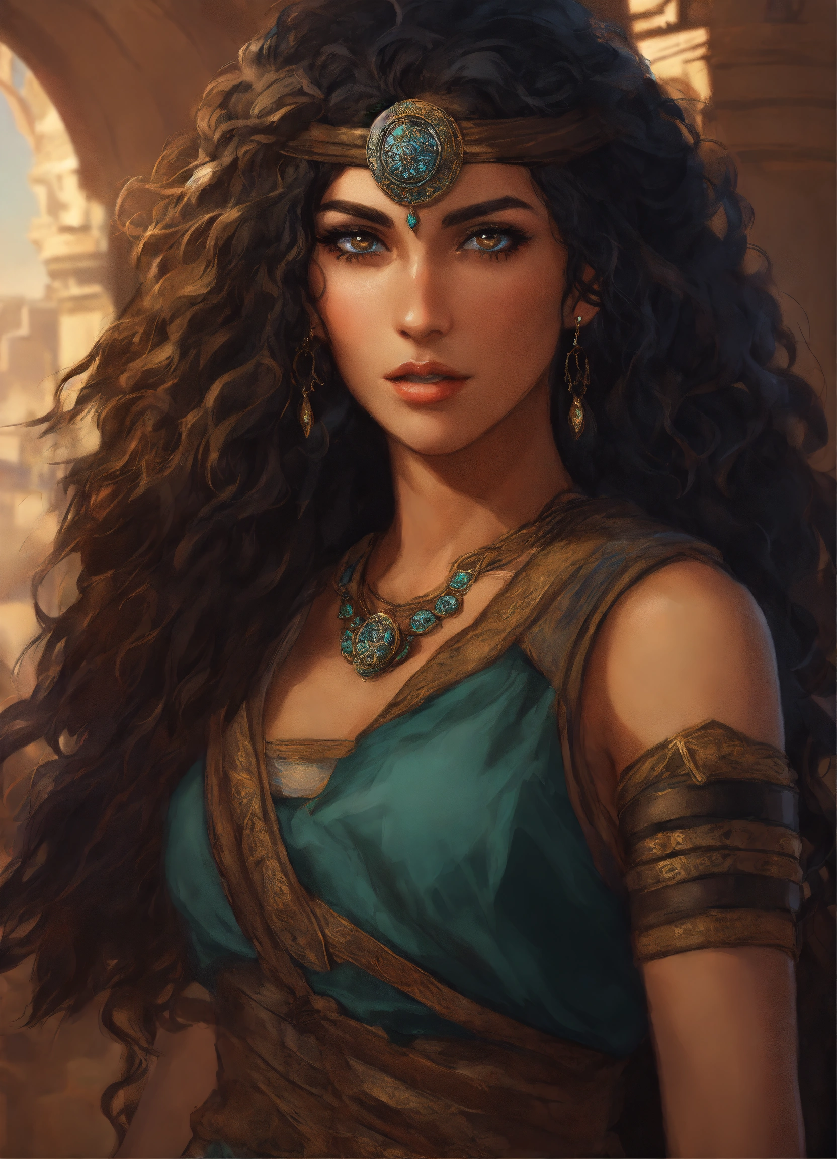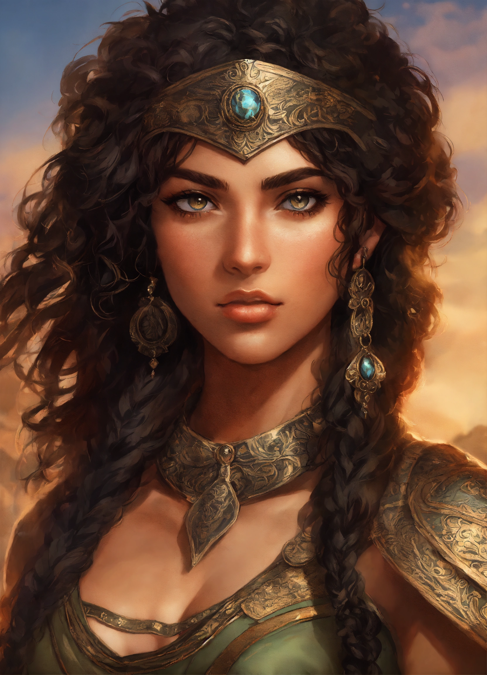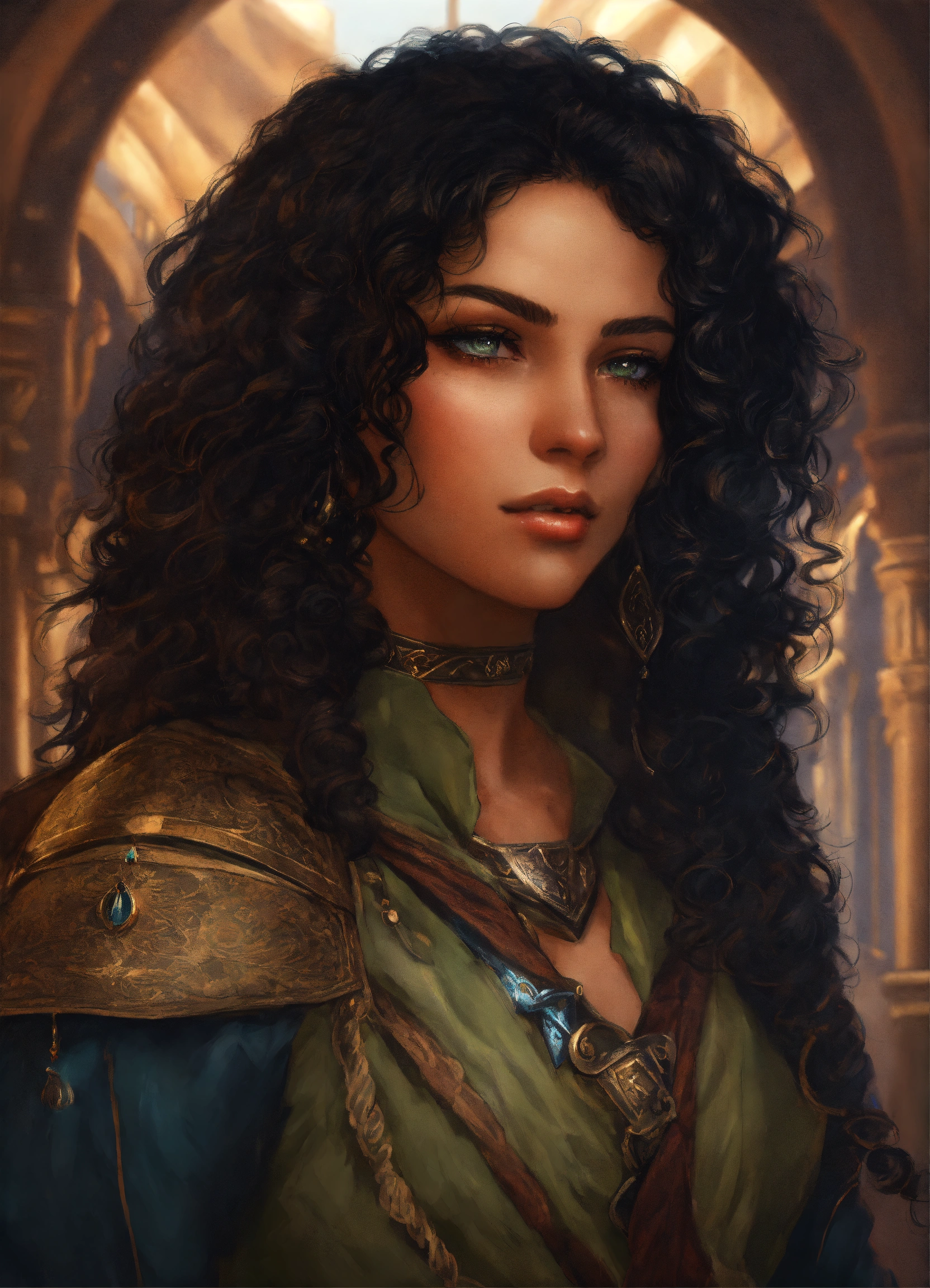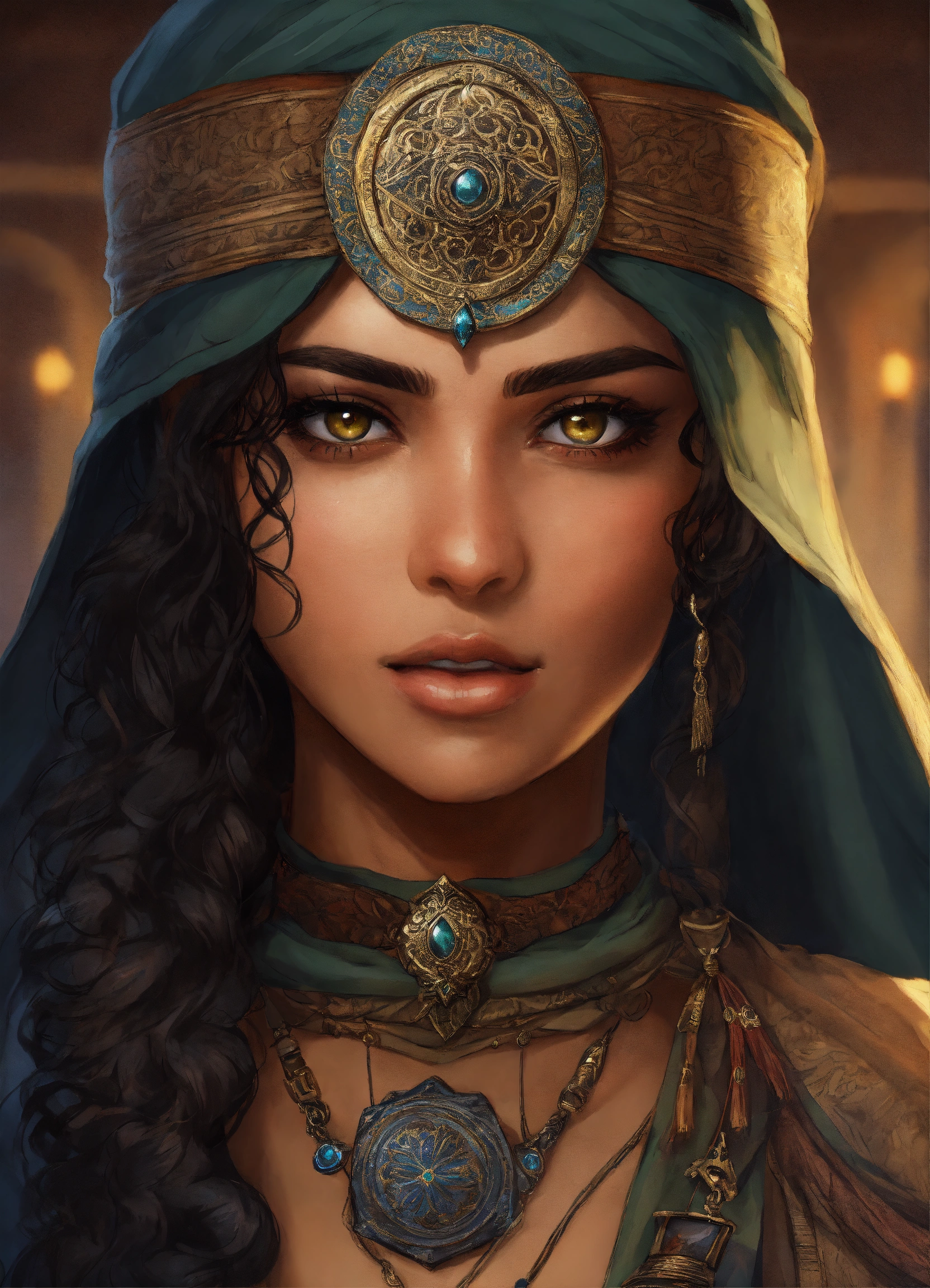 "heroic middle eastern female fantasy rogue", curly black hair, travel clothes, head and shoulders portrait, intricately detailed eyes