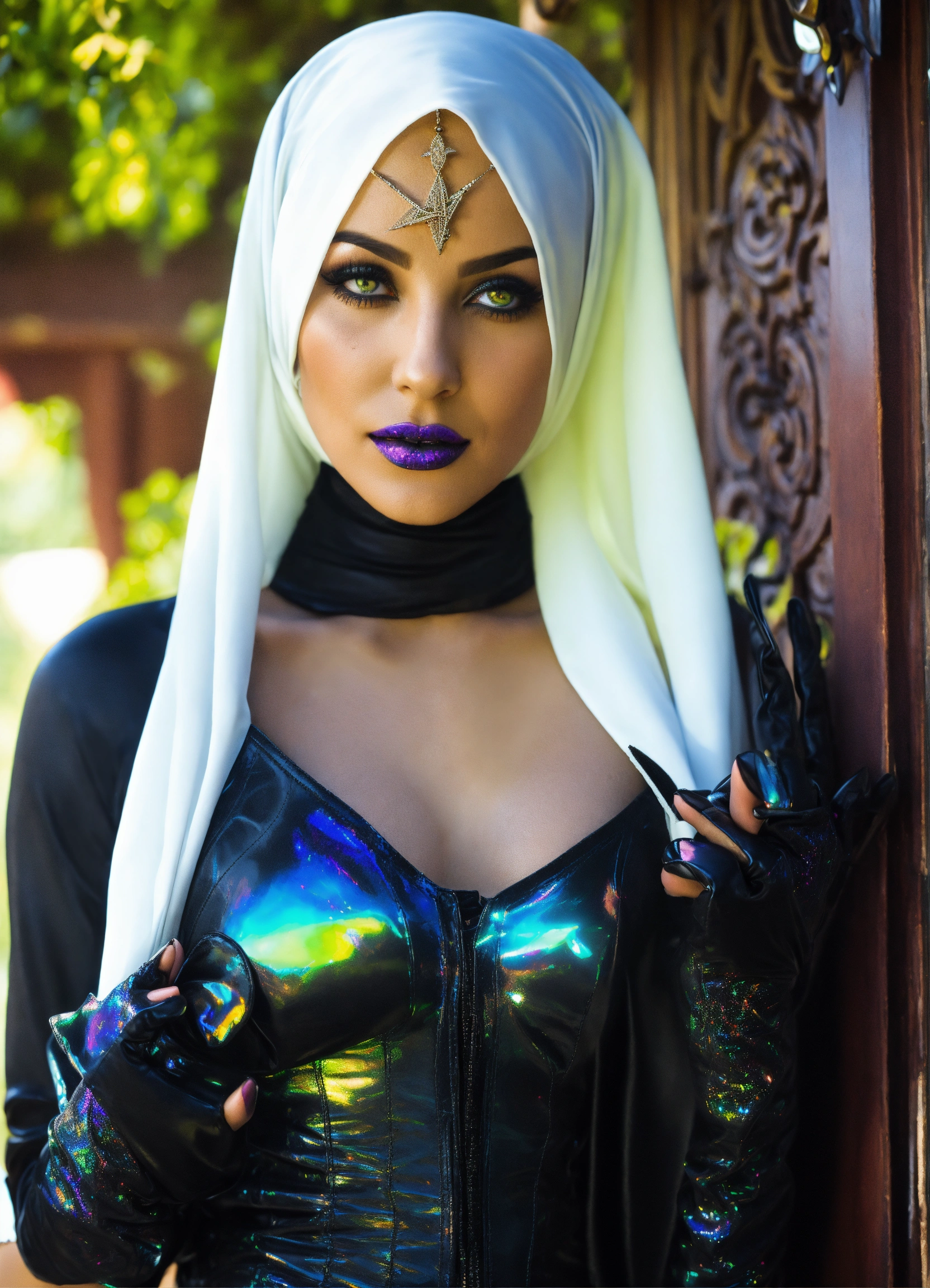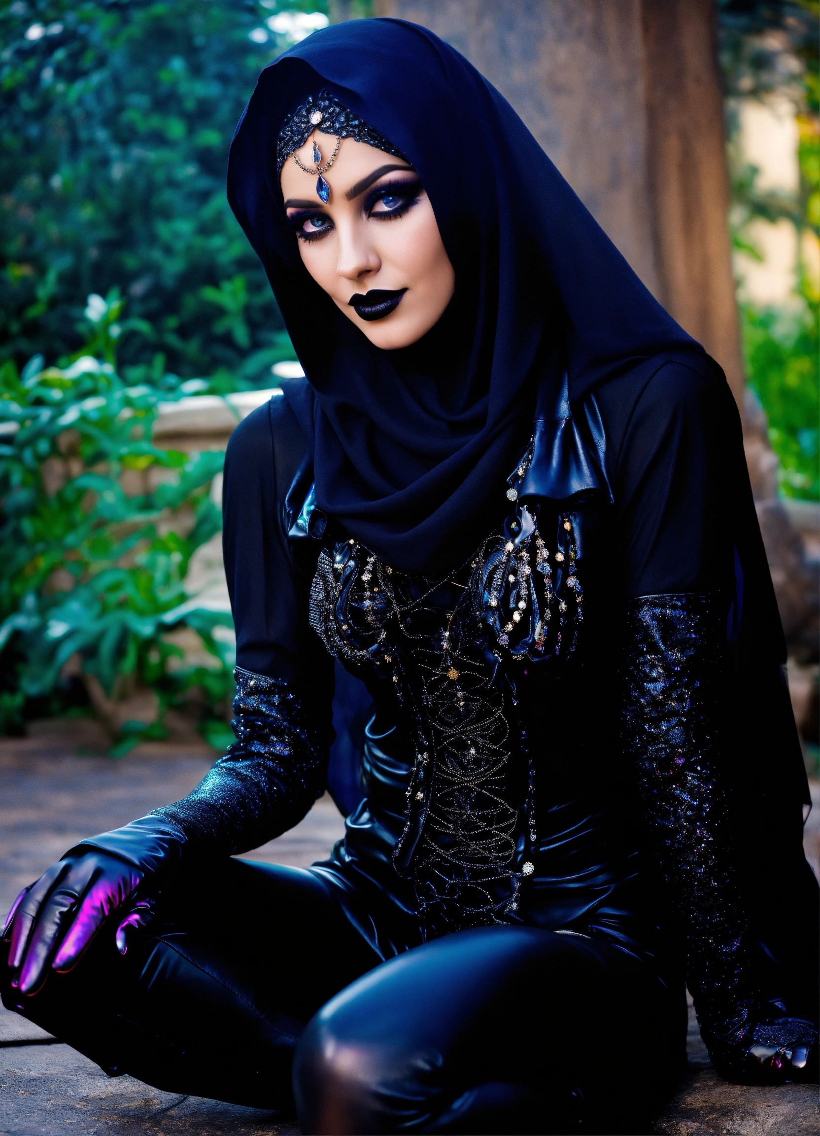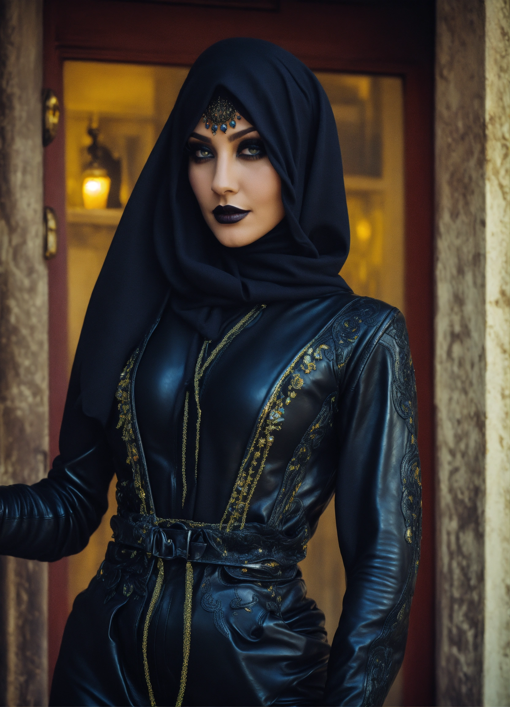 Evil occult satanic goth hypnotic arabian sorceress with doom gaze veiled eyes, extremely powerful hypnotic eyes wearing "black holographic leather veiled "skin tight" hijab" & "black leather high heeled boots" & "black holographic leather gloves" & "skin tight short shorts", at my front porchstep, sending me deely into trance, waving her gloved hands in front of my eyes, casting a powerful spell, muslimah sorceress, falling deeply mindless & helpless under her controlling power, most evil veiled hypnotist in the world