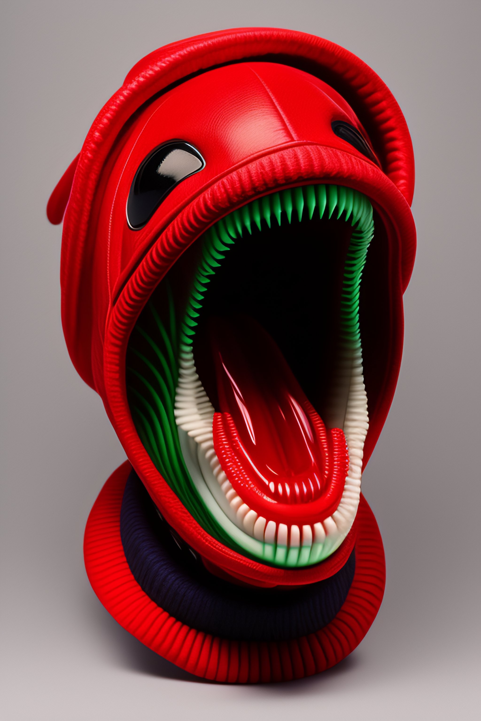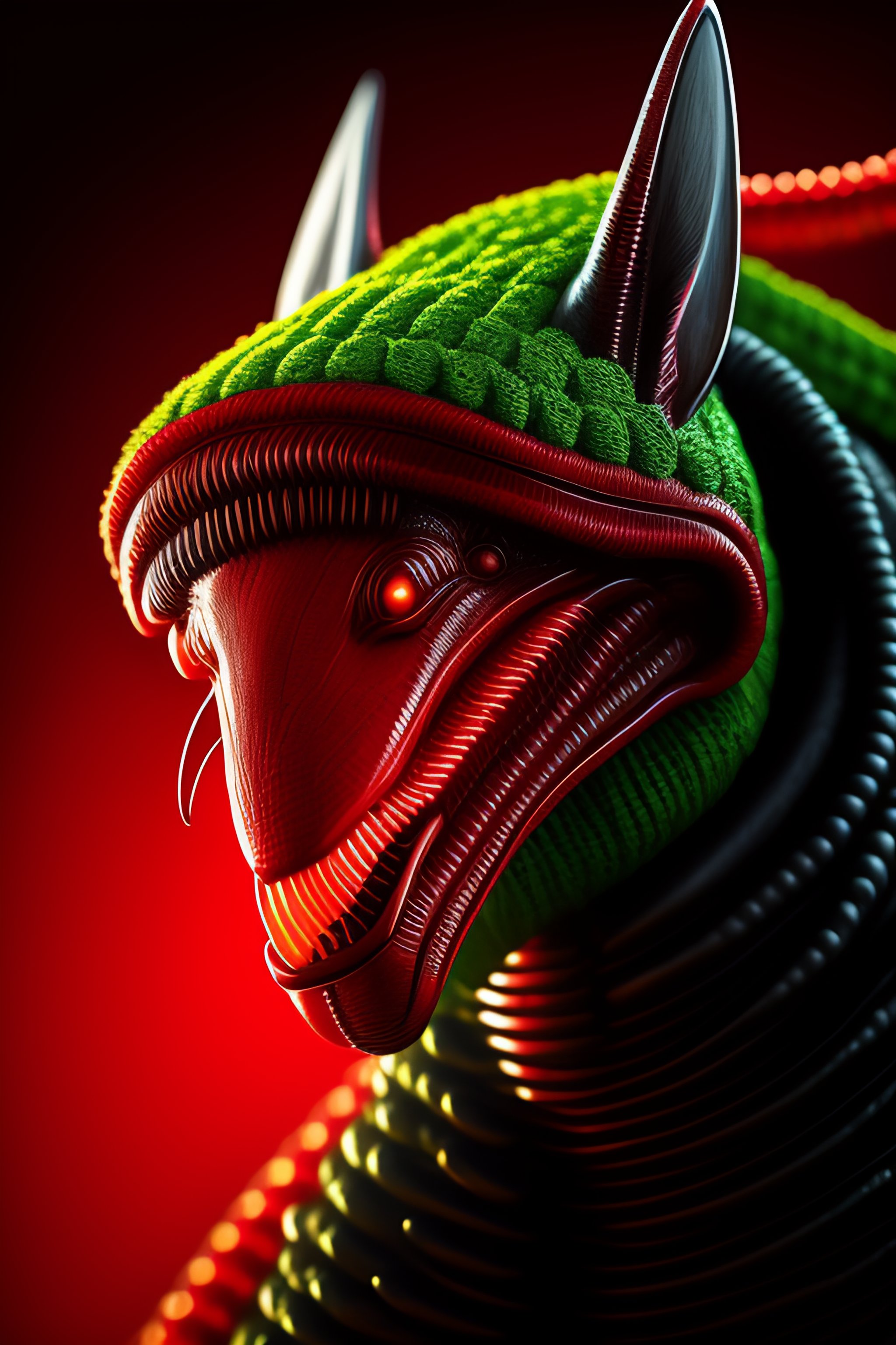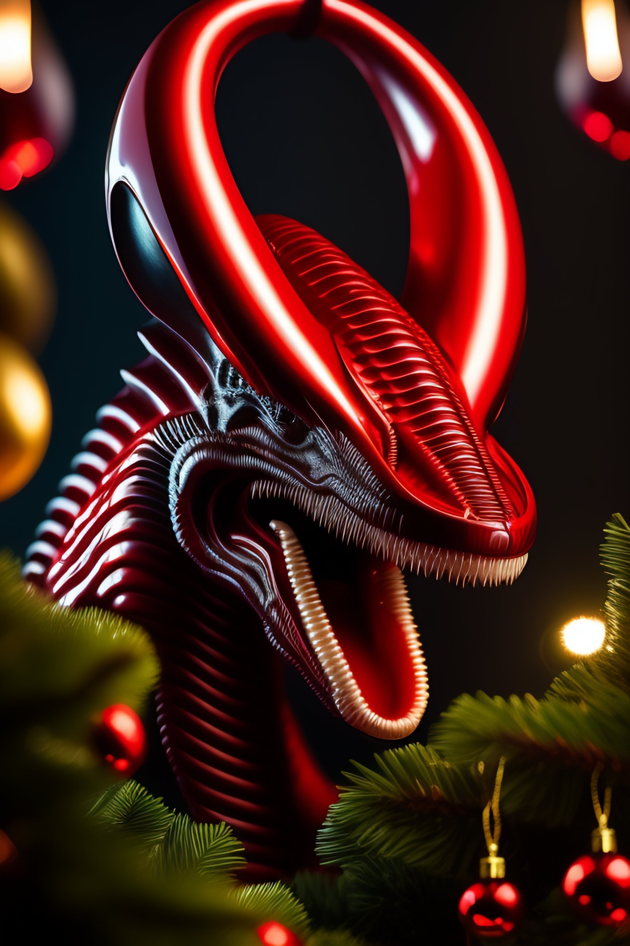 Alien xenomorph detailed portrait, against the background of a christmas tree, in a red hat, a gift in its paws, an open mouth, a lot of sharp teeth, drooling from the mouth, a scary mouth