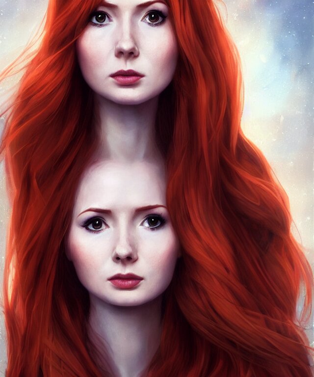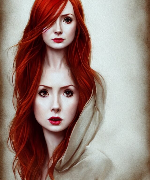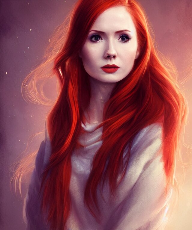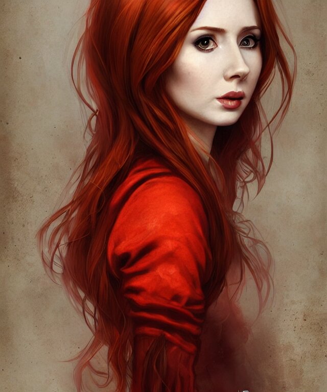 Karen gillan as amy pond wearing red scarf by charlie bowater and titian and artgerm, full - body portrait, intricate, face, london, elegant, orange mist, beautiful, highly detailed, dramatic lighting, sharp focus, trending on artstation, artstationhd, artstationhq, unreal engine, 4 k, 8 k