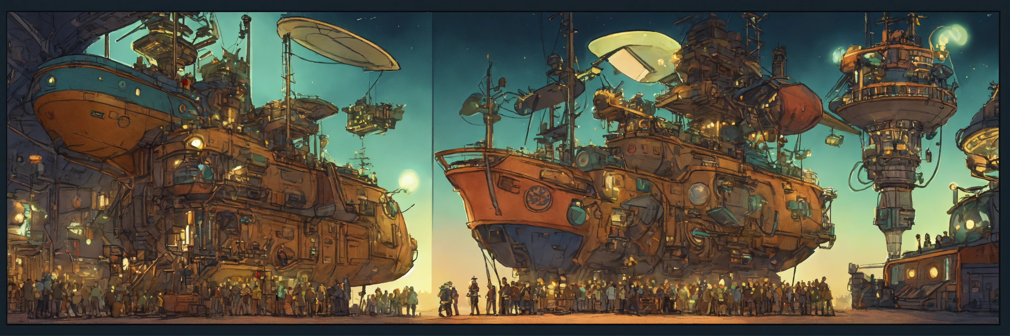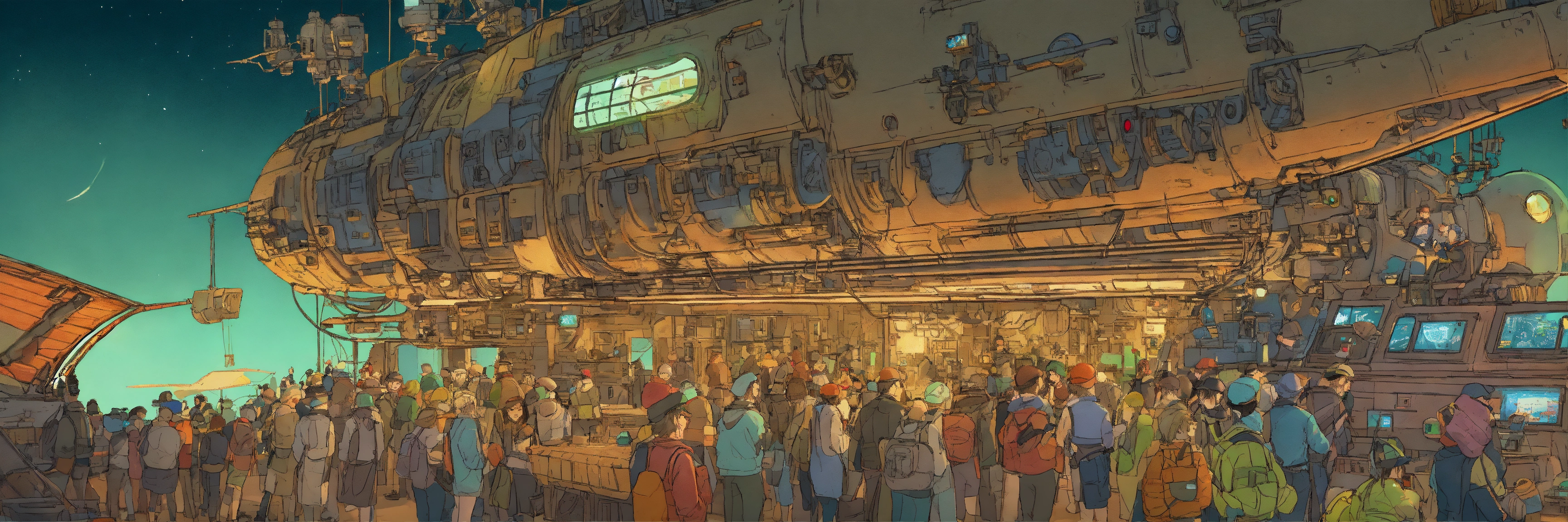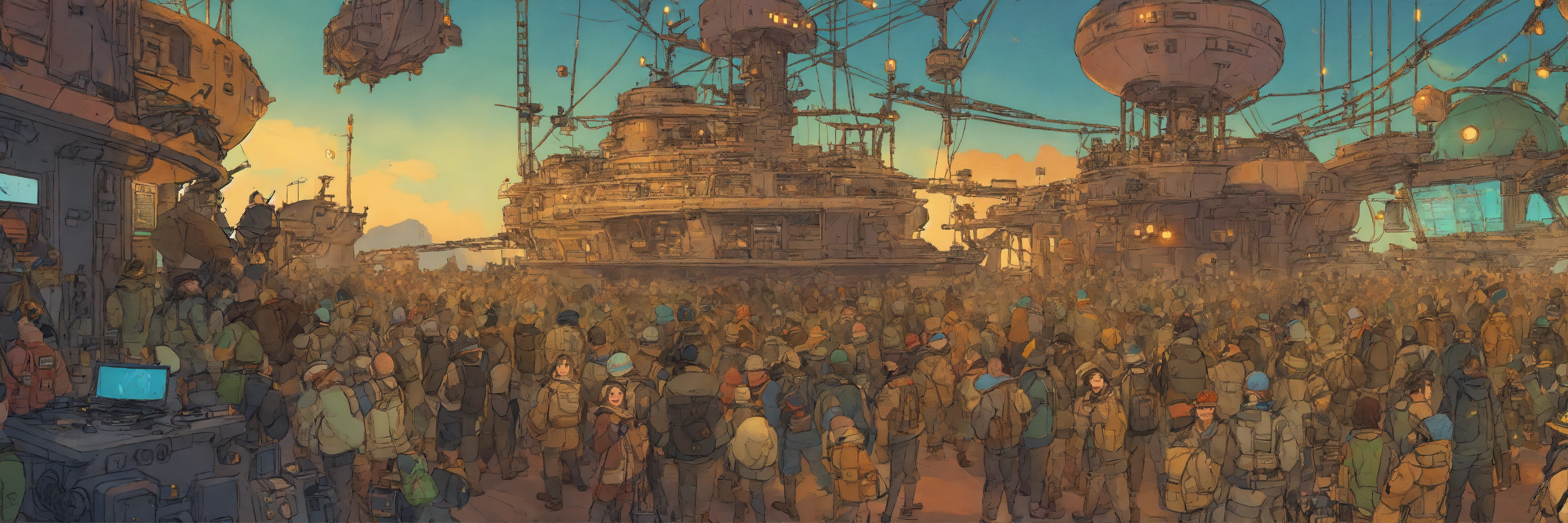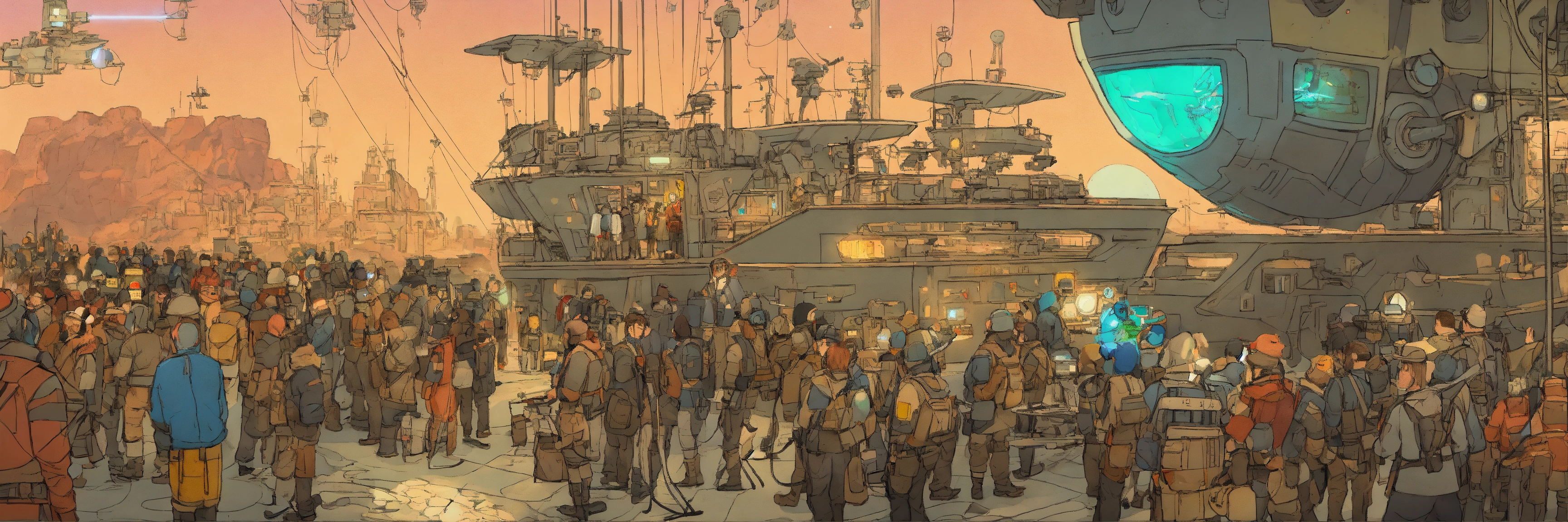 The future of work, very happy people, zoom in, futurepunk illustrations of futuristic space pirates crew, group photo, atmospheric lighting, overhead shot, 8k, very detailed, by mattias adolfsson