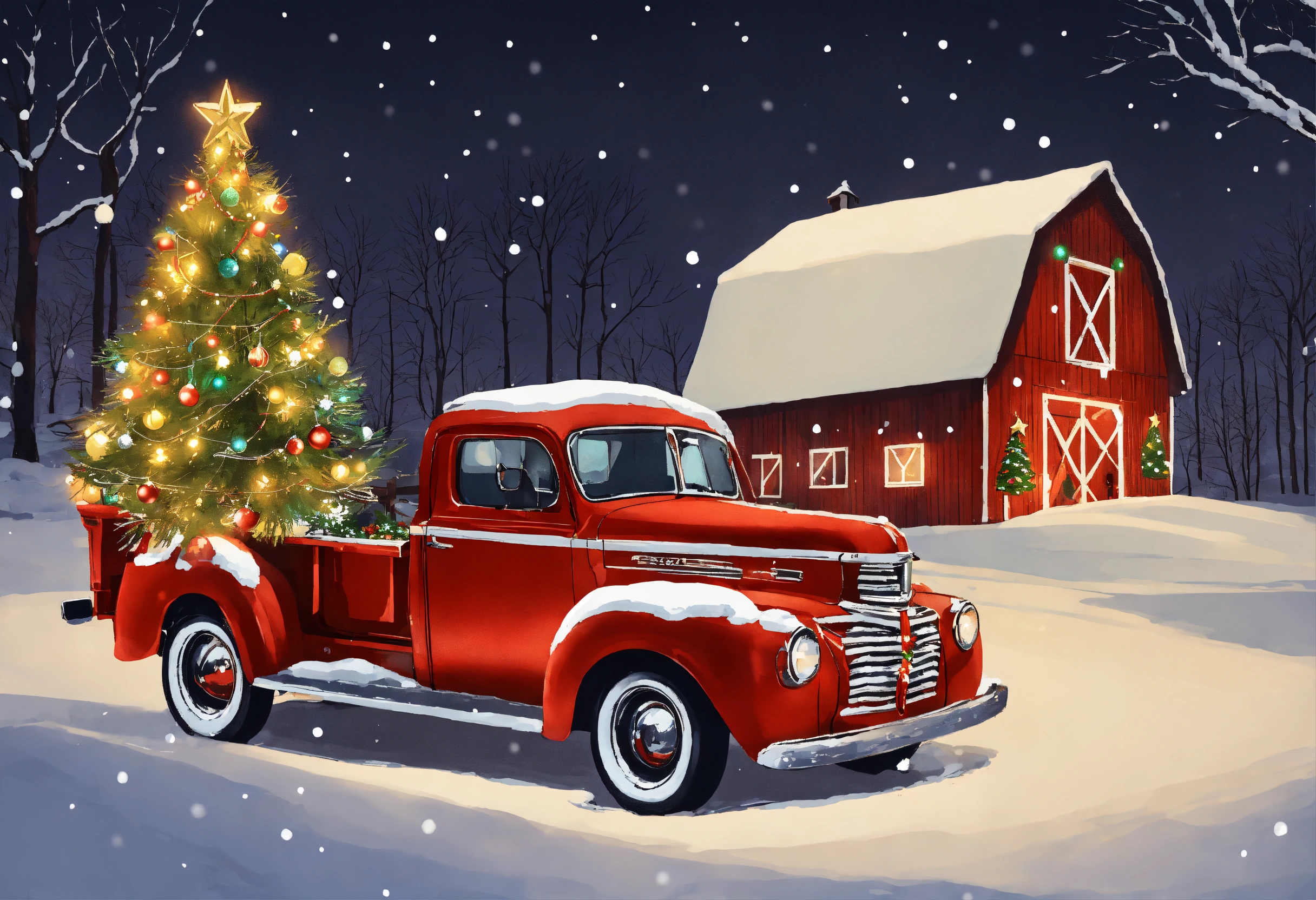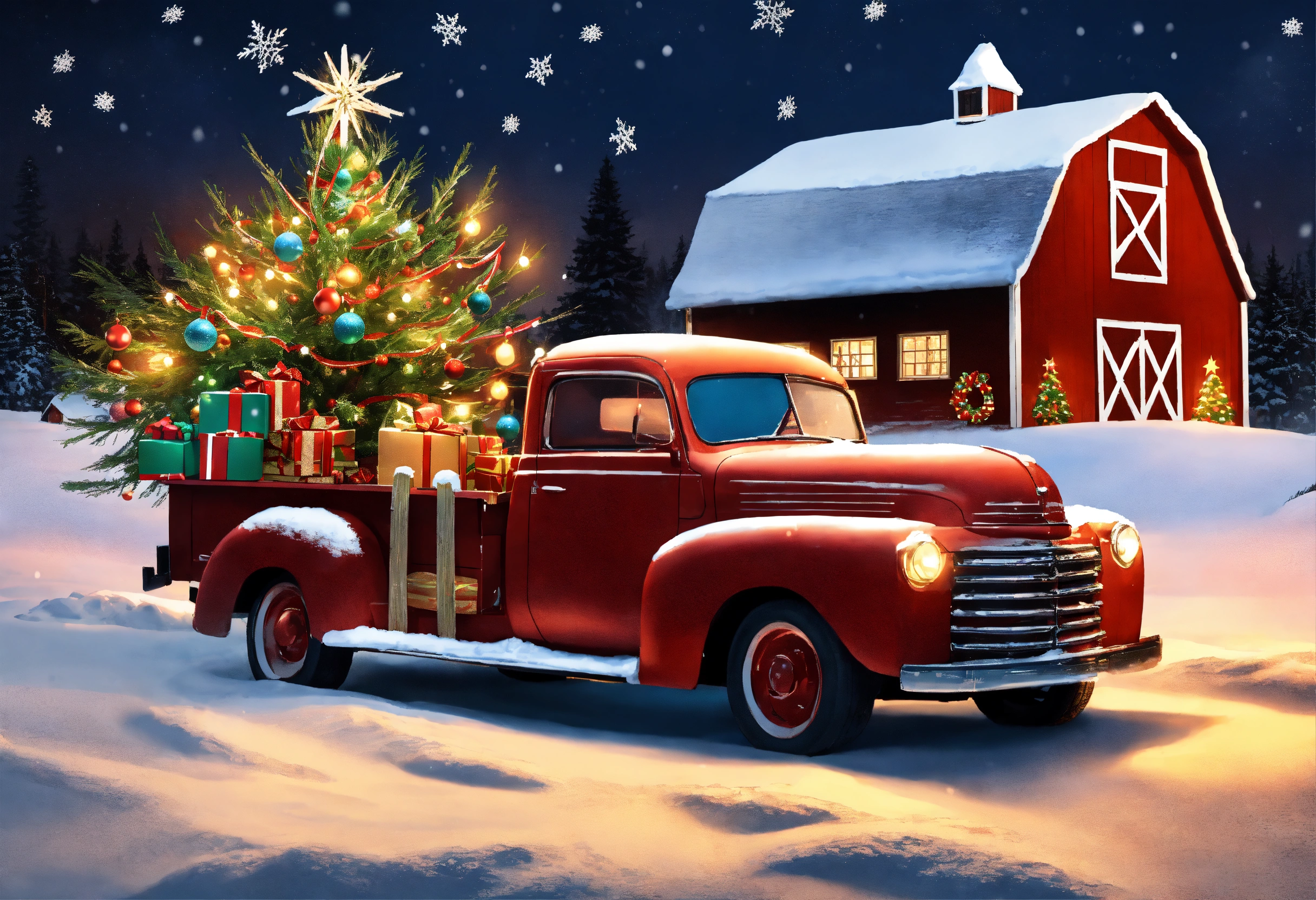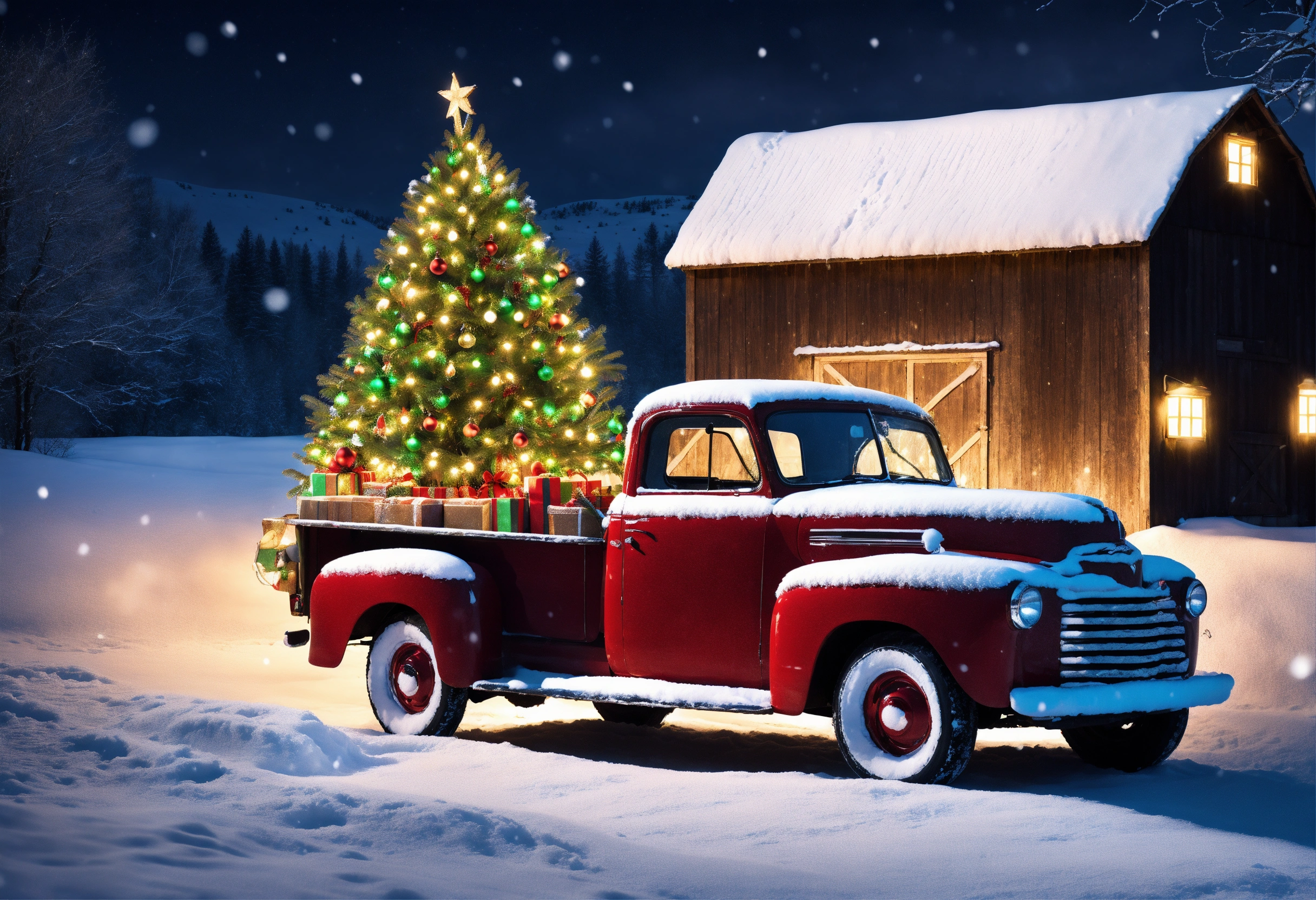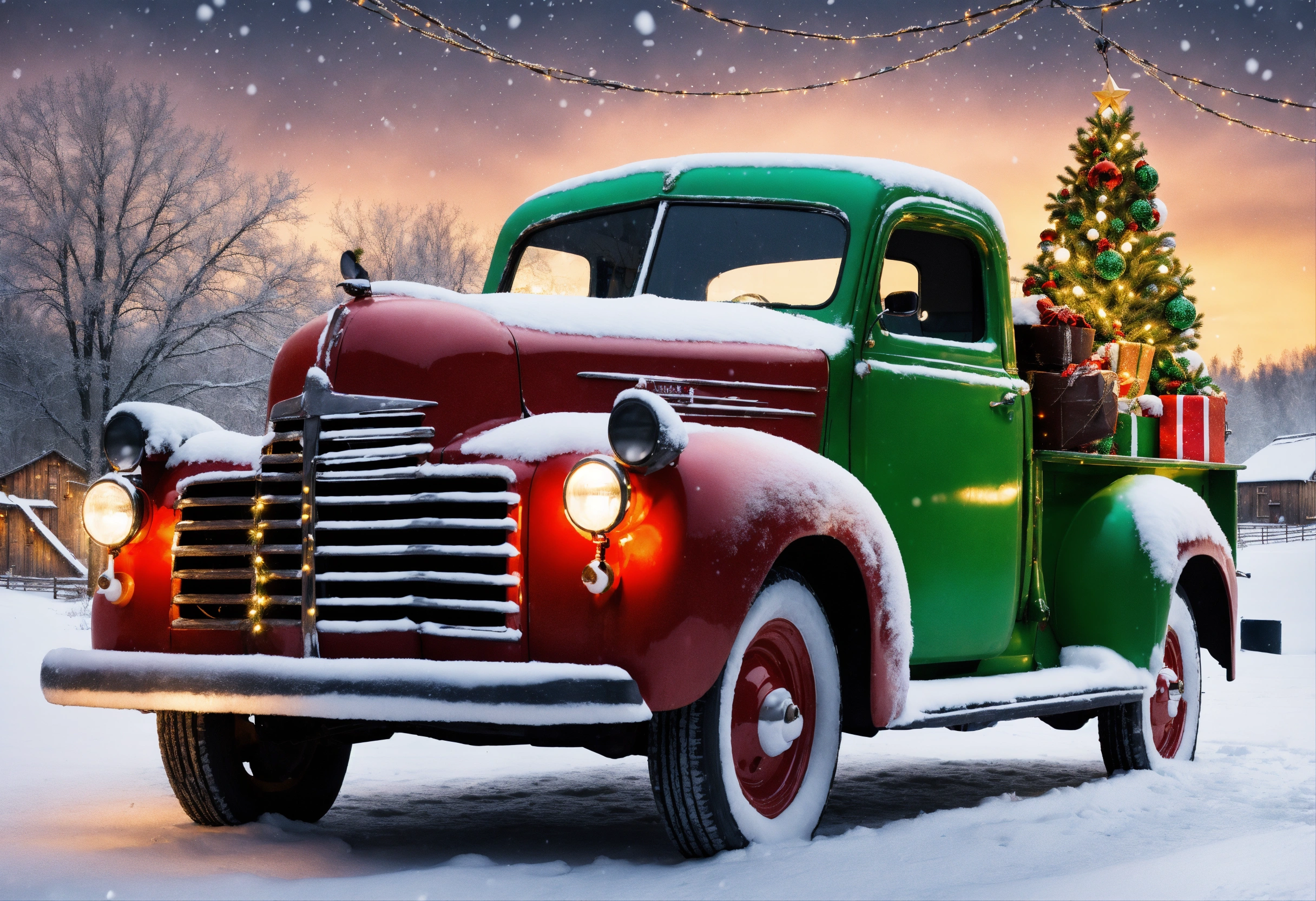Old fashioned truck with christmas decorations and christmas lights in snowy scene with rustic barn christmas tree lit up and snow cap christmas card design with a strong variation