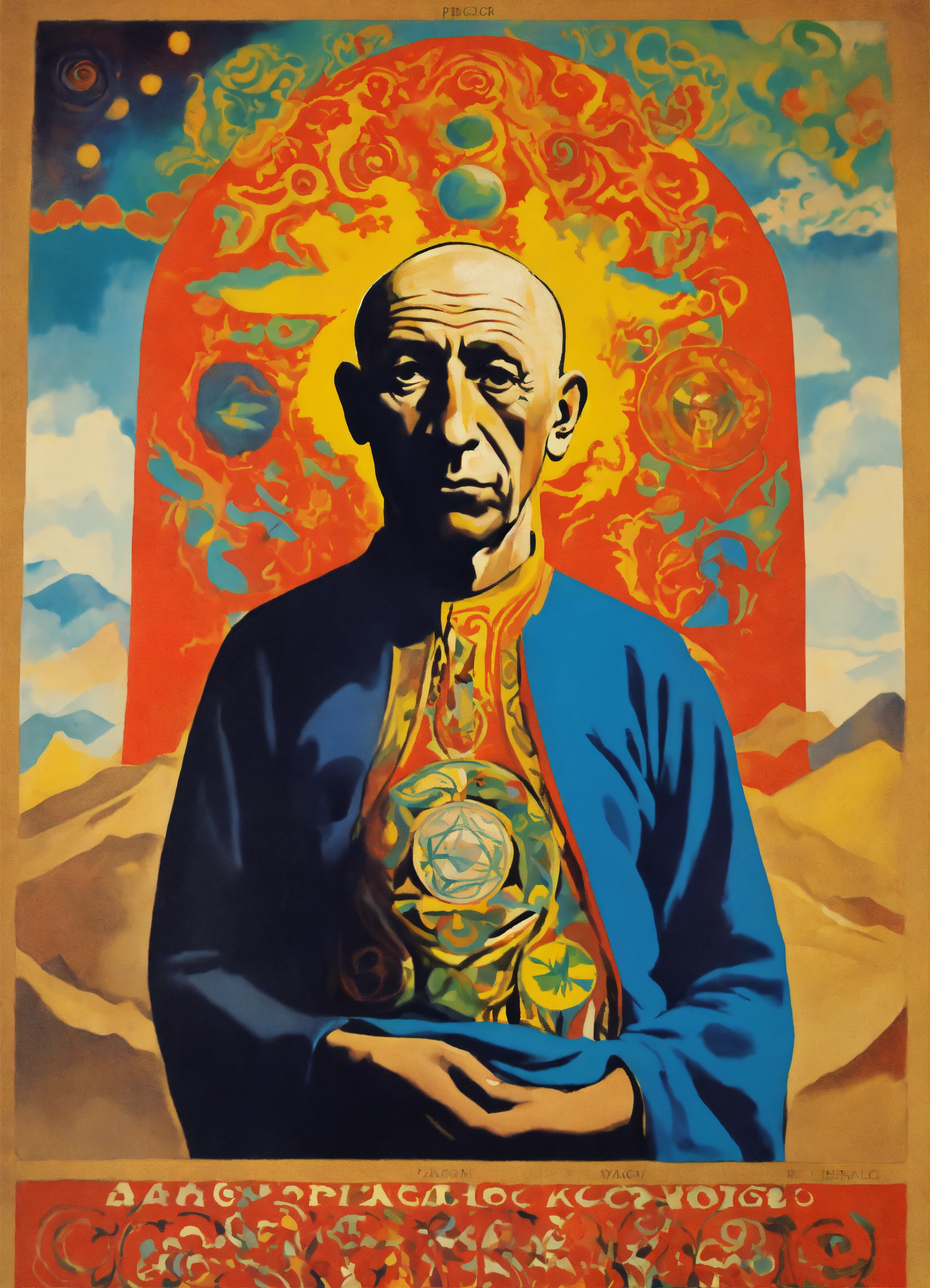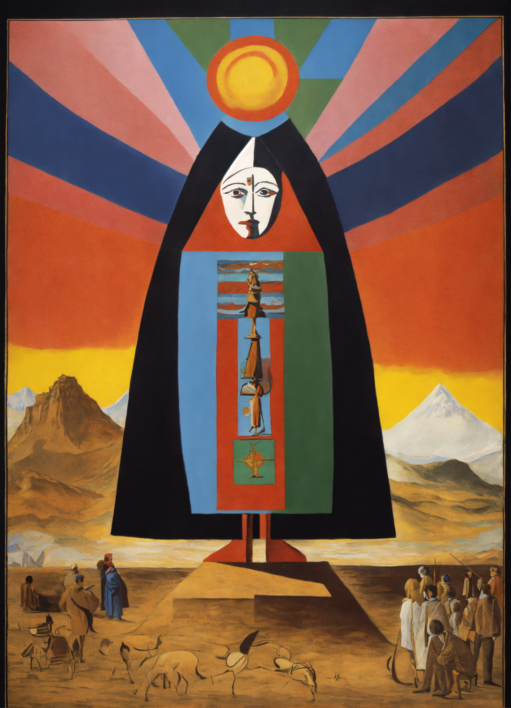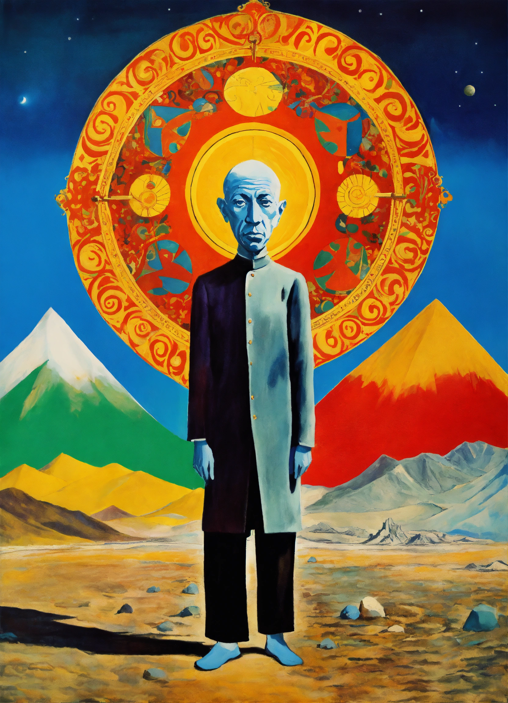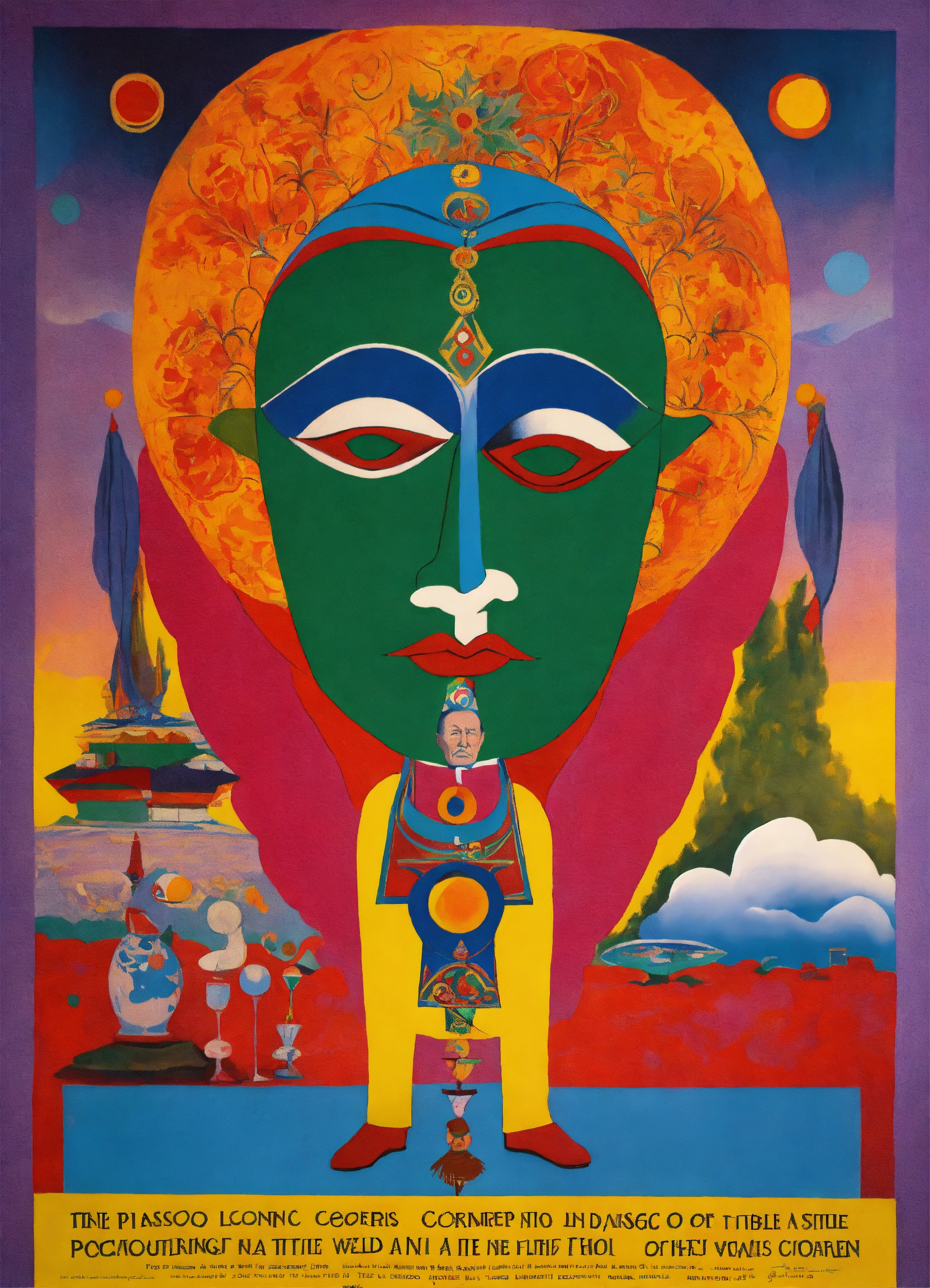 Vintage poster hippie pablo picasso standing up looking athe the world inside an tibet psychedelic art, and the four corners of the universe, painted by rene magritte
